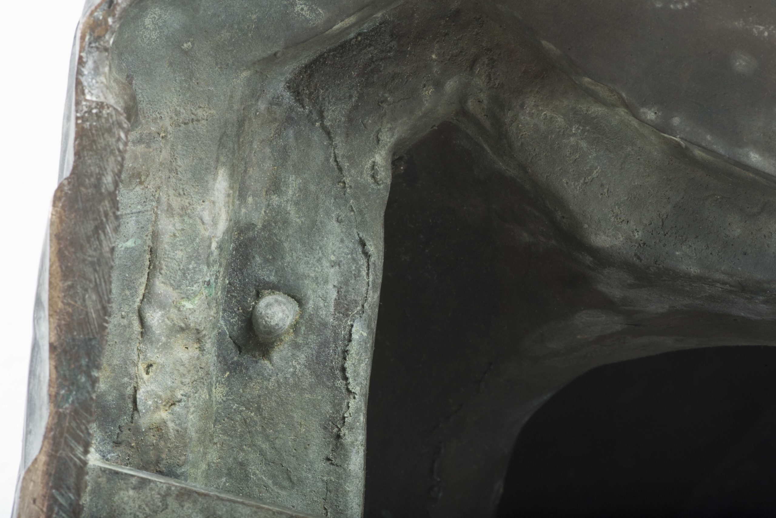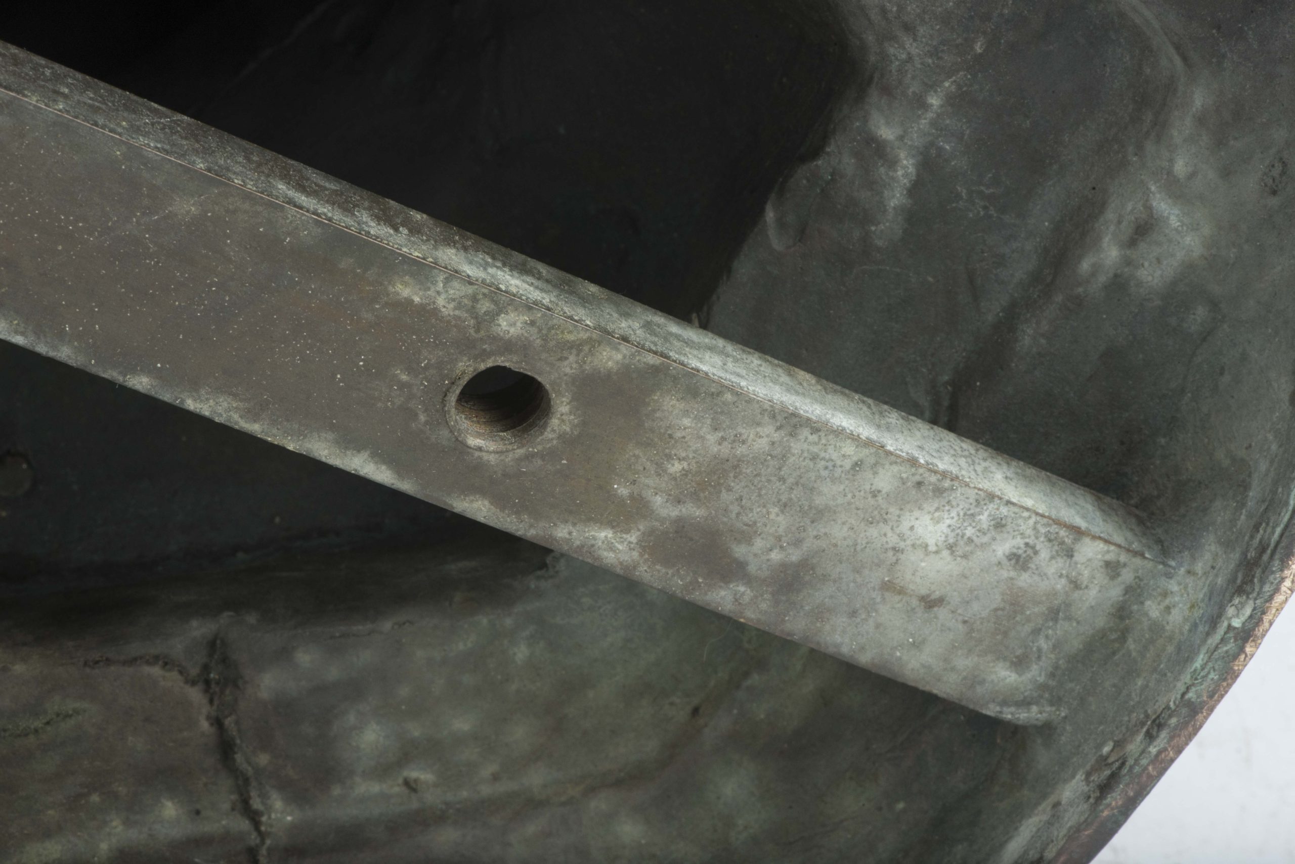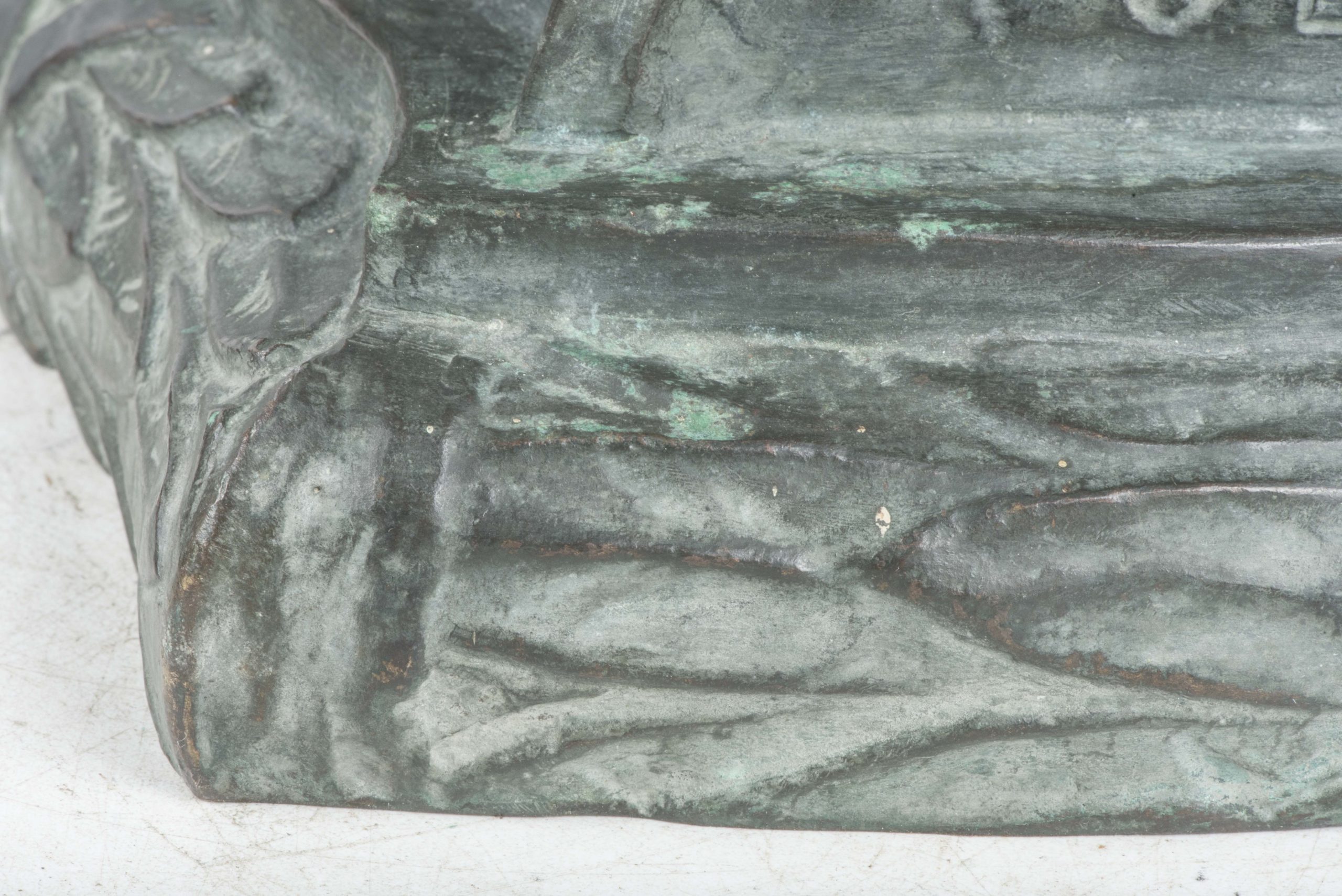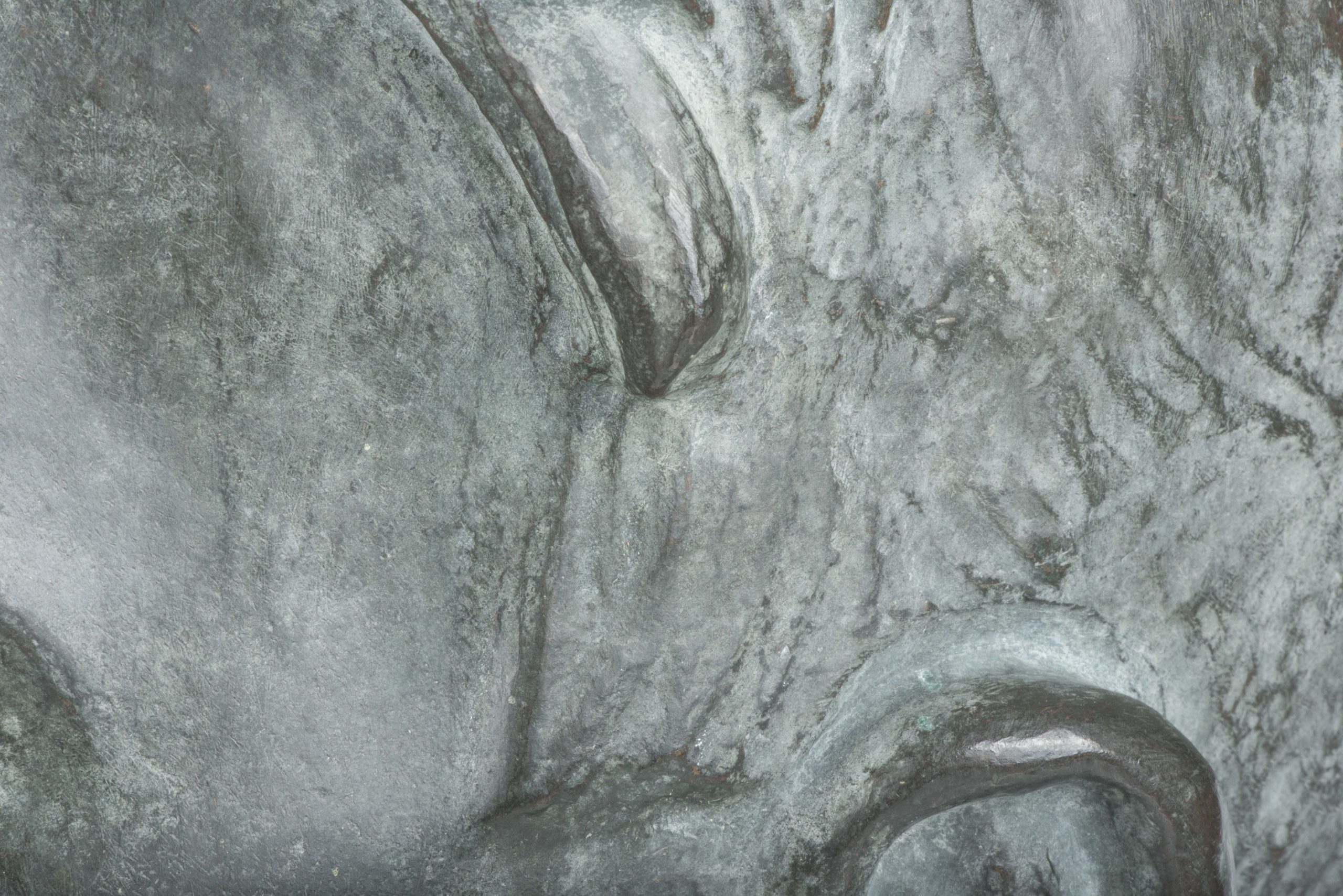Impressive bronze cast of Adolf Hitler. The large bust is photographed next to a Infantry Assault badge to show the immense size of approximately twice life size at 45cm in height and 95cm in circumerence. The bust is in good, uncleaned condition. The bust has no marble base, but this could easily be added if desired. Unlike many busts this one features the full neck and shoulder portion and is positioned in a slight angle. The base is nicely adorned with leaf motifs. The bust was signed with FL which could possibly indicate the sculptor Ferdinand Liebermann but this is nót the usual manner of signing for this artist. The bust is a typical hollow cast example by WMF or Württembergische Metallwaren Fabrik in Geislingen The bust is a extra rare, large example that is very hard to obtain!