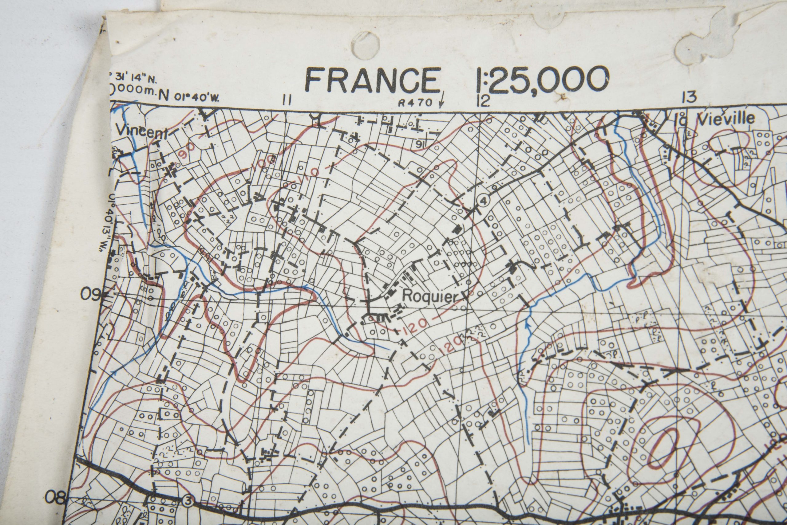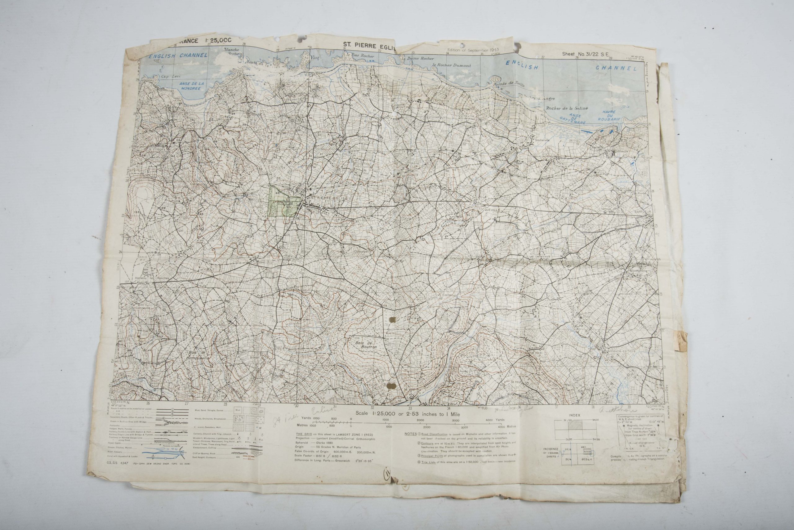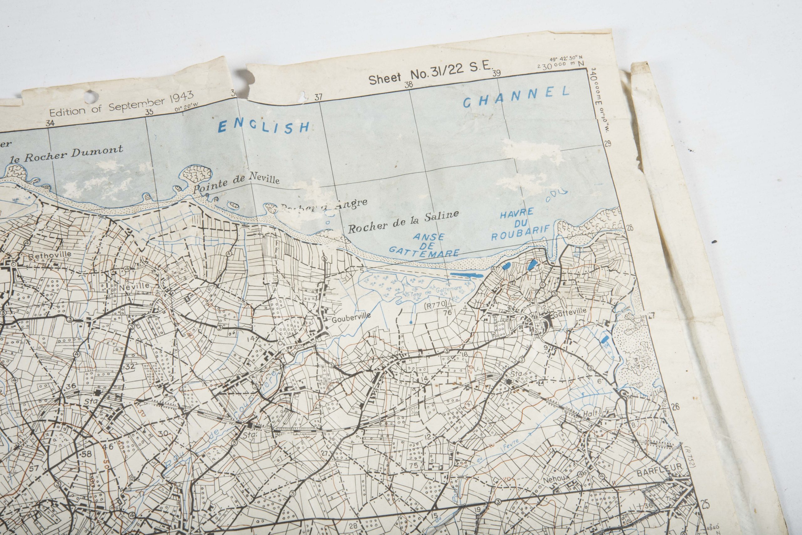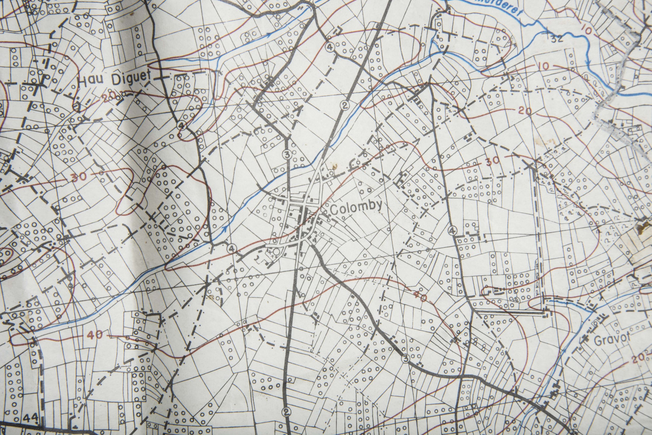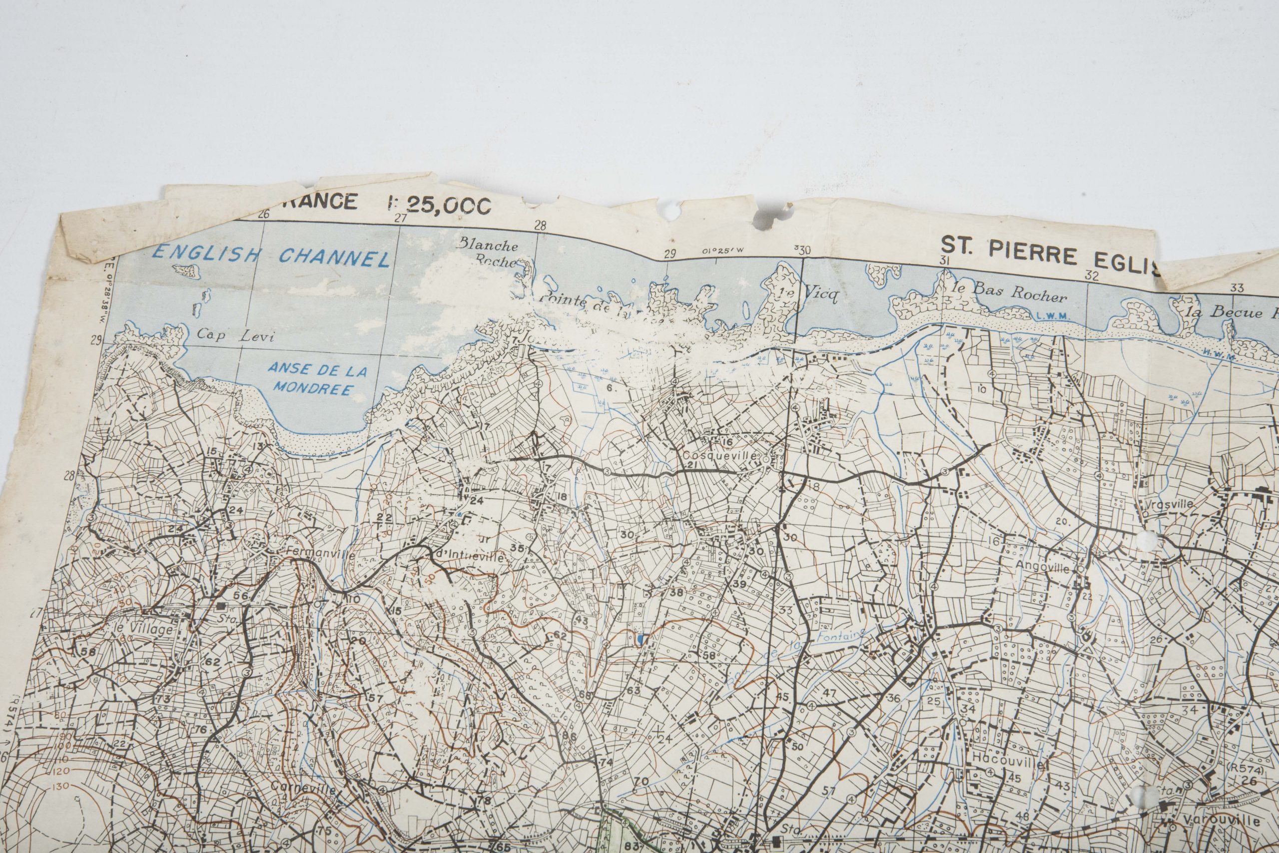 ID’ed US M1938 mapcase with board and Valognes/St. Pierre-Eglise maps in good condition. The mapcase is named Cnd Terrel and has a number of markings on the clear cover and its wrap. Another nice addition is the handsewn button underneath the closing flap for attatching a separate piece like a whistle or compass. I have not researched the mapcase but found it as is. Both the maps of St. Pierre-Eglise and Valognes are glued together on the back. The area of interest in the map is mostly attributable for the US 4th Infantry Division, North of Utah beach and east of Cherbourg. There are several small pencil markings on the map. Nice piece in good used condition!