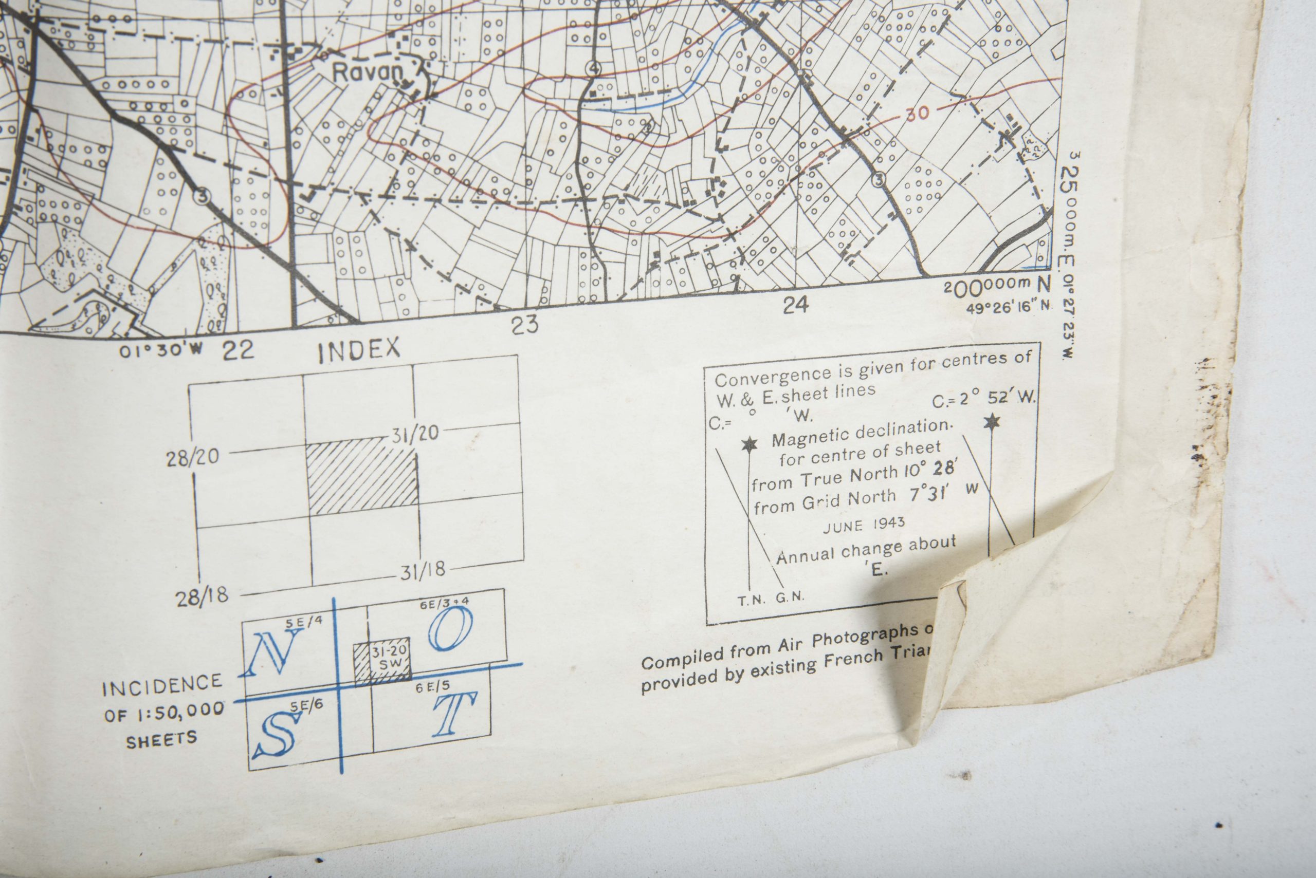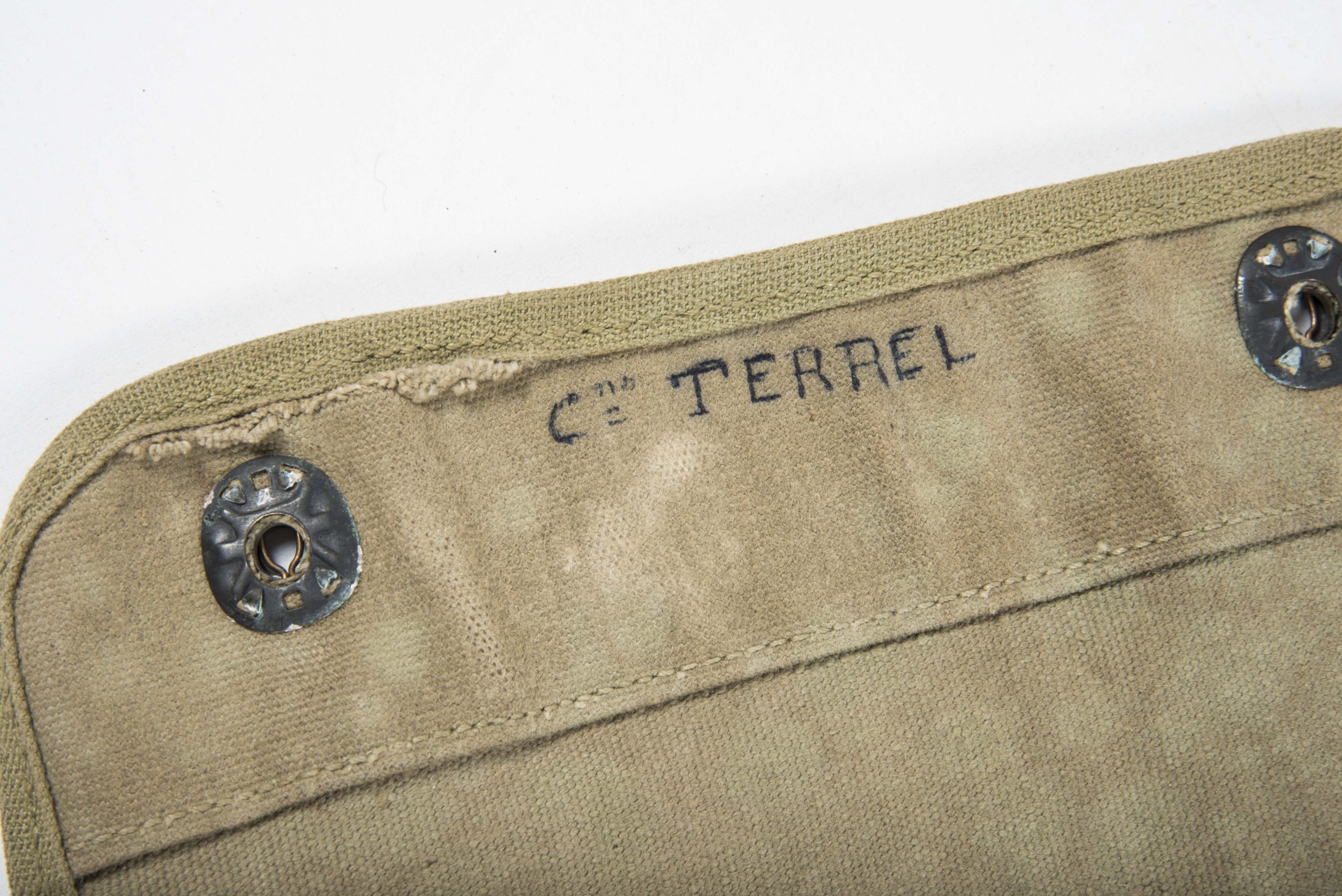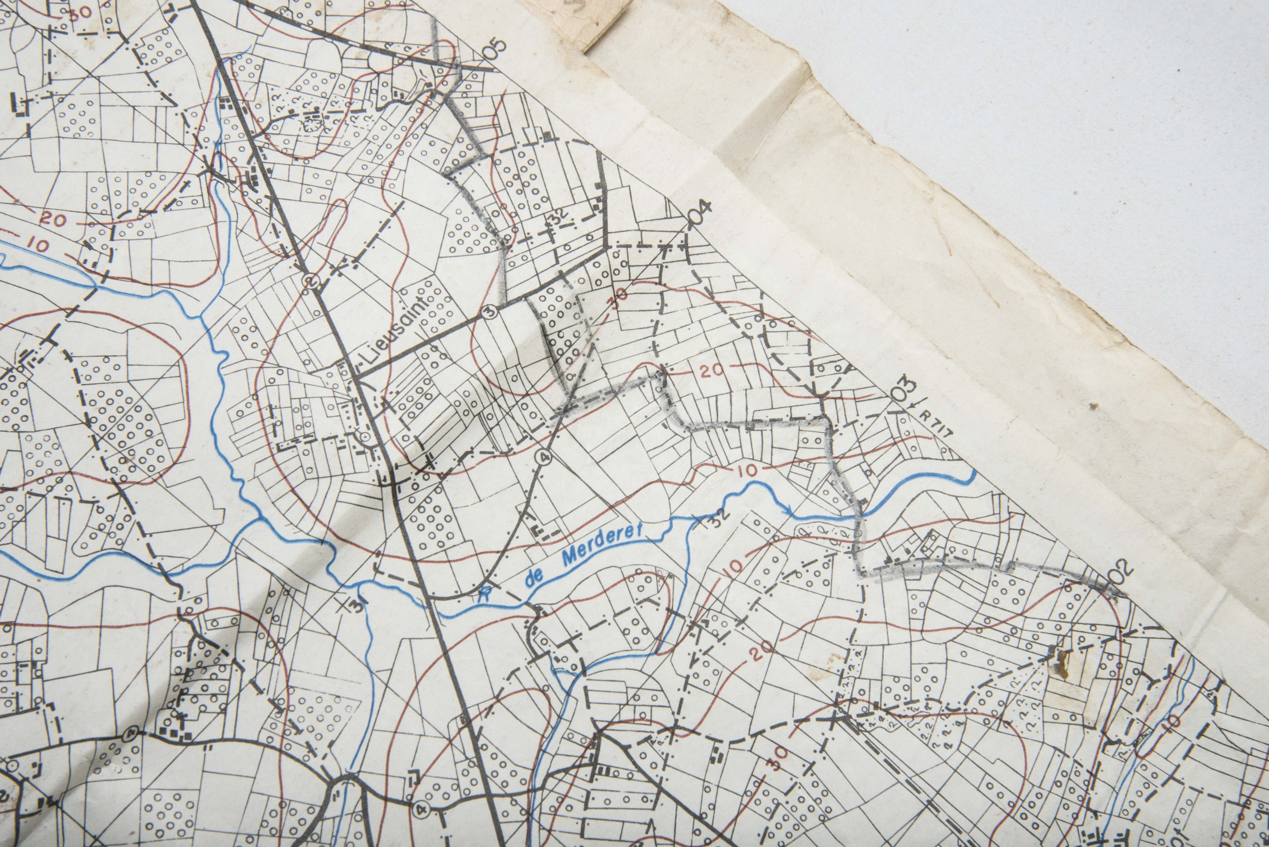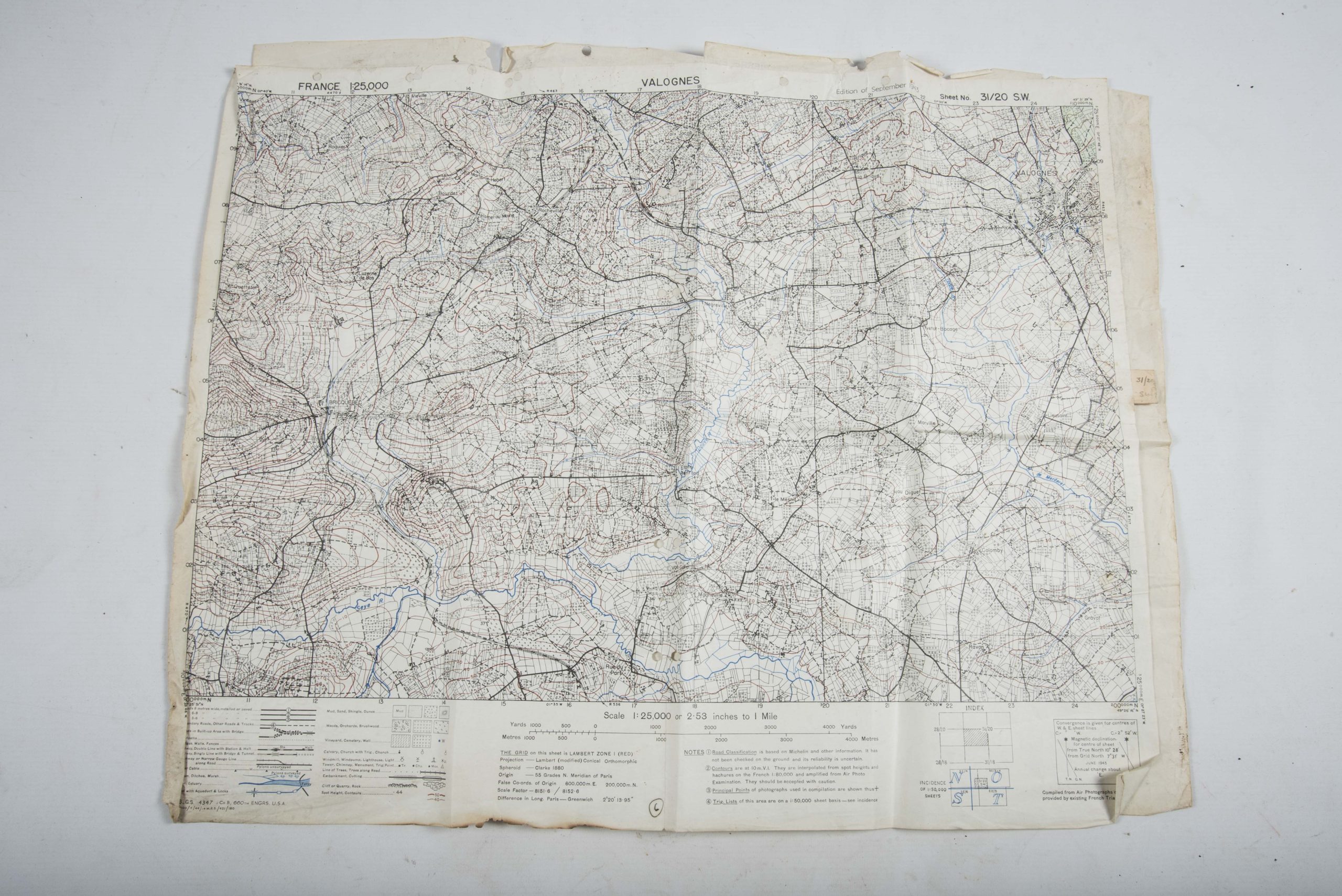 ID’ed US M1938 mapcase with board and Valognes/St. Pierre-Eglise maps in good condition. The mapcase is named Cnd Terrel and has a number of markings on the clear cover and its wrap. Another nice addition is the handsewn button underneath the closing flap for attatching a separate piece like a whistle or compass. I have not researched the mapcase but found it as is. Both the maps of St. Pierre-Eglise and Valognes are glued together on the back. The area of interest in the map is mostly attributable for the US 4th Infantry Division, North of Utah beach and east of Cherbourg. There are several small pencil markings on the map. Nice piece in good used condition!