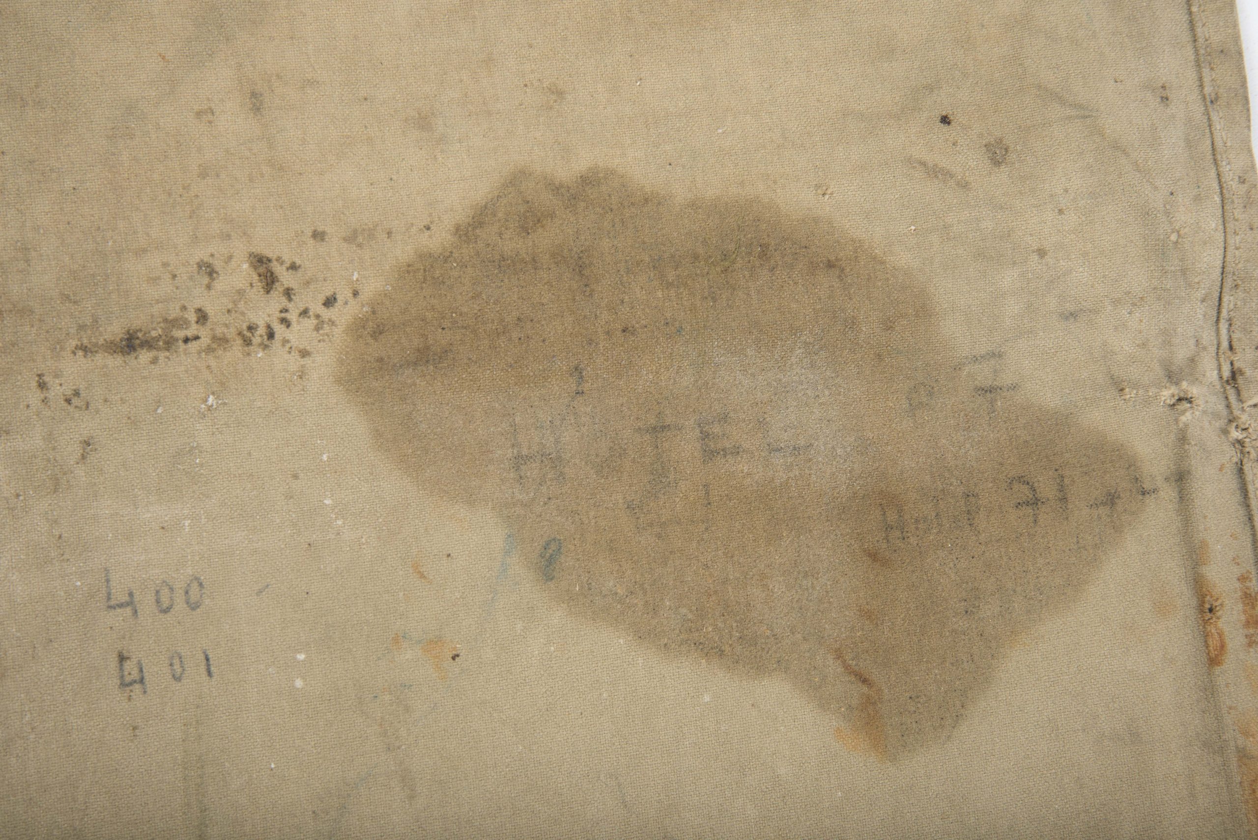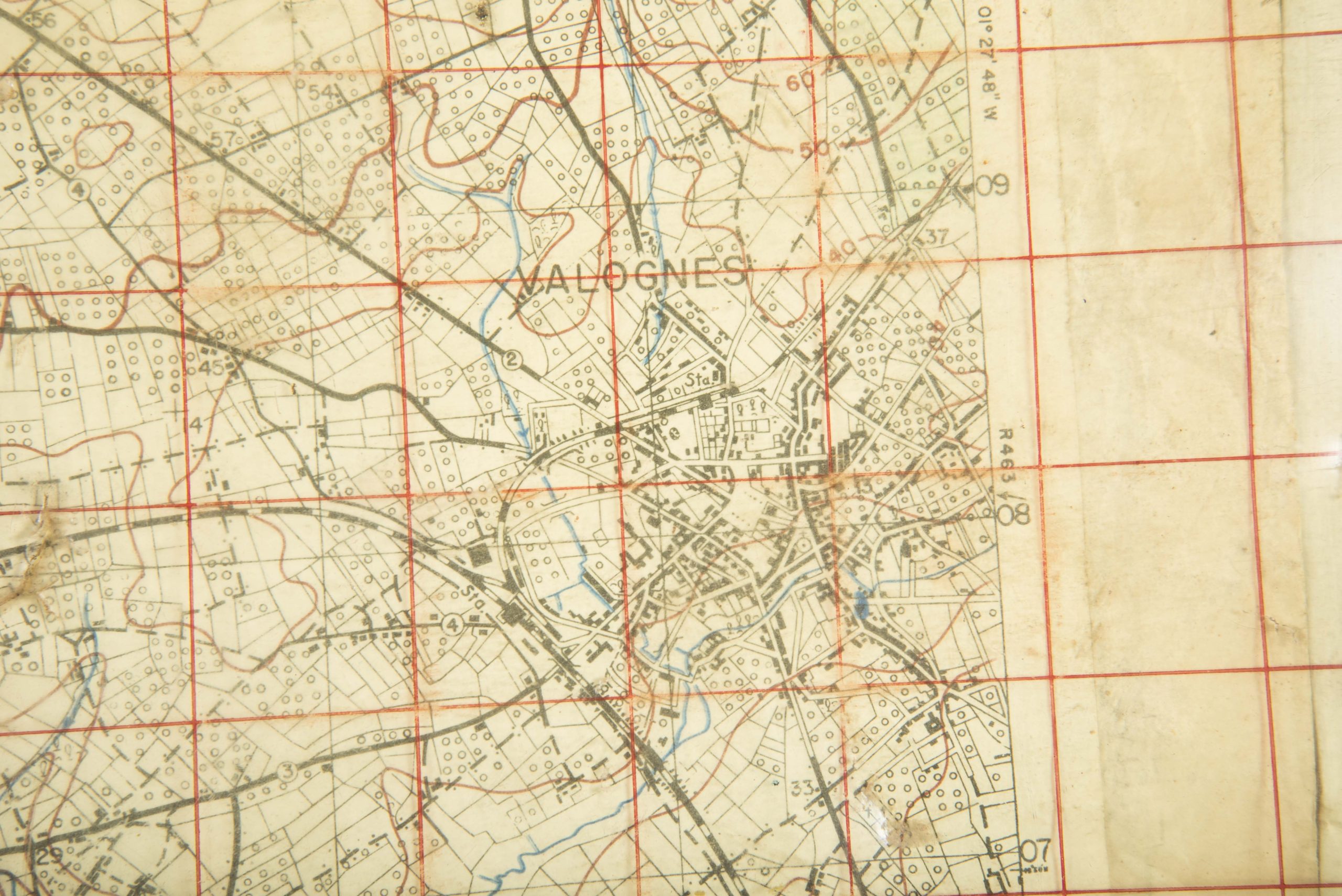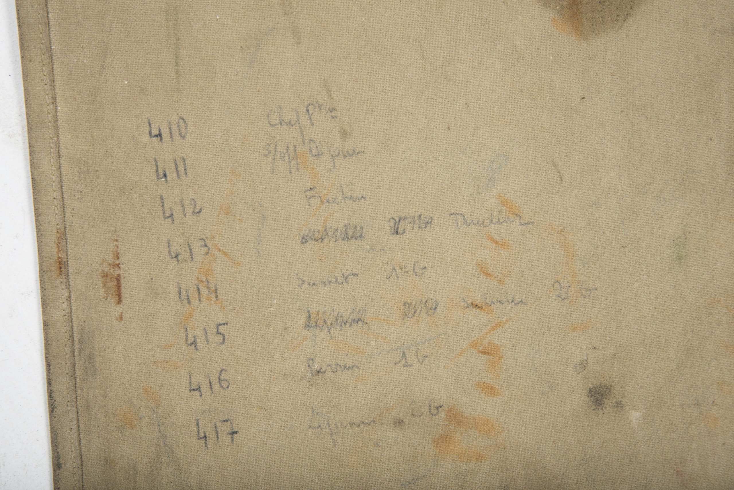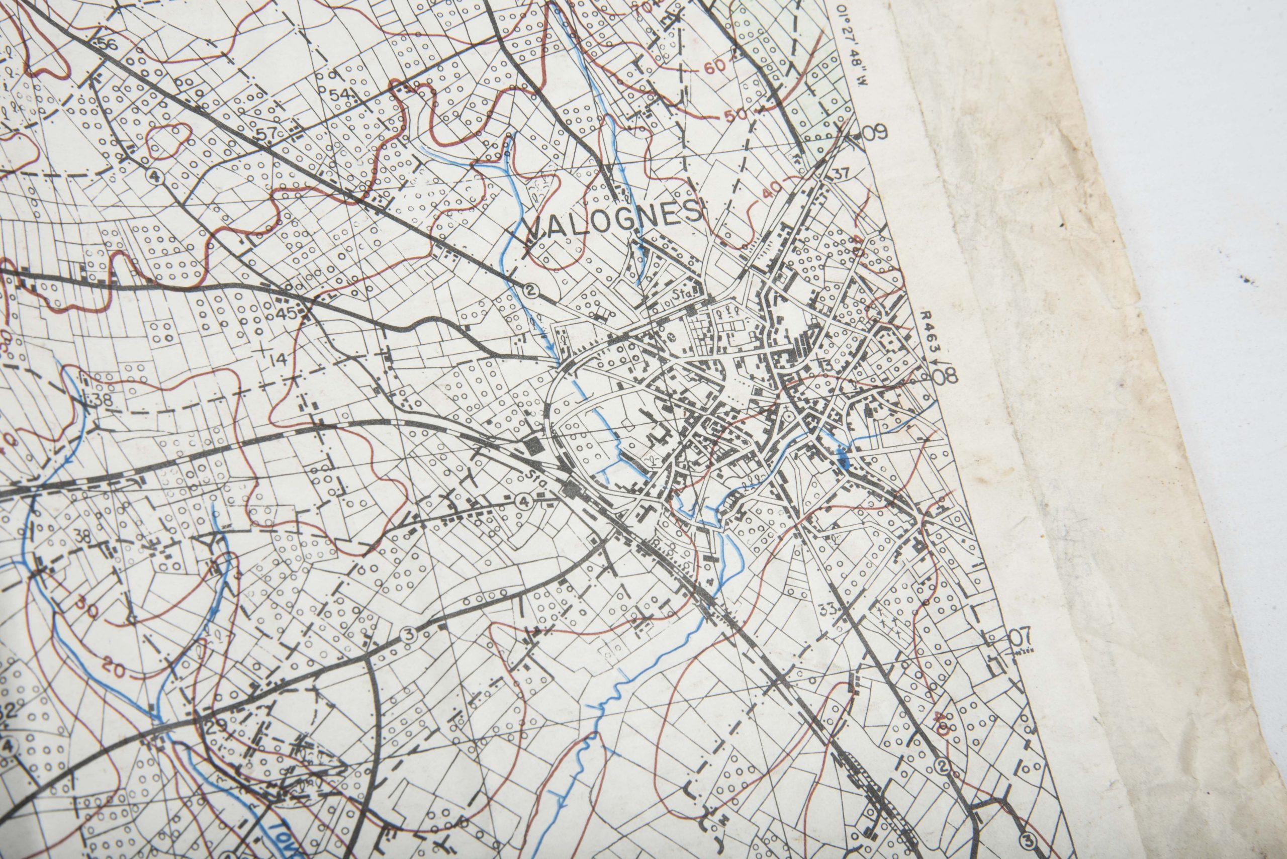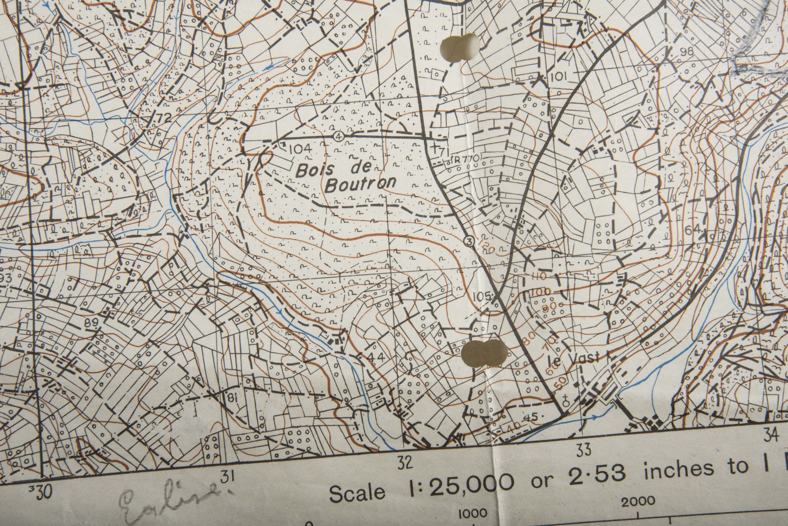 ID’ed US M1938 mapcase with board and Valognes/St. Pierre-Eglise maps in good condition. The mapcase is named Cnd Terrel and has a number of markings on the clear cover and its wrap. Another nice addition is the handsewn button underneath the closing flap for attatching a separate piece like a whistle or compass. I have not researched the mapcase but found it as is. Both the maps of St. Pierre-Eglise and Valognes are glued together on the back. The area of interest in the map is mostly attributable for the US 4th Infantry Division, North of Utah beach and east of Cherbourg. There are several small pencil markings on the map. Nice piece in good used condition!
