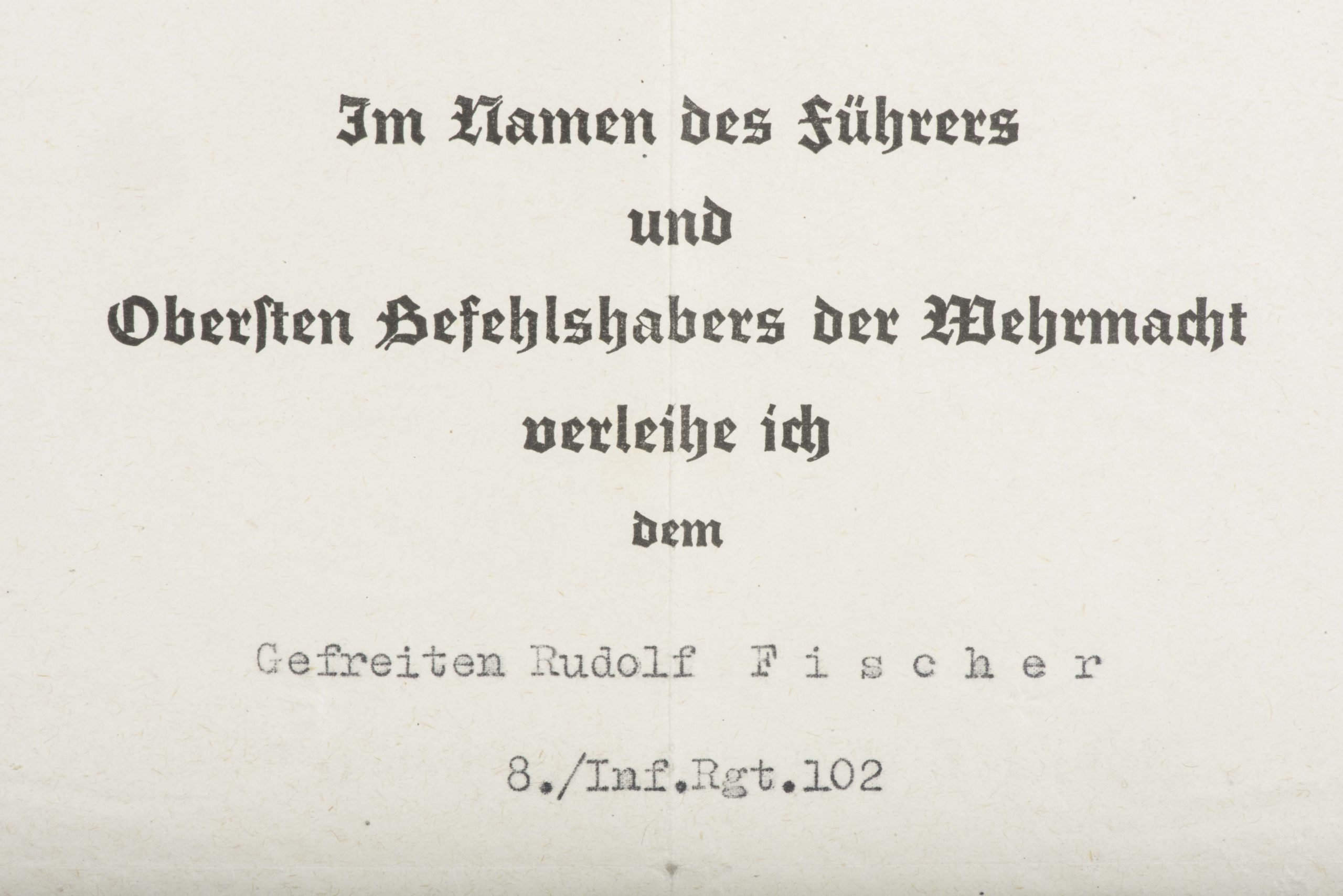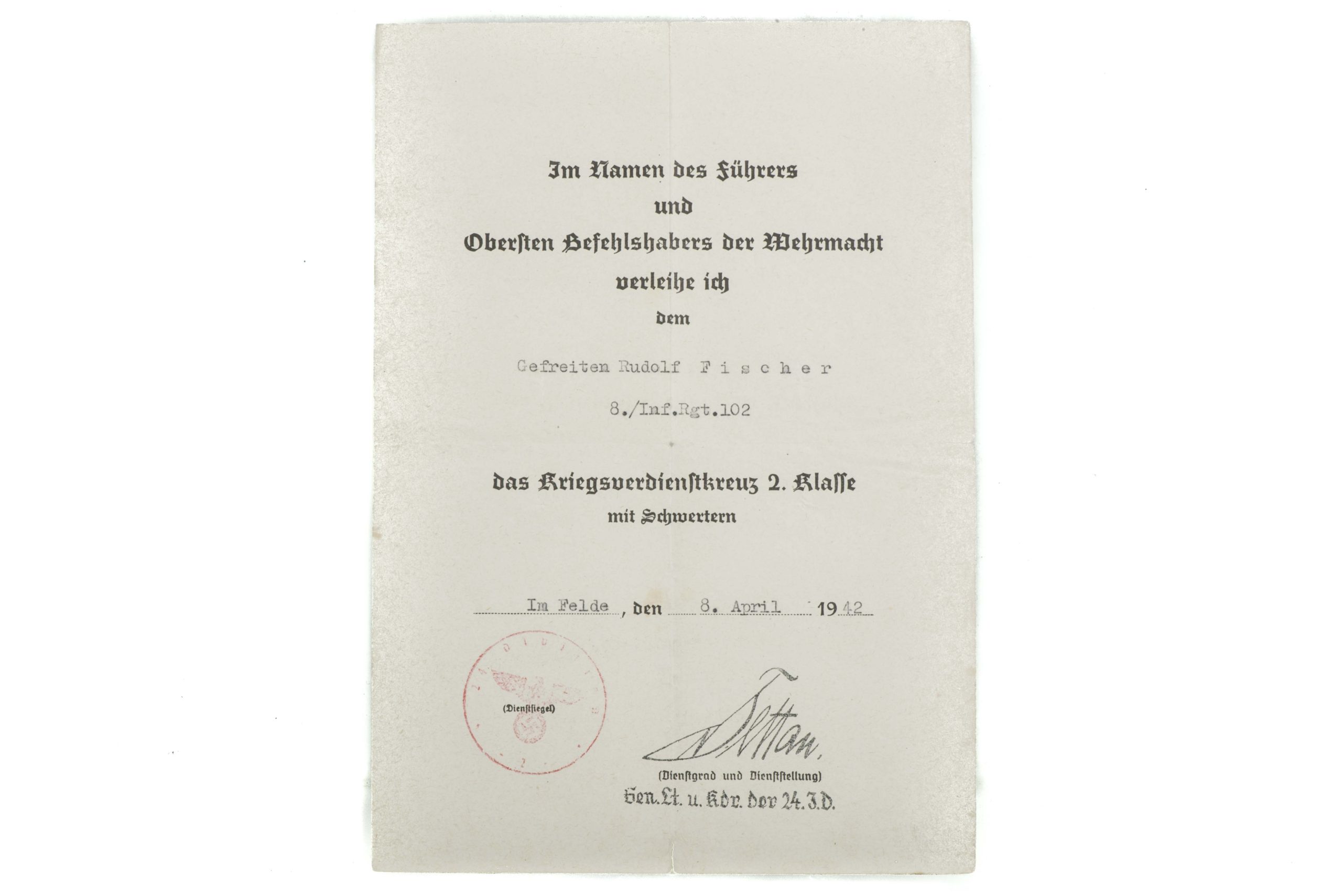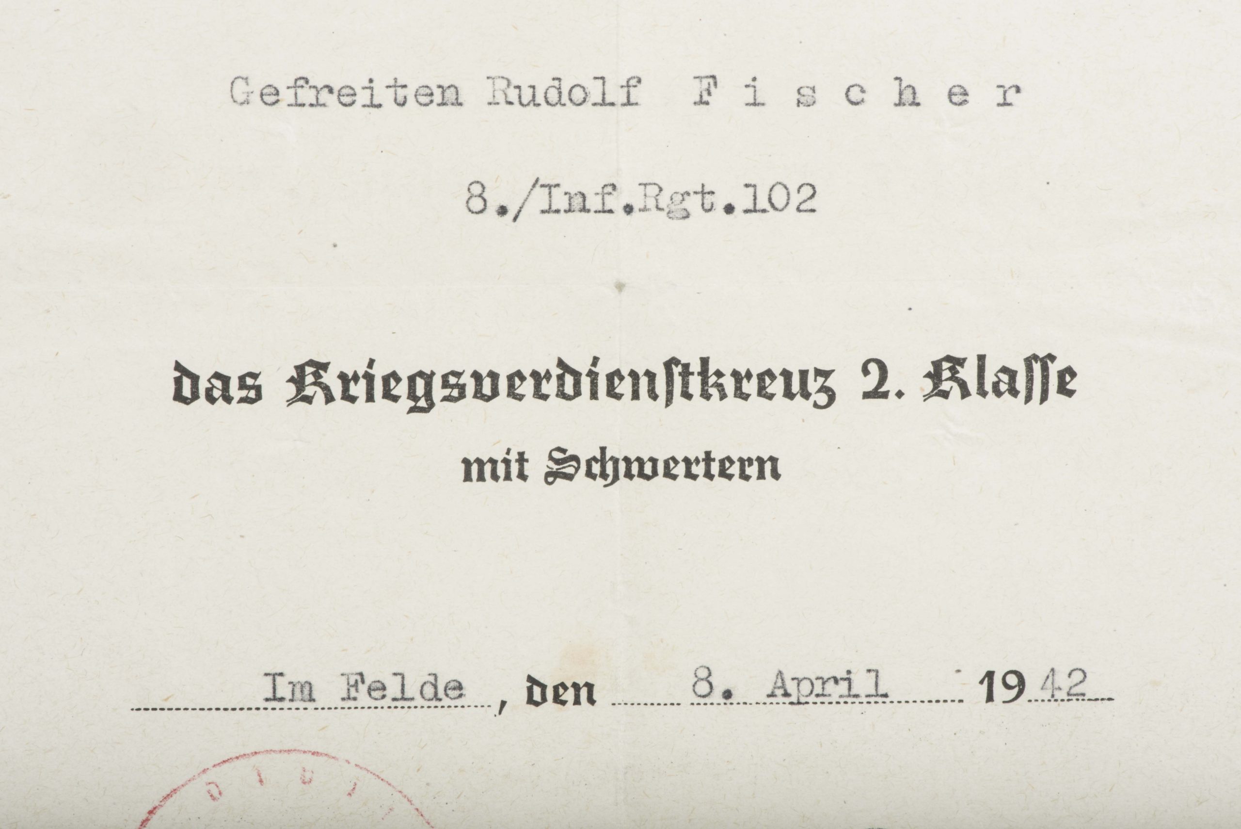 War merit cross with swords second class or KVK2 award document to Gefreiten Rudolf Fischer, 8. / Inf.Rgt. 102