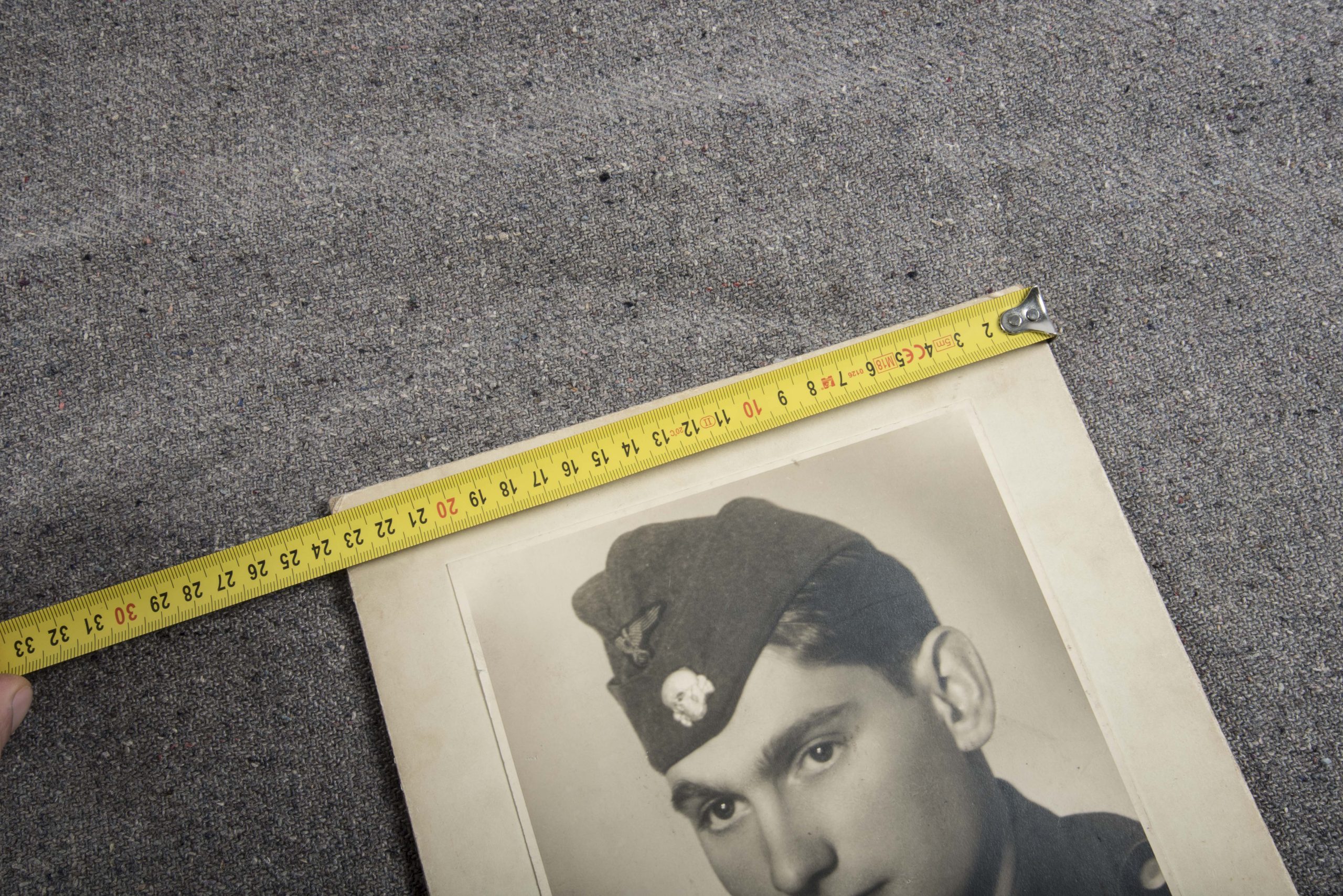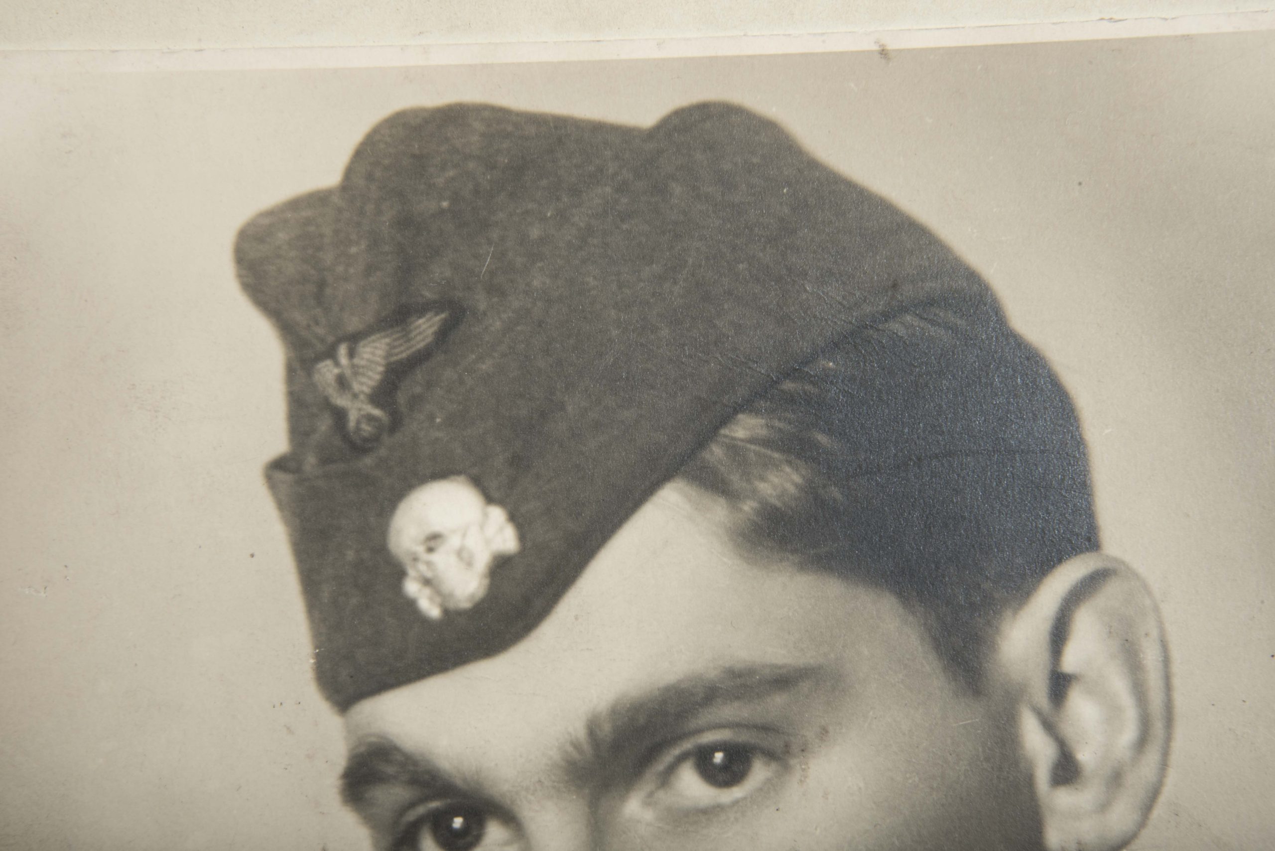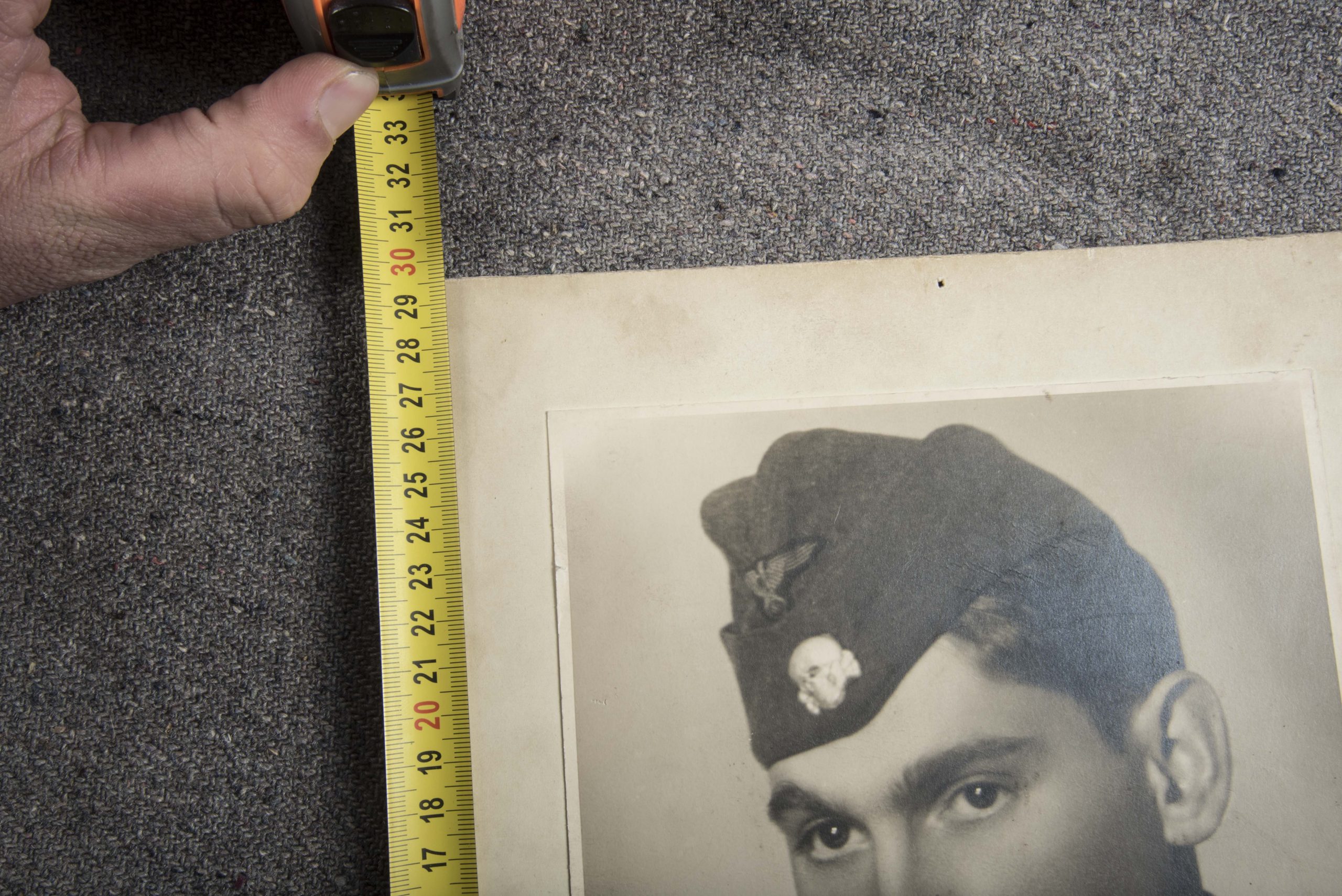 Large SS Totenkopf Rottenführer portrait. Interesting large sized photographic portrait. Nice detail with metal skull added to the sidecap. The photo was taken out of a frame sized 30×24 cm.