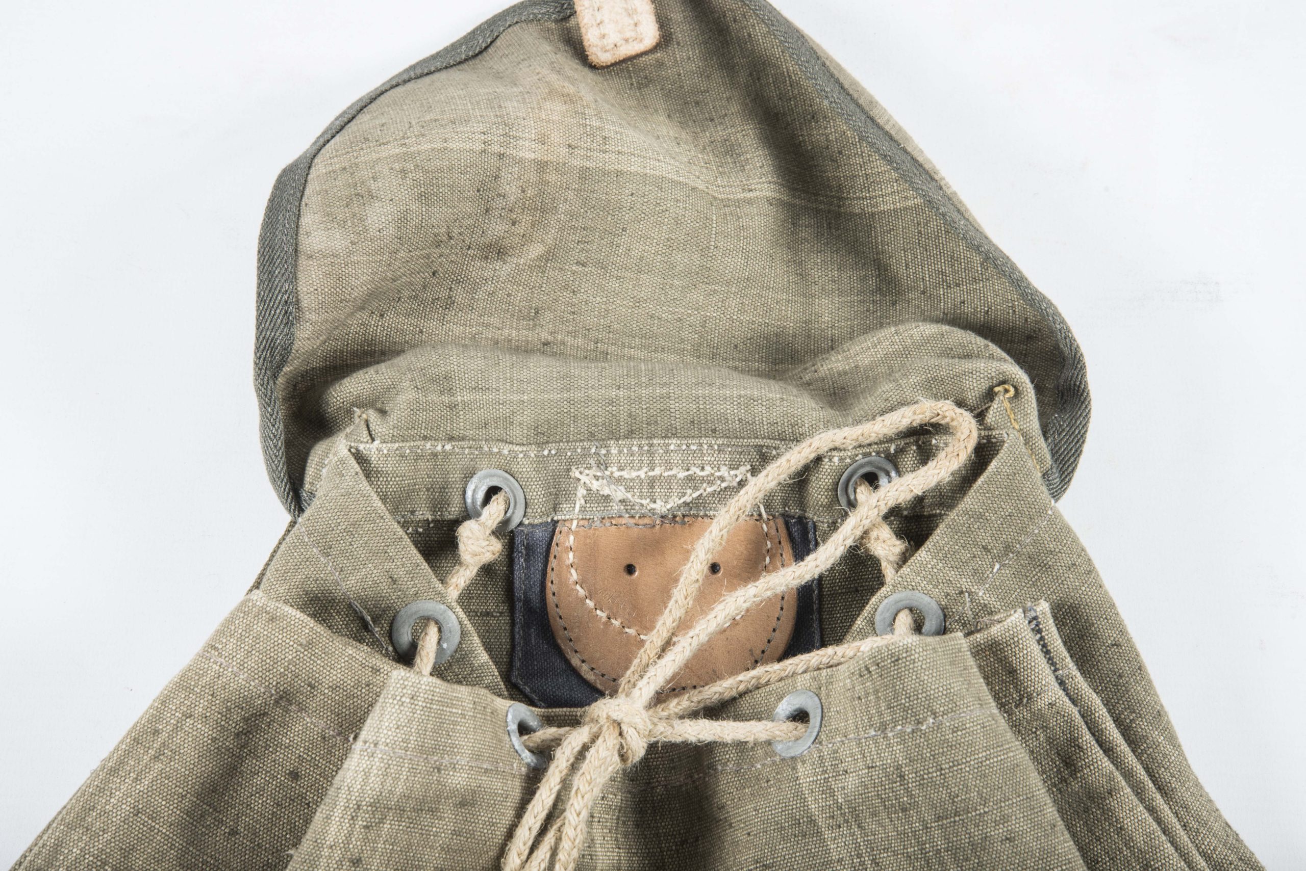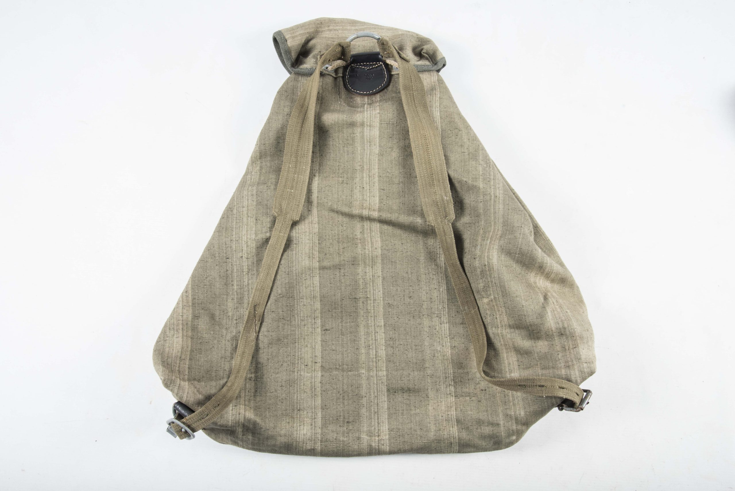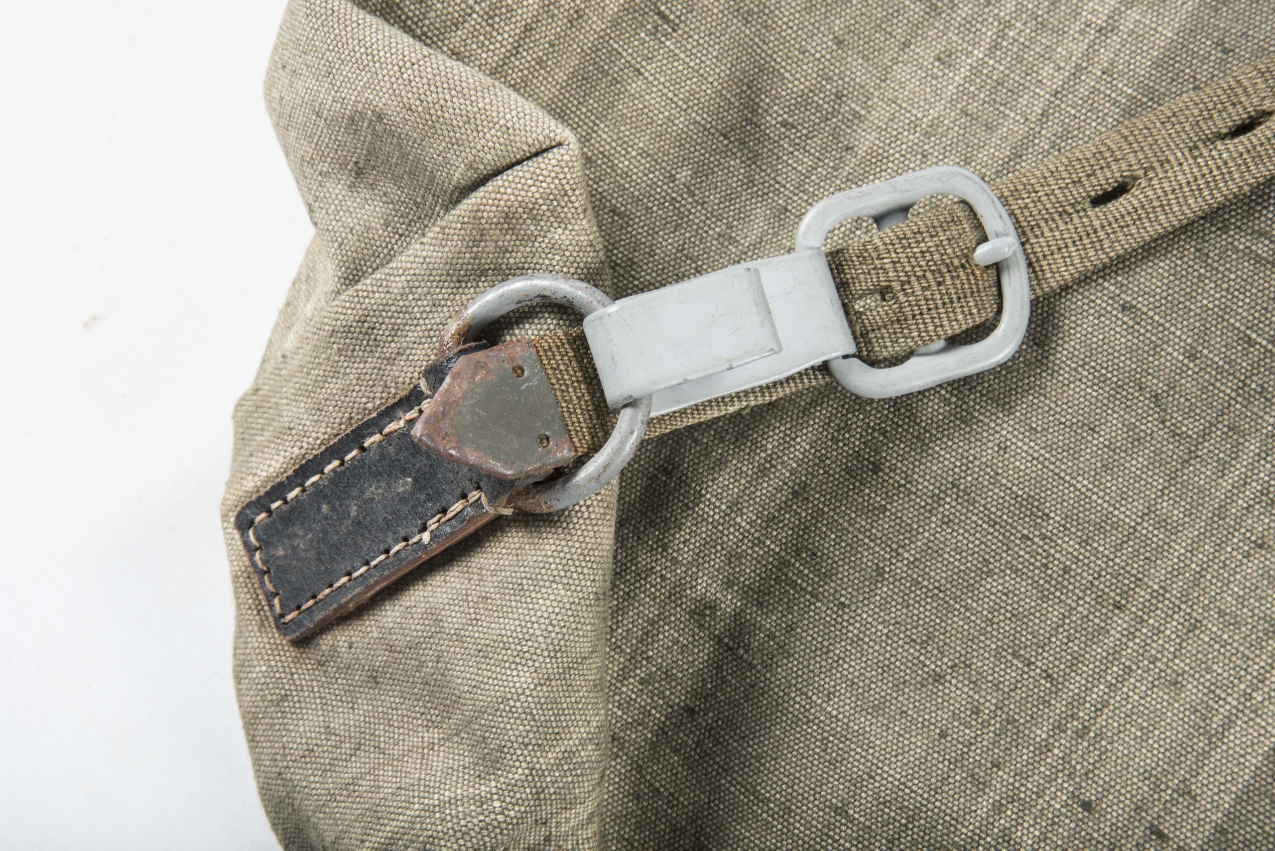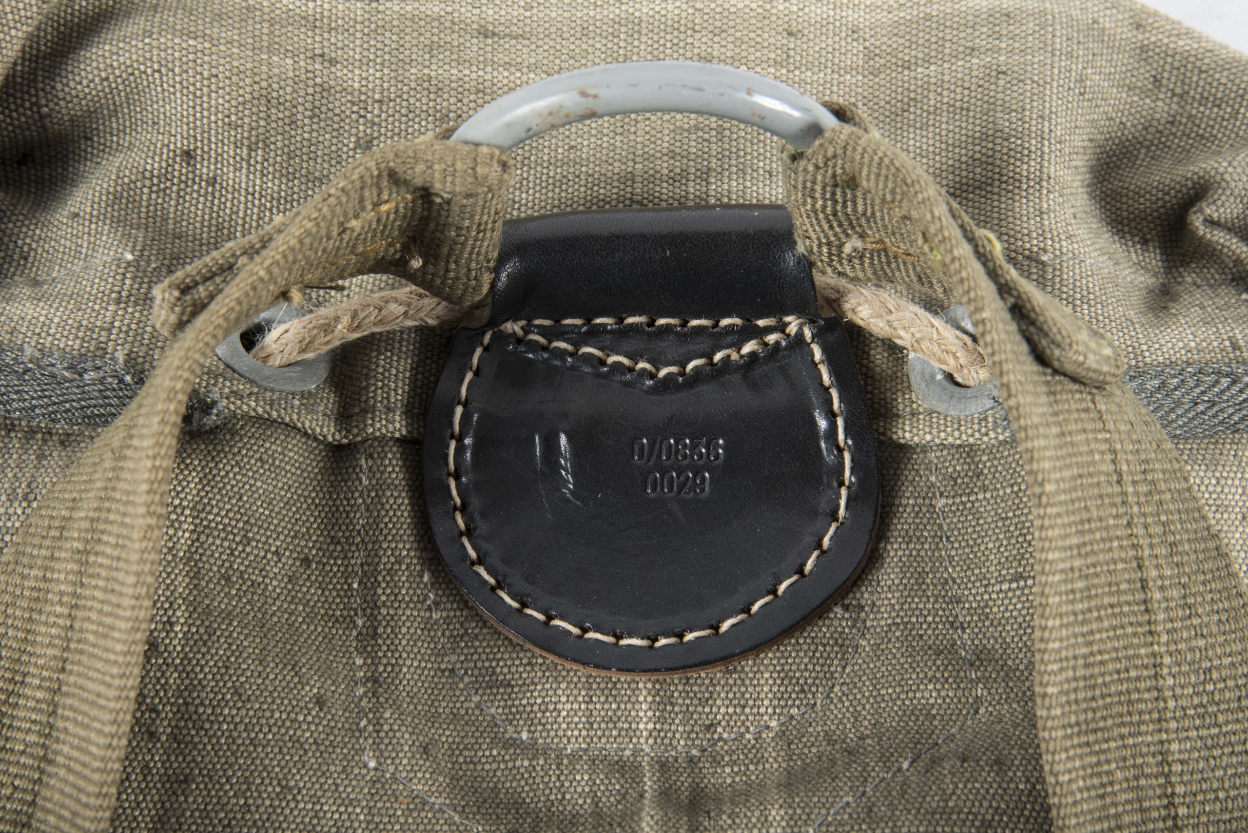 Late war rucksack marked 0/0836/0029. Nice variant late war rucksack made from screen printed canvas. Mint piece.