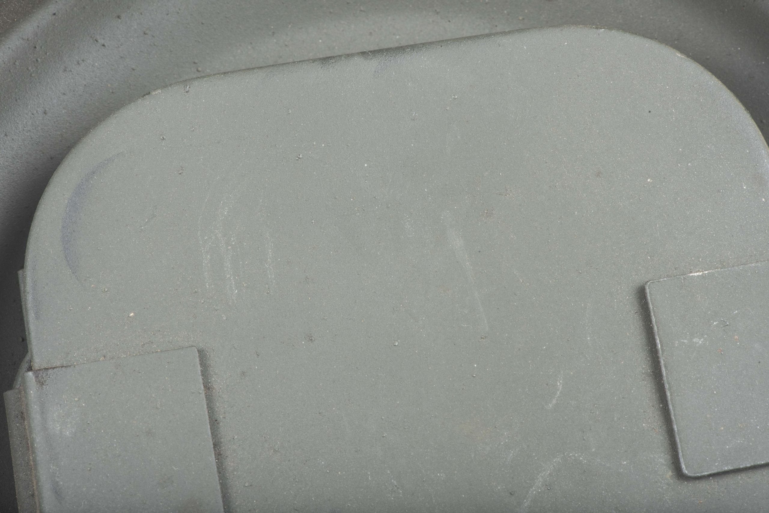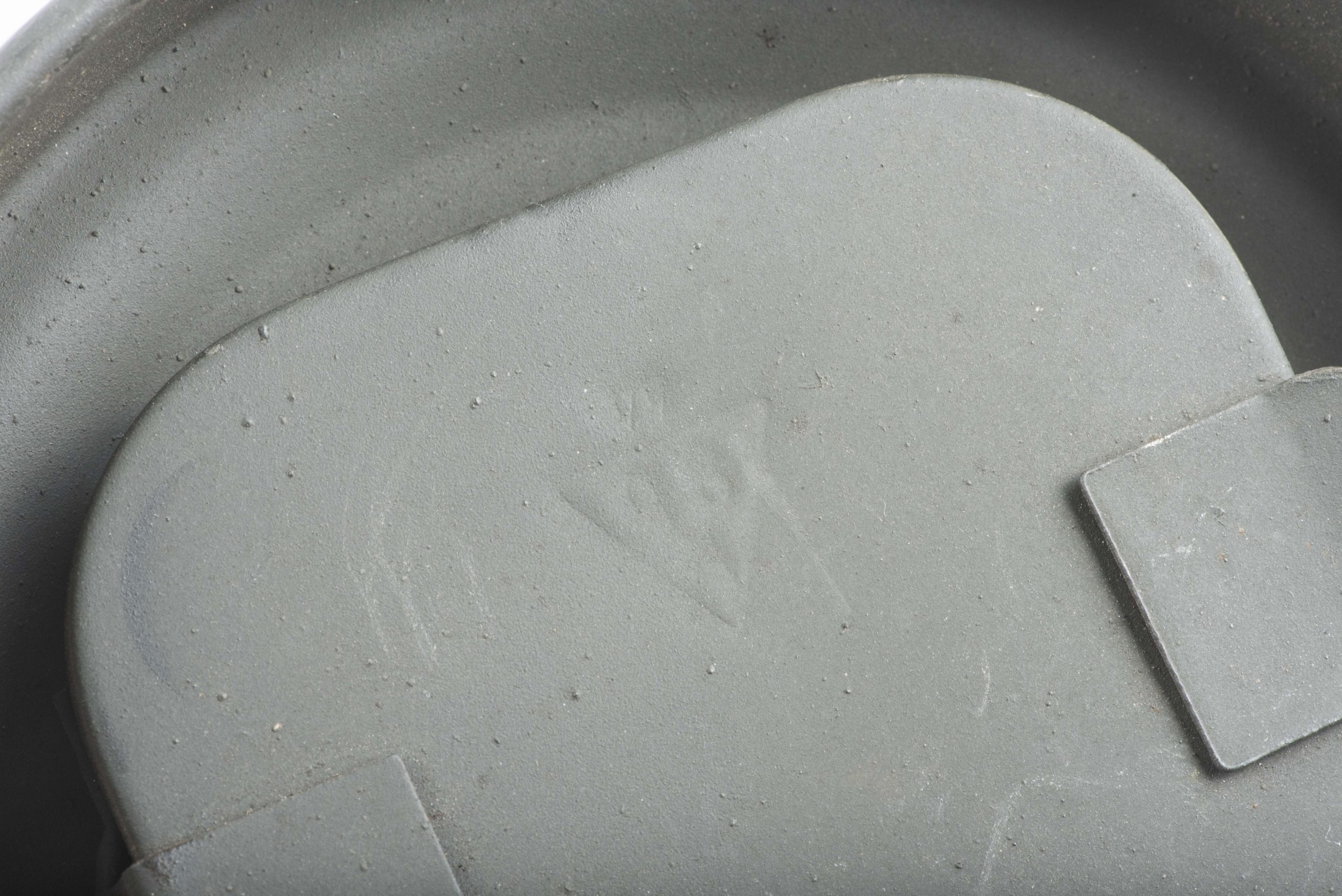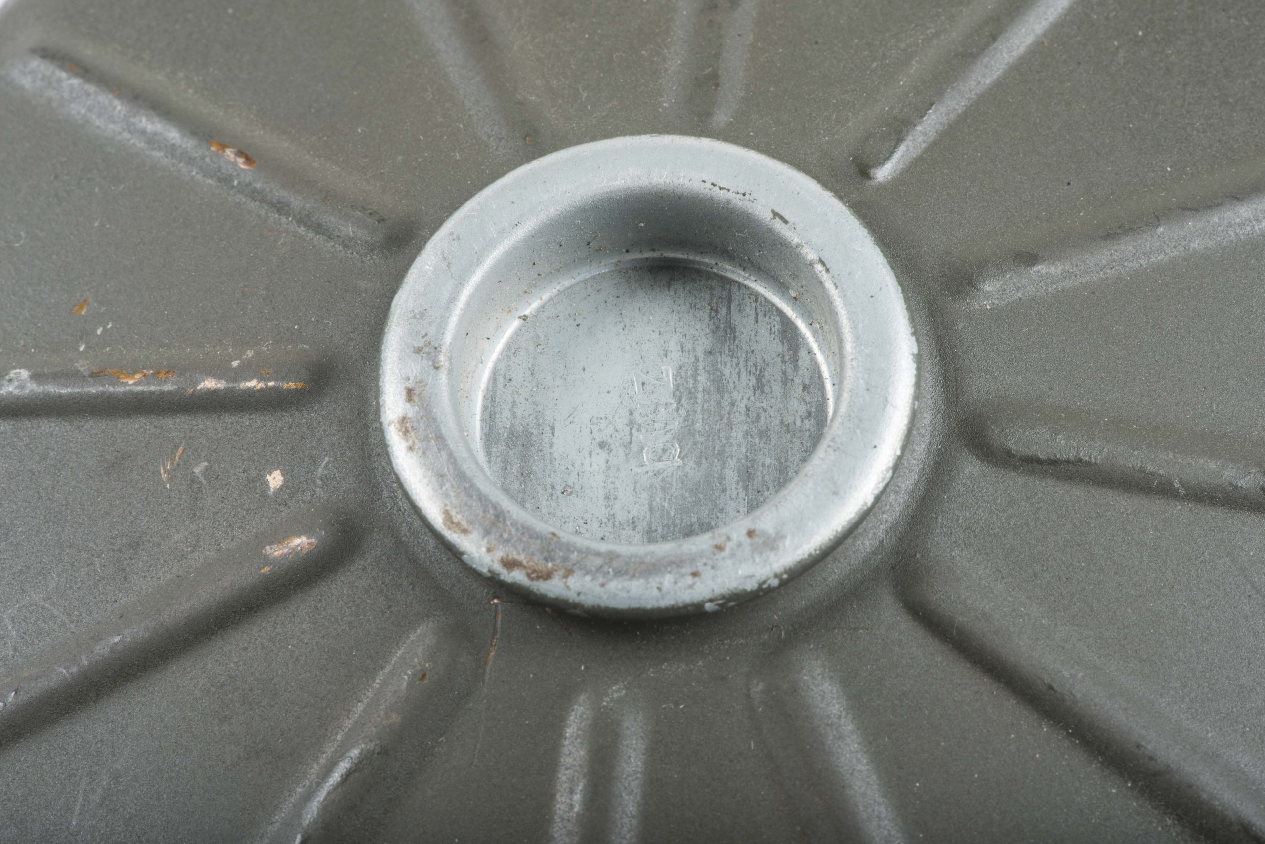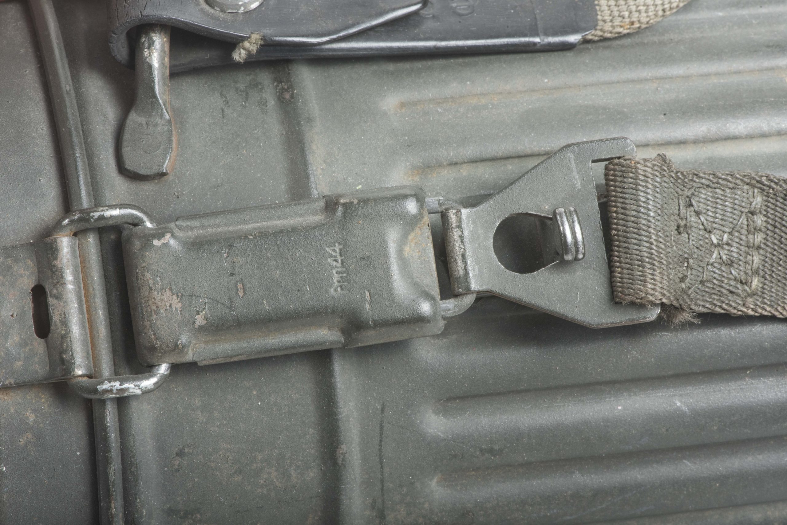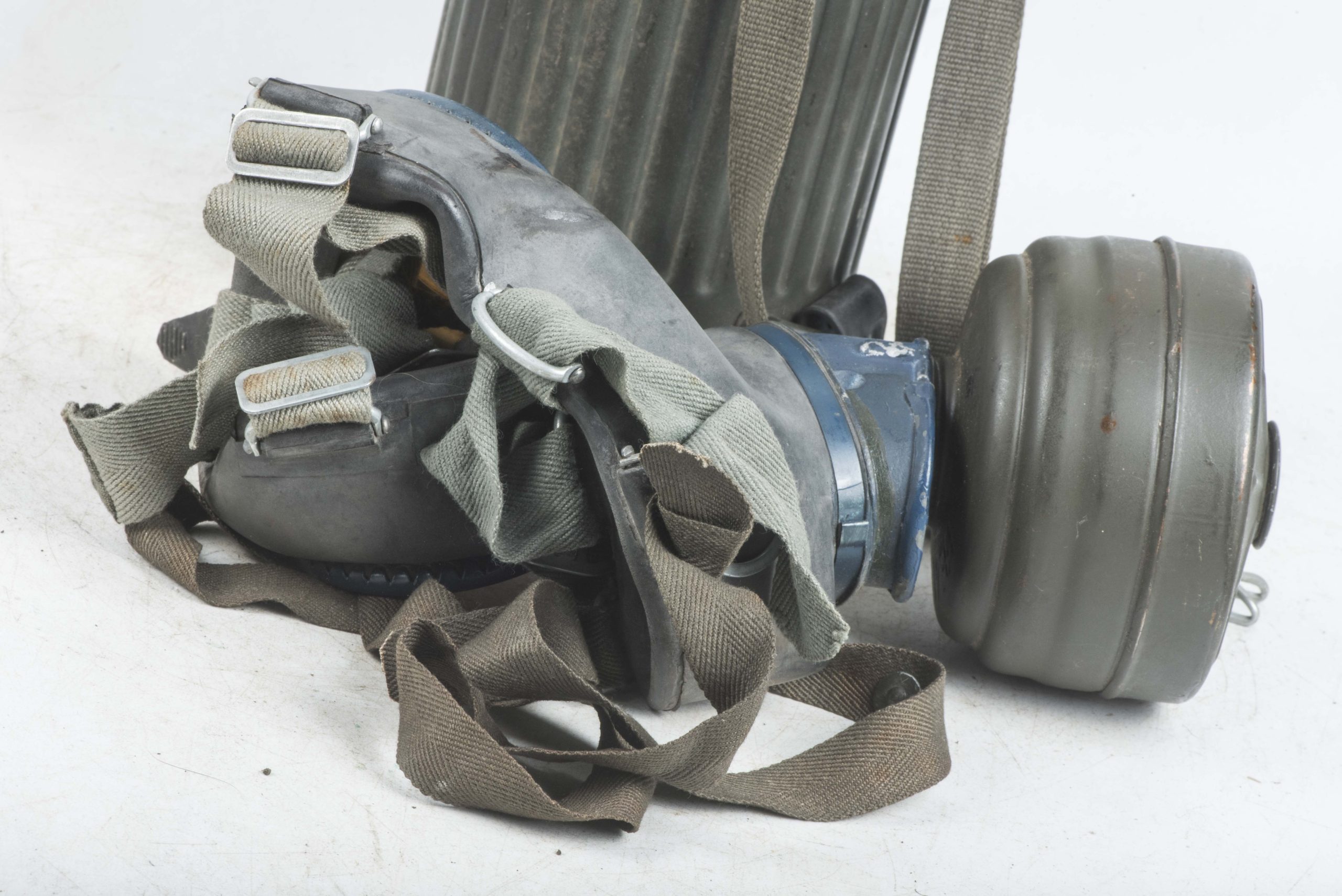 Late war tall M38 gasmask set with simplified canister in excellent condition. Beautiful canister with rayon straps including the closing latch strap. The closing latch is a simplified stamped steel example. The mask is a textbook late war example with blue parts. Beautiful unissued set!