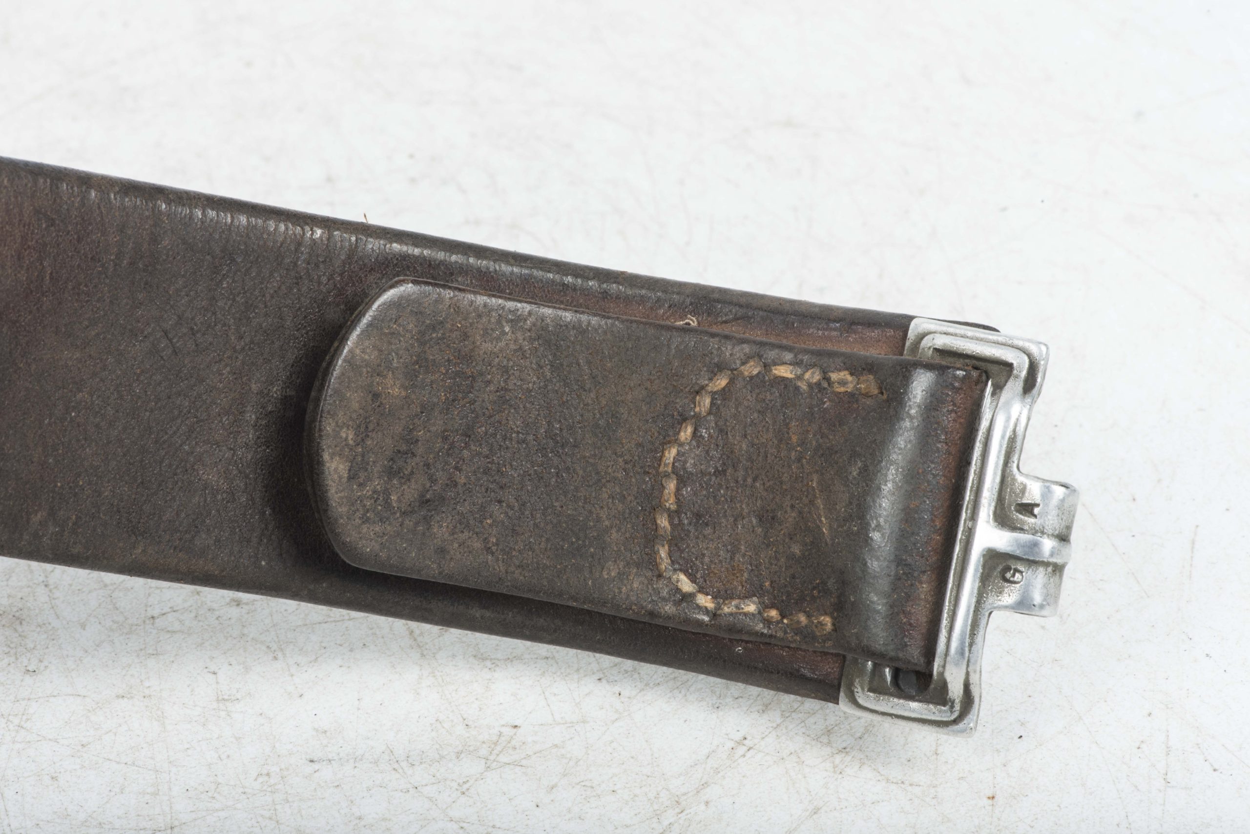 Nice original leather belt and belt buckle in good, untouched condition. The belt itself is nicely marked Carl Busse. The belt is marked 88 which indicates the belts length in centimeters. The belt buckle itself is a nice tabbed aluminium example. Nice original complete set!