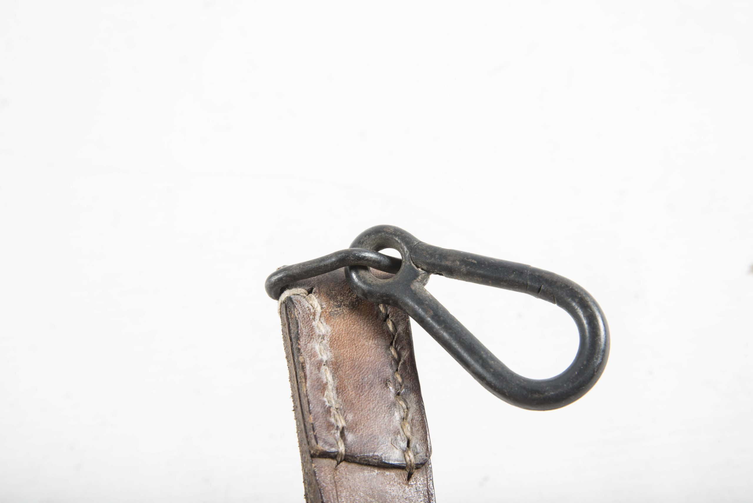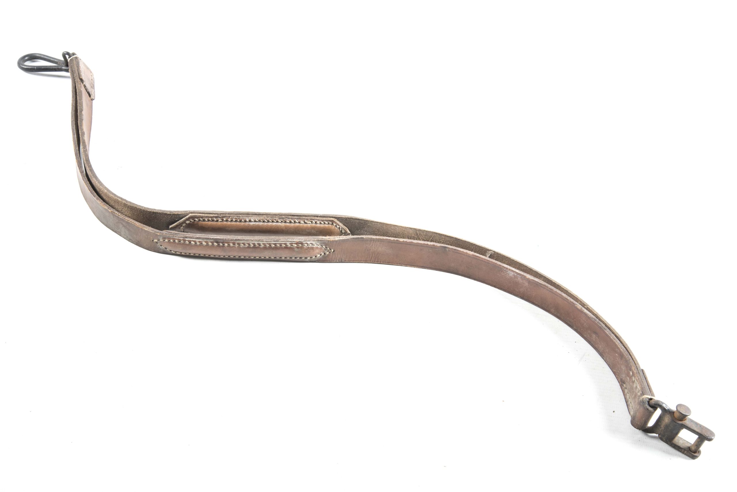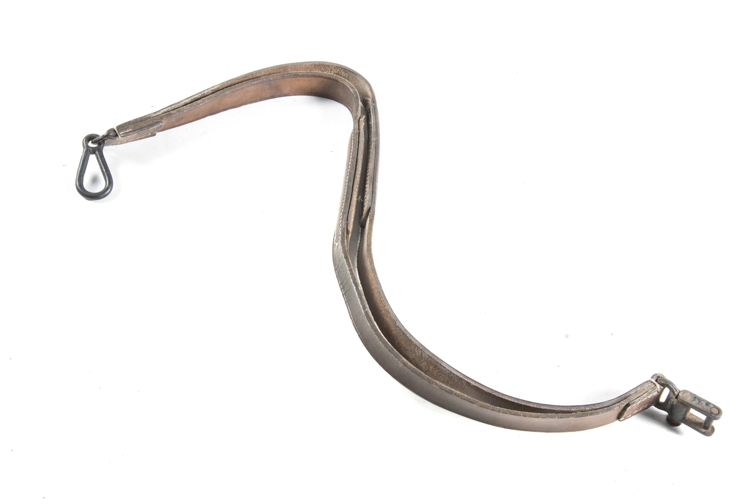 Leather MG34 u. MG42 sling in very good condition. The sling is intact with full working metal clips. The grip clip is a early pattern made for the MG34 but after checking it also fits on a MG42 grip. The leather is strong and plyable, there are two spots where it has some some surface cracks but no serious damage to the integrety of the strap itself. It would be a great asset to any MG display, it is very difficult to find such a light brown coloured sling which has not been oiled or heavy used condition. The sling is not visually marked which is typical as these markings are not always deep in the leather or on the rough side where it will always be difficult to see. This is a wartime sling; not to be confused with its postwar counterparts which are made to fit the MG42 and MG53 only. Hard to find piece!