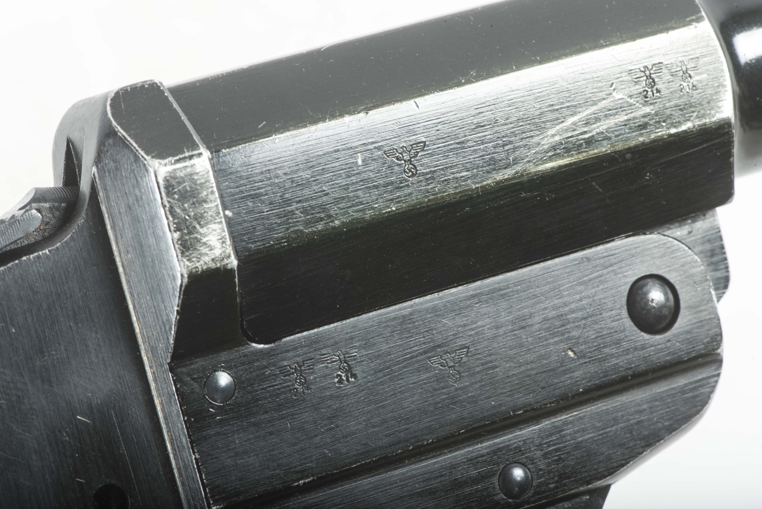 A very nice LP34 in excellent condition. The LP34 still has the full anodization finish and never has been repainted. The flare gun is marked S/237 1940 indicating production byBernard Berhauss, Lübeck in 1940. Note: the large spring pushing the barrel up is missing. The flare gun can be displayed perfectly and even if it cocks and fires I would not suggest firing it because of the missing spring. Otherwise still a perfect display piece as there are no optically missing pieces!
