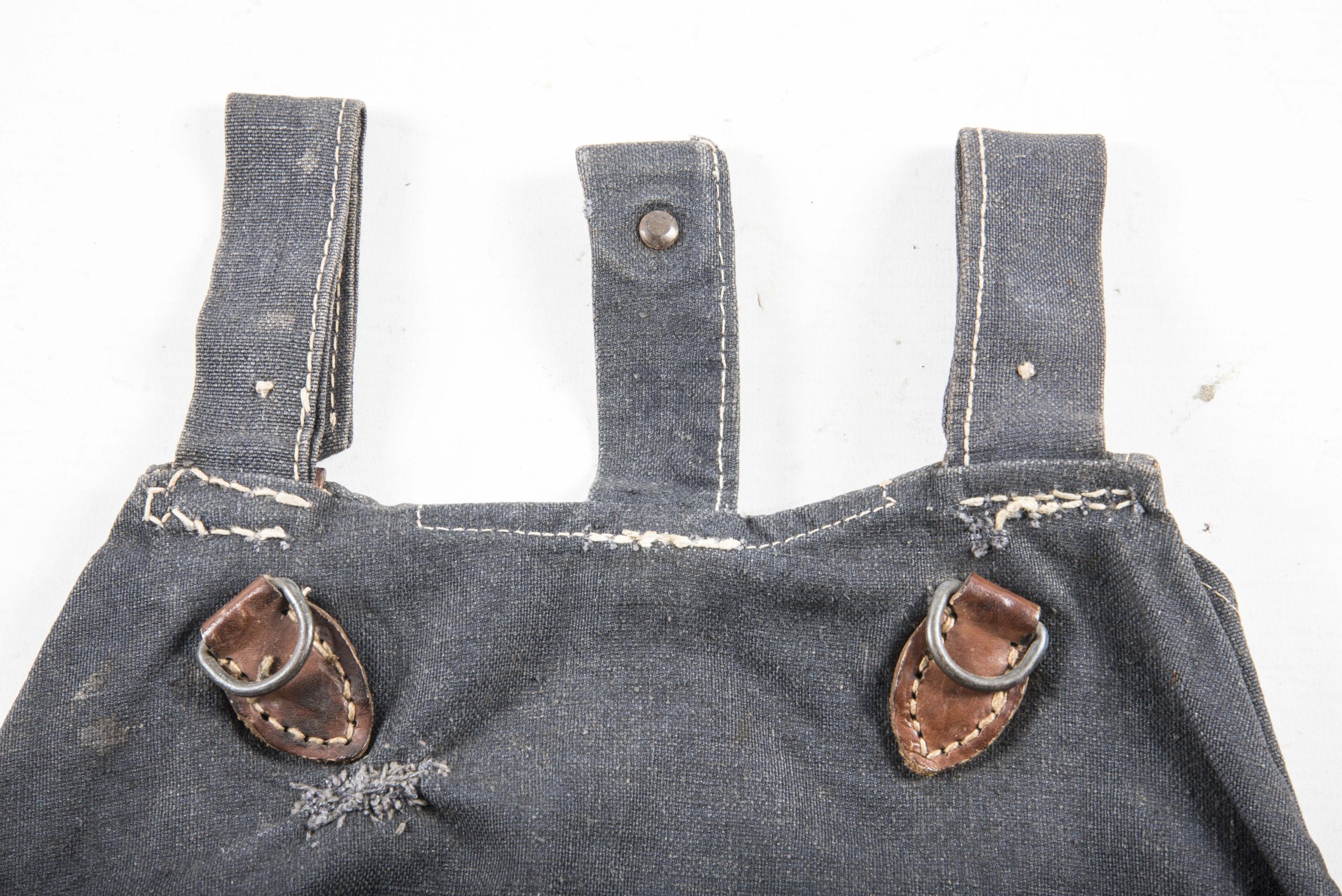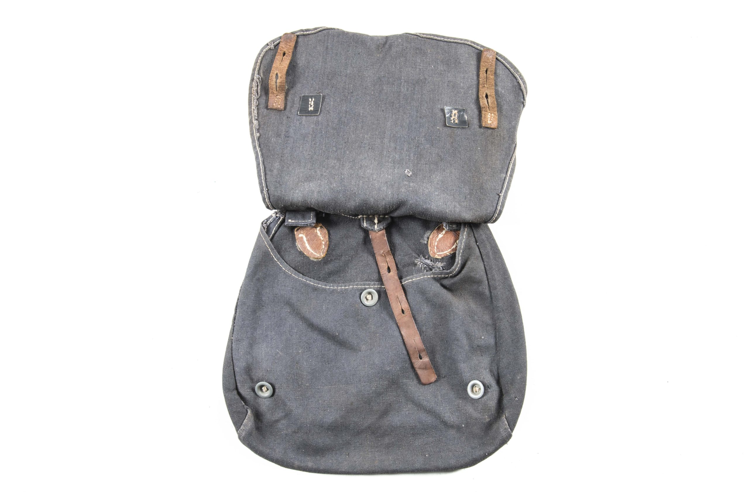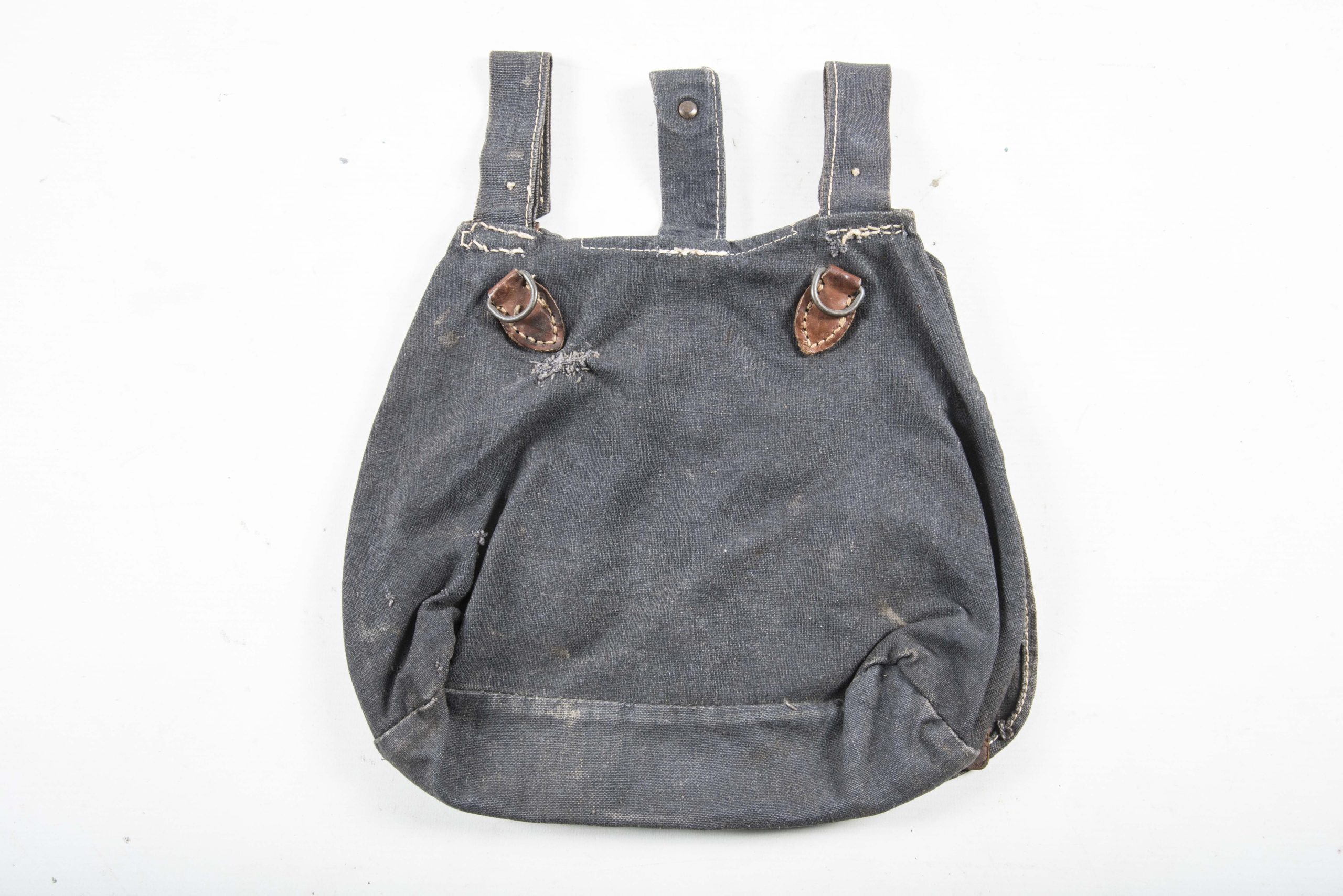 Textbook blue Luftwaffe issue M31 breadbag in very good condition. The breadbag is a typical late war example without leather reinforcements, steel hardware and brown coloured leather. Textbook example!
