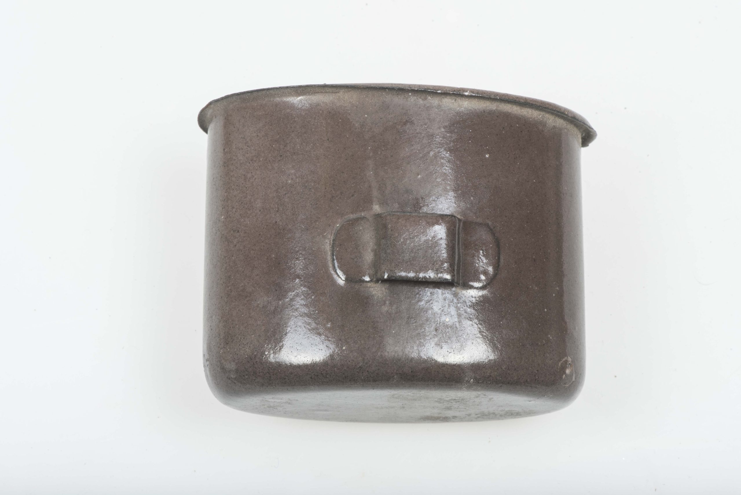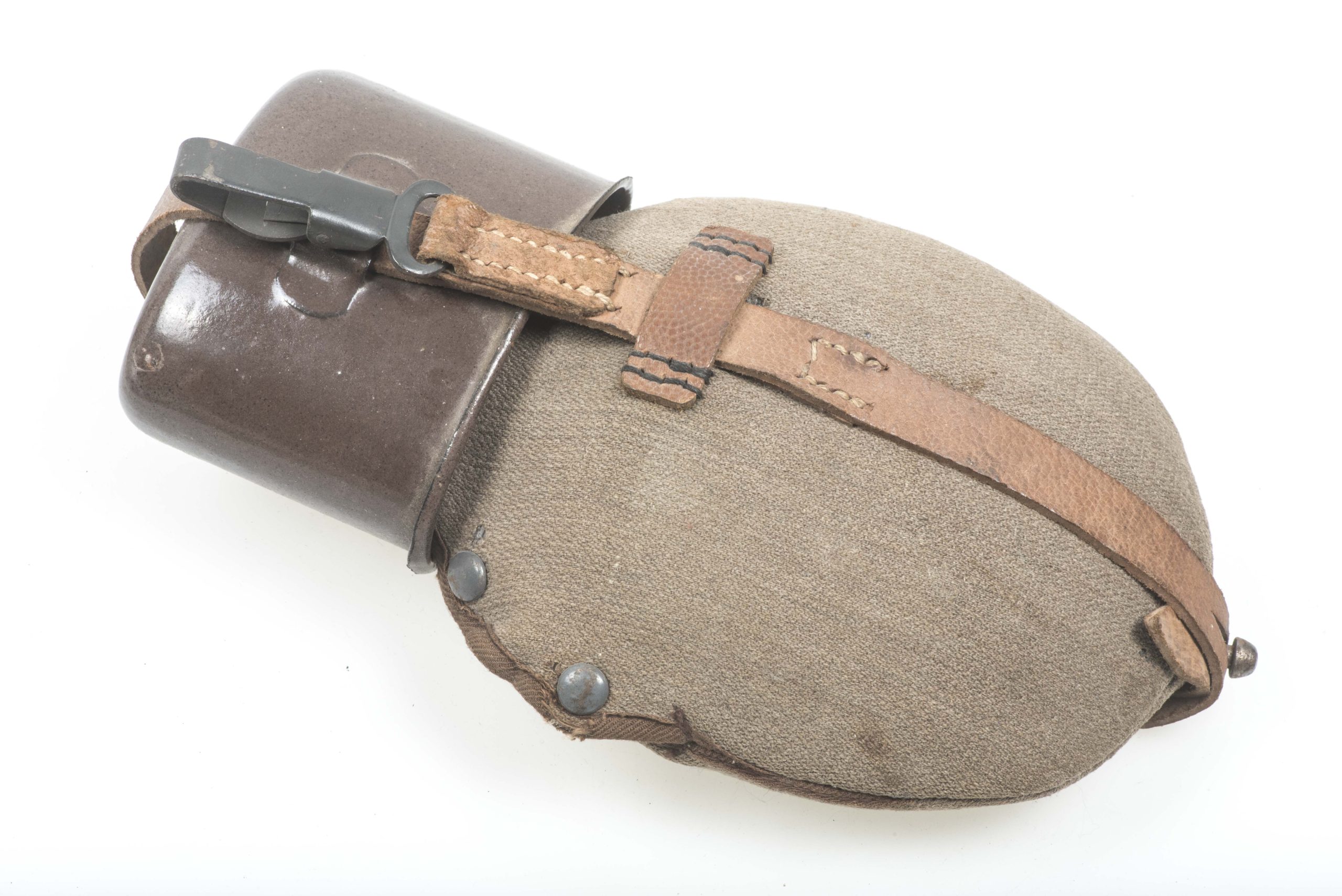 M42 Feldflasche by AEMA indicating indicating production by Annweiler Email-u.Metall-Werke, Annweil. The canteen is a late war (M42) type with a enameled steel body and cup. The cup is the last model without the handles and solely a small loop for the strap. The brown leather strap is a two piece M42 type. Sadly the buckle on the straps has broken off. The cover is made out of gaberdine and has 3, not 4, press studs. The canteen is in excellent unissued condition. Possibly one of the rarest canteens to find!