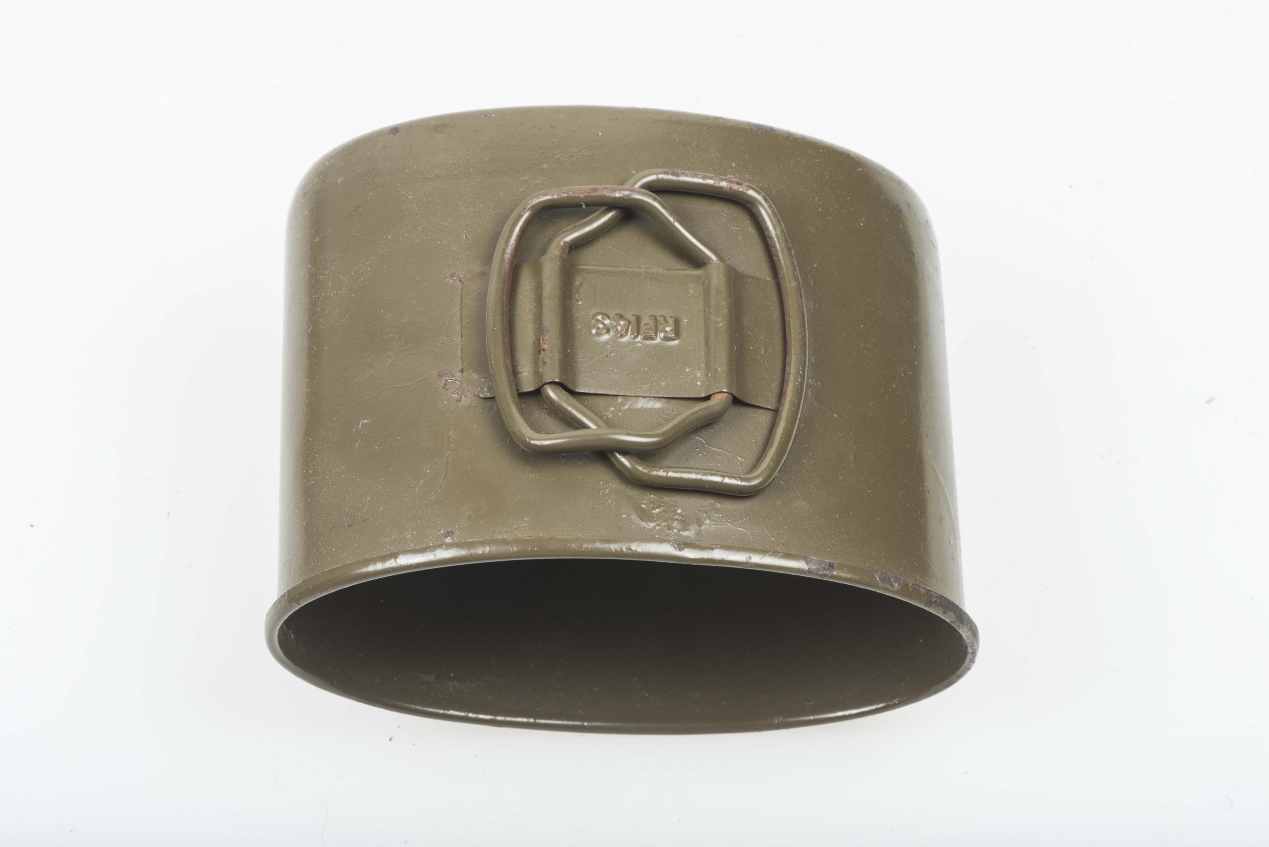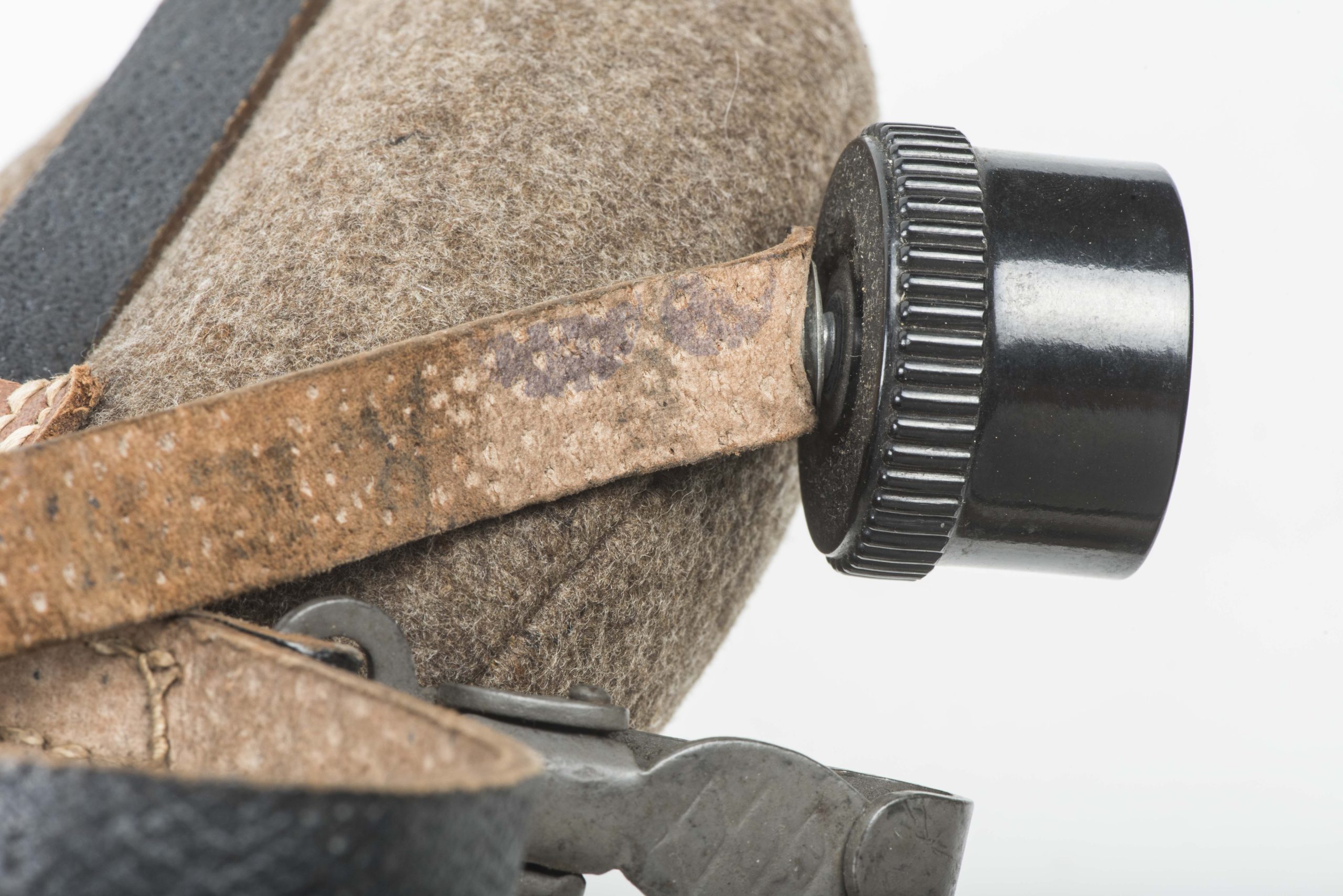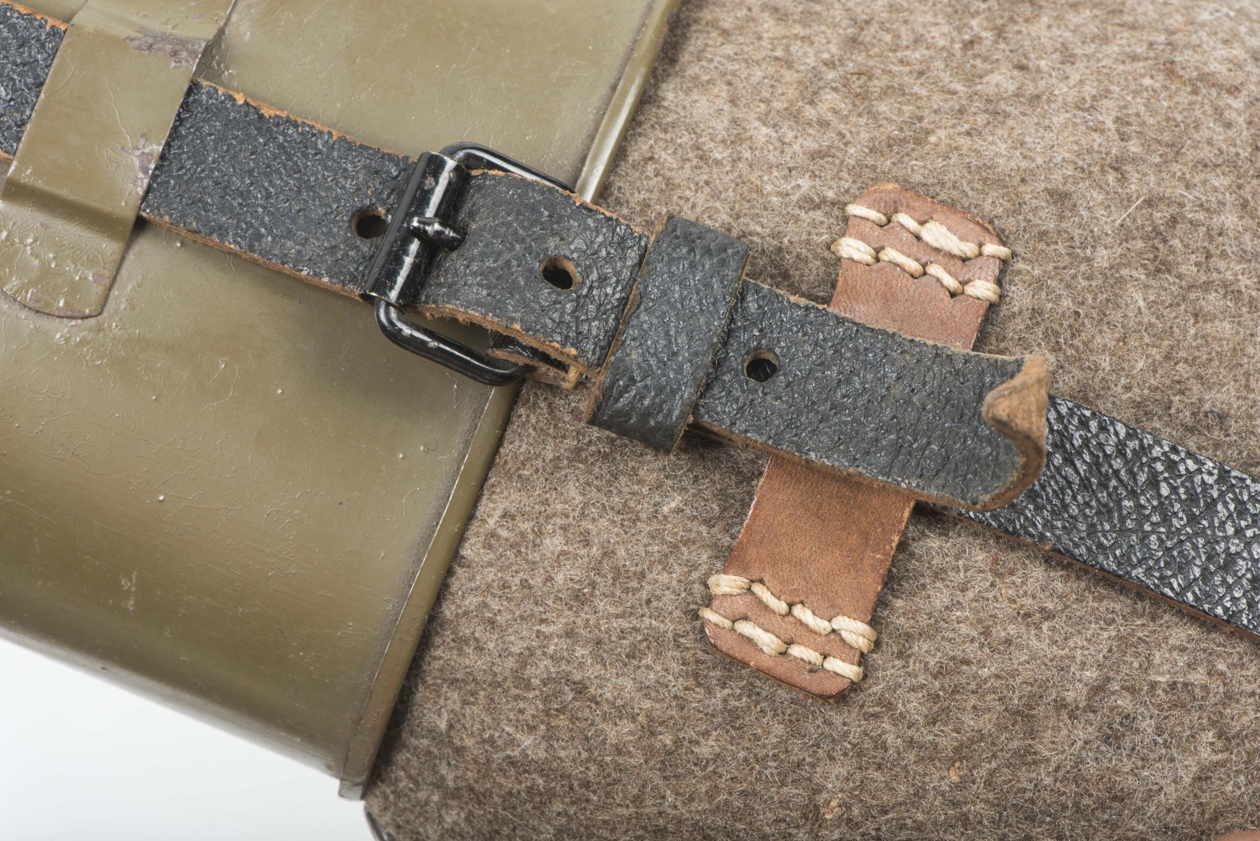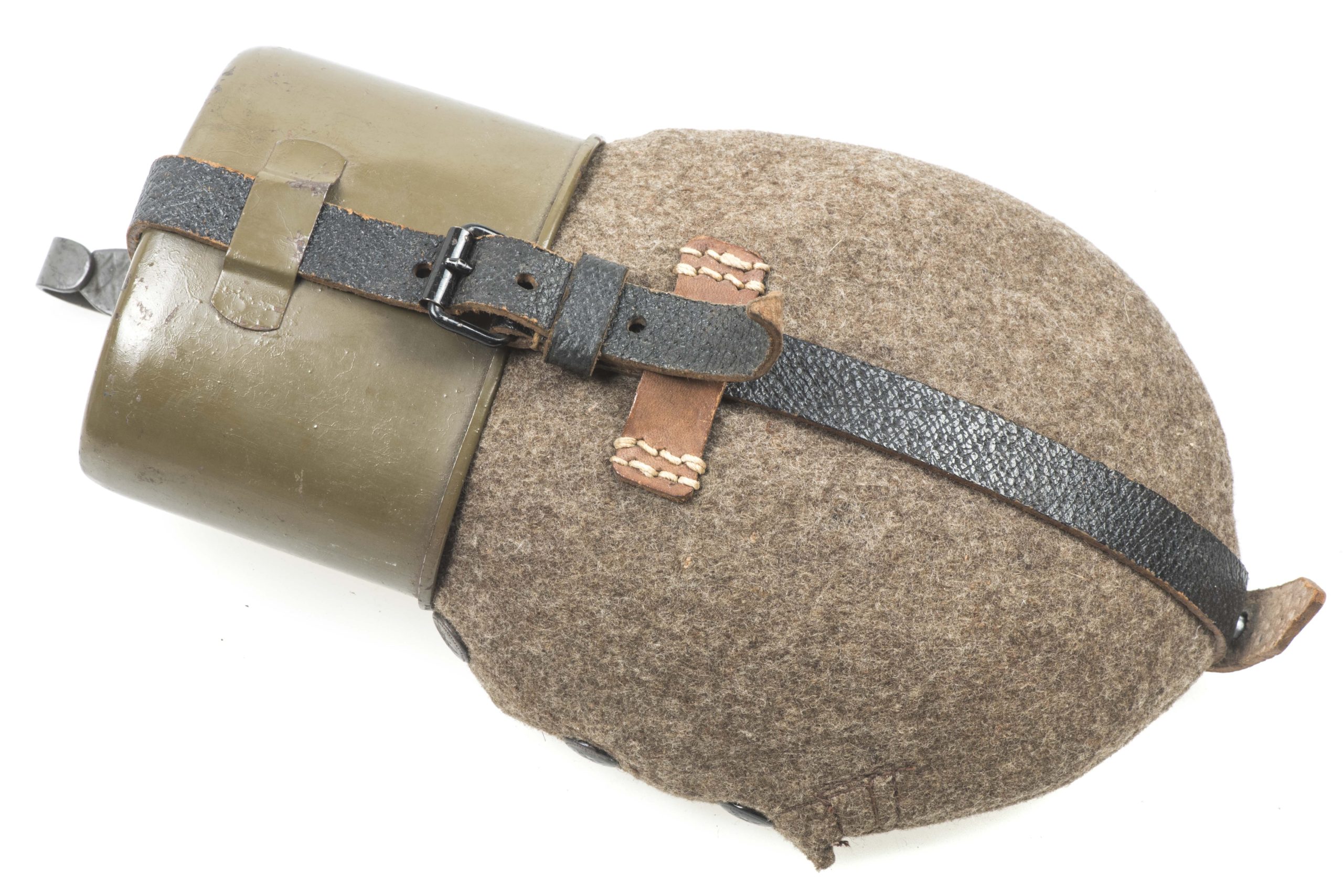 Textbook late war M42 canteen in very good condition. The canteen is a typical late war example with a rough wool cover and mixed pebbled and smooth leather on the straps. The green painted flask is nicely marked kvu which is the late war replacement for RFI which indicates production by Rudolf Fissler KG, Idar-Oberstein in 1944. The cup is matching to the canteen and nicely marked RFI 43 which indicates its most probable production very early in 1944. The canteen is in unissued condition and would be very hard to upgrade!