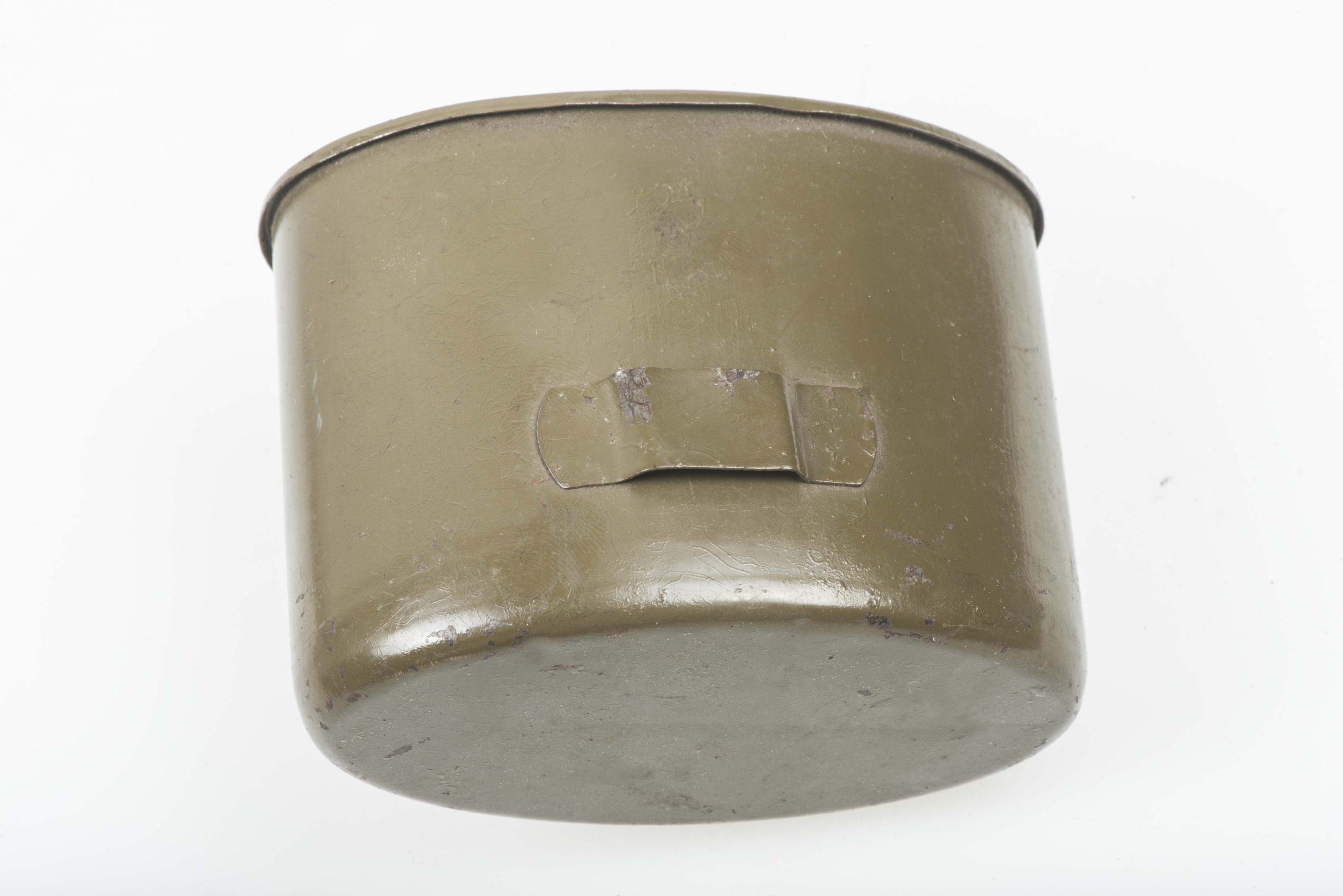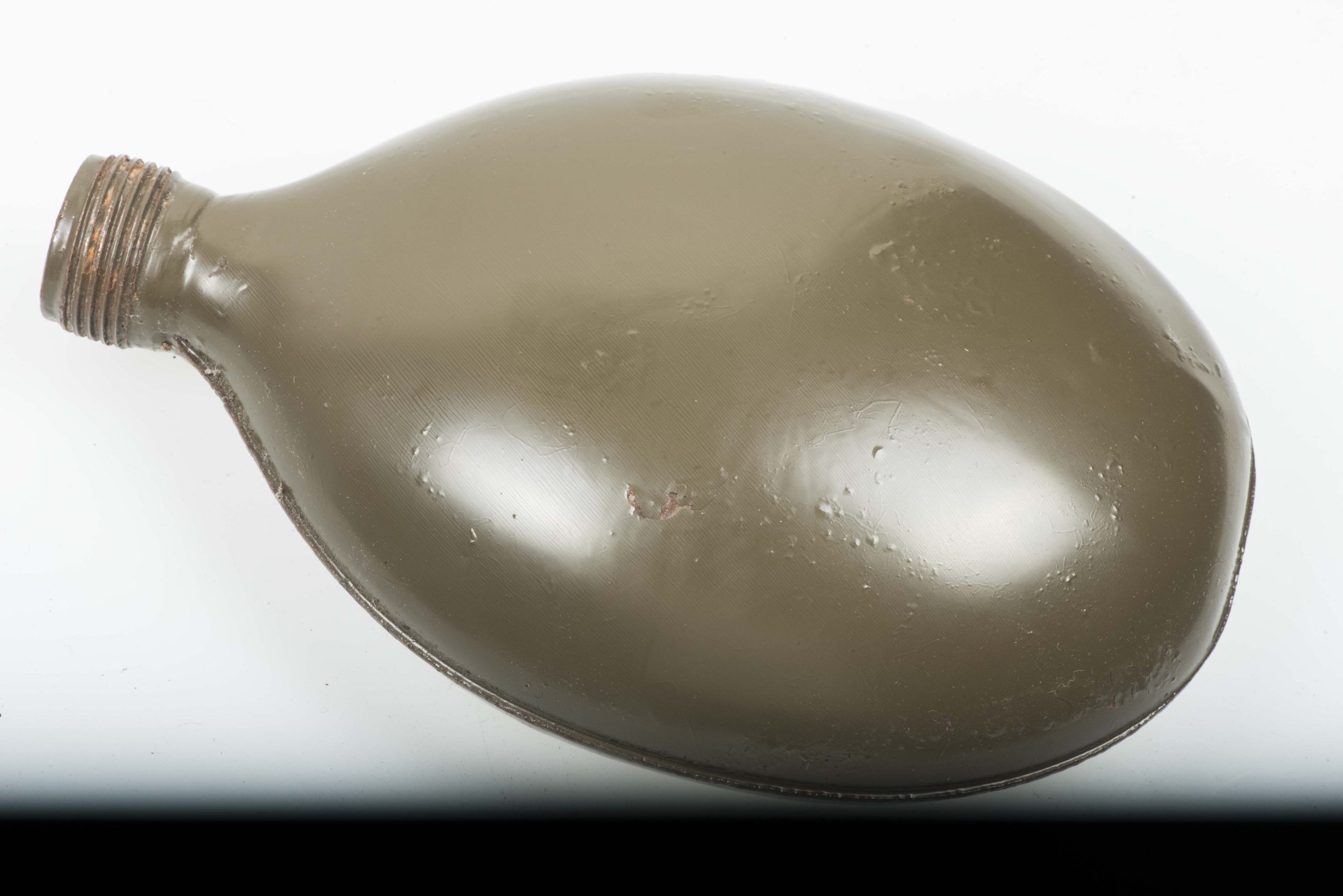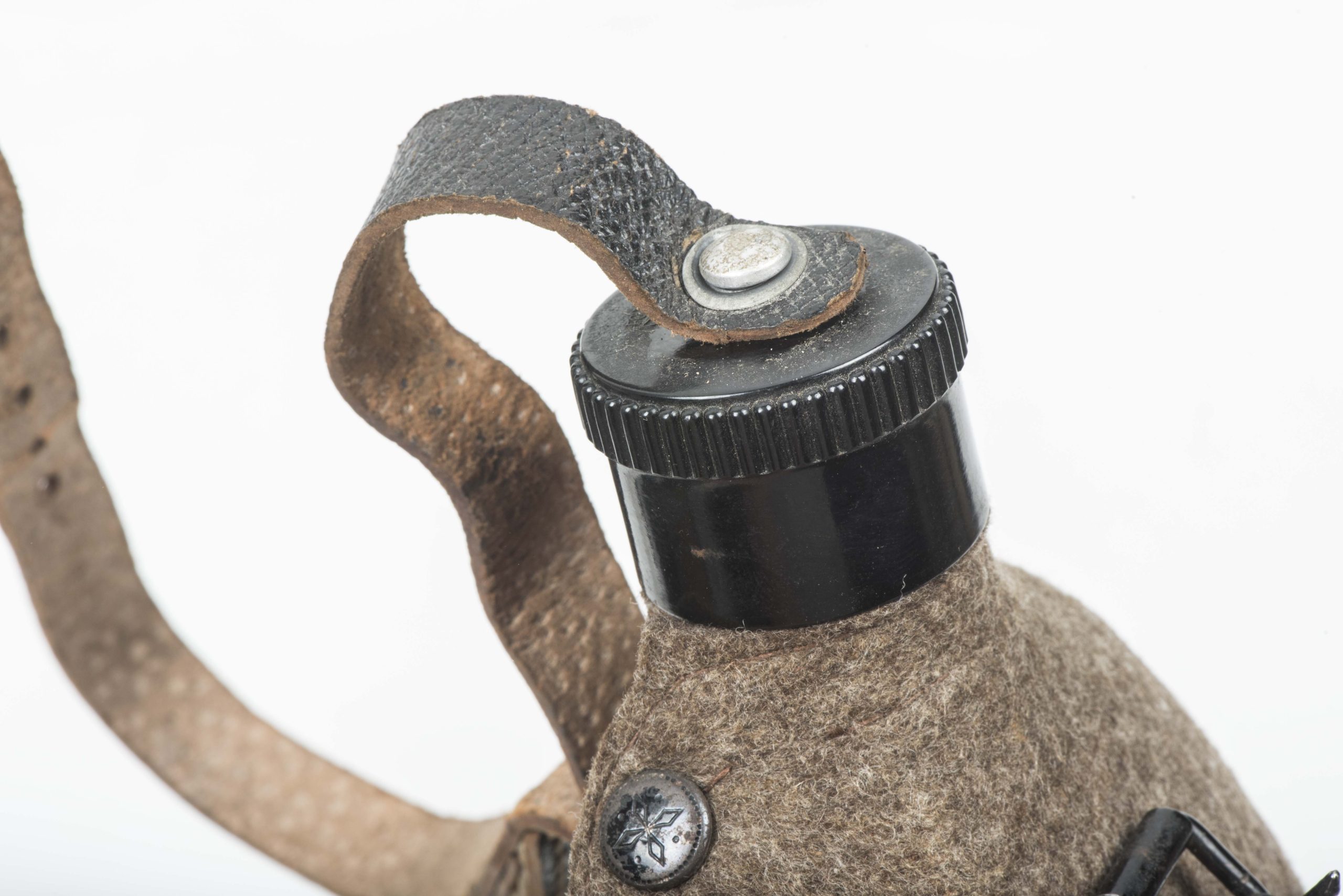 Textbook late war M42 canteen in very good condition. The canteen is a typical late war example with a rough wool cover and mixed pebbled and smooth leather on the straps. The green painted flask is nicely marked kvu which is the late war replacement for RFI which indicates production by Rudolf Fissler KG, Idar-Oberstein in 1944. The cup is matching to the canteen and nicely marked RFI 43 which indicates its most probable production very early in 1944. The canteen is in unissued condition and would be very hard to upgrade!