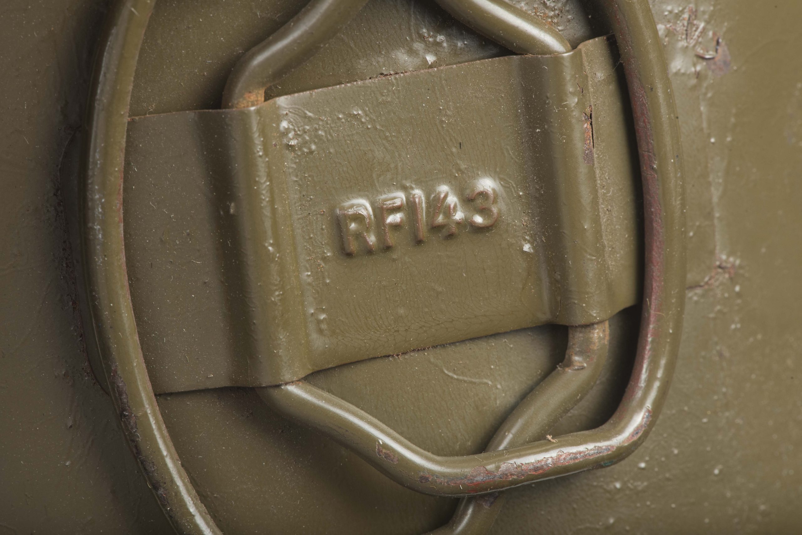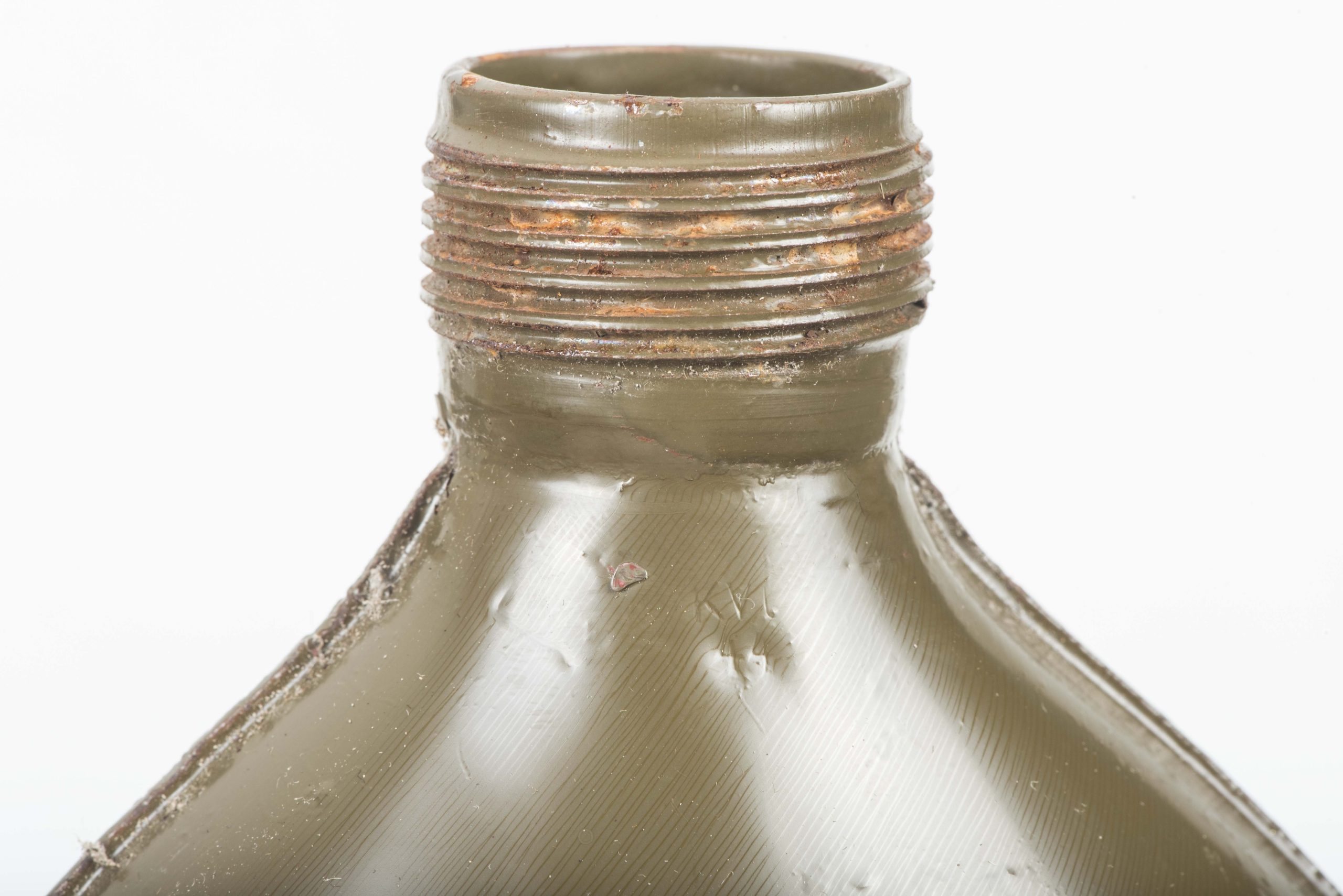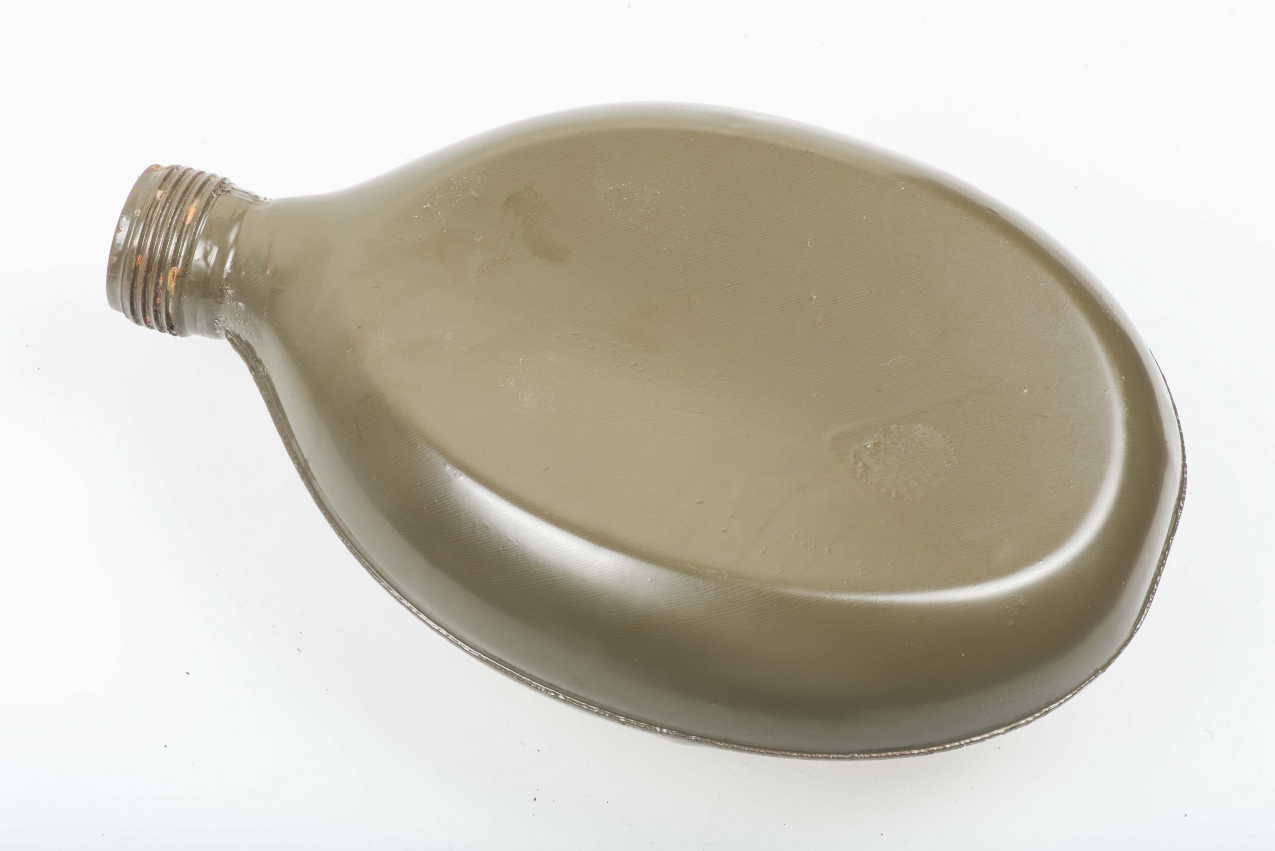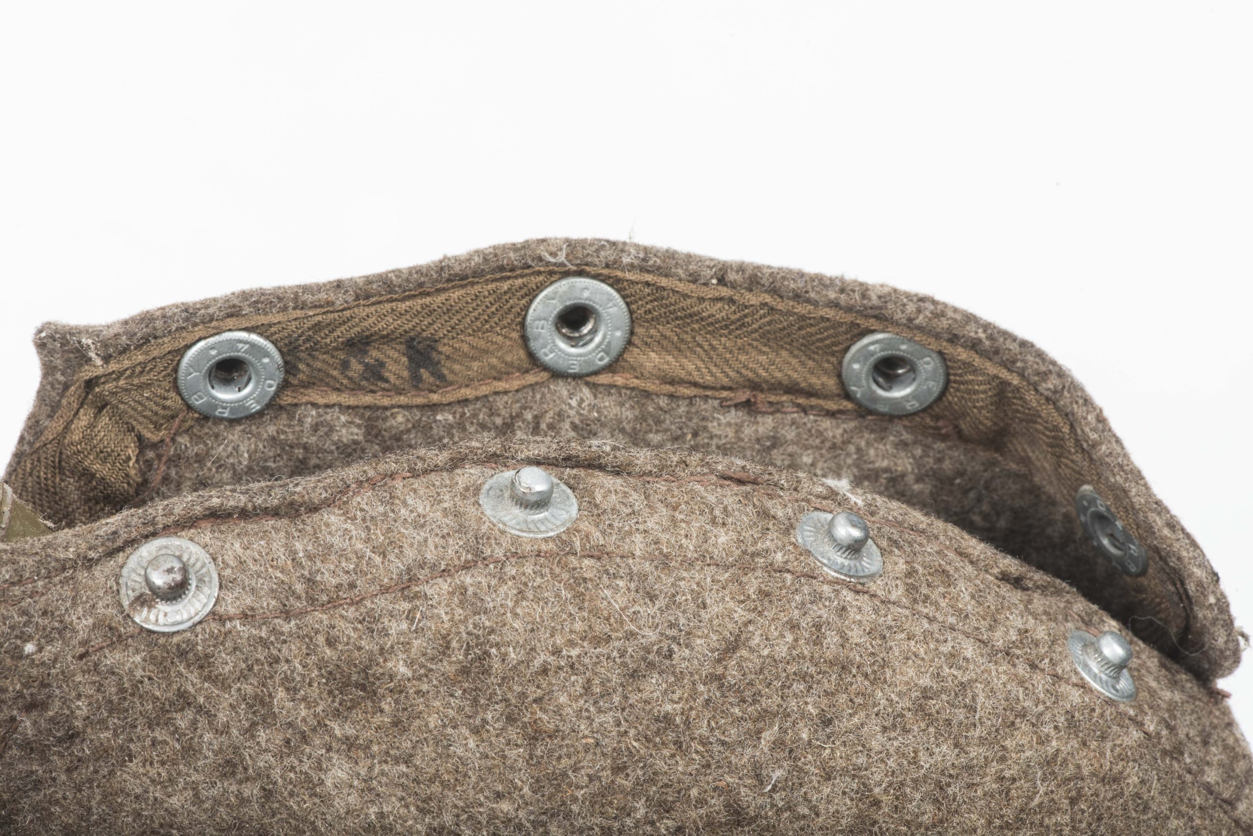 Textbook late war M42 canteen in very good condition. The canteen is a typical late war example with a rough wool cover and mixed pebbled and smooth leather on the straps. The green painted flask is nicely marked kvu which is the late war replacement for RFI which indicates production by Rudolf Fissler KG, Idar-Oberstein in 1944. The cup is matching to the canteen and nicely marked RFI 43 which indicates its most probable production very early in 1944. The canteen is in unissued condition and would be very hard to upgrade!