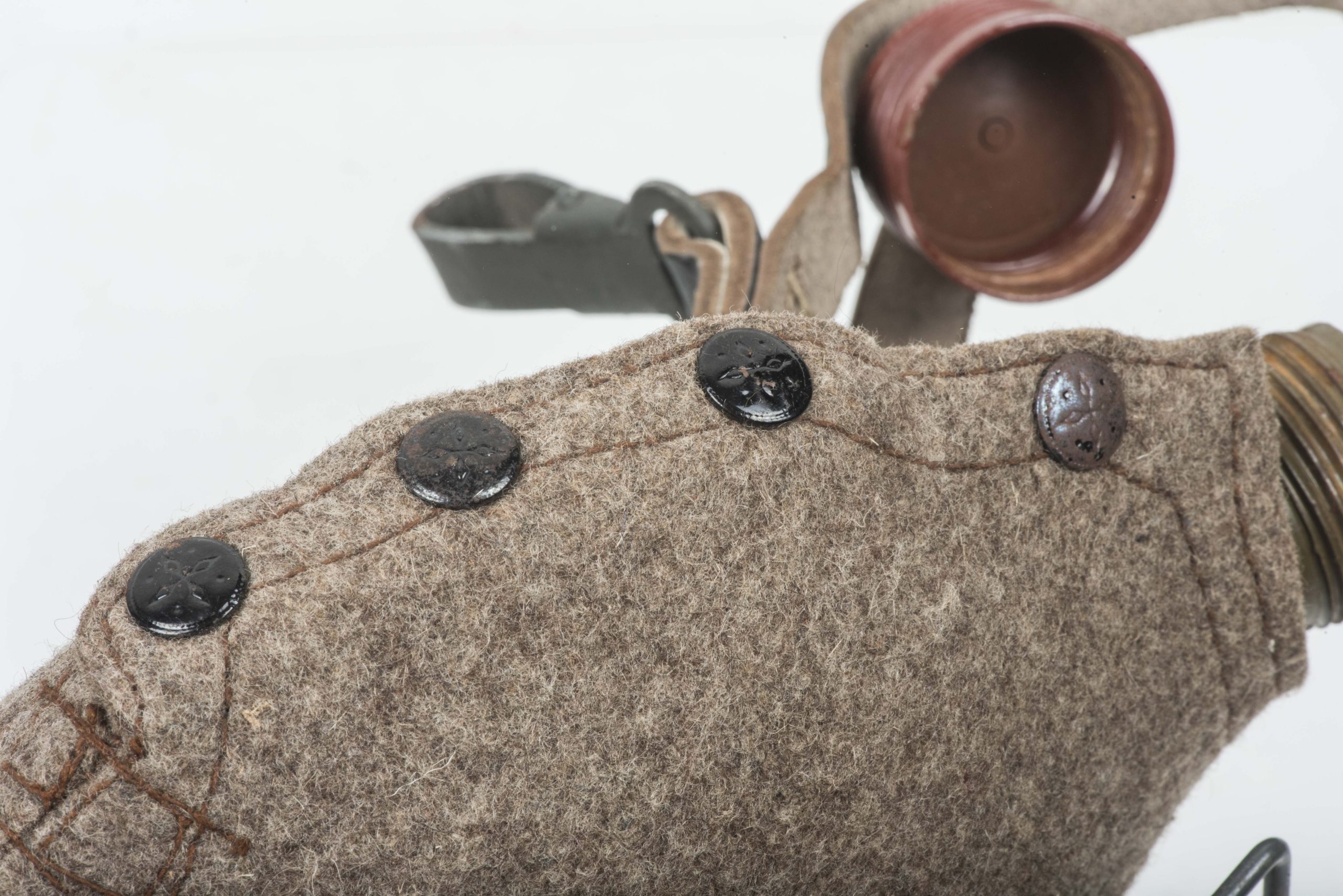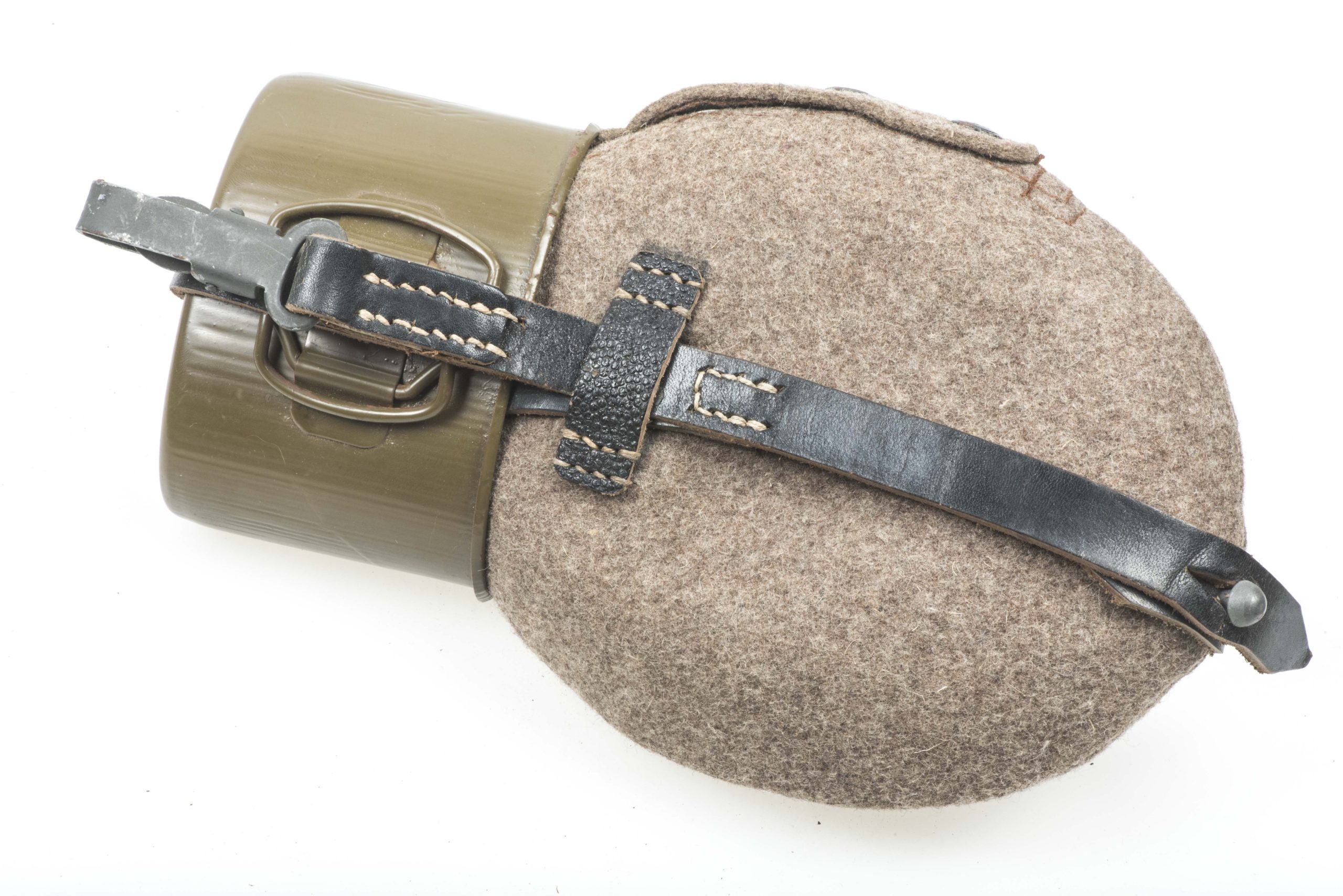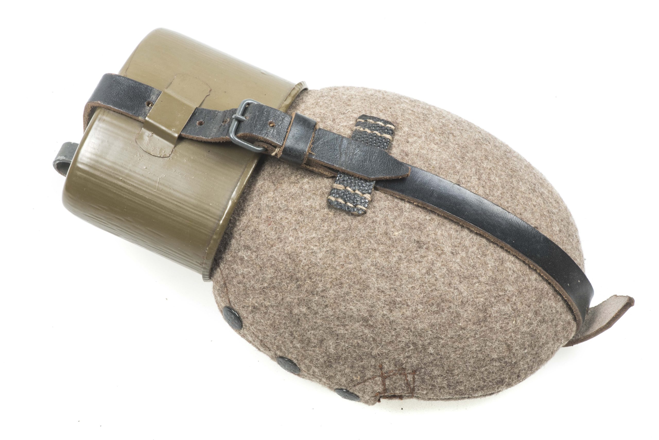 Textbook late war M42 canteen in very good condition. The canteen is a typical late war example with a rough wool cover and mixed pebbled and smooth leather on the straps. The green painted flask is nicely marked kvu which is the late war replacement for RFI which indicates production by Rudolf Fissler KG, Idar-Oberstein in 1944. The cup is matching to the canteen and nicely marked RFI 43 which indicates its most probable production very early in 1944. The canteen is in unissued condition and would be very hard to upgrade!
