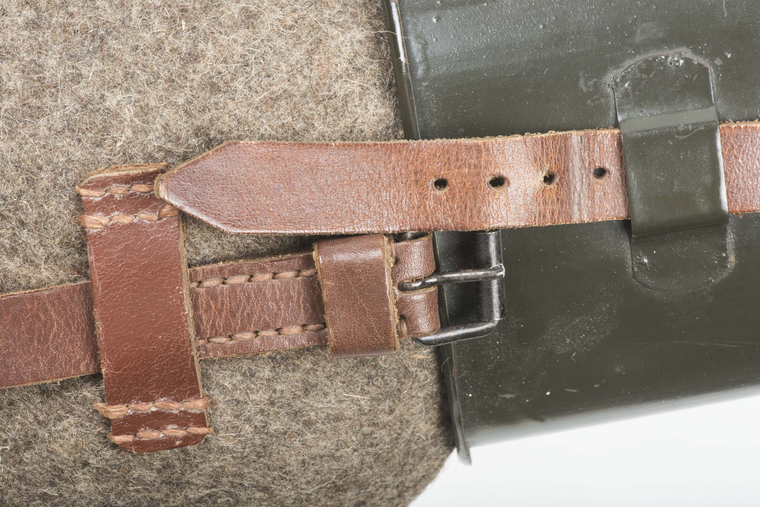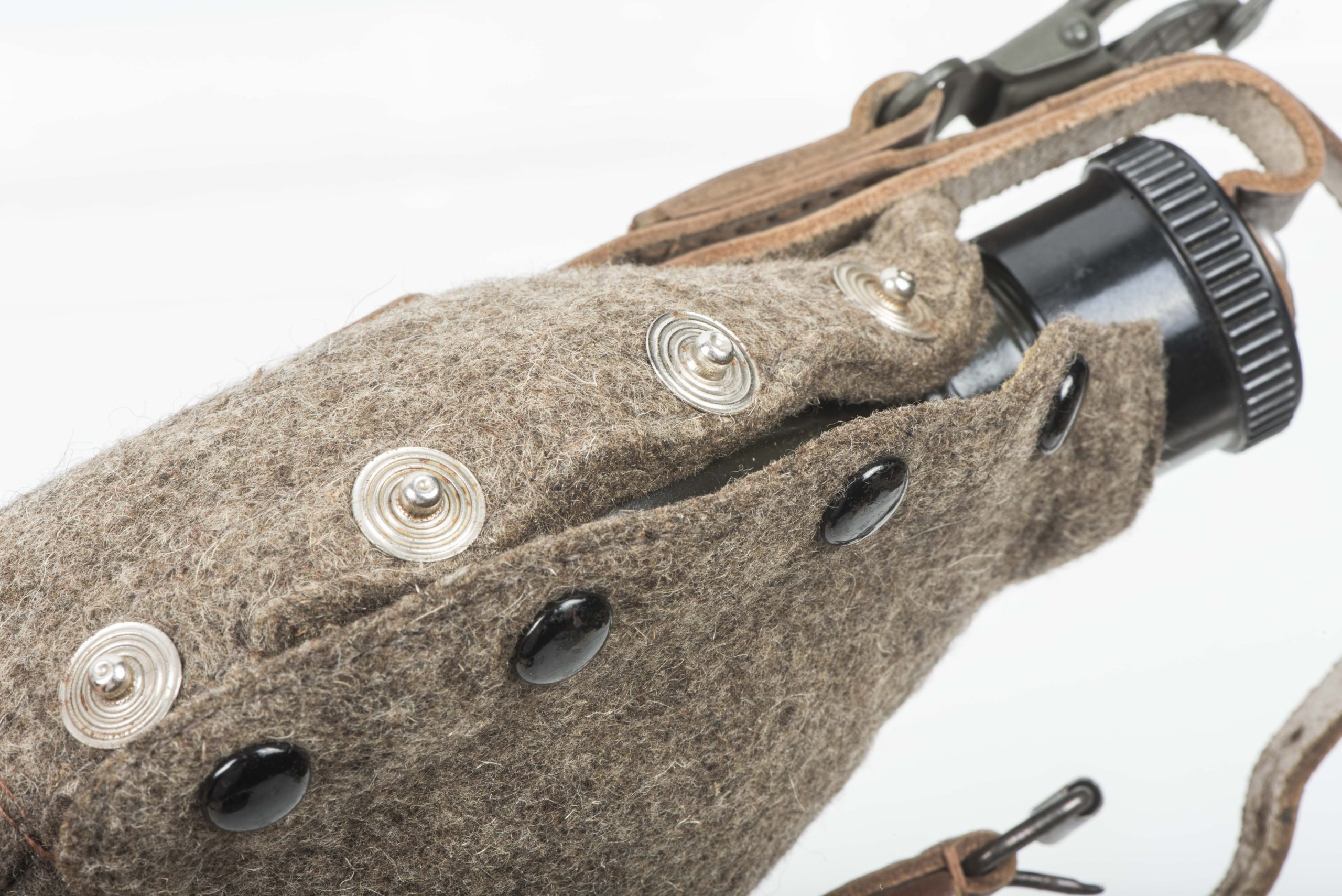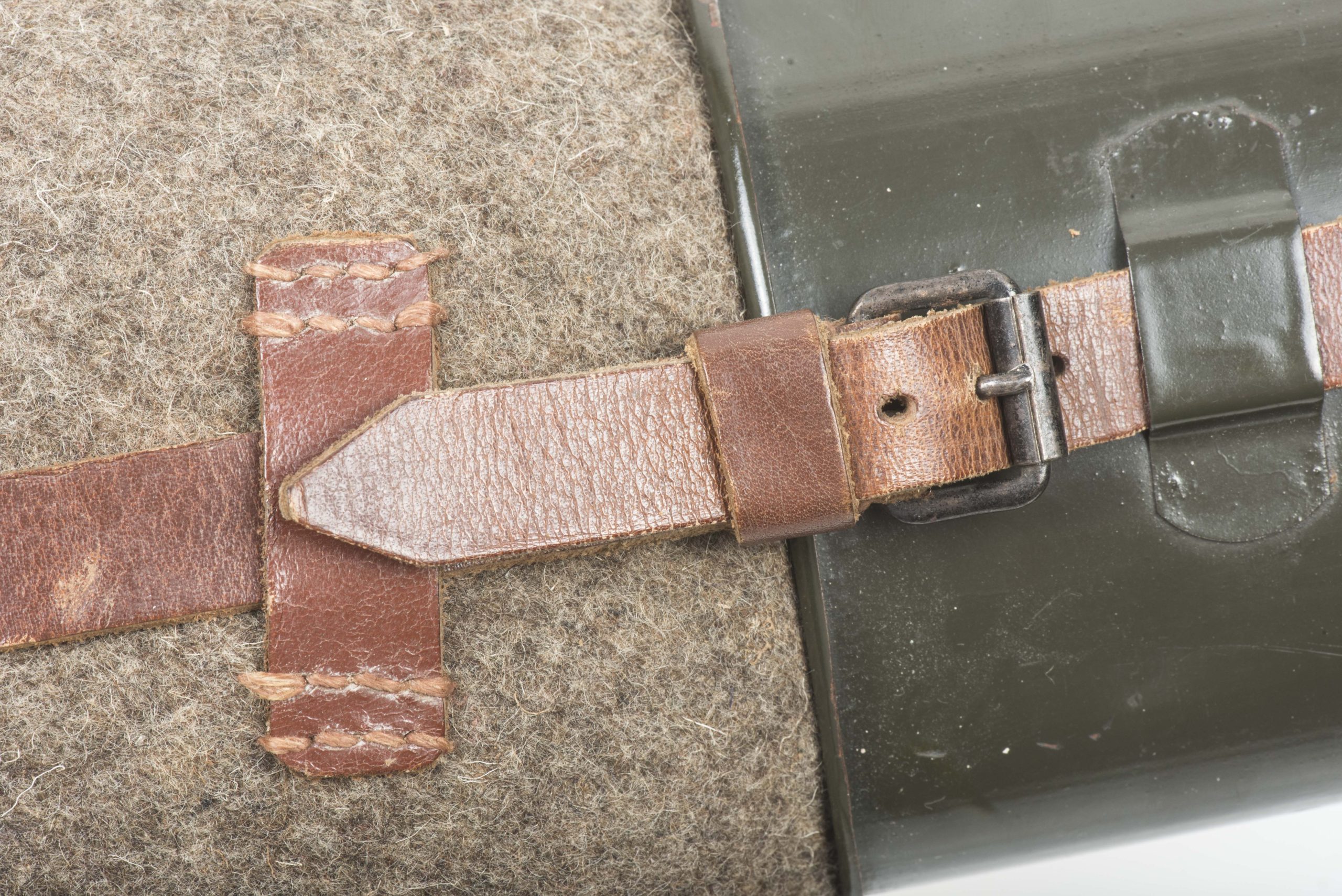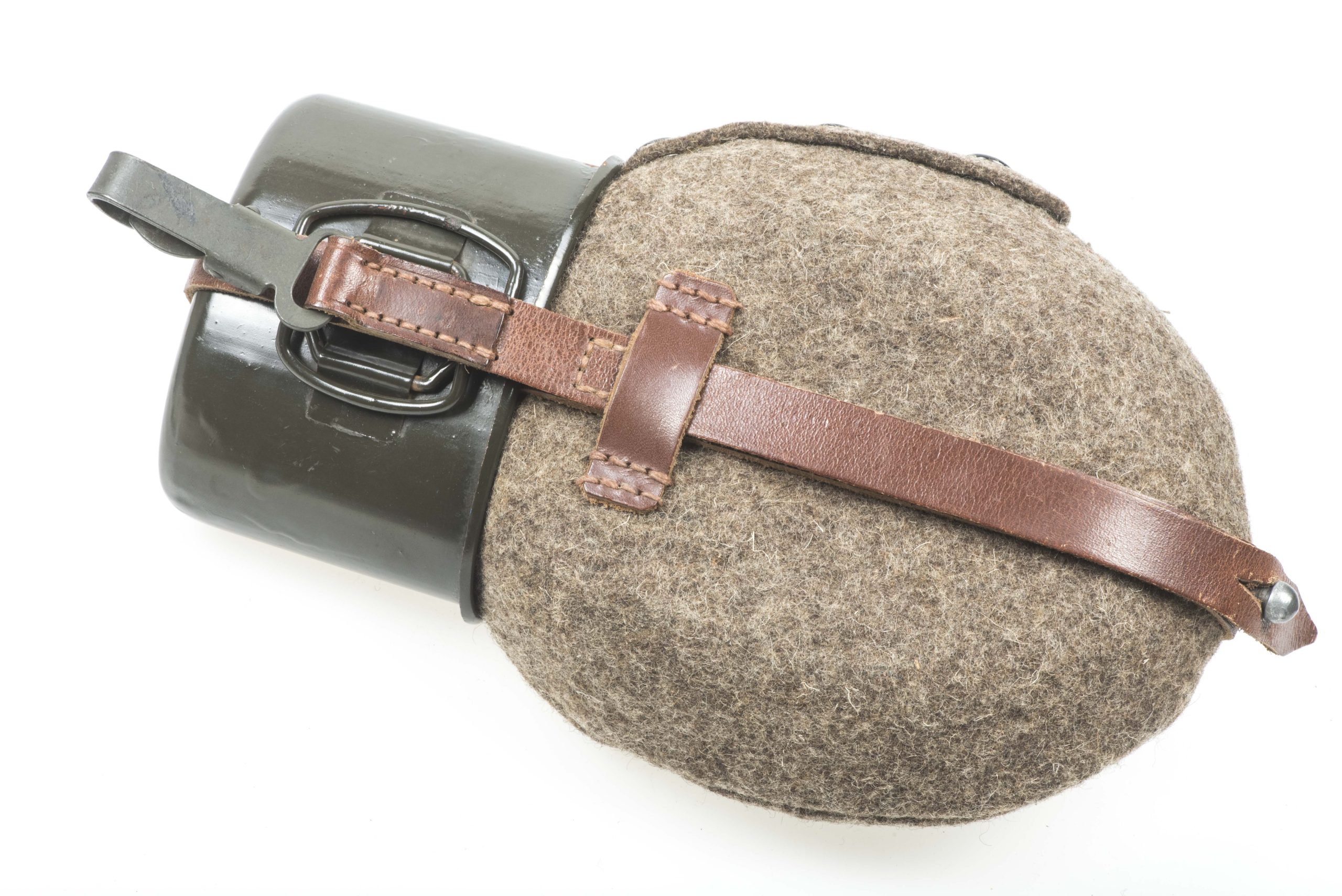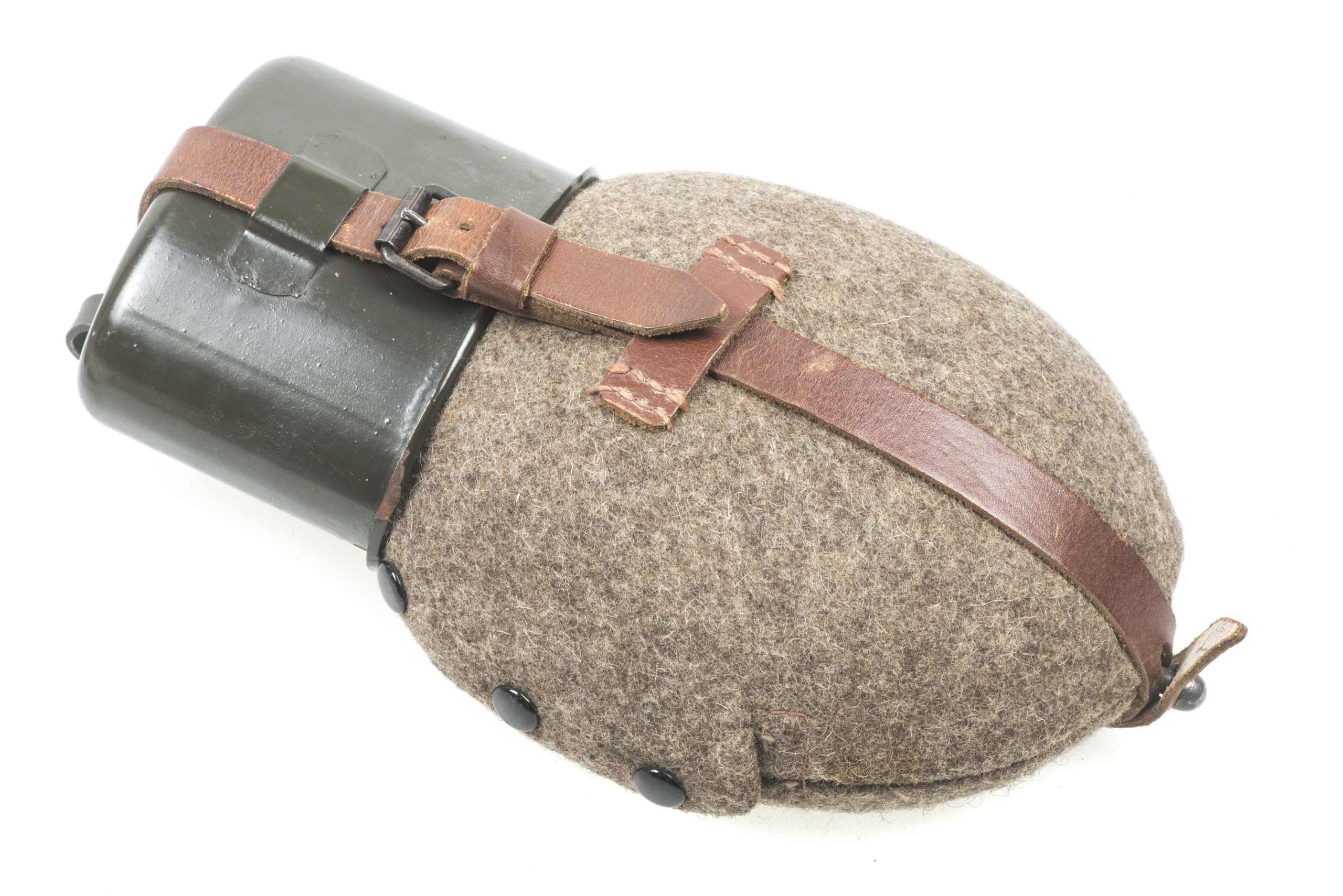 Stunning and textbook late war M42 canteen in close to mint, most likely unissued condition. The canteen is a typical late war example with a rough wool cover with small press studs and black pebbled straps. The flask itself is marked SMM 45 and the cup is marked SMM 44 which in my opinion indicates a factory mismatched example produced by Süddeutsche Metallwarenfabrik, Mussbach in early 1945 with left over stock from 1944. Excellent late war M42 which would be hard to upgrade!