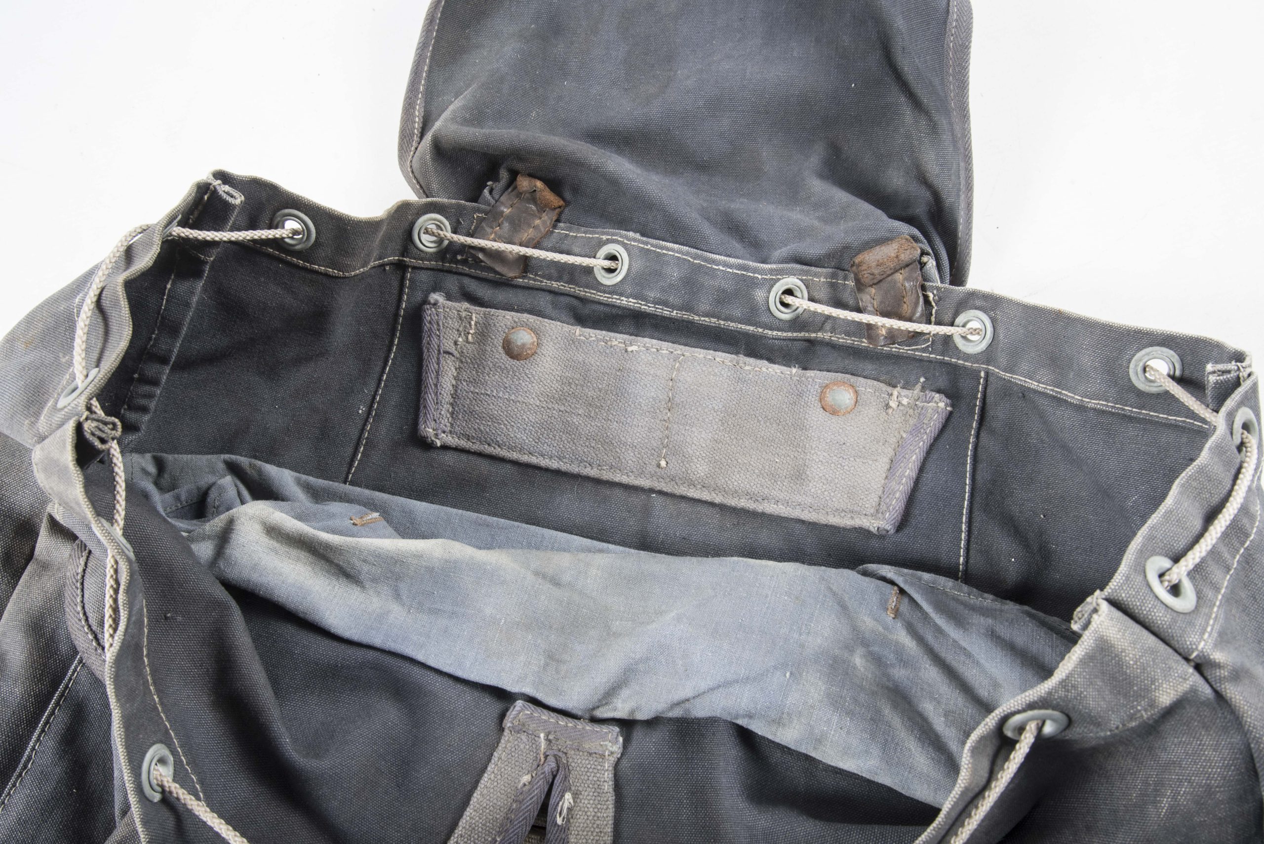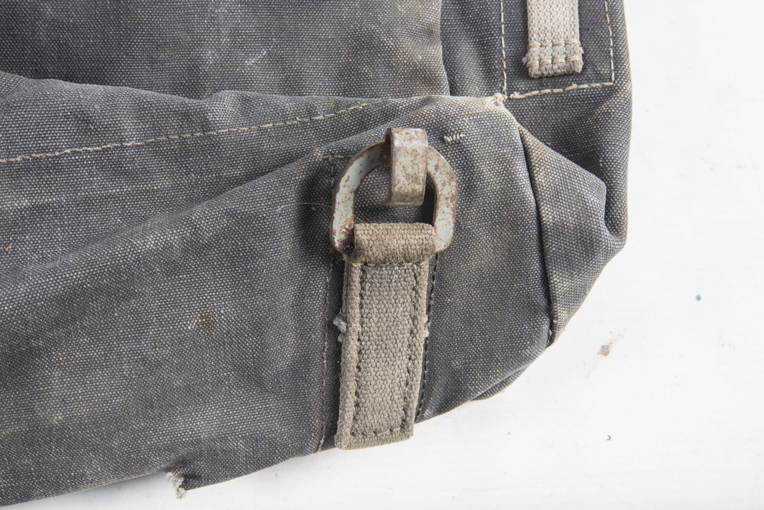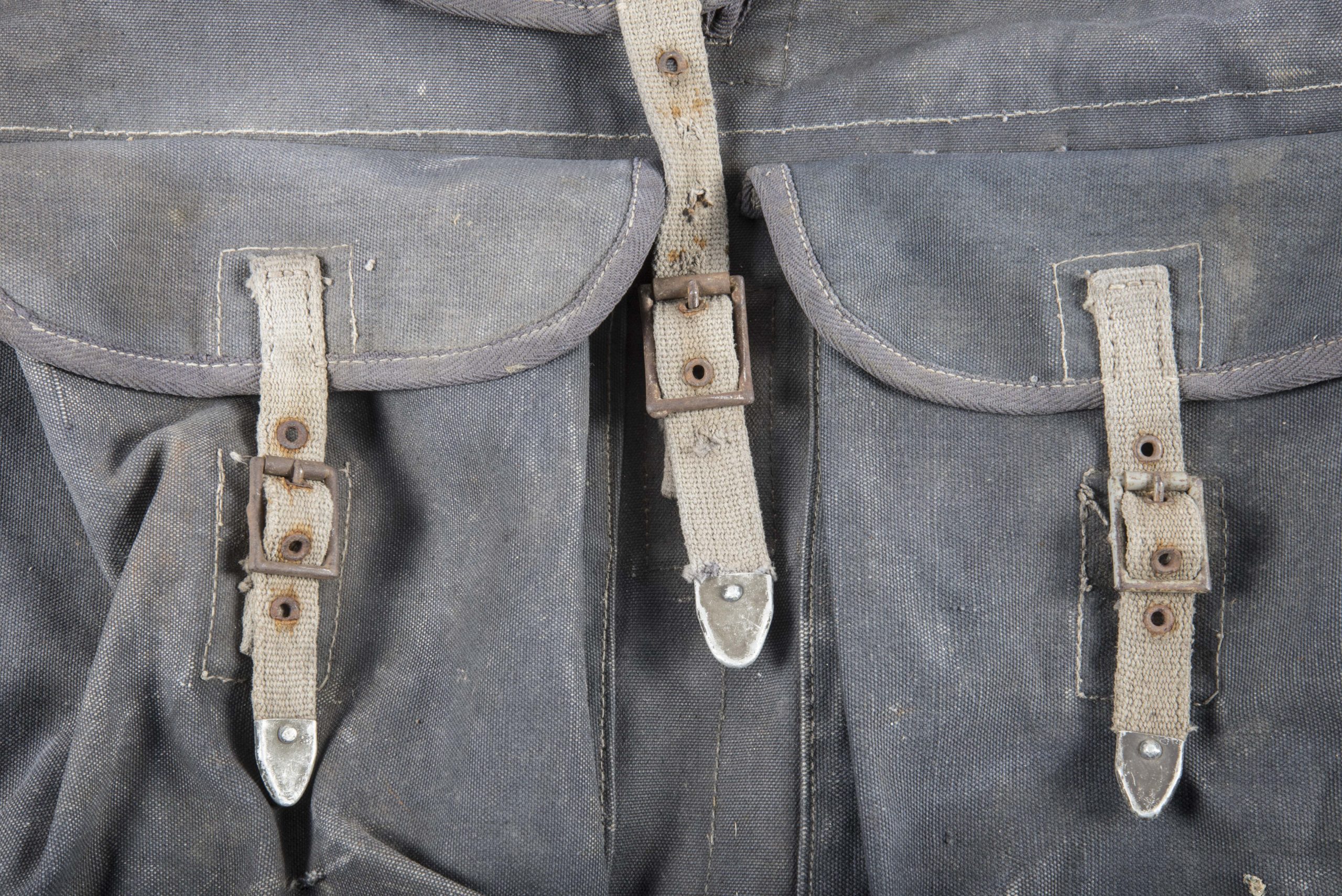 M44 rucksack in blue canvas with webbing straps. Not to be confused with a Luftwaffe issue rucksack; this one was meant to be issued to the Heer, Waffen-SS, Luftwaffe and the Kriegsmarine. Nice late war variant in used condition!