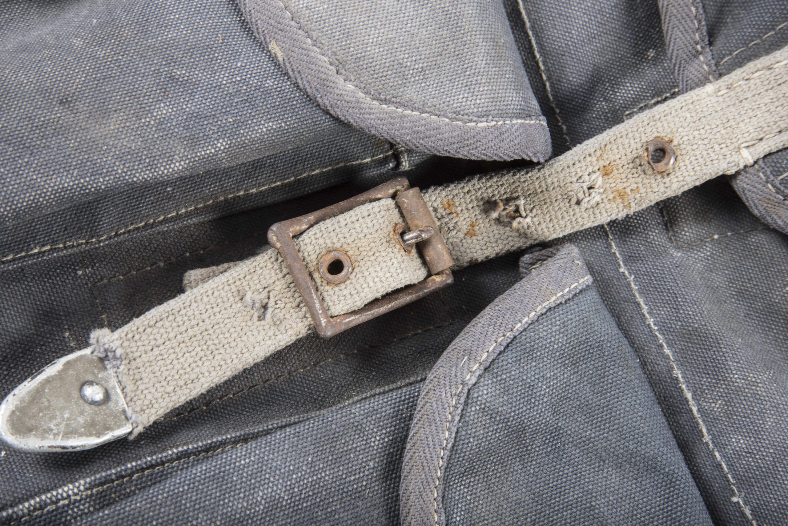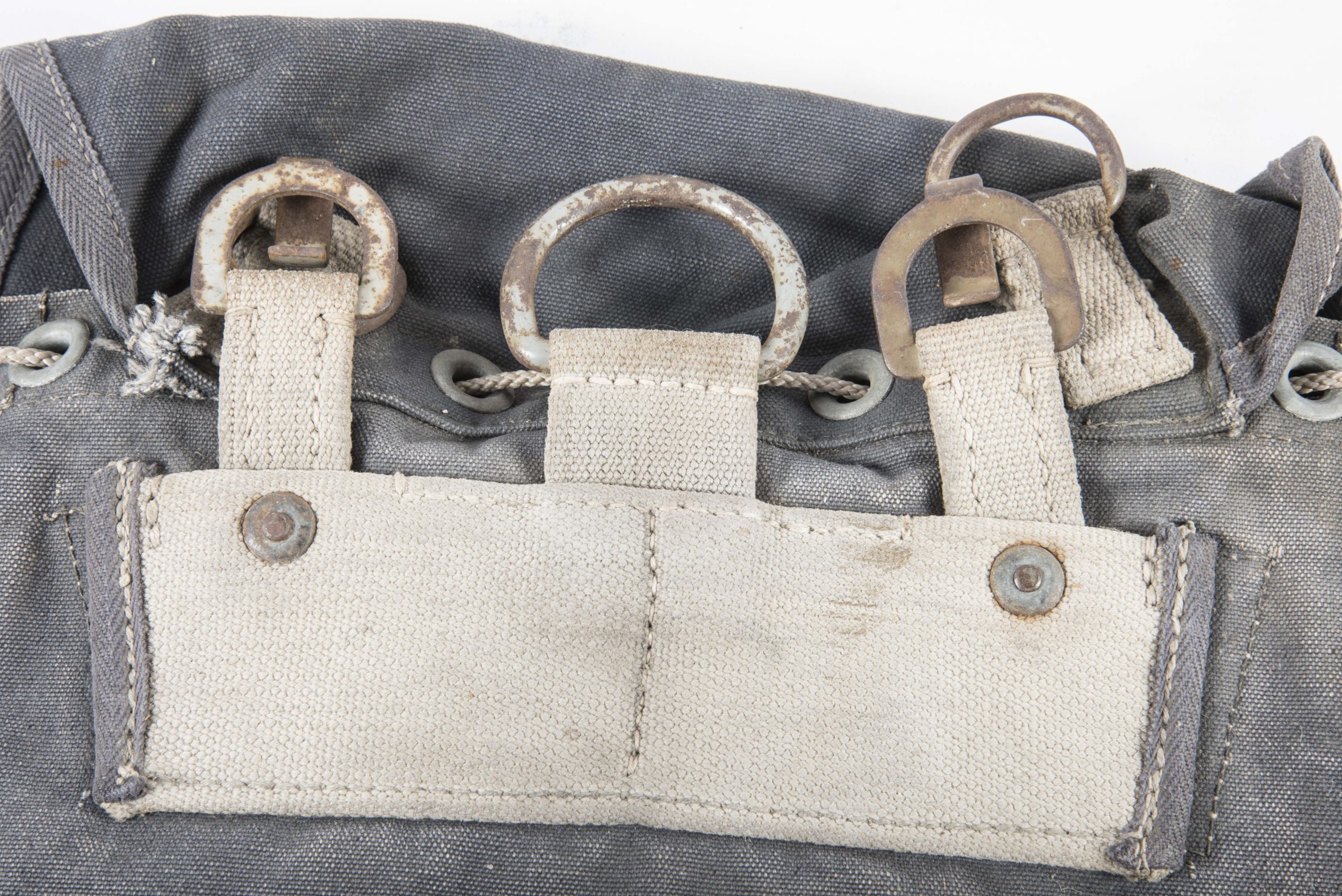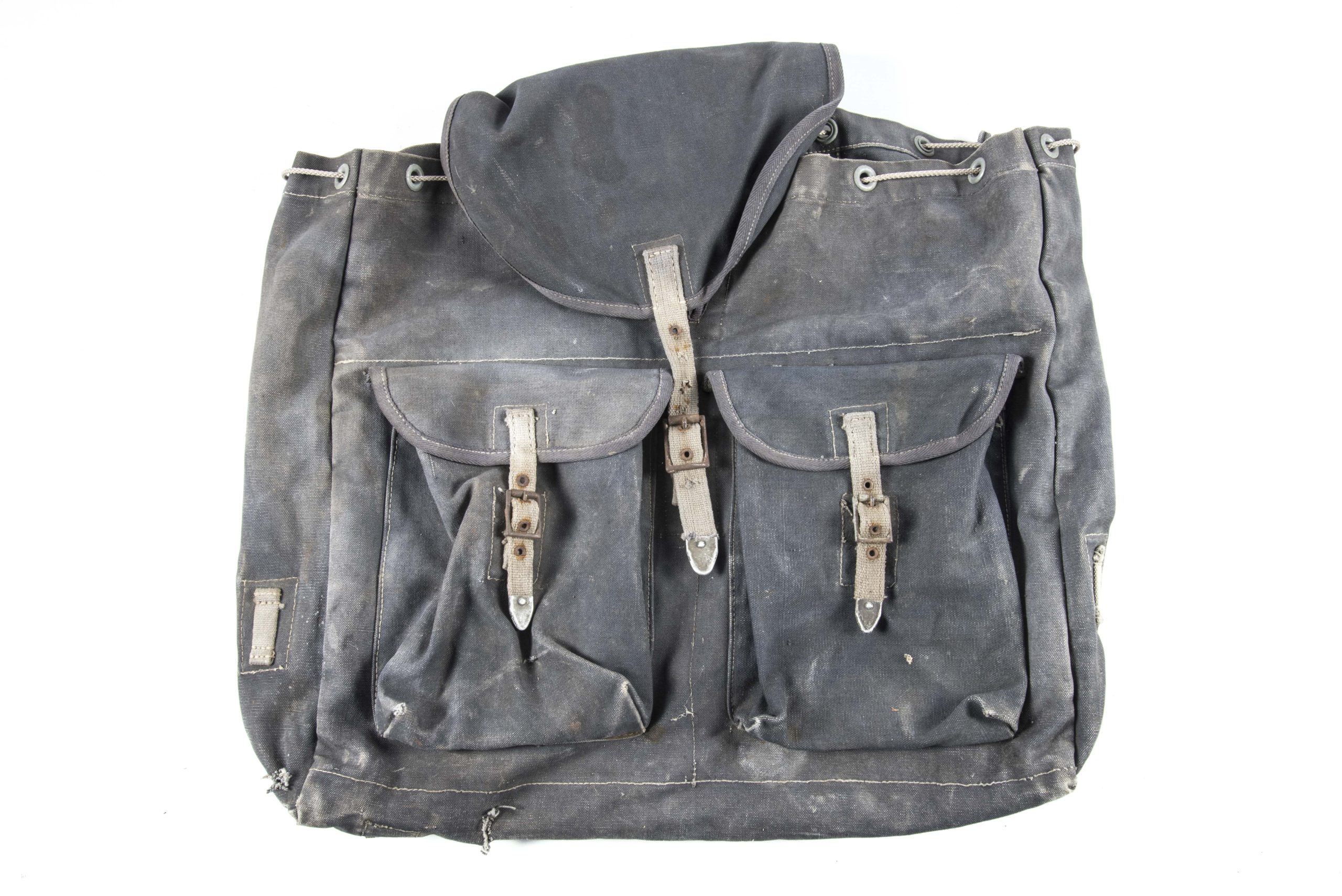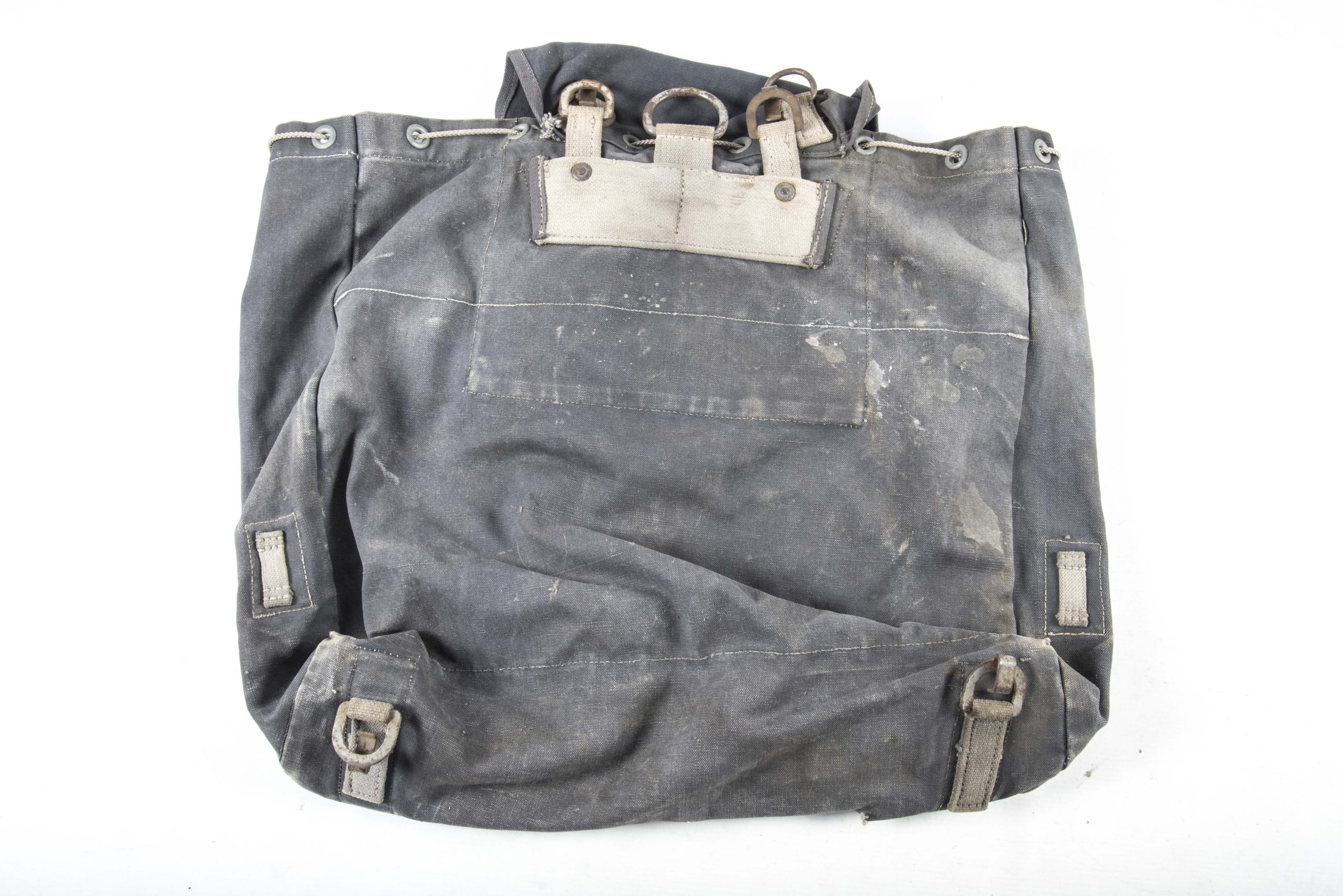 M44 rucksack in blue canvas with webbing straps. Not to be confused with a Luftwaffe issue rucksack; this one was meant to be issued to the Heer, Waffen-SS, Luftwaffe and the Kriegsmarine. Nice late war variant in used condition!