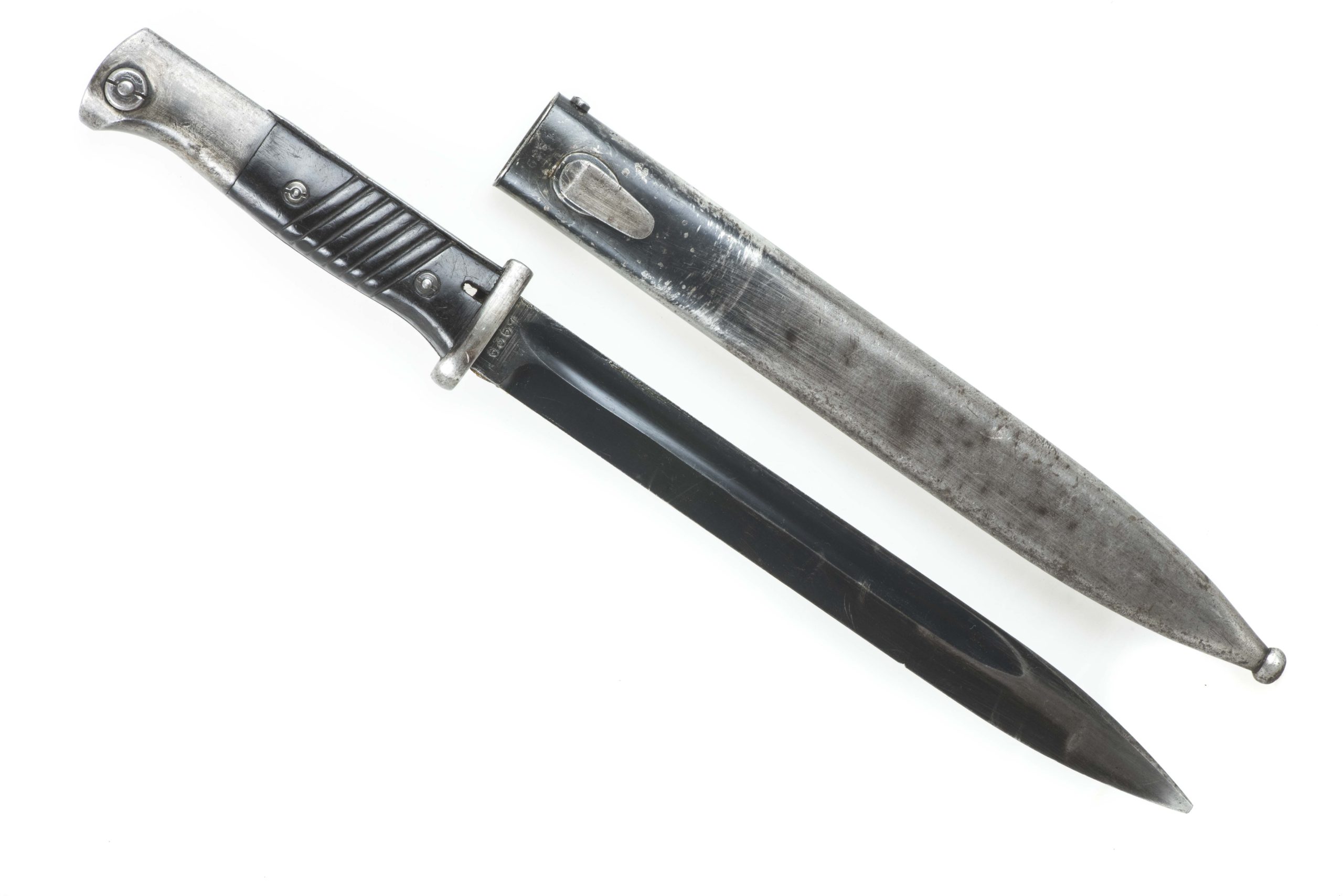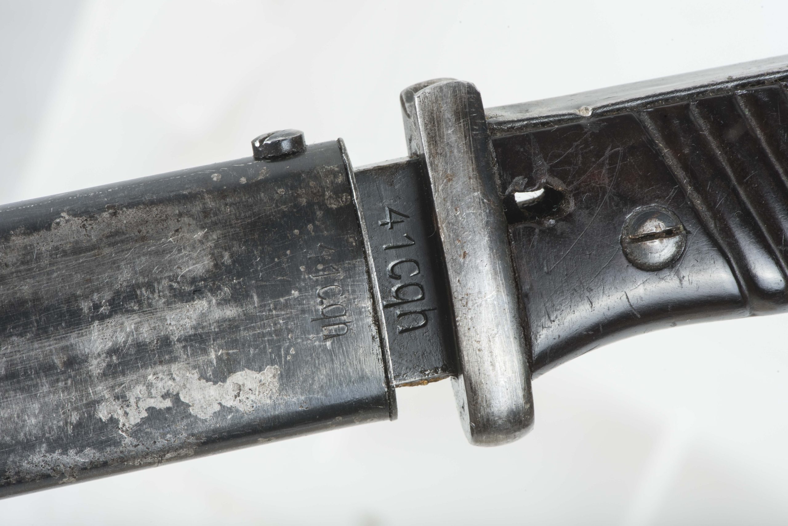 Matching K98 bayonet marked 41 cqh indicating production by Clemen und Jung,Solingen. The bayonet is in good used condition with its original factory finish and has never been sharpened.