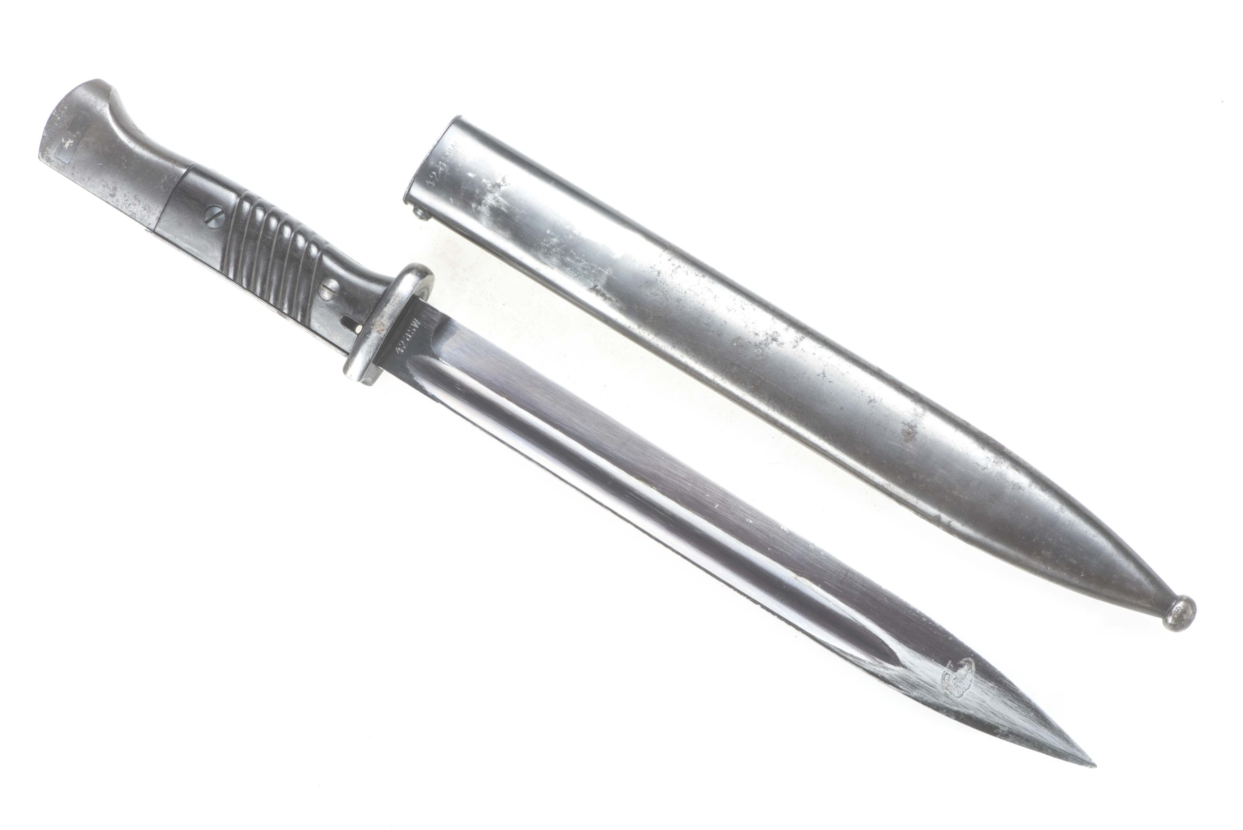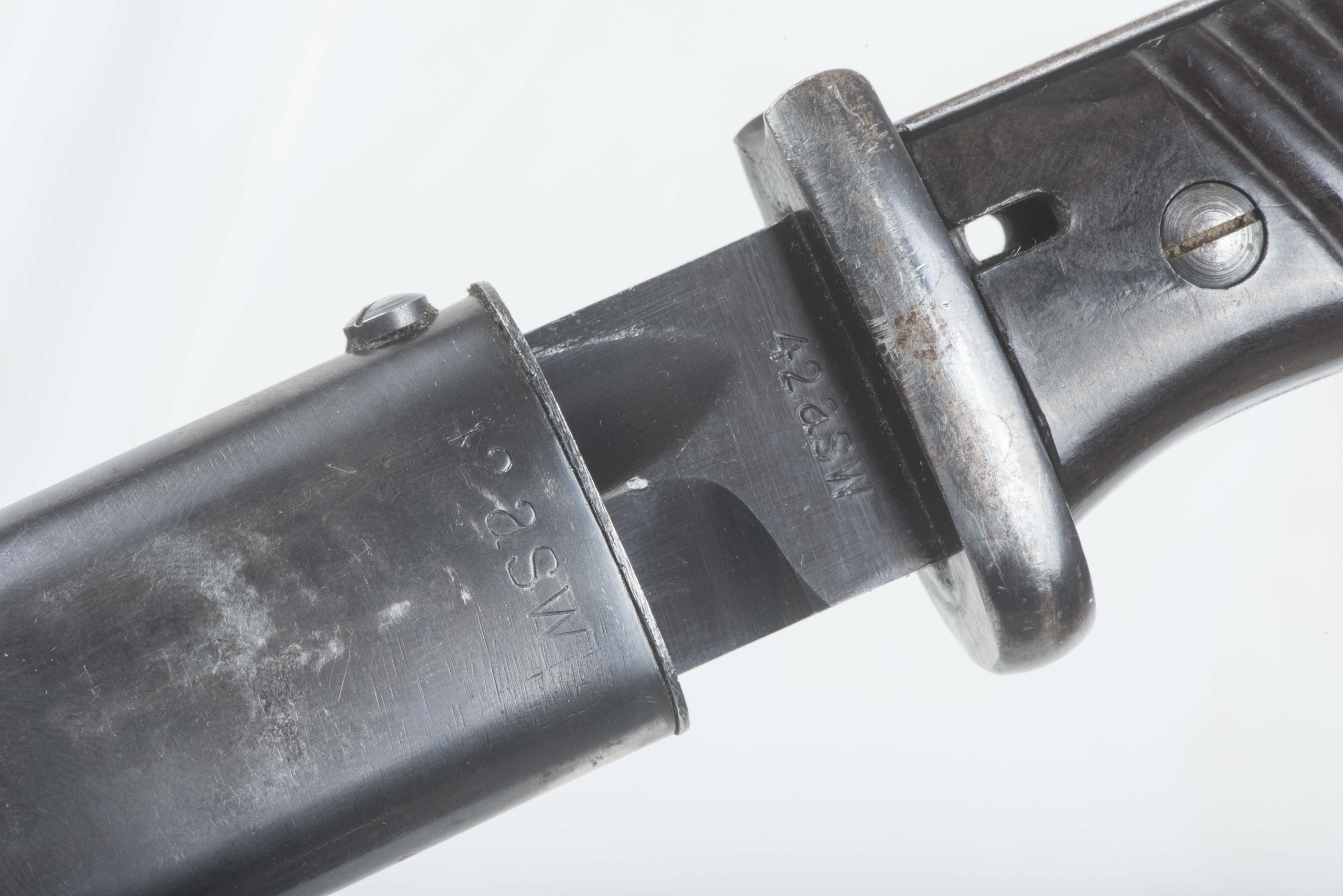 Matching K98 bayonet marked 42 asw #548 indicating production by E. & F. Horster & Co. Solingen. The bayonet is matching to its scabbard with and has nice clean bakelite grips. One of the screws in the grip is replaced.