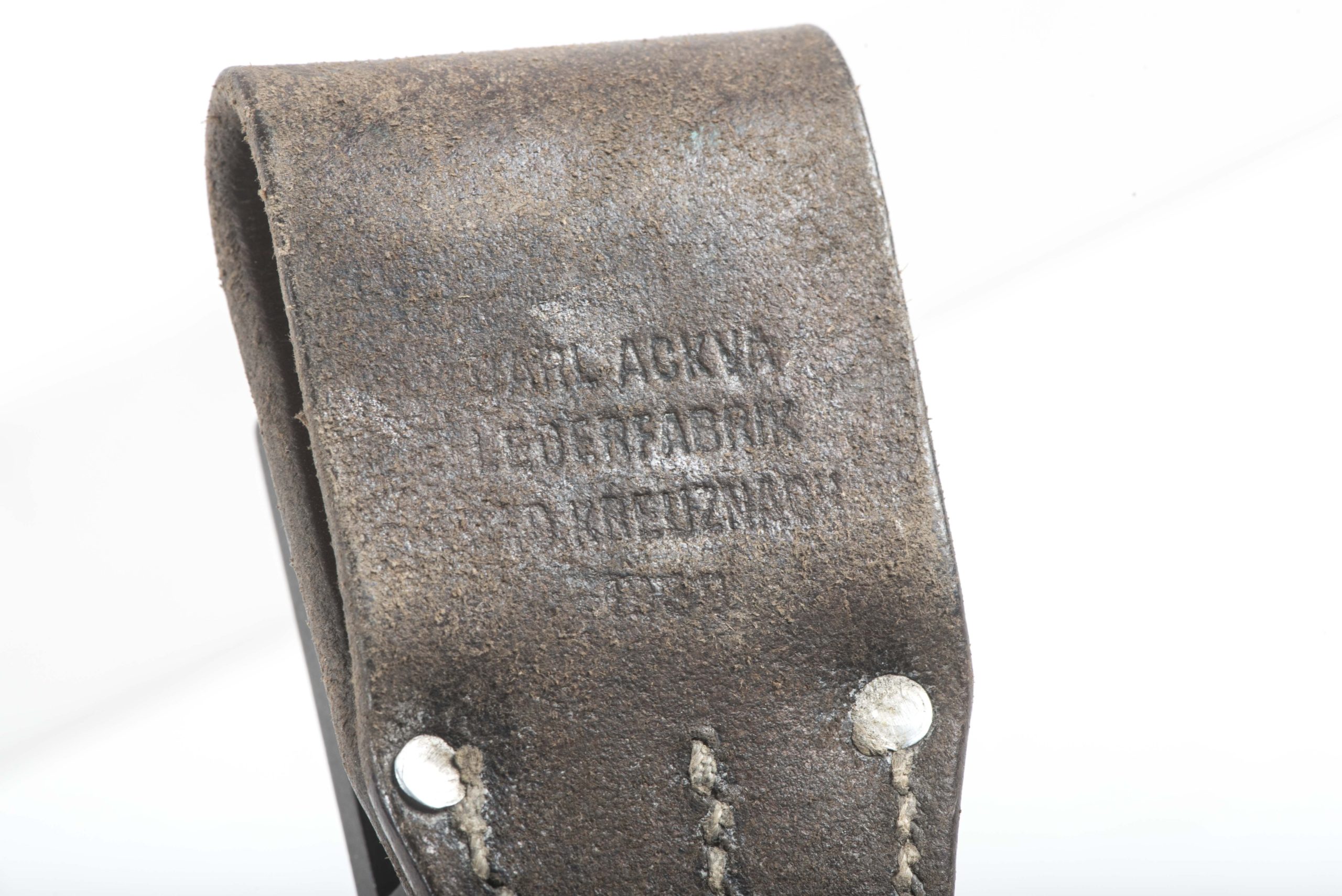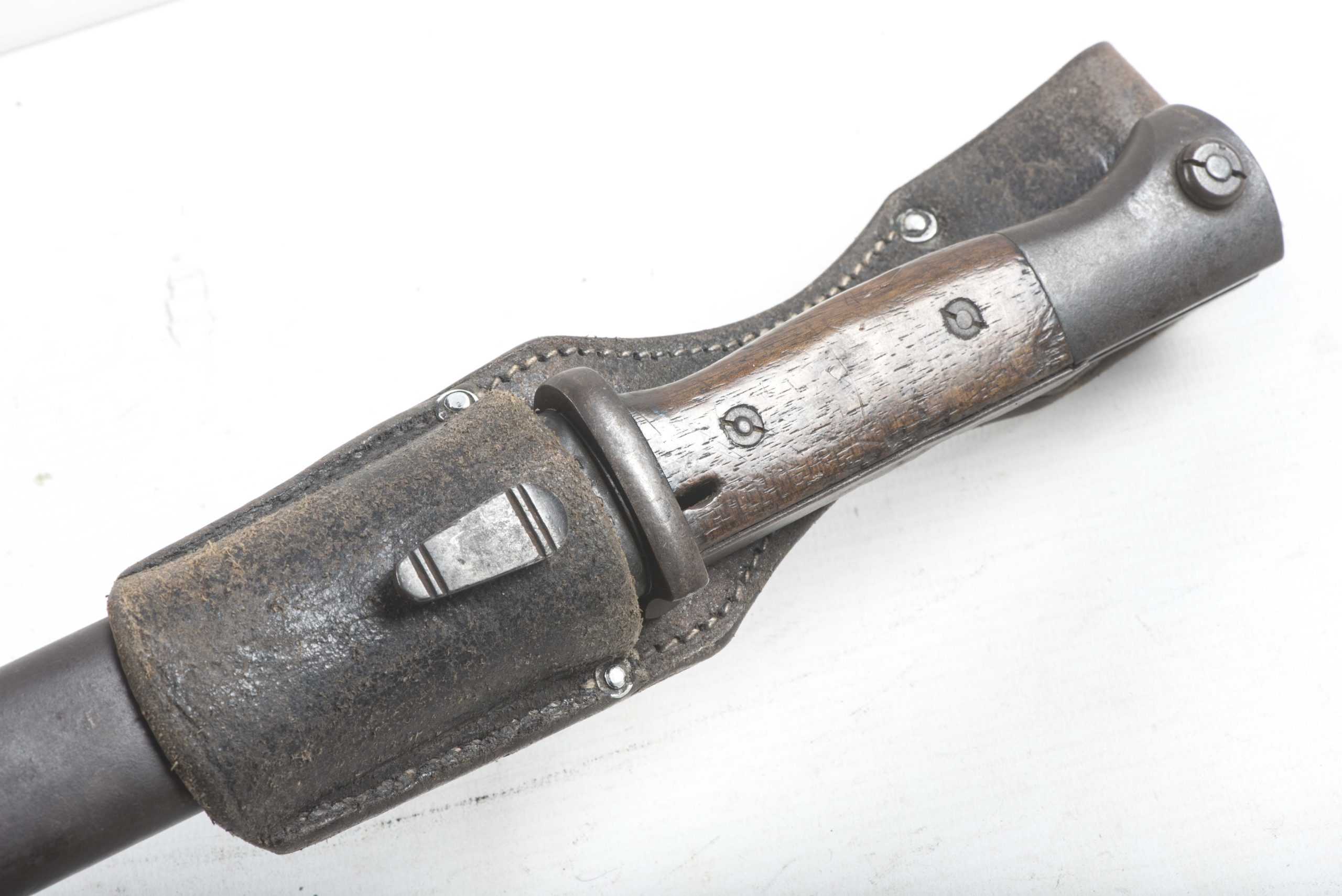 Textbook pre war K98 bayonet in good used condition. The bayonet is a rare early example marked S/173G indicates production by Coppel in 1935. The bayonet retains its original blueing and is matching to its scabbard. The frog is also a early example with brass rivets. Beautiful example that would be very hard to upgrade!