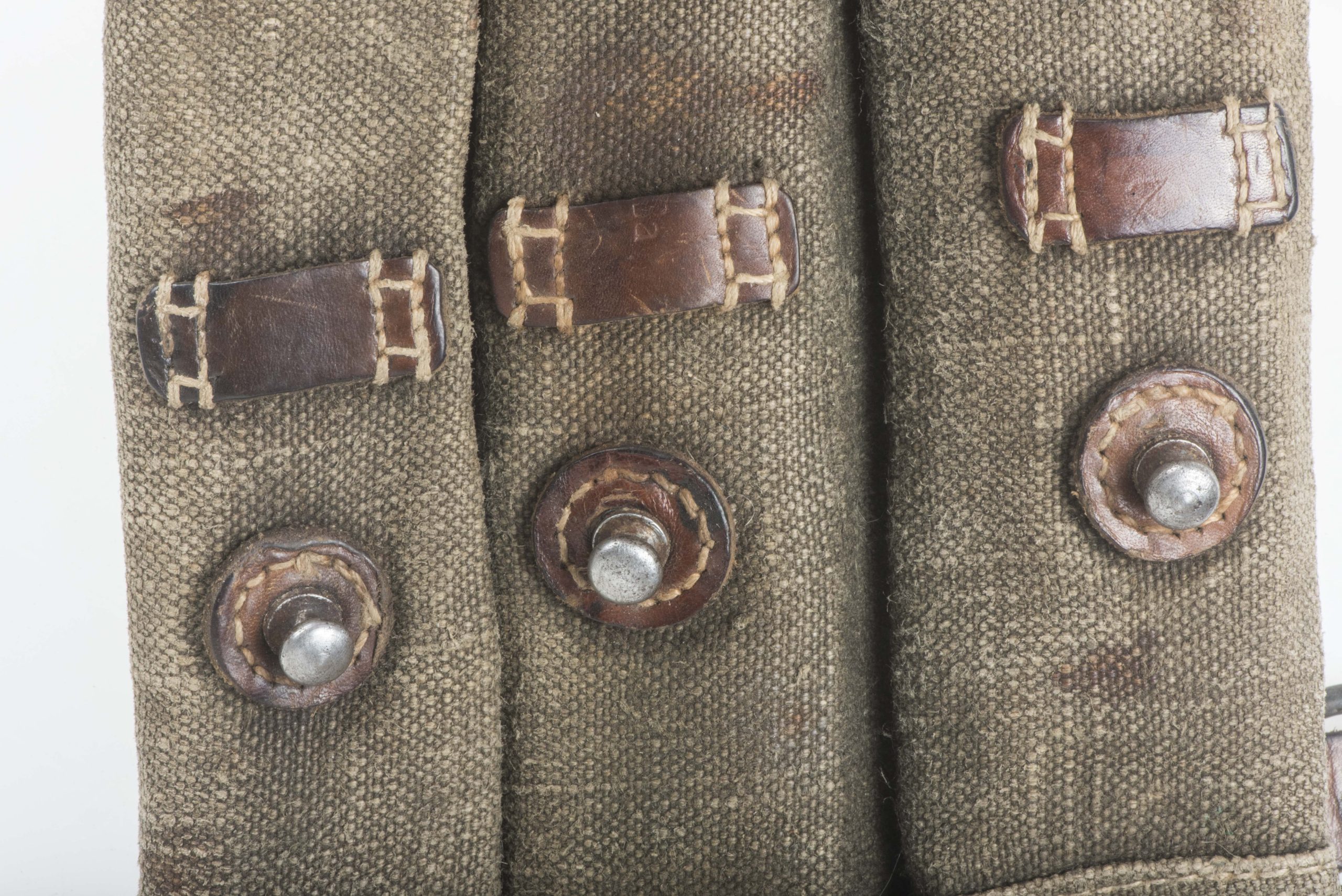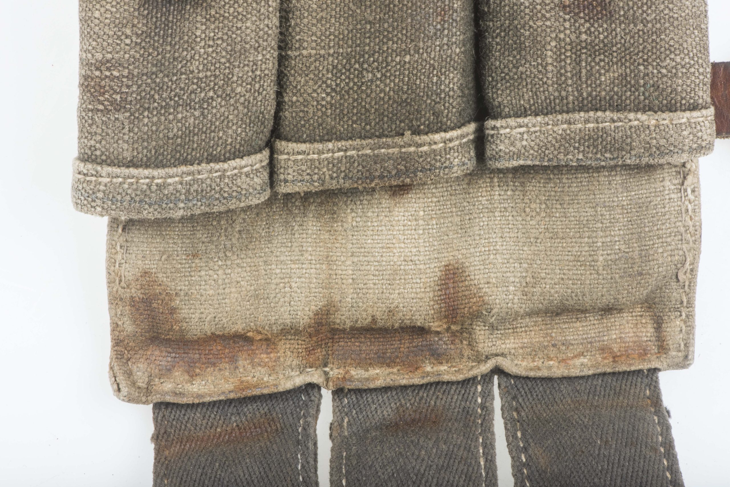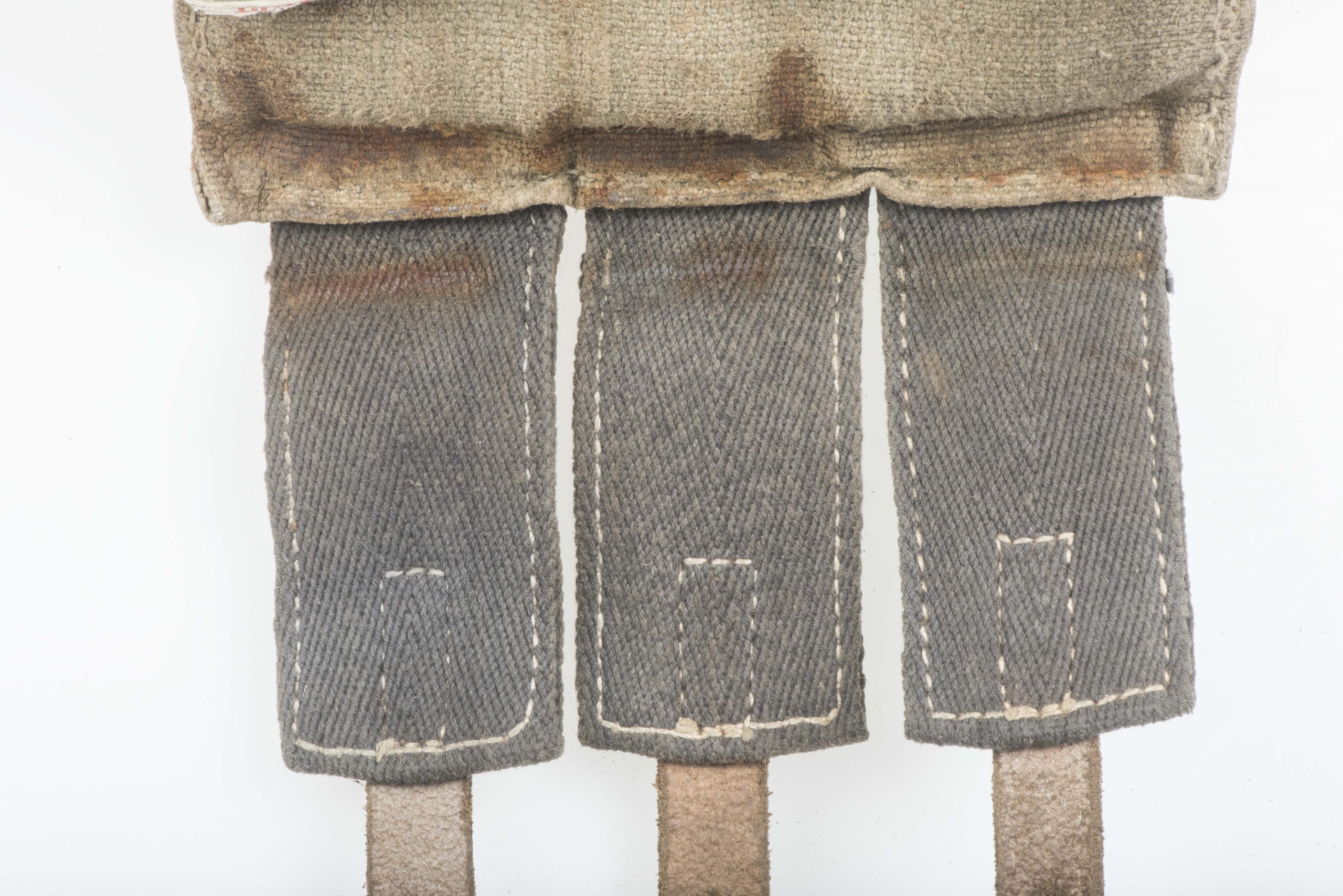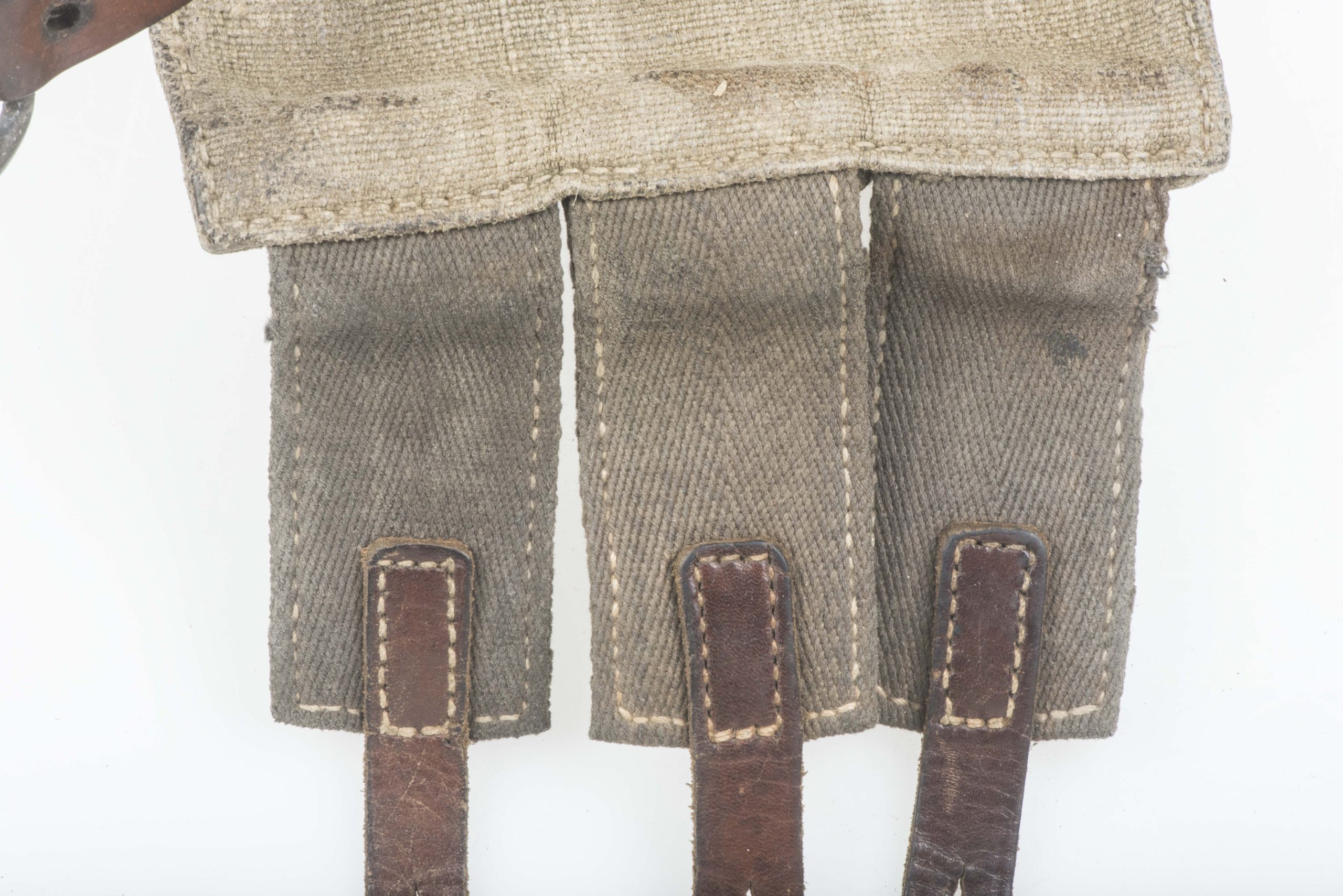 Excellent blue MP38 u. MP40 magazine pouch in good used condition. The pouch is not visibly marked but its design dictates one single producer dkk which would indicate production by Friedrich Offermann u. Söhne, Lederwarenfabrik, Bensberg. The pouch is executed in nice blue canvas with brown leather and grey/blueish canvas for the closing flaps which is typical for this manufacturer. Nice original blue MP 40 magazine pouch!