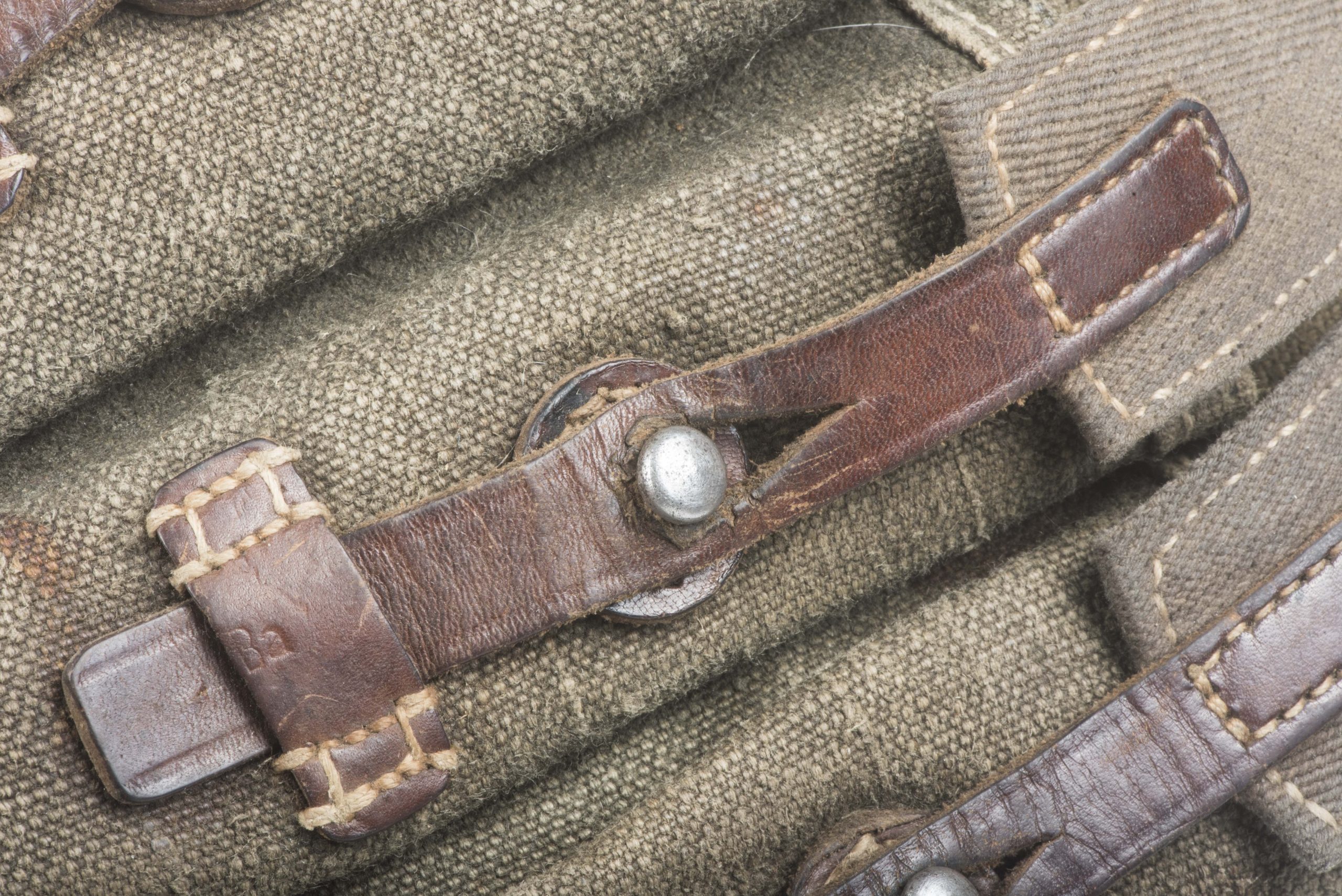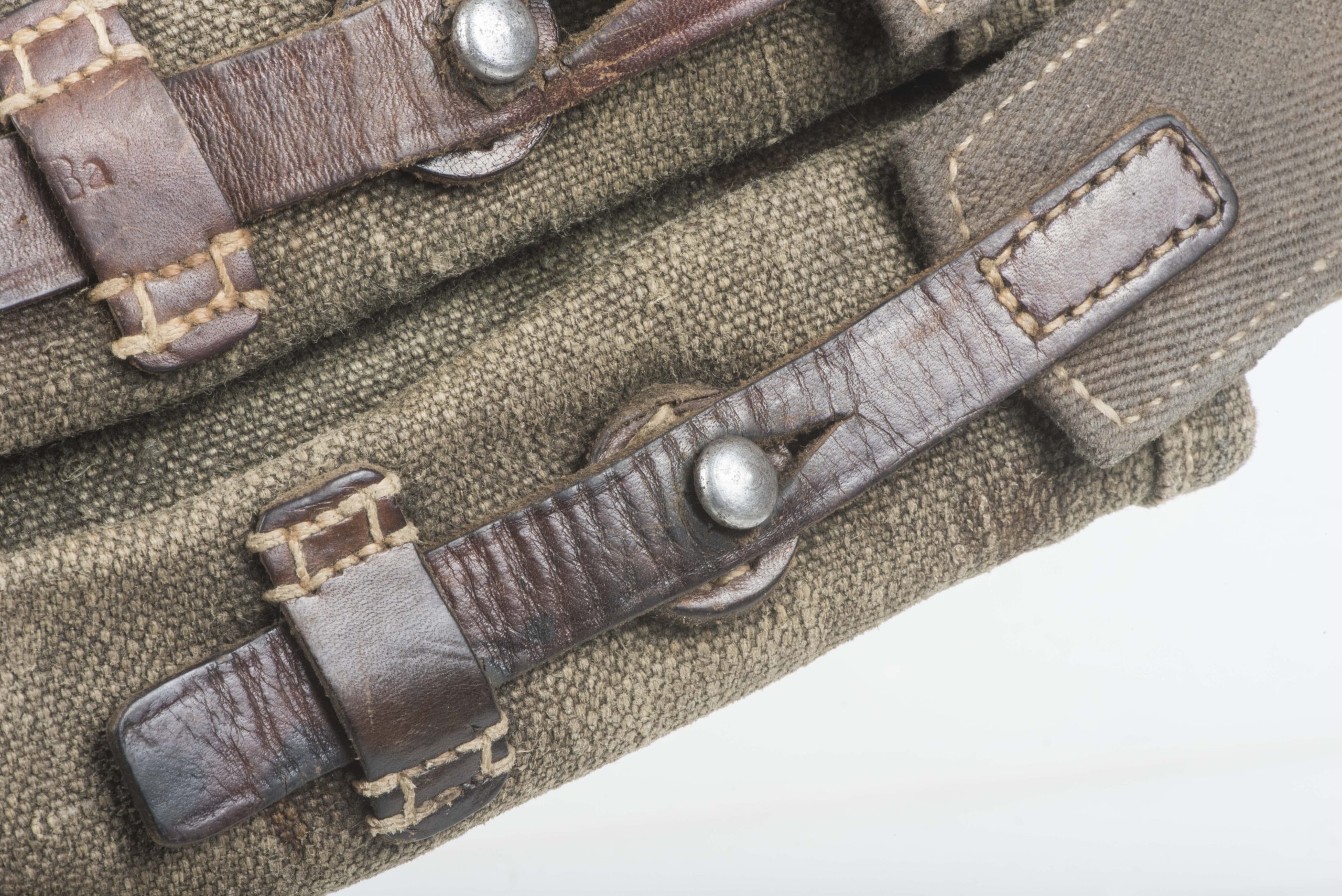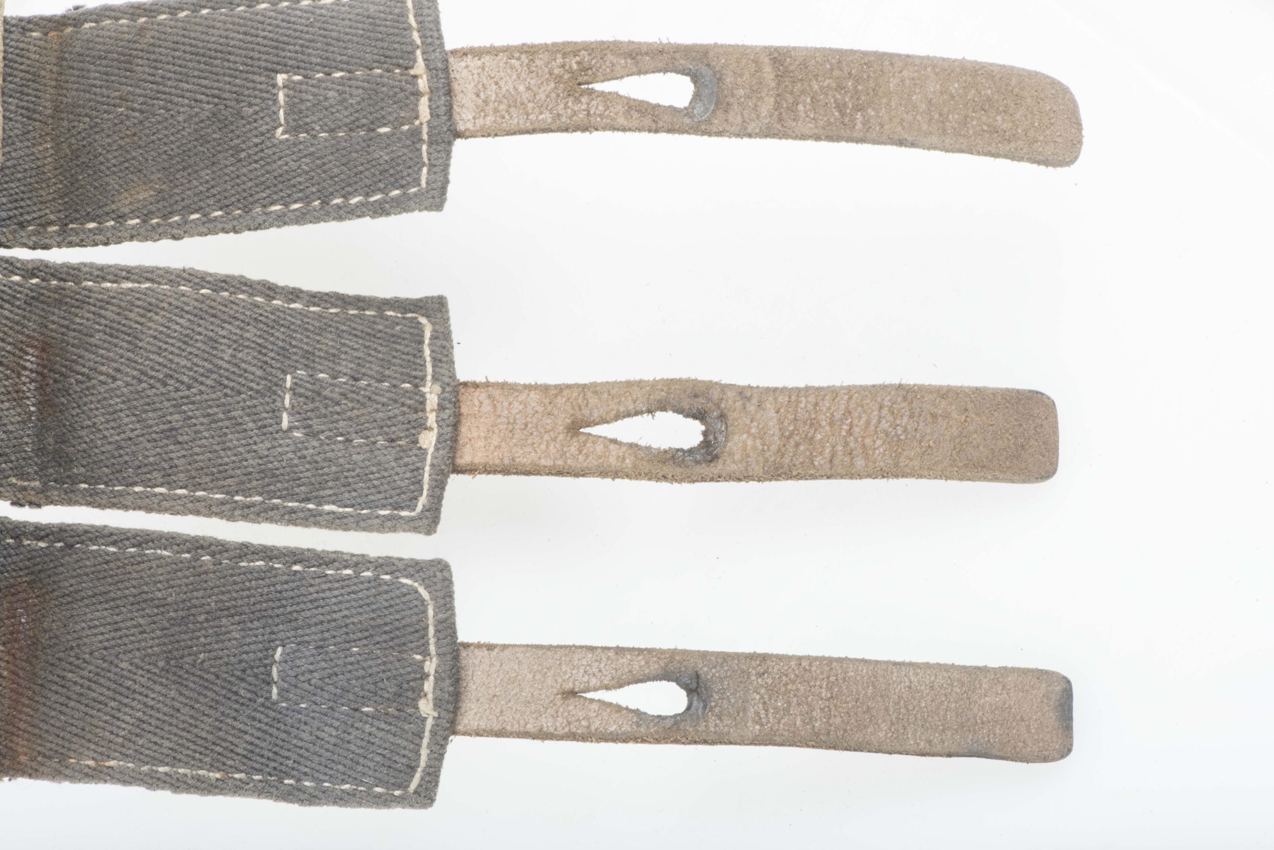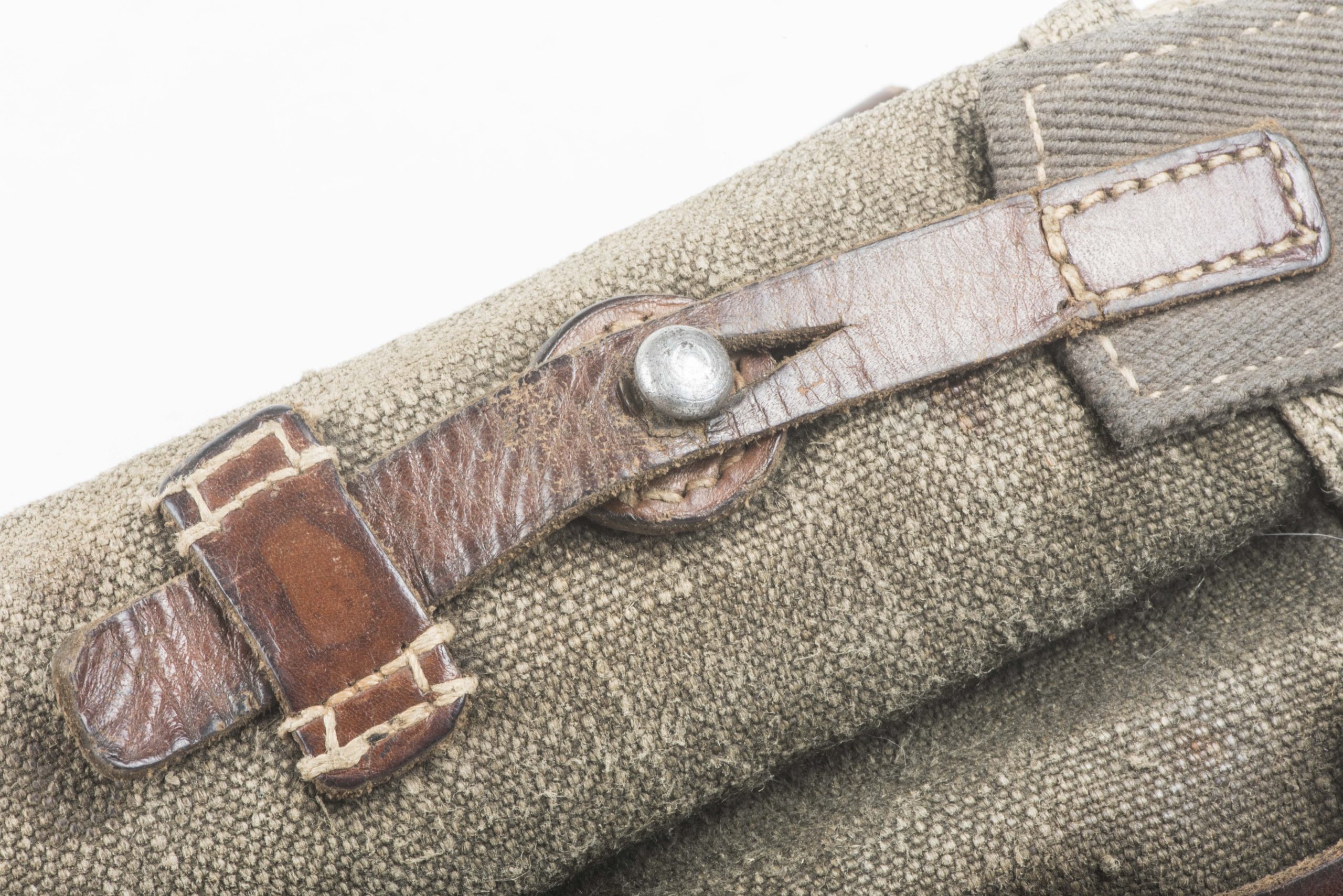 Excellent blue MP38 u. MP40 magazine pouch in good used condition. The pouch is not visibly marked but its design dictates one single producer dkk which would indicate production by Friedrich Offermann u. Söhne, Lederwarenfabrik, Bensberg. The pouch is executed in nice blue canvas with brown leather and grey/blueish canvas for the closing flaps which is typical for this manufacturer. Nice original blue MP 40 magazine pouch!