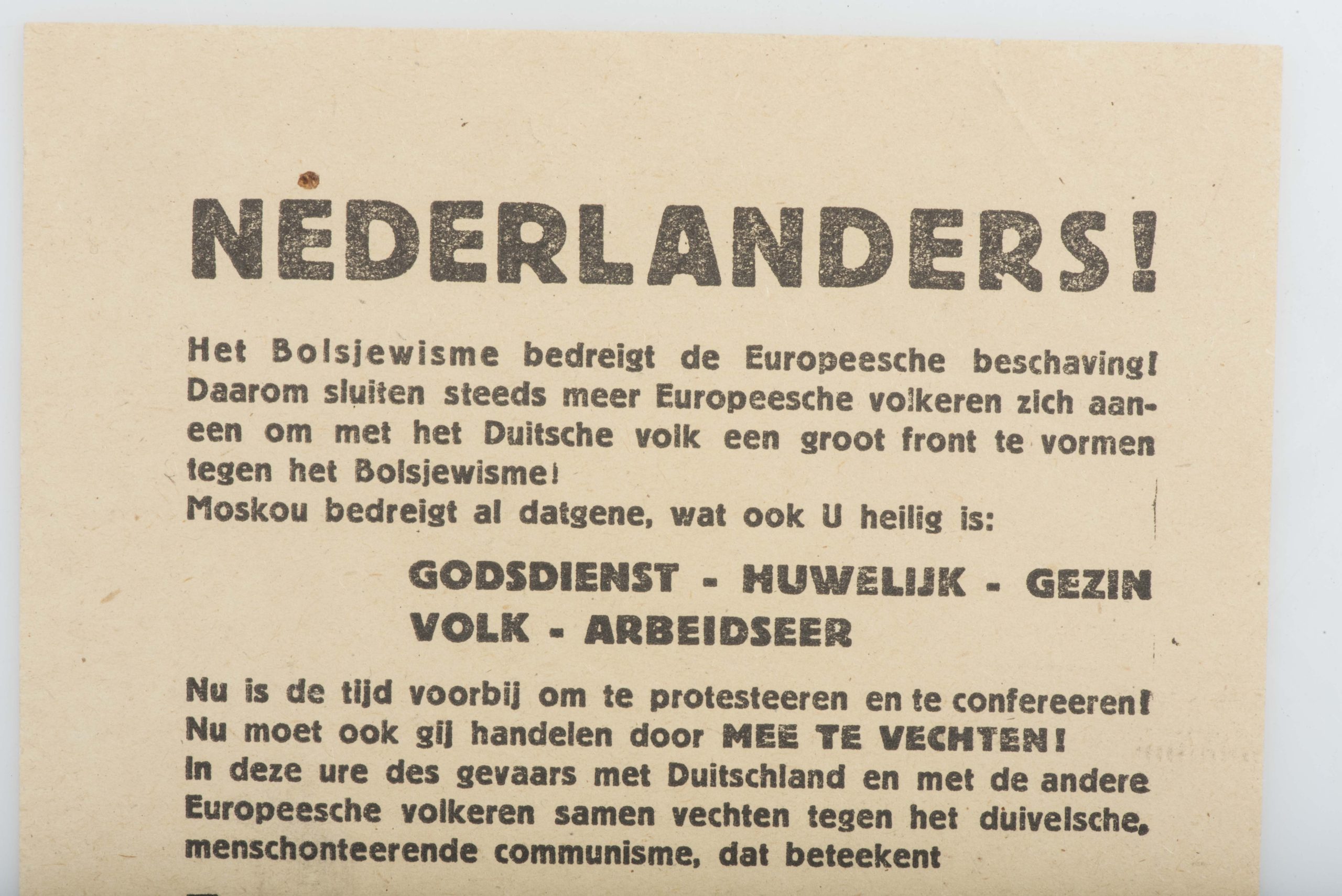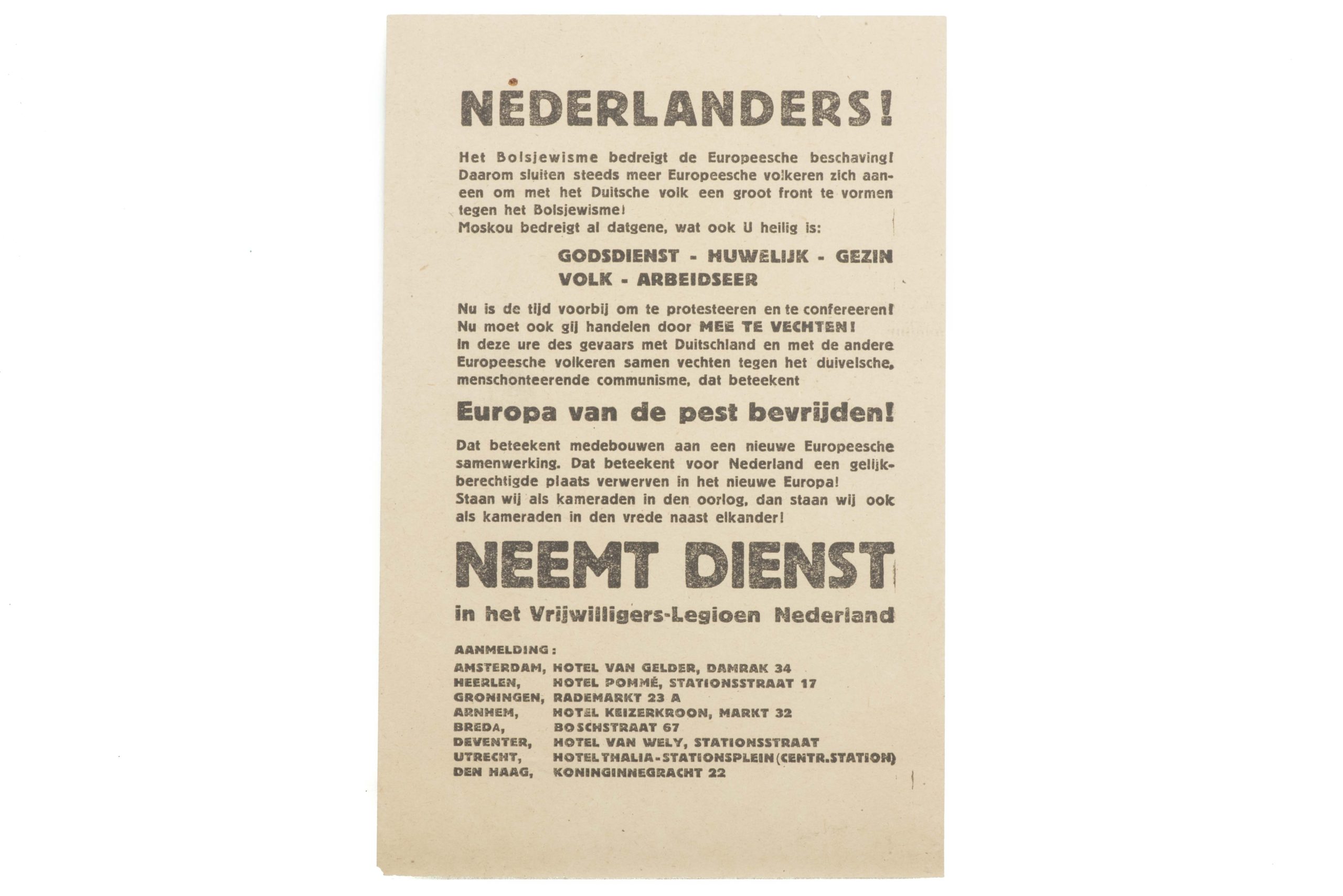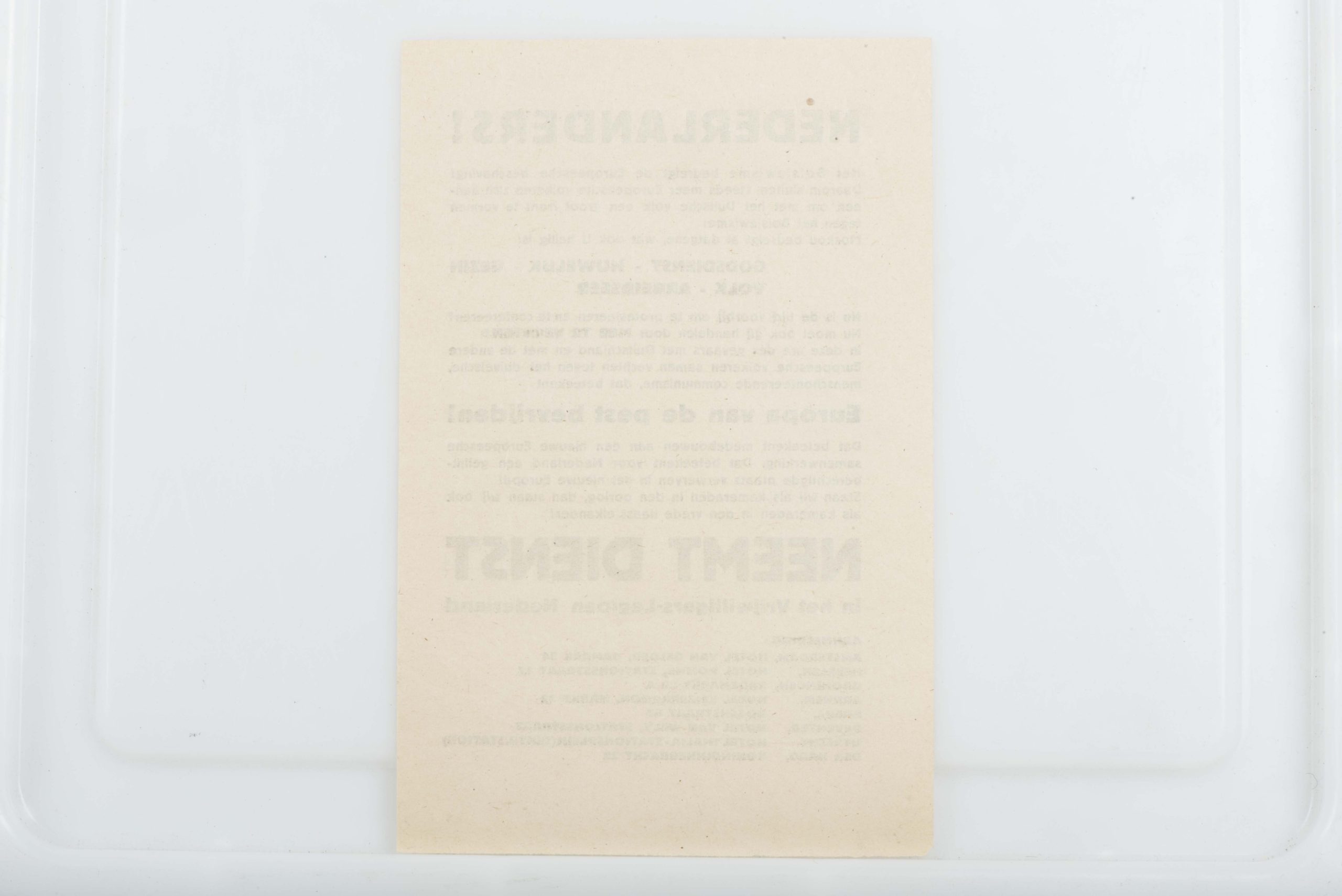 Nice original Dutch Waffen-SS recruitment flyer Nederlanders! Neemt dienst in het Vrijwilligers-Legioen Nederland in good condition.