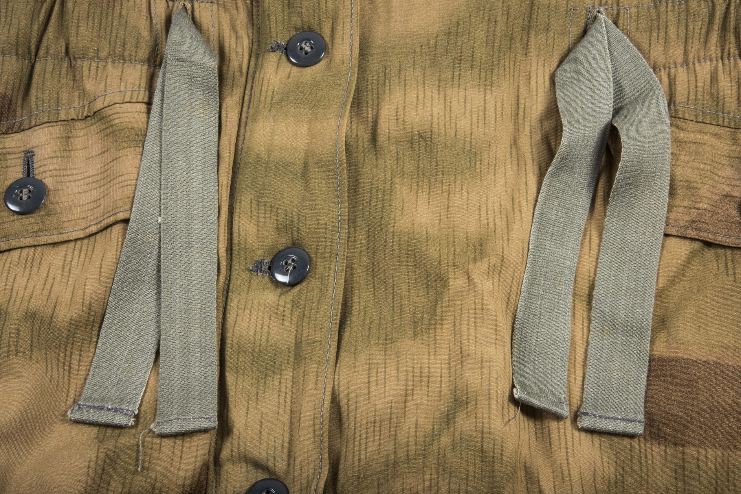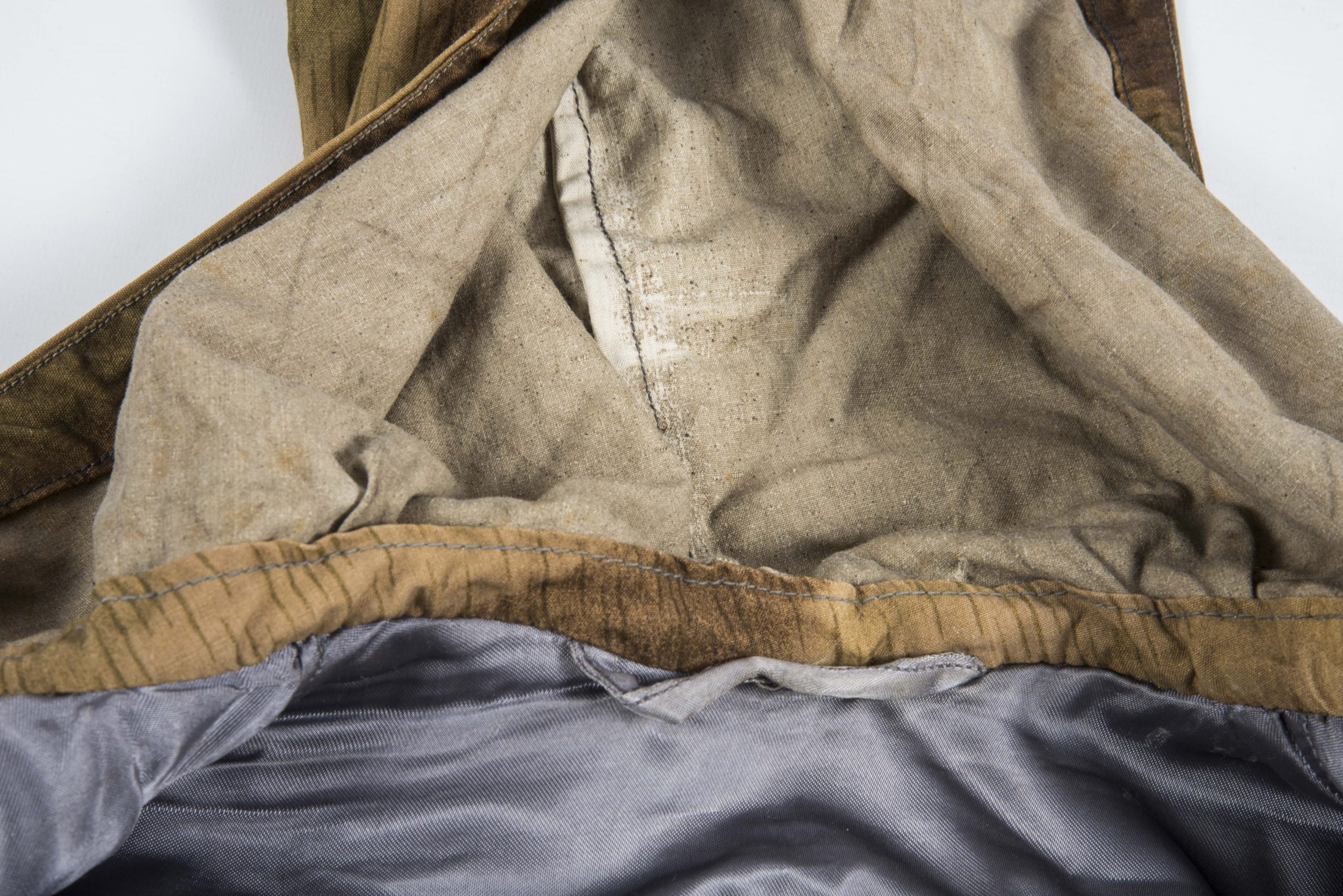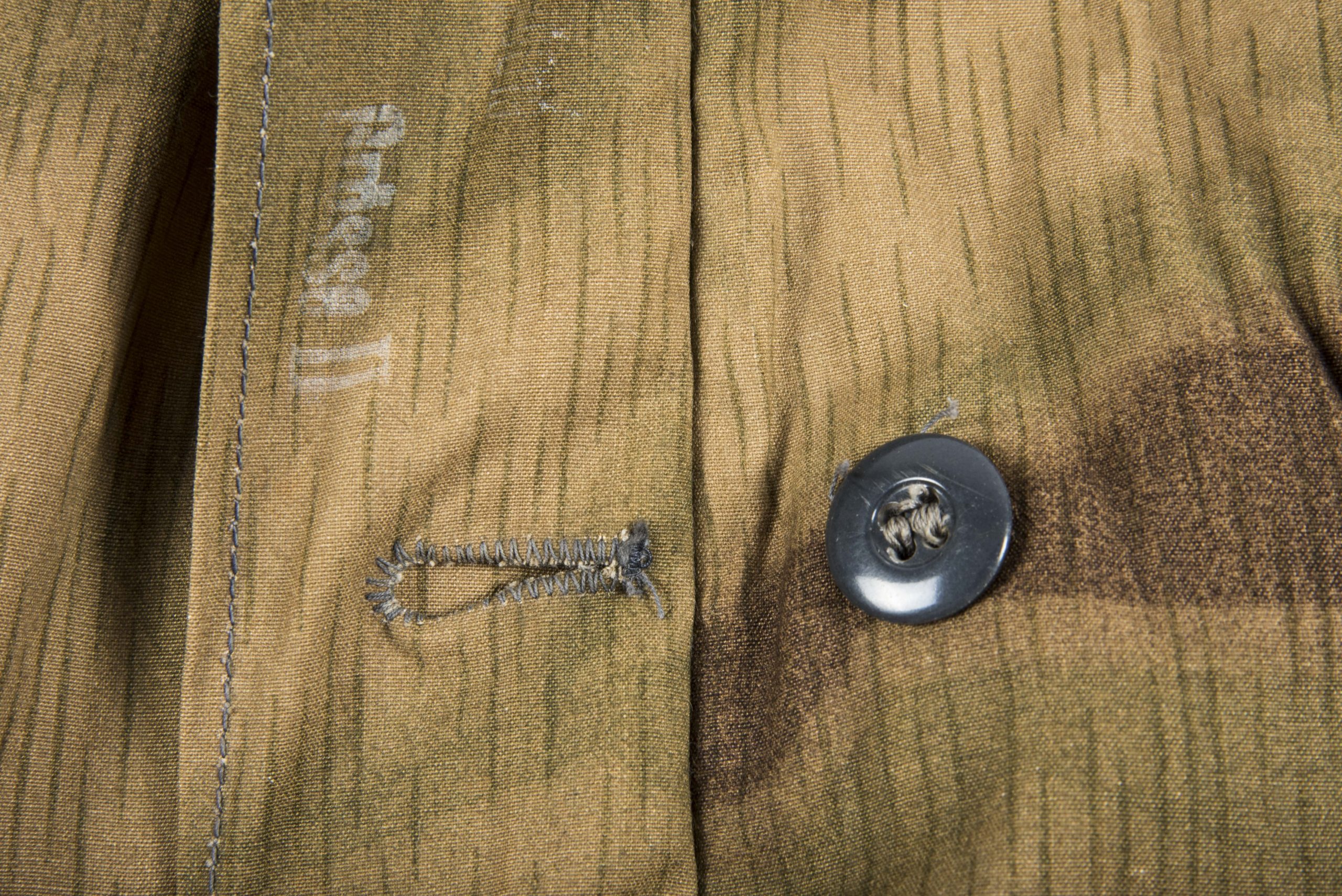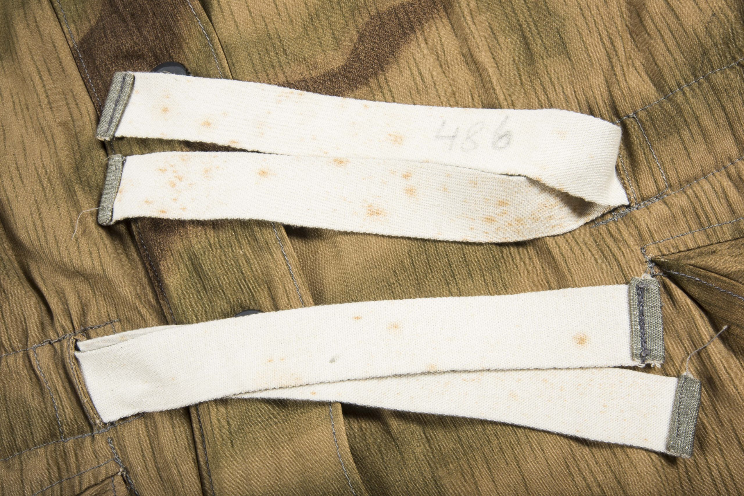 Textbook winter parka jacket executed in Sumpftarn camouflage. The trousers are nicely marked RBNr. and II which would indicates a medium size which would easily fit any mannequin! The camouflage used for the construction of this garment is the so called hard-edged Sumpftarn which was developed in 1943. The jacket is in excellent condition without any damages and very bright beautiful colours. Hard to upgrade!