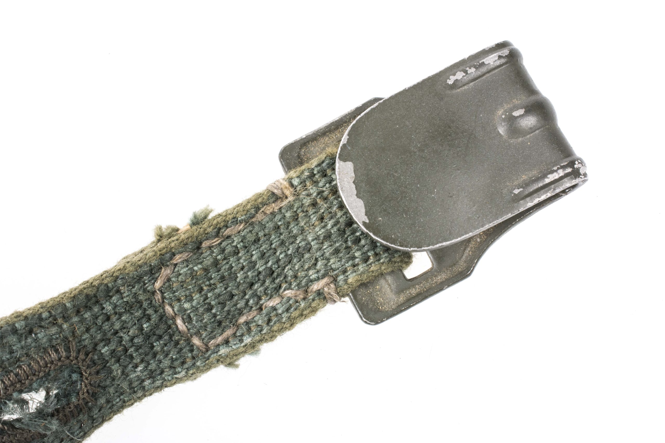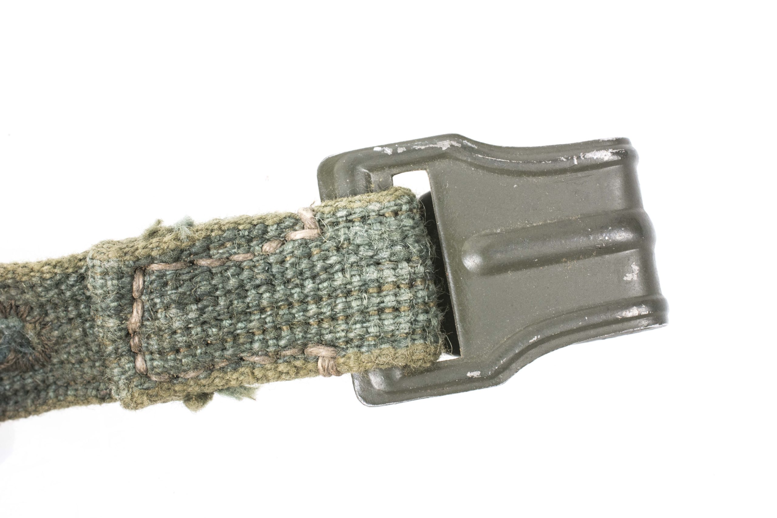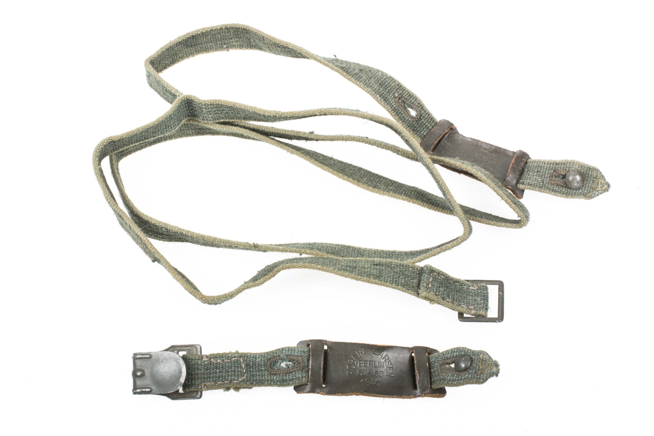 Perfect set of early straps for the gasmask canister in stone mint condition, unissued condition. The straps are made out of dark green coarse webbing with all aluminium hardware which retains 99% of the green factory finish. The straps are complete with the leather reinforcements which are mint as well and nicely painted green. The leather reinforcements are nicely marked Robert Larsen, Berlin SW68 1940. The ovarial condition of this set is simply amazing and this is for sure the best spare set of early gasmask canister straps that I have ever offered!