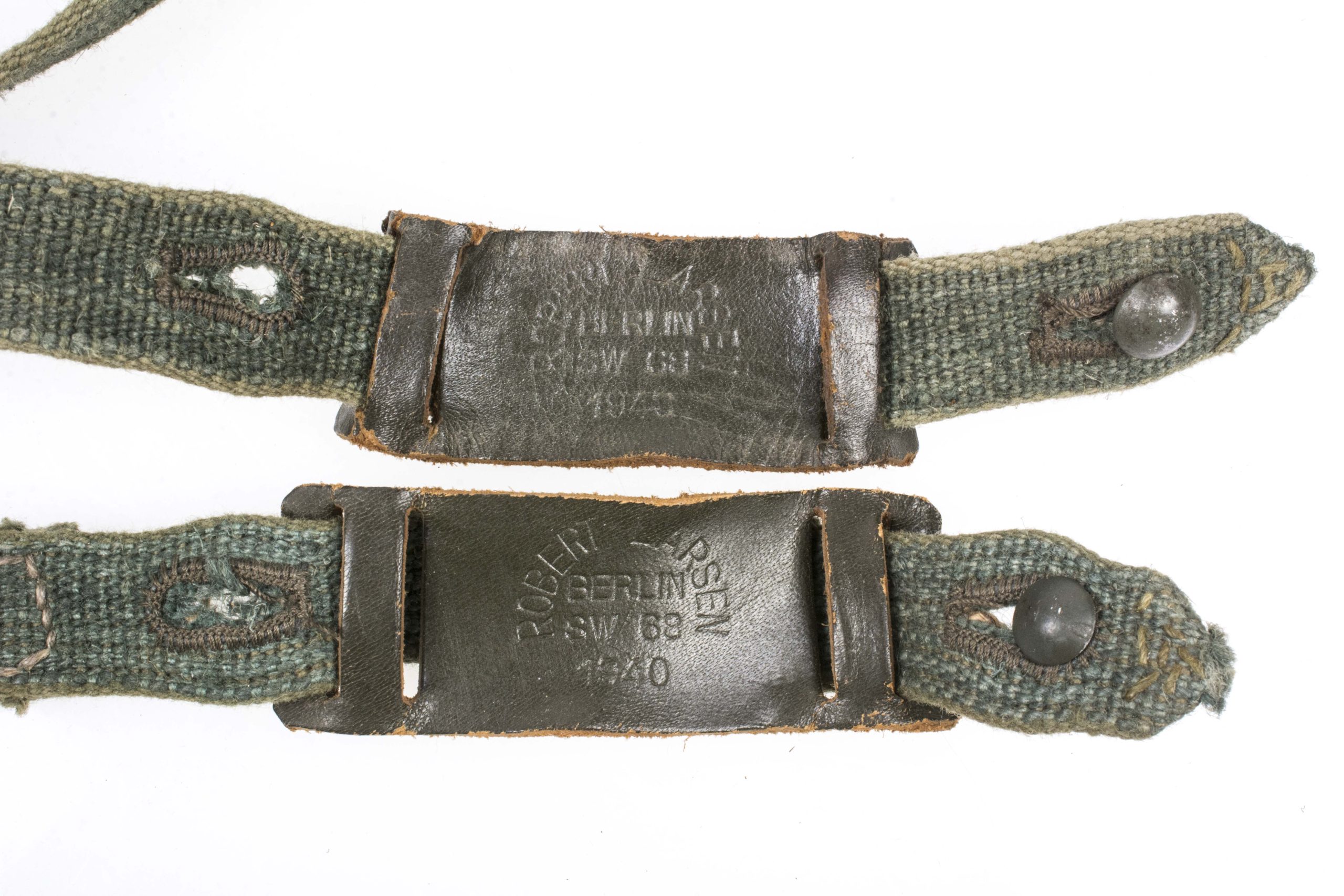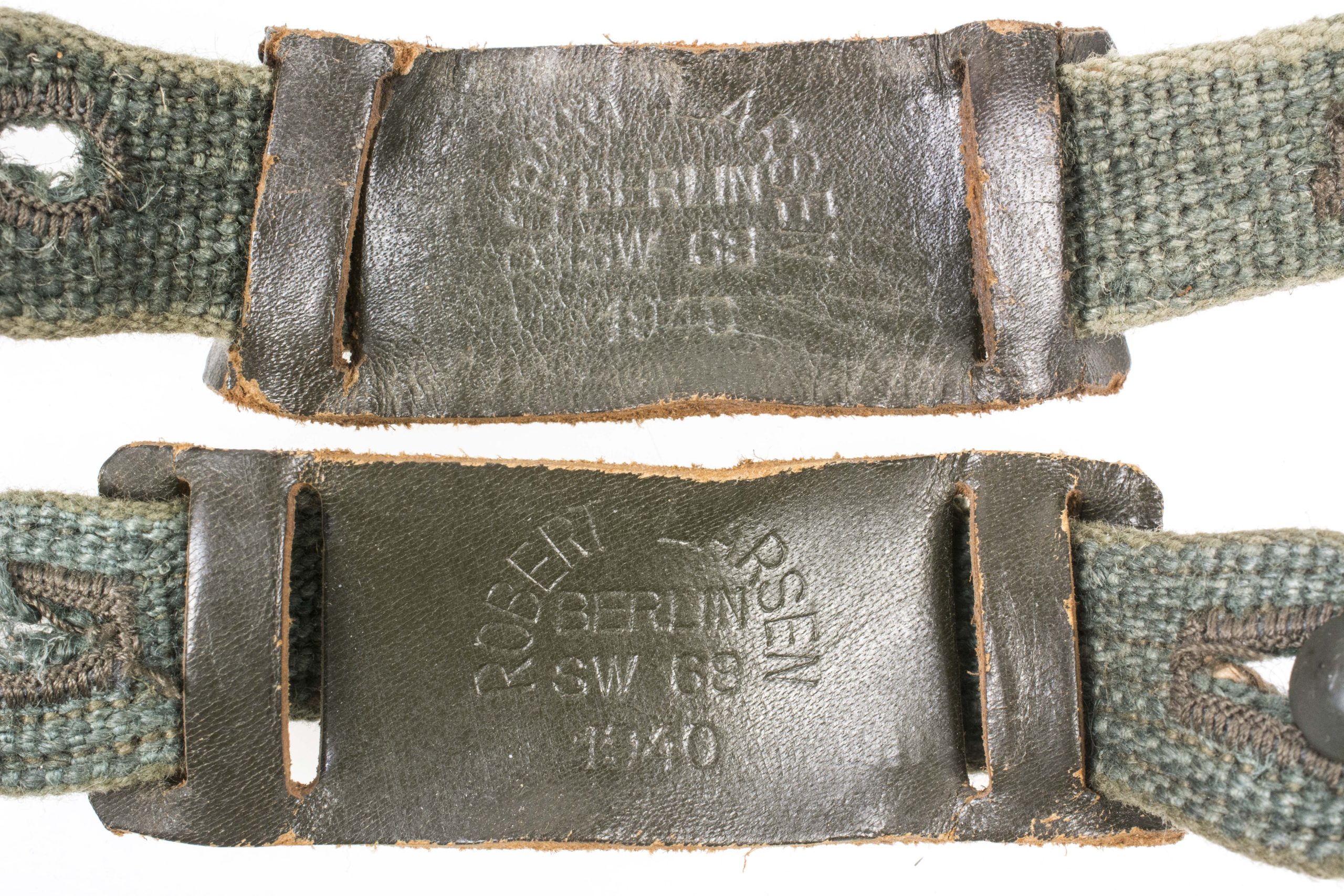 Perfect stone mint set of early gasmask straps marked Robert Larsen, Berlin SW68 1940