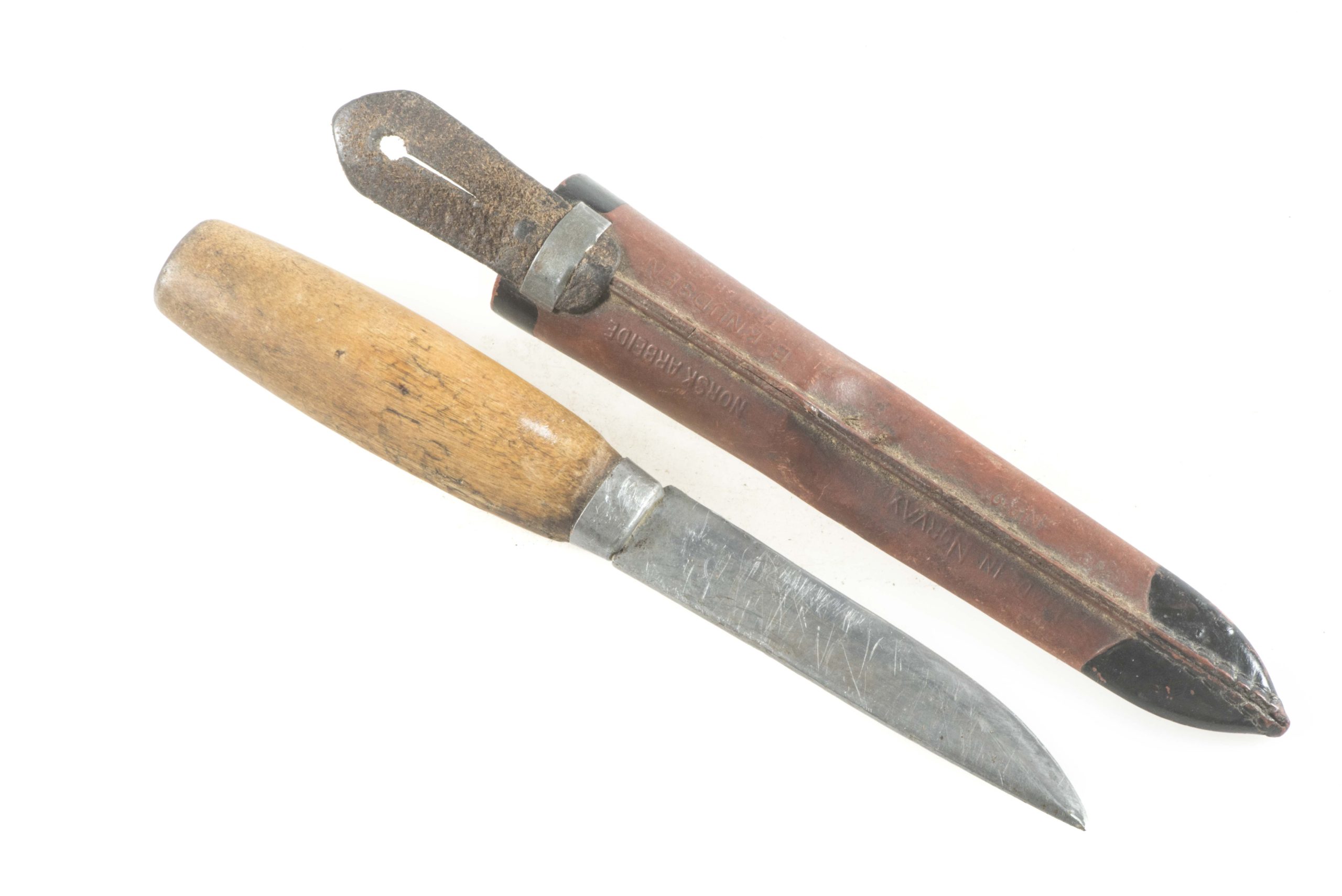 Typical scandinavian knife as worn with many Heer and Waffen-SS troops serving on the Northern Eastern front! Typical wartime production whereas the pride of Norwegian production was a standard but the sheeth is made from pressed paper indicating wartime shortages!