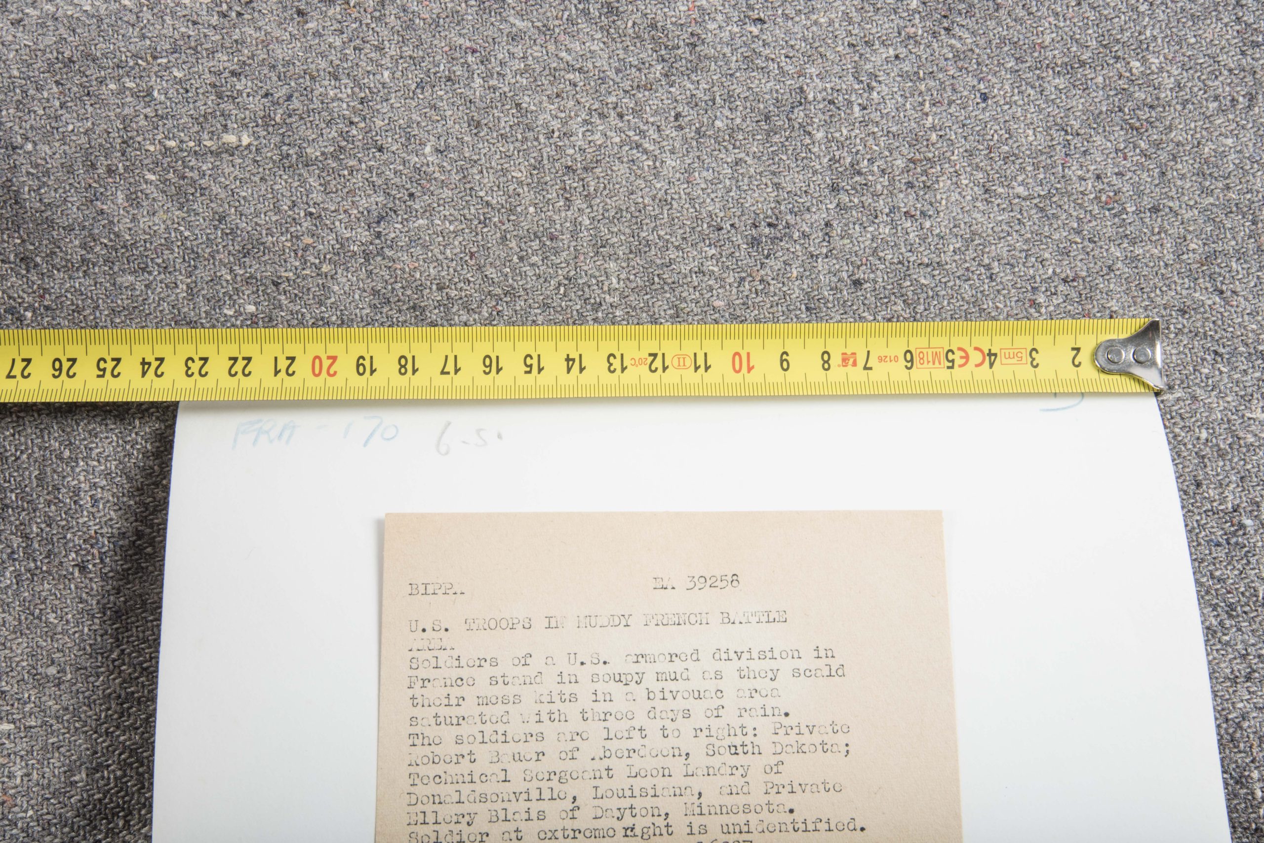 Soldiers of a US armored division in France stand in soupy mud as they scald their mess kits in a bivouac area saturated with three days of rain.