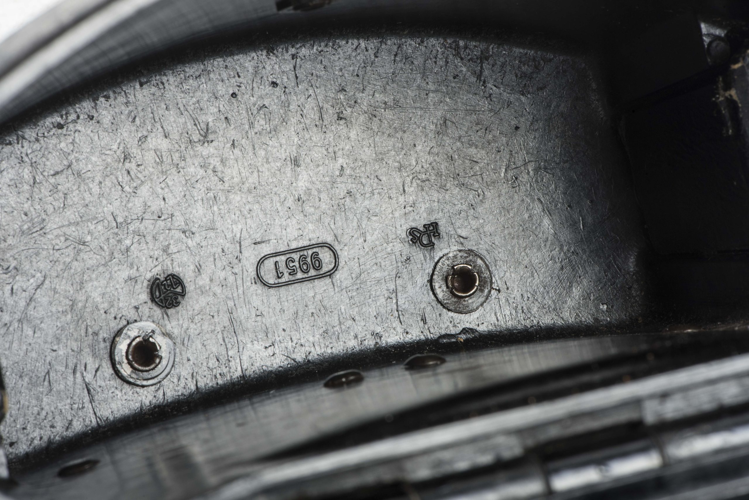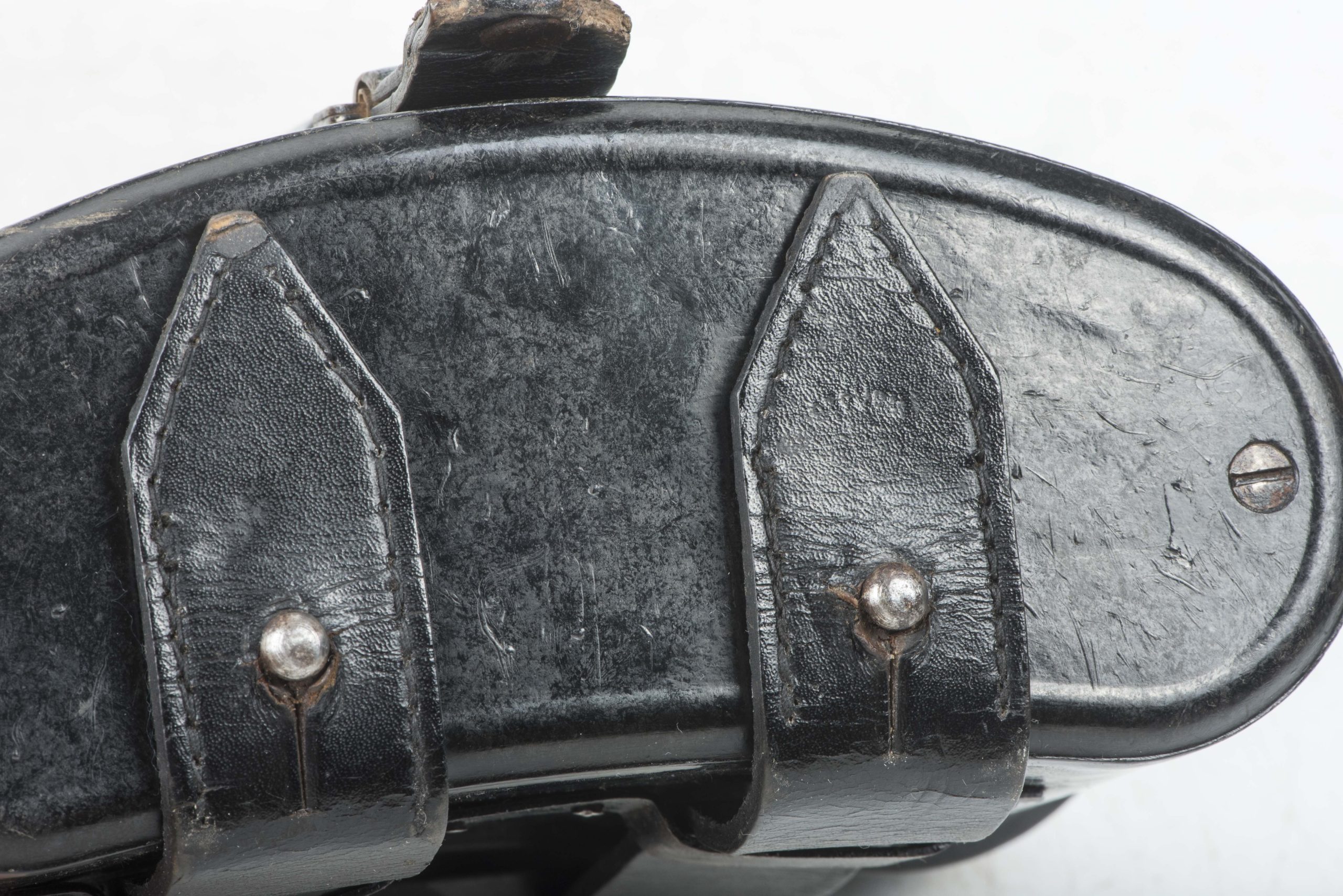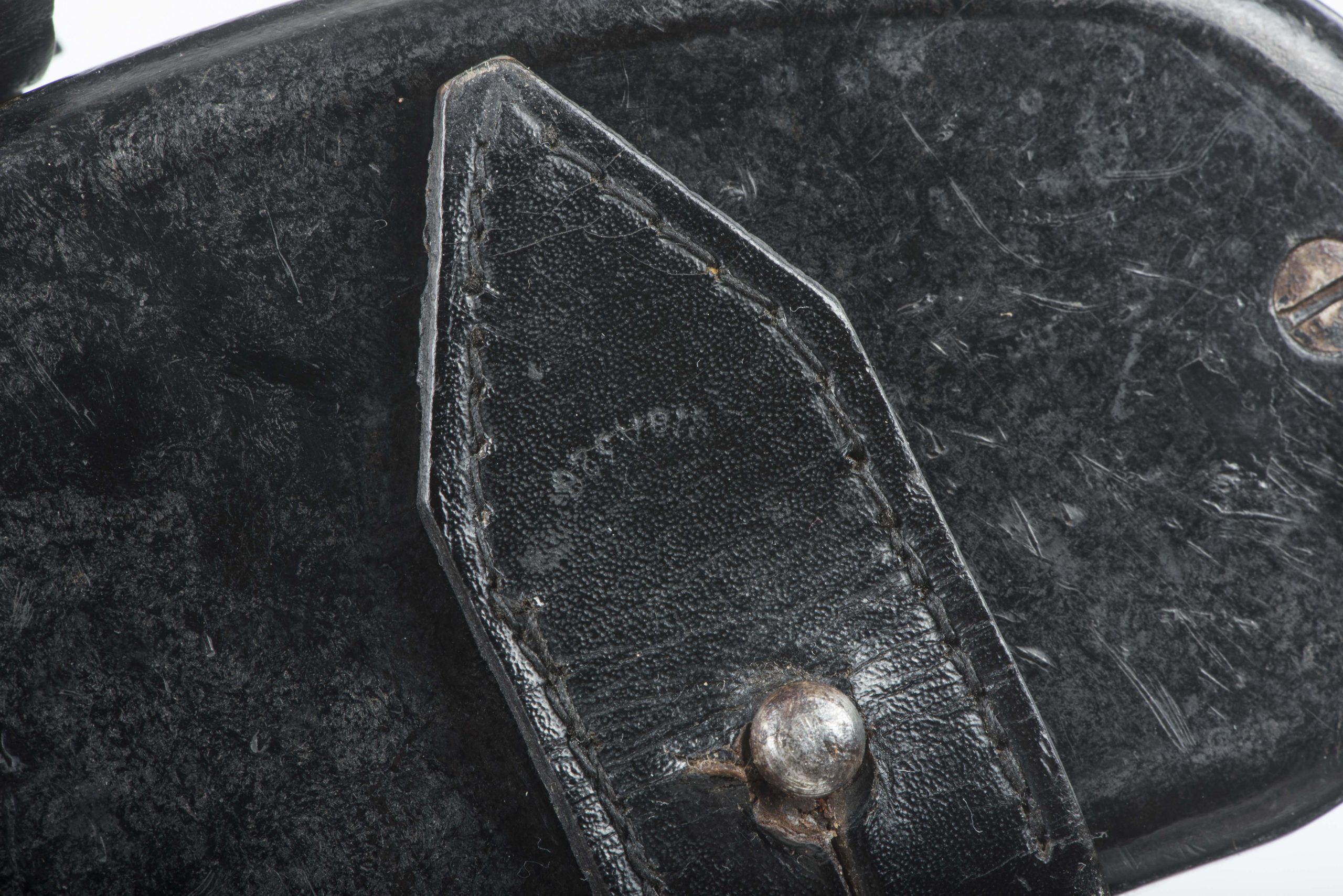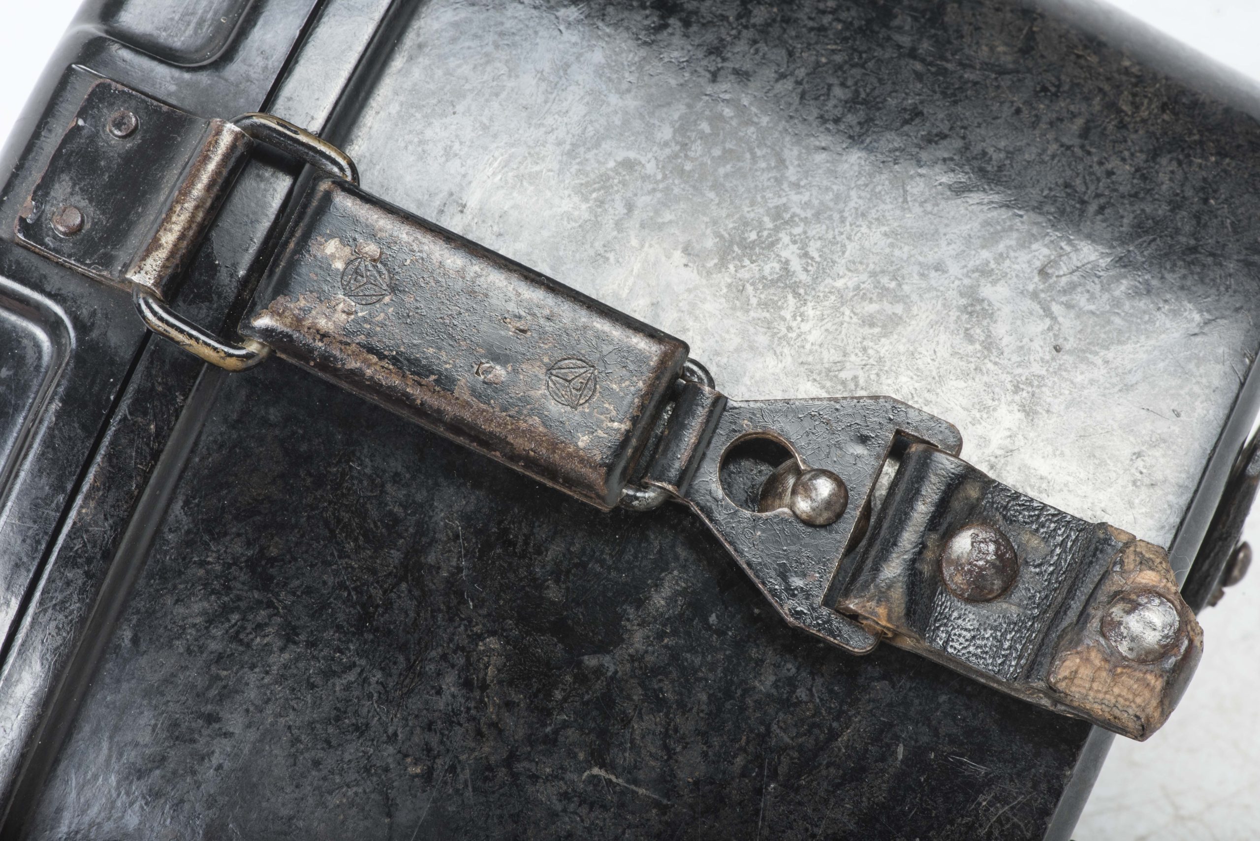 Black bakelite 6×30 Dienstglas case in excellent condition. Textbook example with all functional straps, cushions and pull tab. Rare example with the circular marking on the lid. Typical example in great condition!