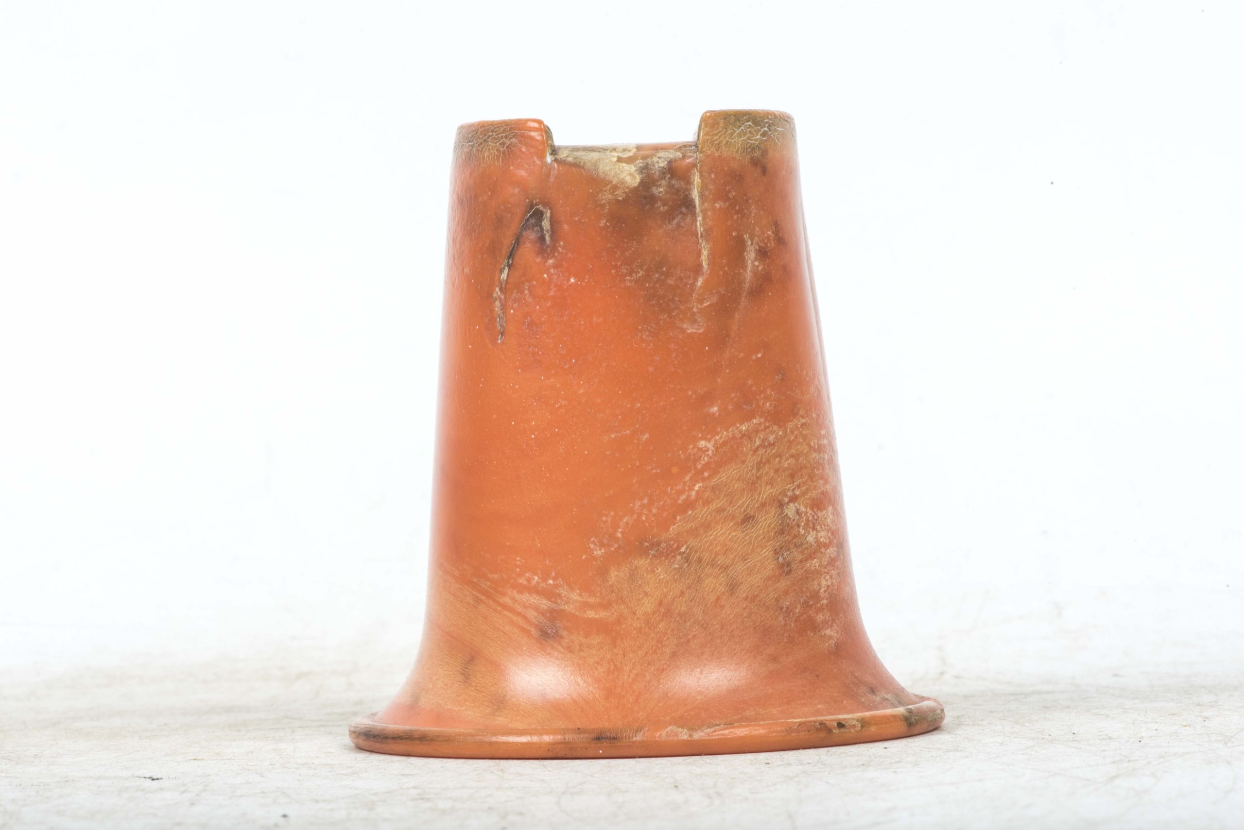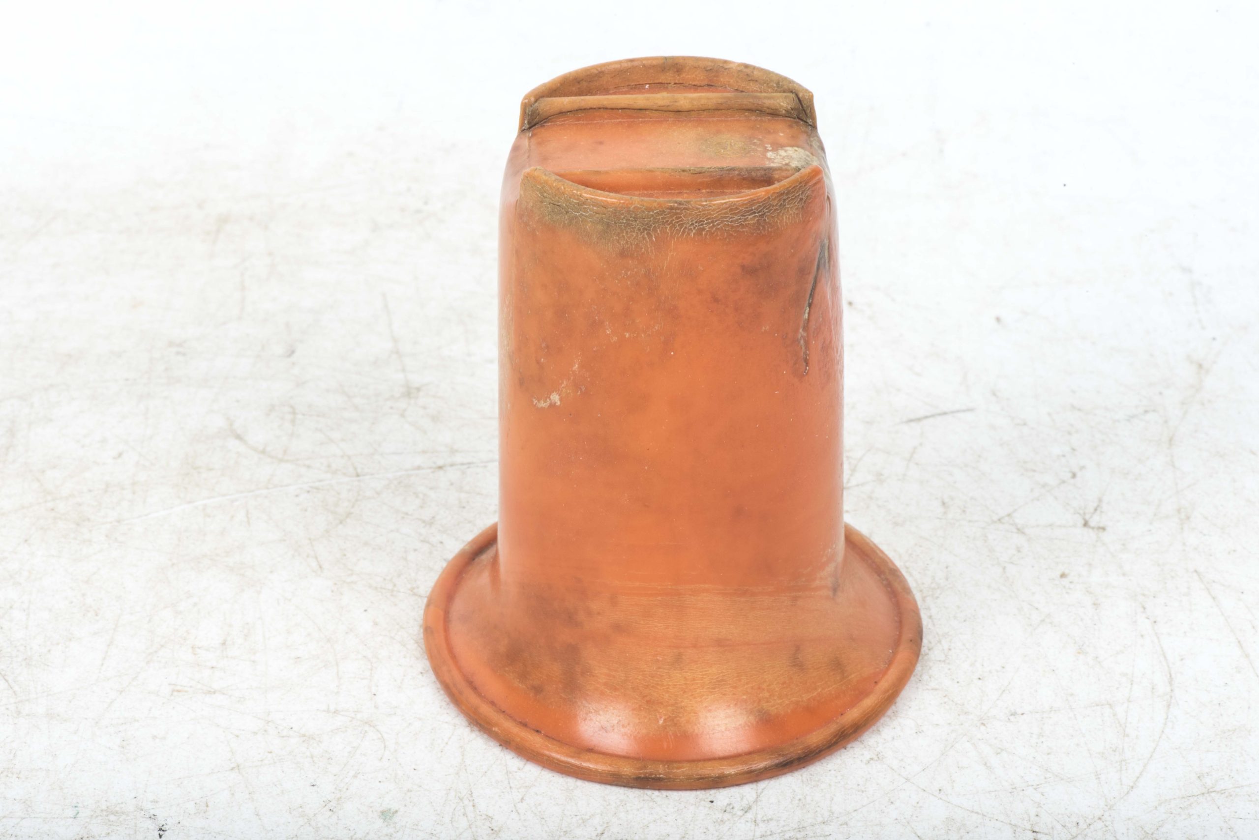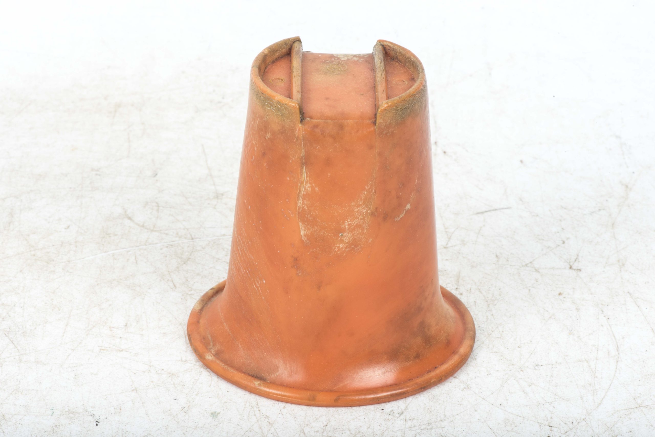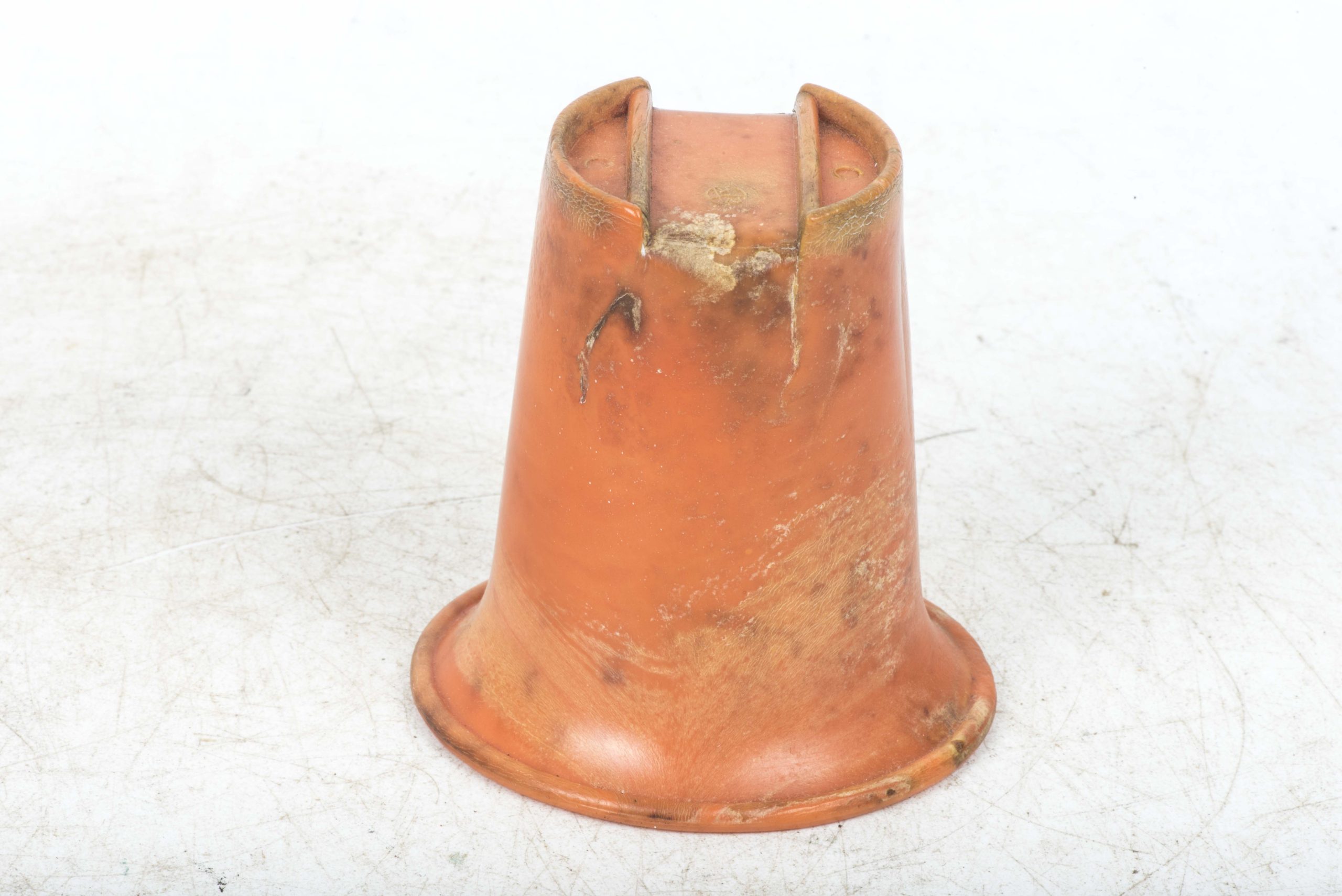 Incredibly rare original orange bakelite canteen cup. This is a rare opportunity to buy an original orange bakelite canteen cup. This example is beautifully marked with a MPD code which was typical for period produced bakelite items. The MPD code F7/K indicates production by a still unknown maker and the usage of urea resin (which is a certain type of Bakelite) with an organic filler material. The bakelite is still in a very good and rather smooth condition and the material isn’t heavily affected by all the years in the ground except for some discoloration which in my opinion could be further cleaned. The only damages are some tiny cracks at the top of the cup. Beautiful original and very rare example!