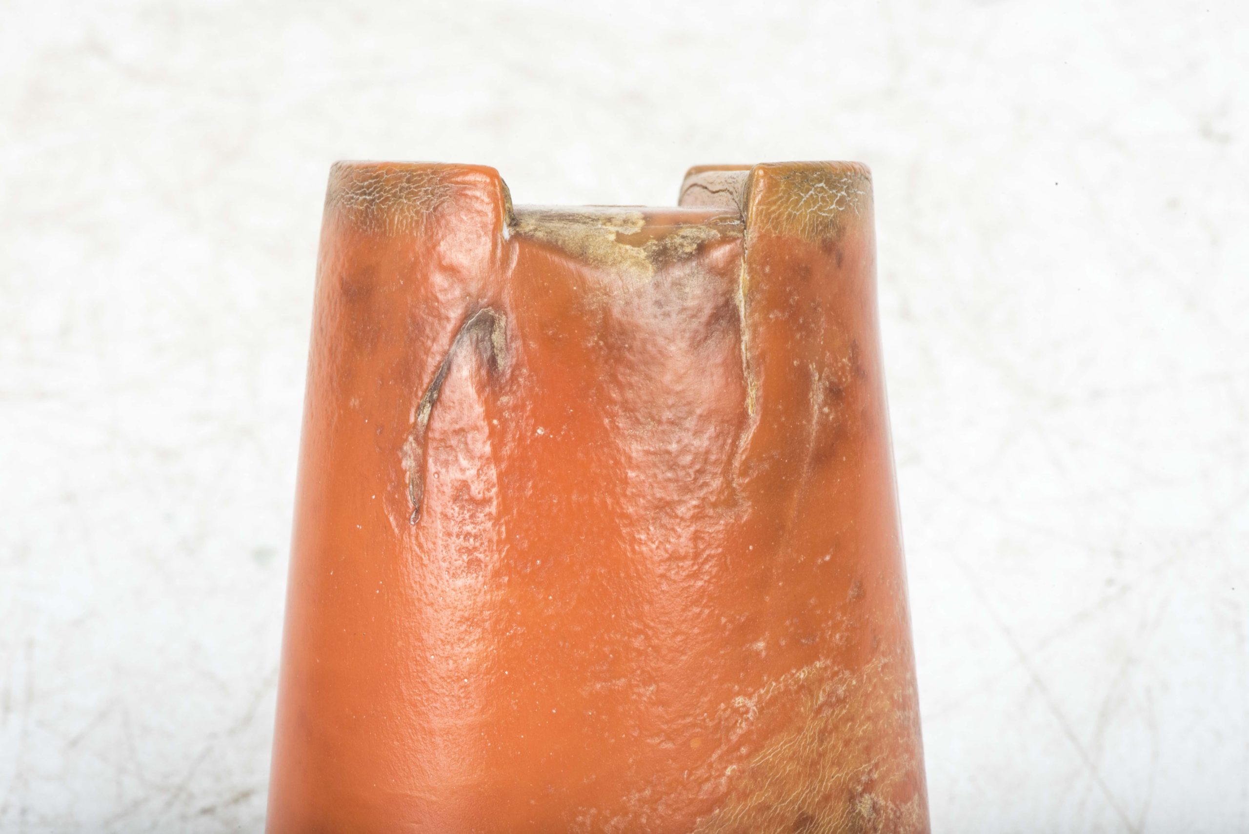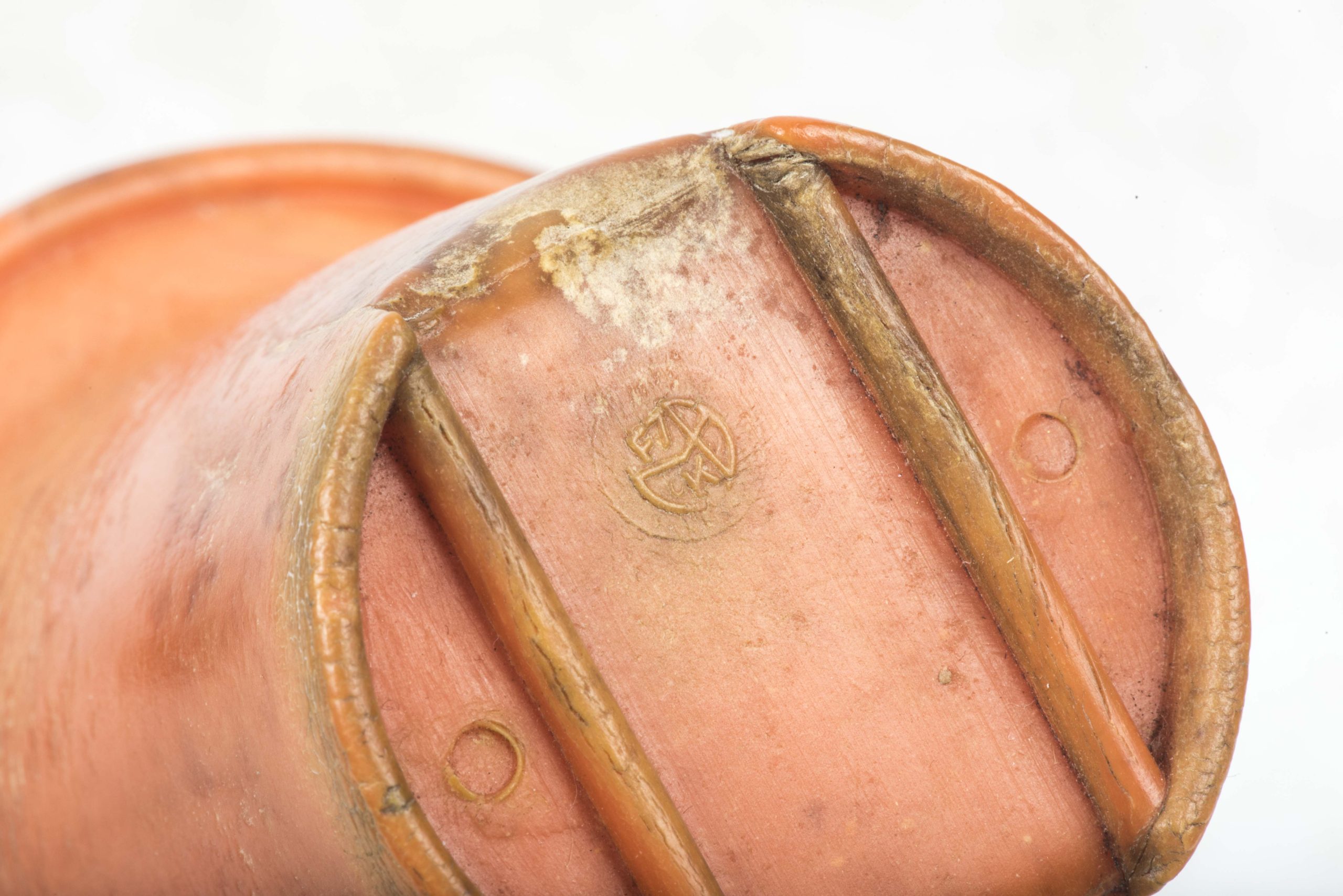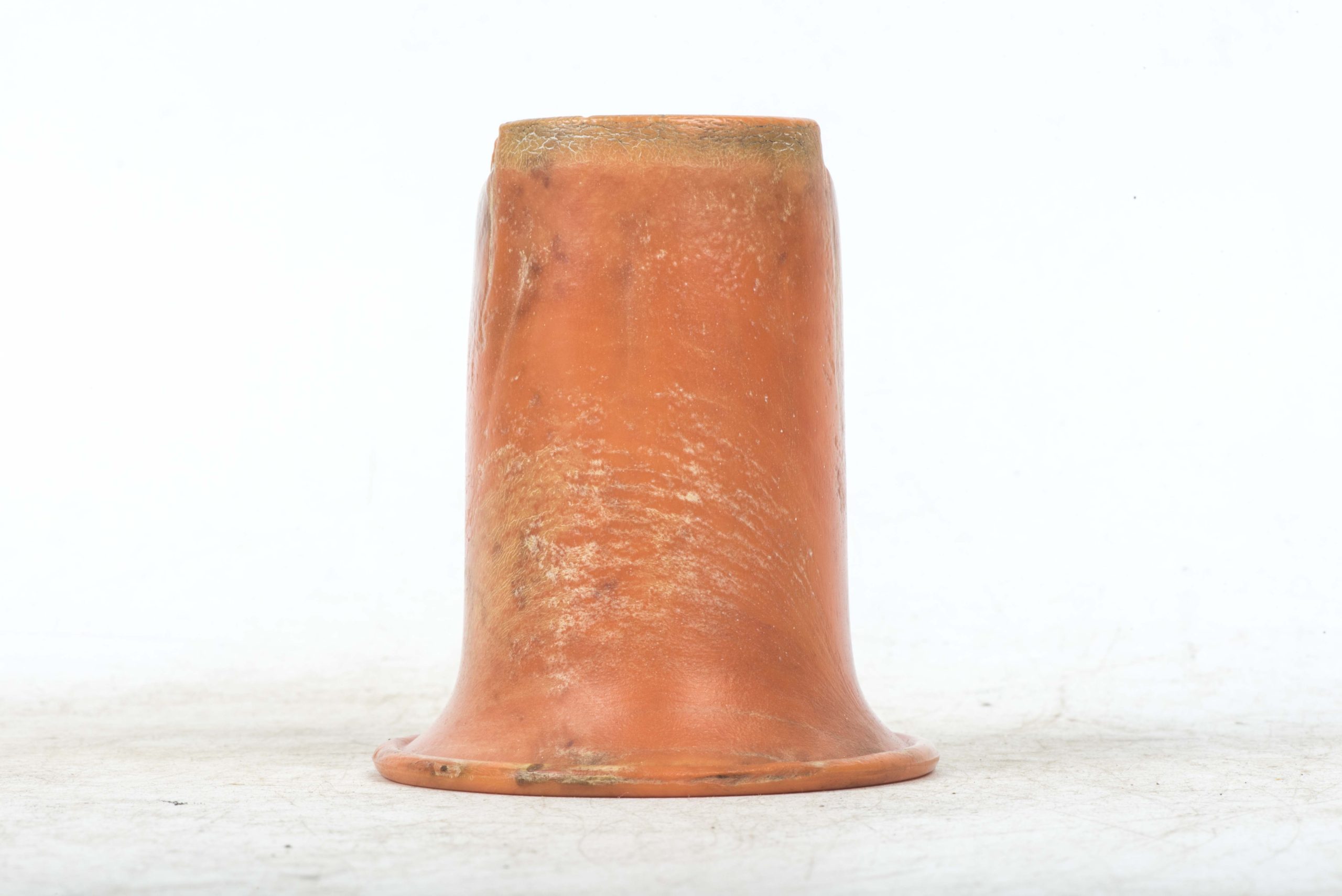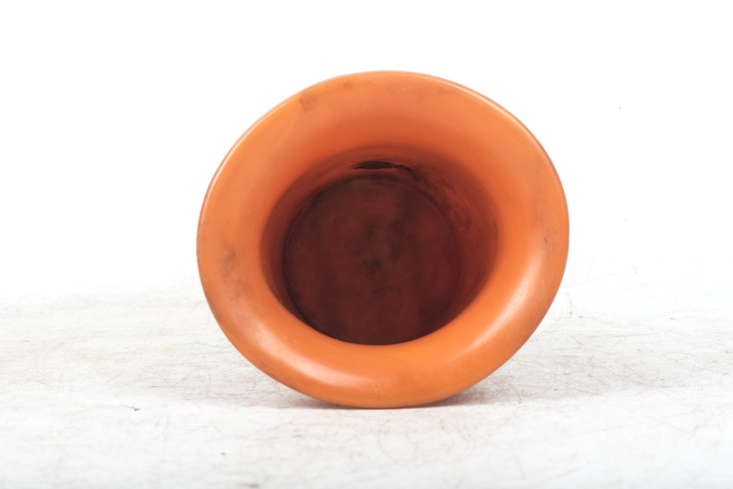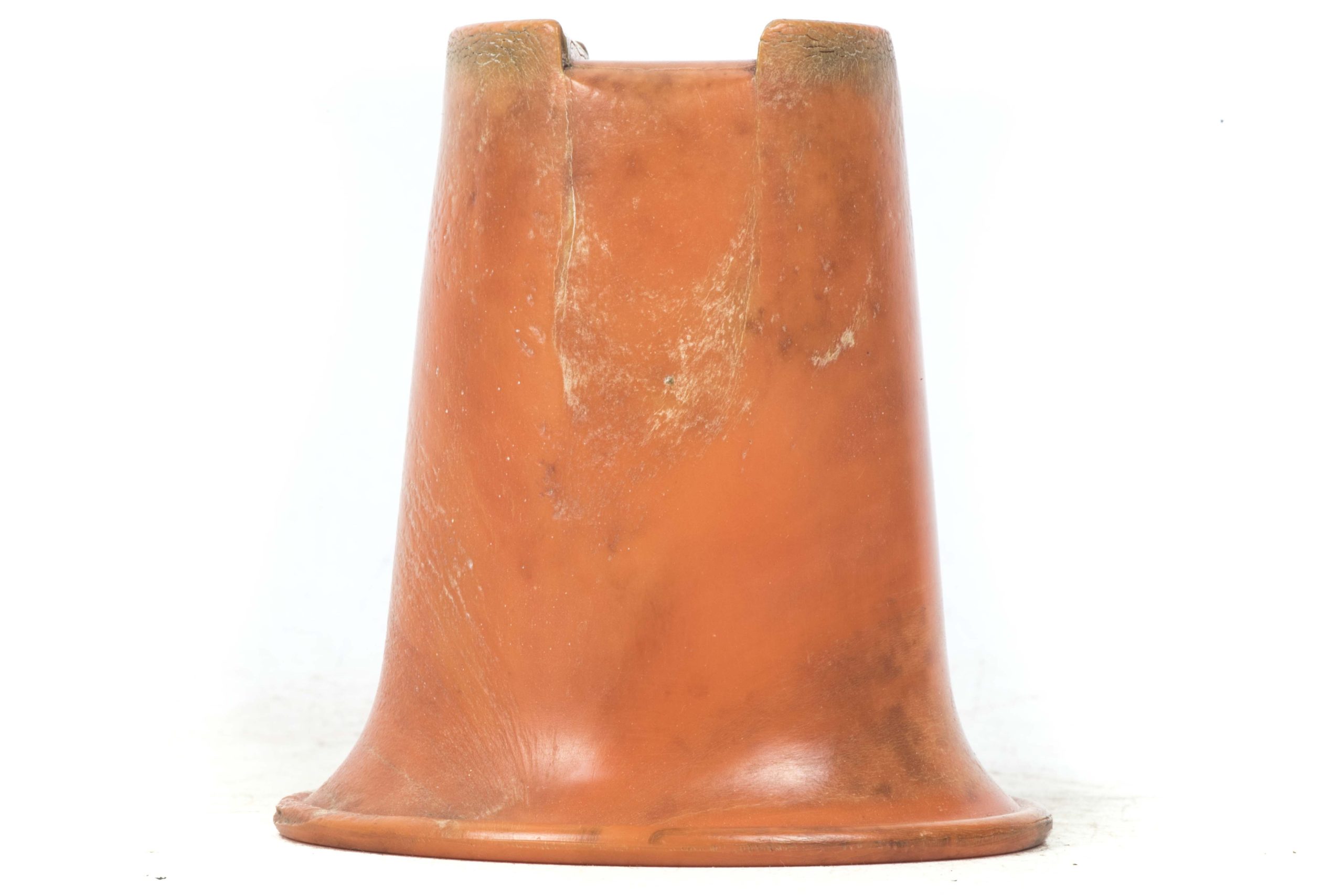 Incredibly rare original orange bakelite canteen cup. This is a rare opportunity to buy an original orange bakelite canteen cup. This example is beautifully marked with a MPD code which was typical for period produced bakelite items. The MPD code F7/K indicates production by a still unknown maker and the usage of urea resin (which is a certain type of Bakelite) with an organic filler material. The bakelite is still in a very good and rather smooth condition and the material isn’t heavily affected by all the years in the ground except for some discoloration which in my opinion could be further cleaned. The only damages are some tiny cracks at the top of the cup. Beautiful original and very rare example!
