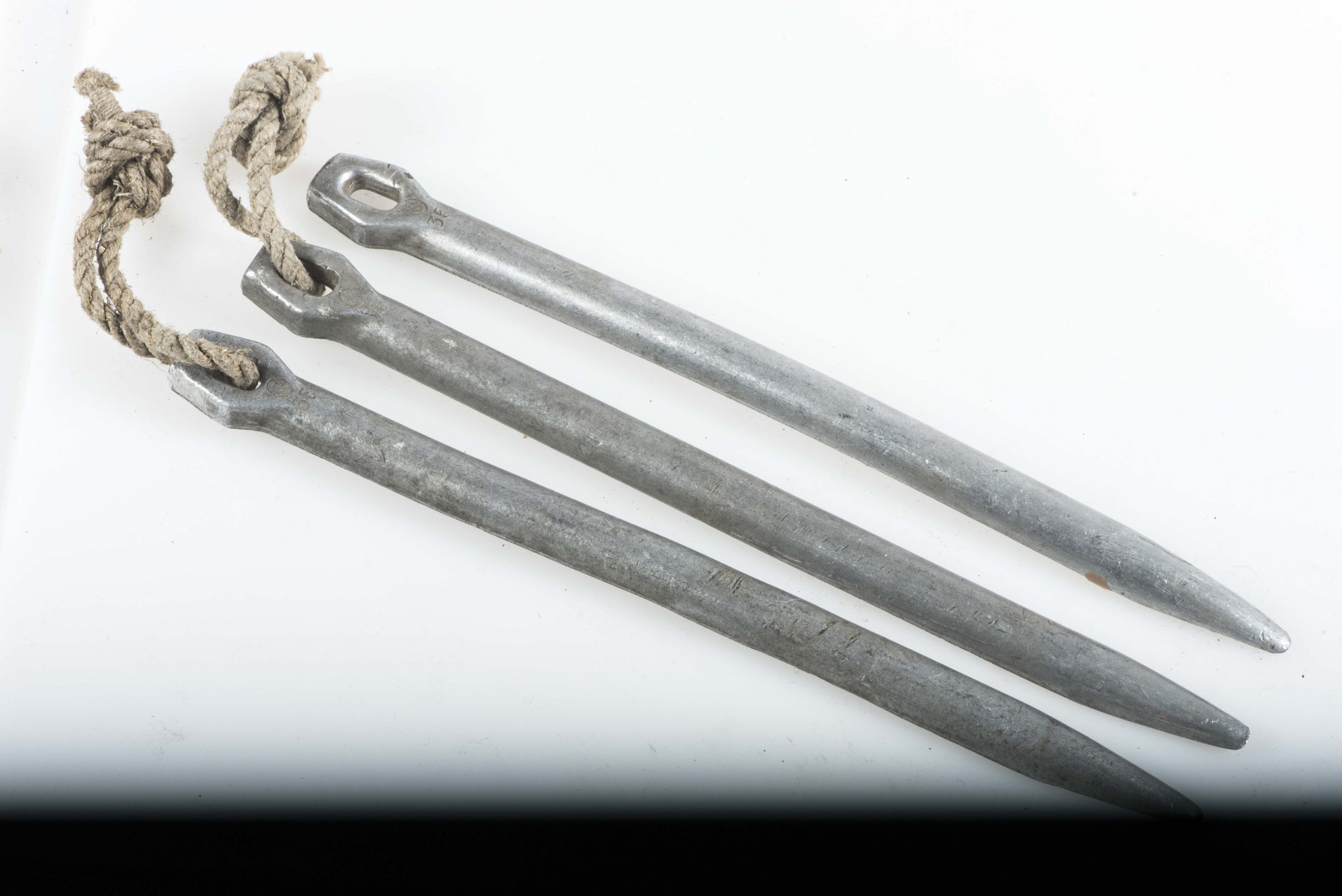 Rare early pre war set of three matching aluminium tent pegs in very good condition. The tent pegs are nicely marked S 35 which indicates production by an unknown manufacturer in 1935. All pegs are original and complete with its factory attached cord!
