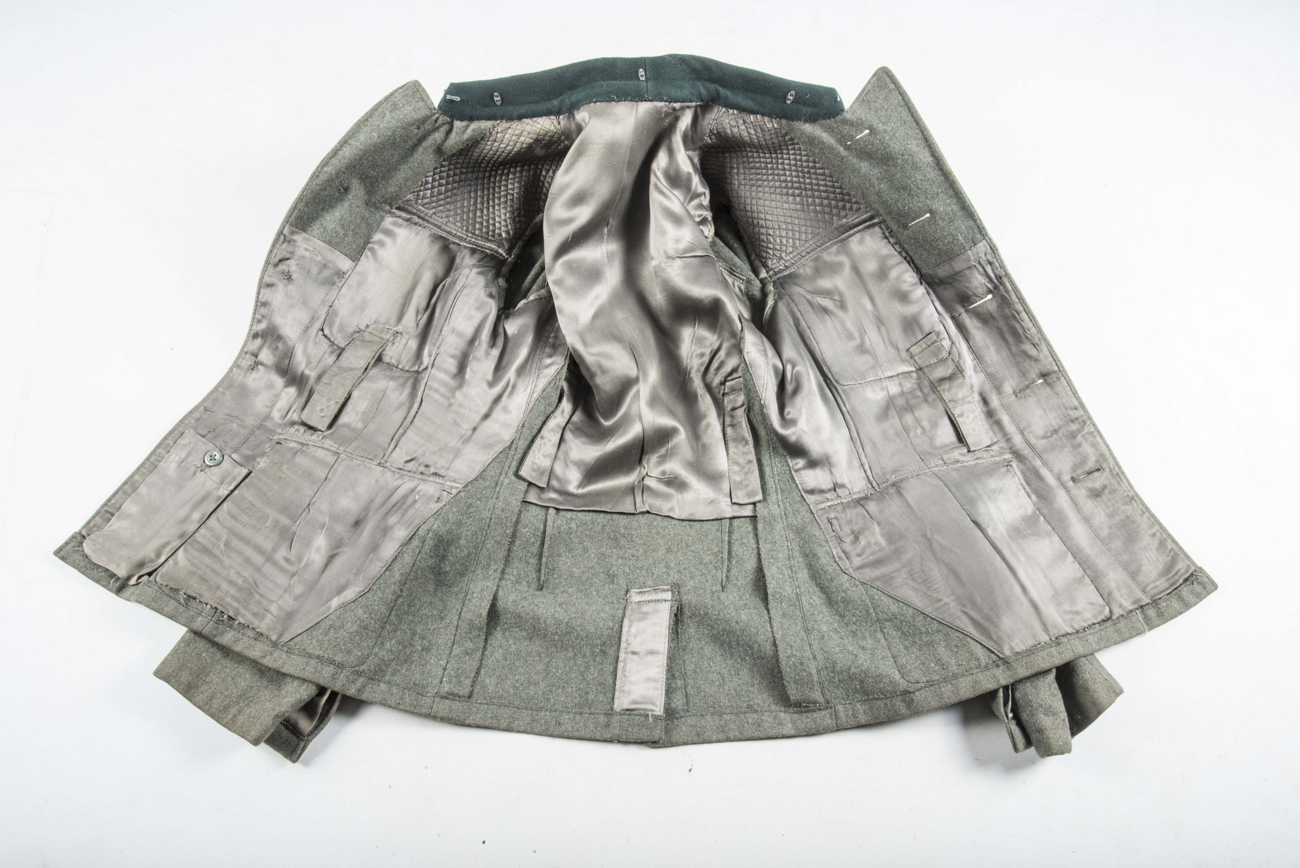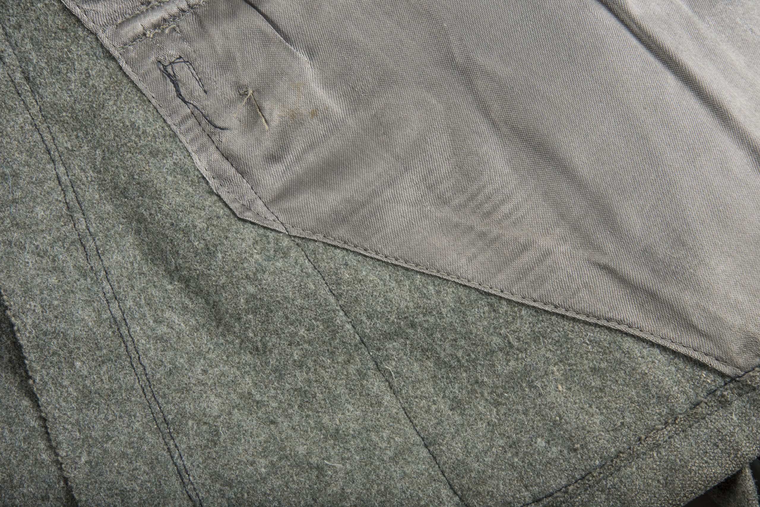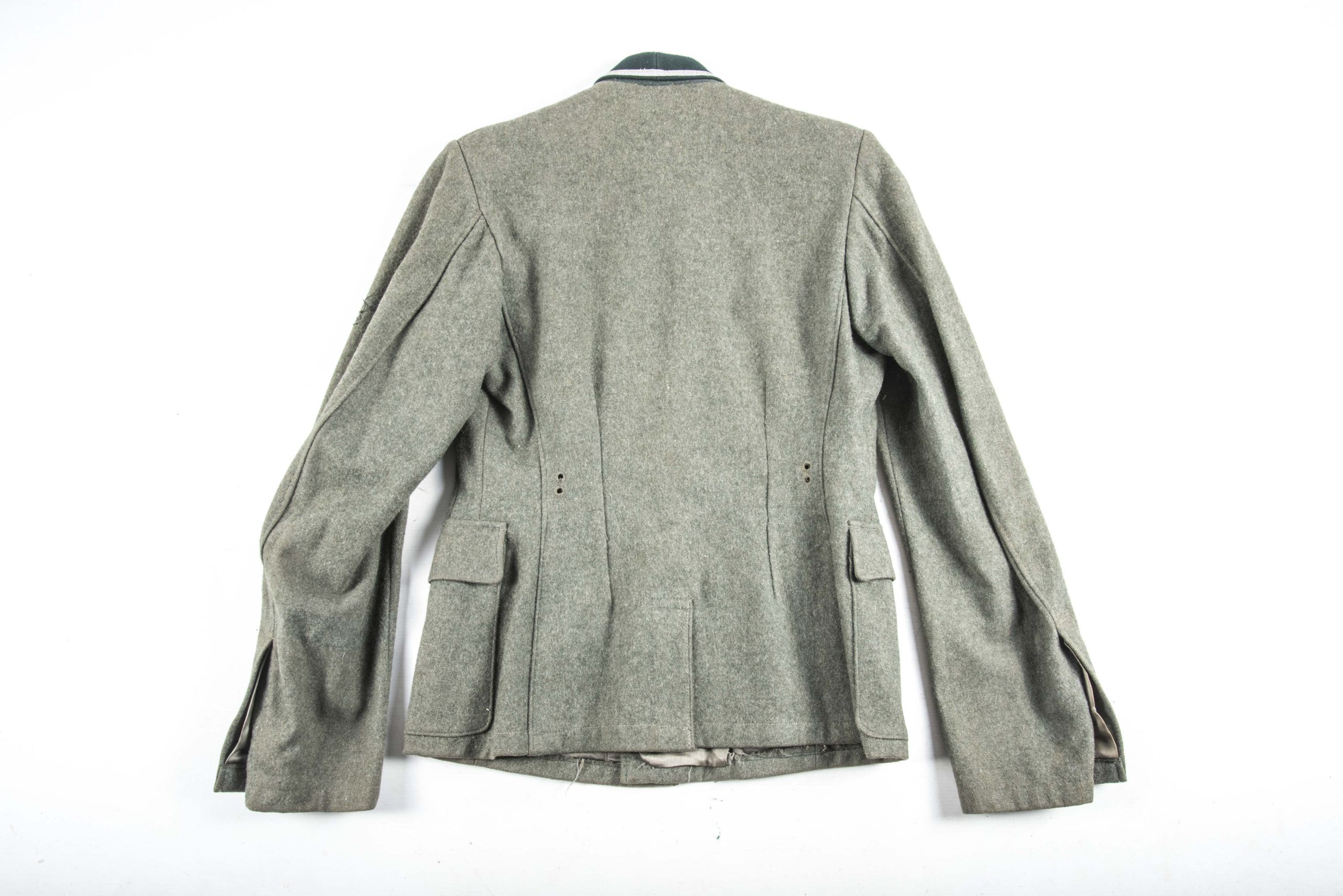 Rare Waffen-SS NCO M42 field blouse with beautiful period tailored modifications. Textbook Waffen-SS NCO field blouse with modified dark green collar often referred to as sharks teeth. The garment has been shortened and taken in by a expert tailor. Additionally pleats on the pockets were added and the folding layer on the bottom pockets removed. This type of blouses were often modified by NCO’s for a parade dress, or a more short and practical fit in the field. The garment is without insignia but could easily be restored if desired. Beautiful base tunic for a restoration!