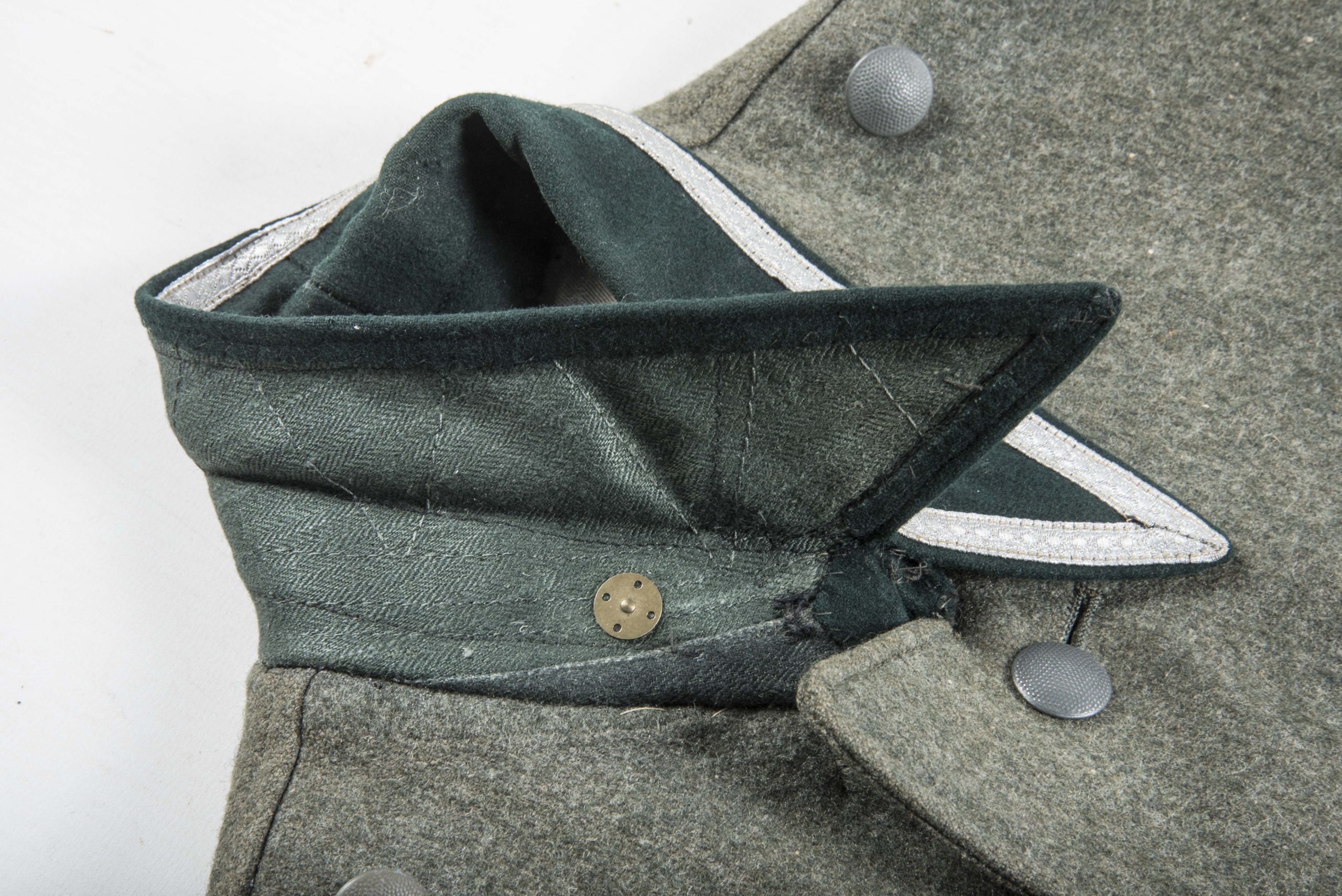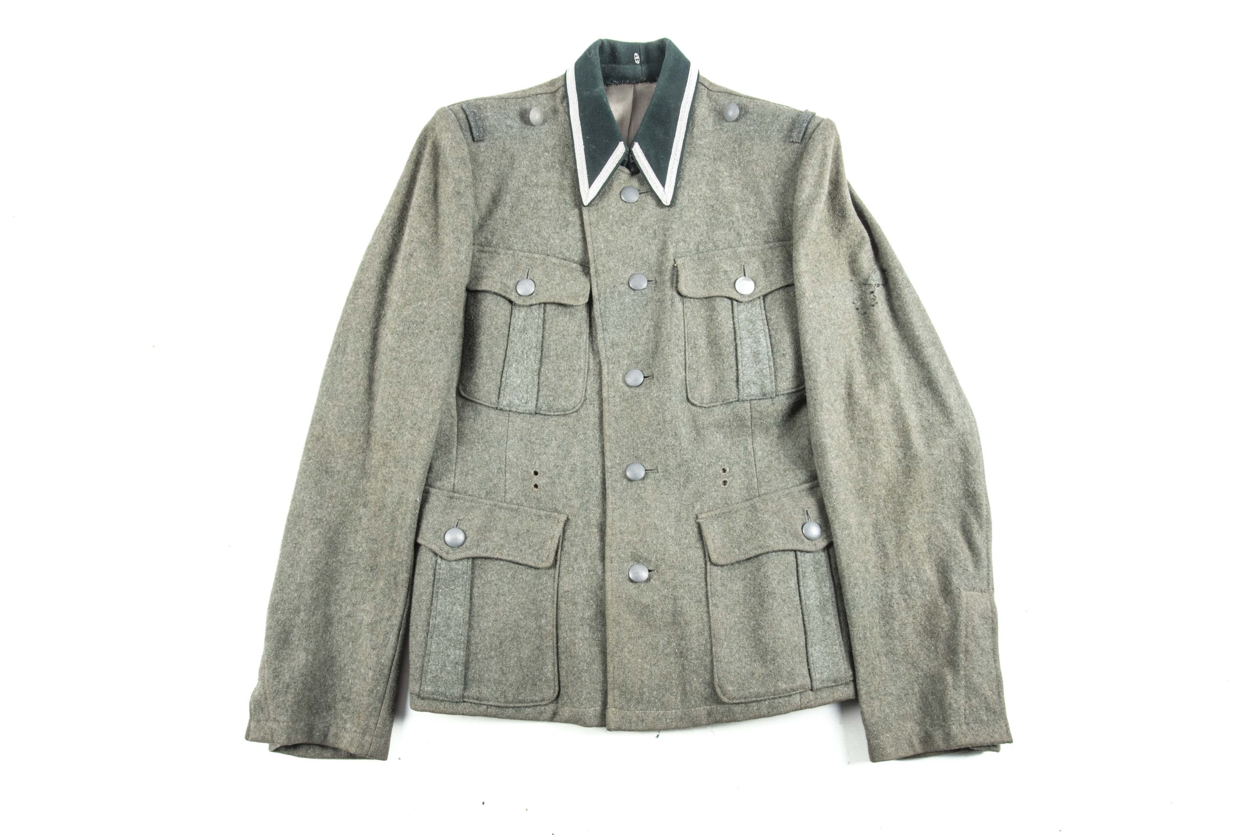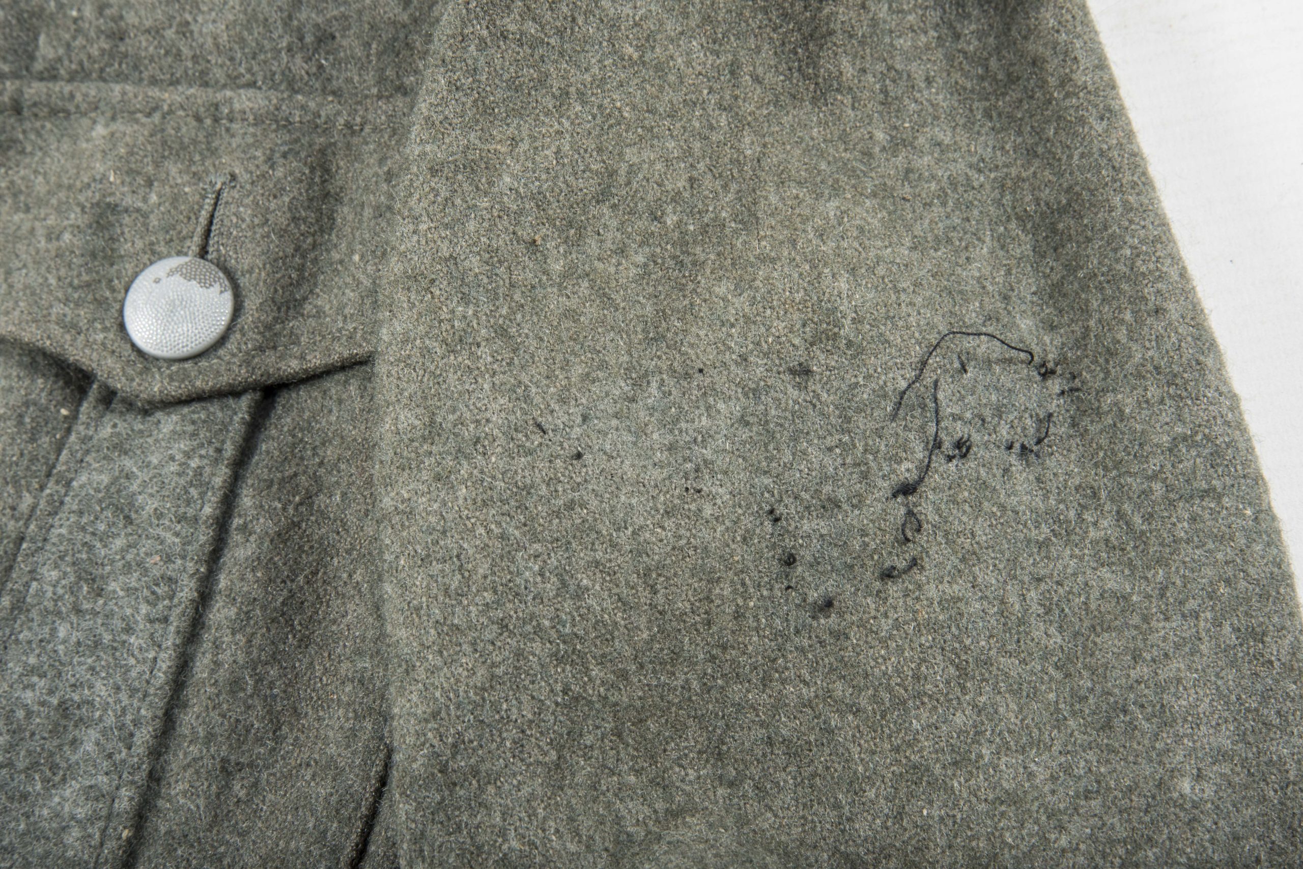 Rare Waffen-SS NCO M42 field blouse with beautiful period tailored modifications. Textbook Waffen-SS NCO field blouse with modified dark green collar often referred to as sharks teeth. The garment has been shortened and taken in by a expert tailor. Additionally pleats on the pockets were added and the folding layer on the bottom pockets removed. This type of blouses were often modified by NCO’s for a parade dress, or a more short and practical fit in the field. The garment is without insignia but could easily be restored if desired. Beautiful base tunic for a restoration!