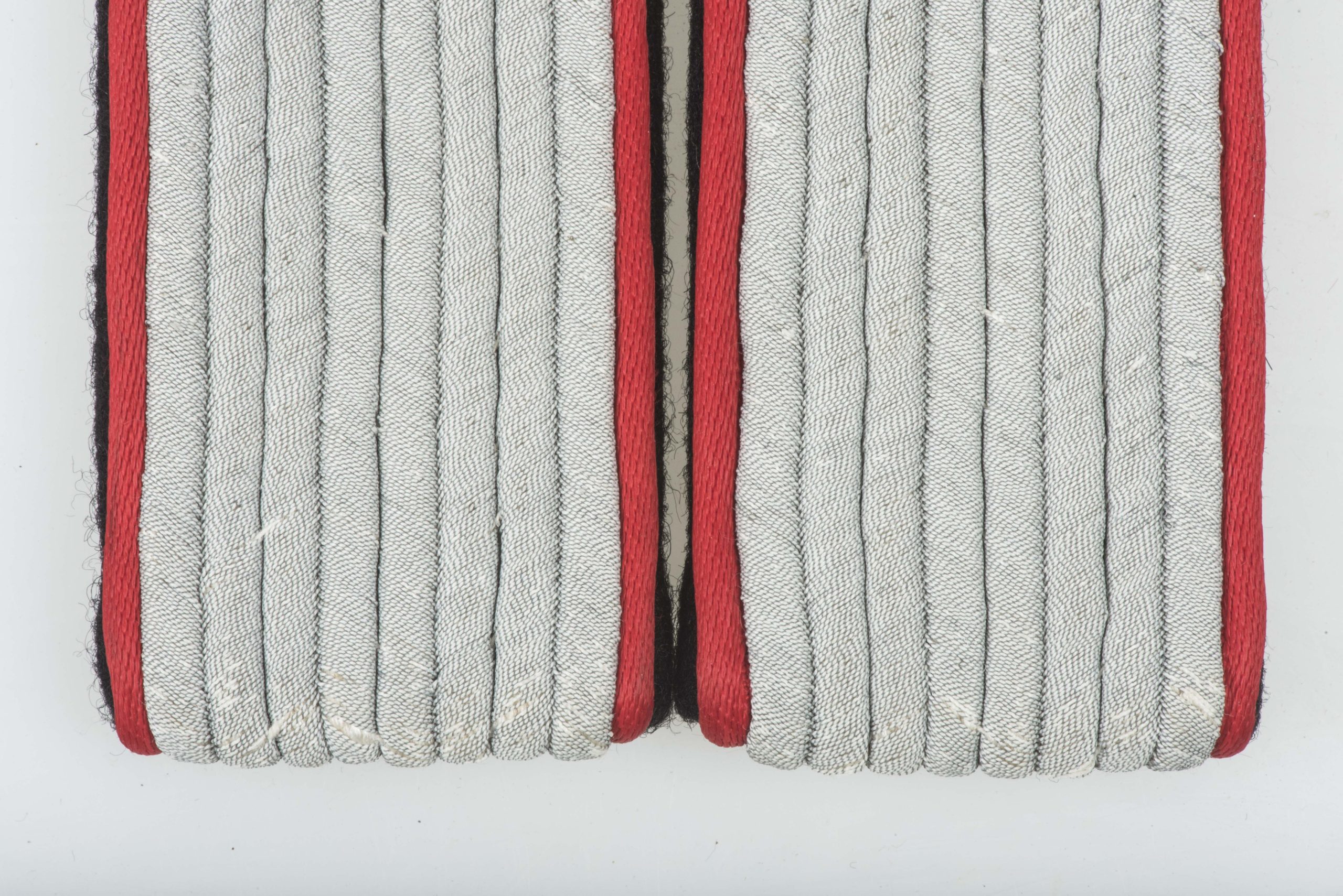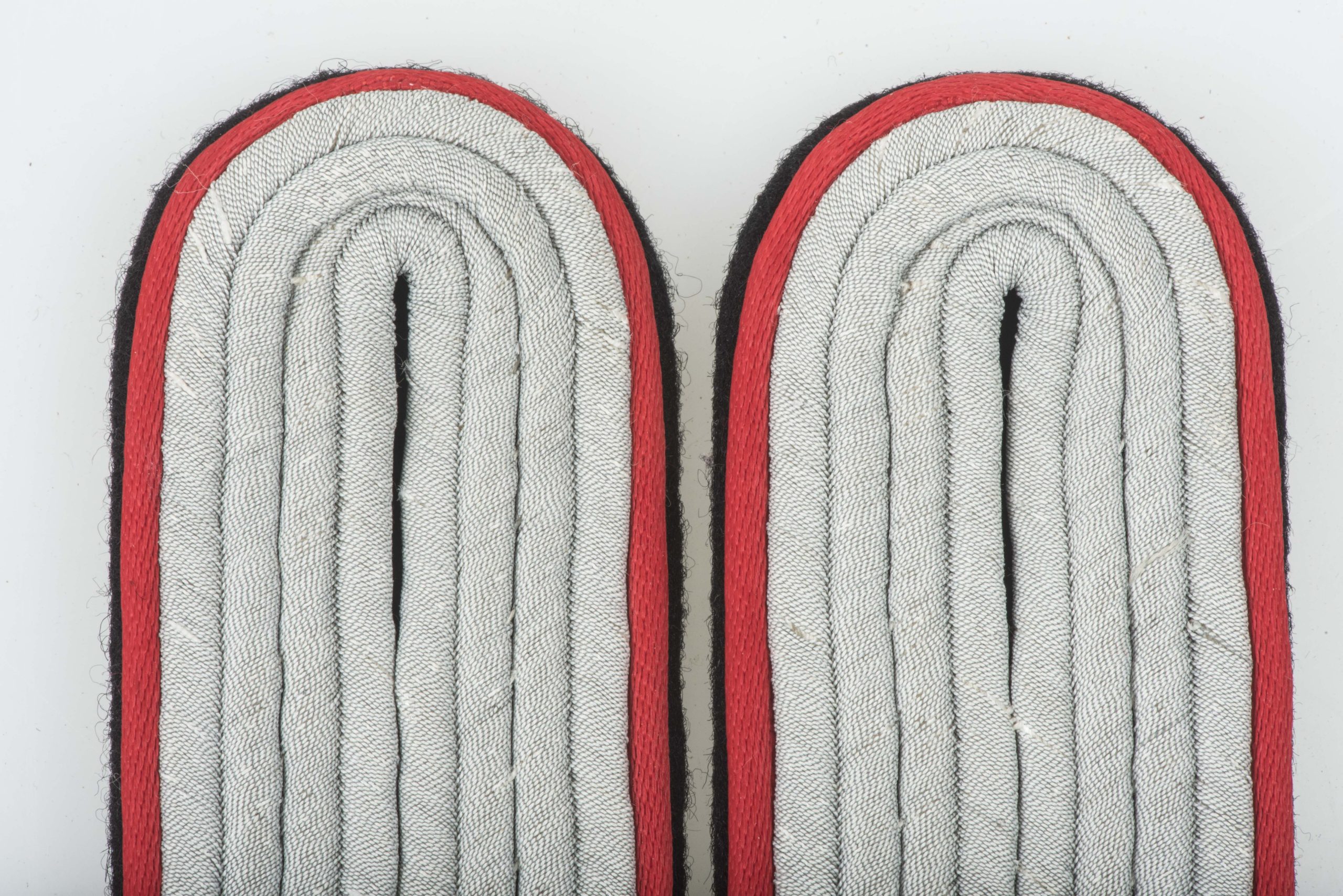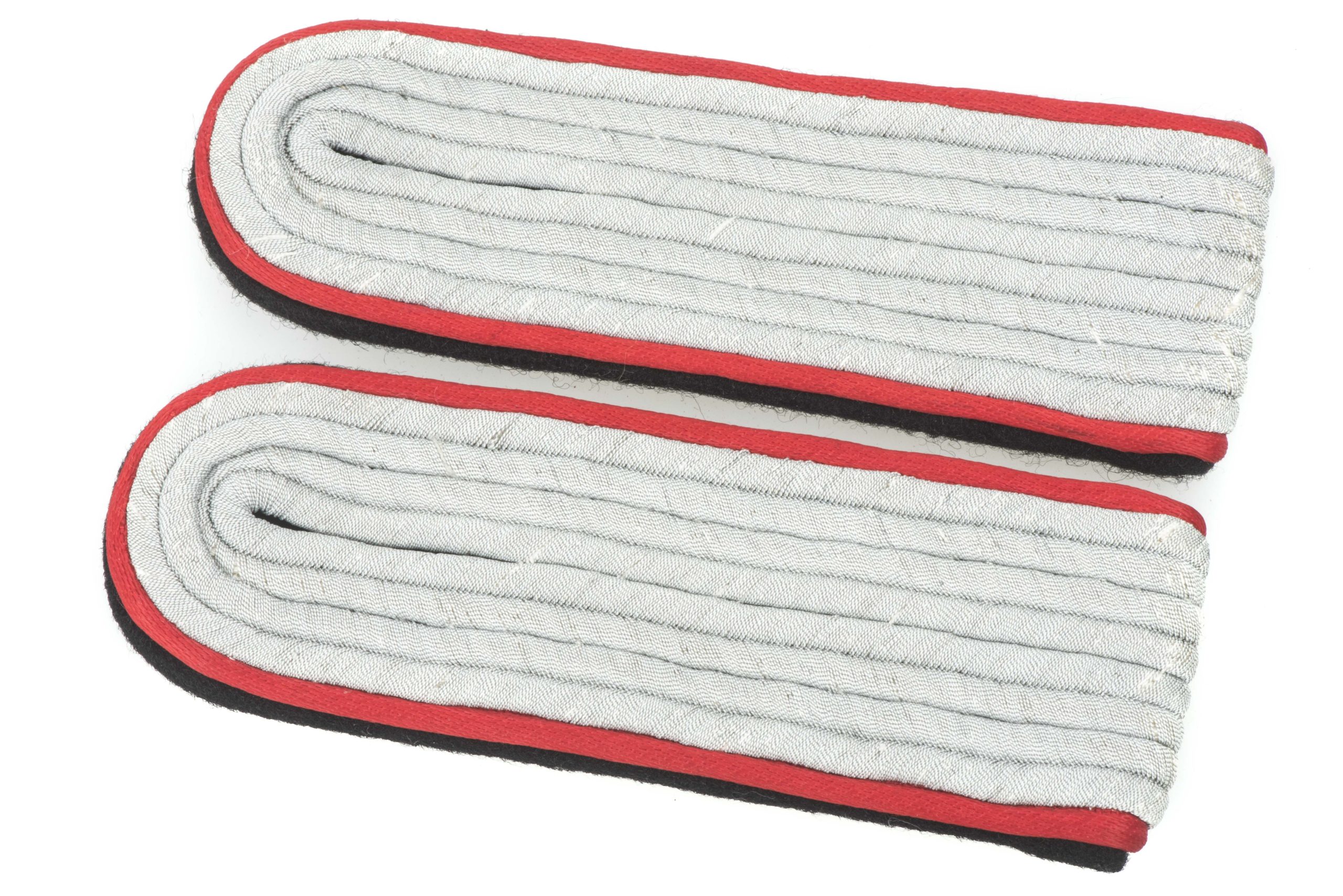 Rare Textbook and matching pair of shoulderboards for a Untersturmführer der Waffen-SS. The rayon red piping indicates either use by Artillerie or Sturmartillerie. The boards are in near mint condition and would be very hard to upgrade or replace!