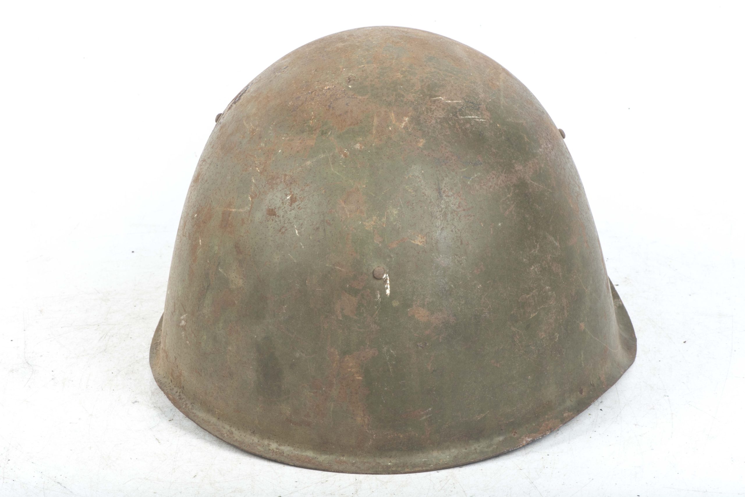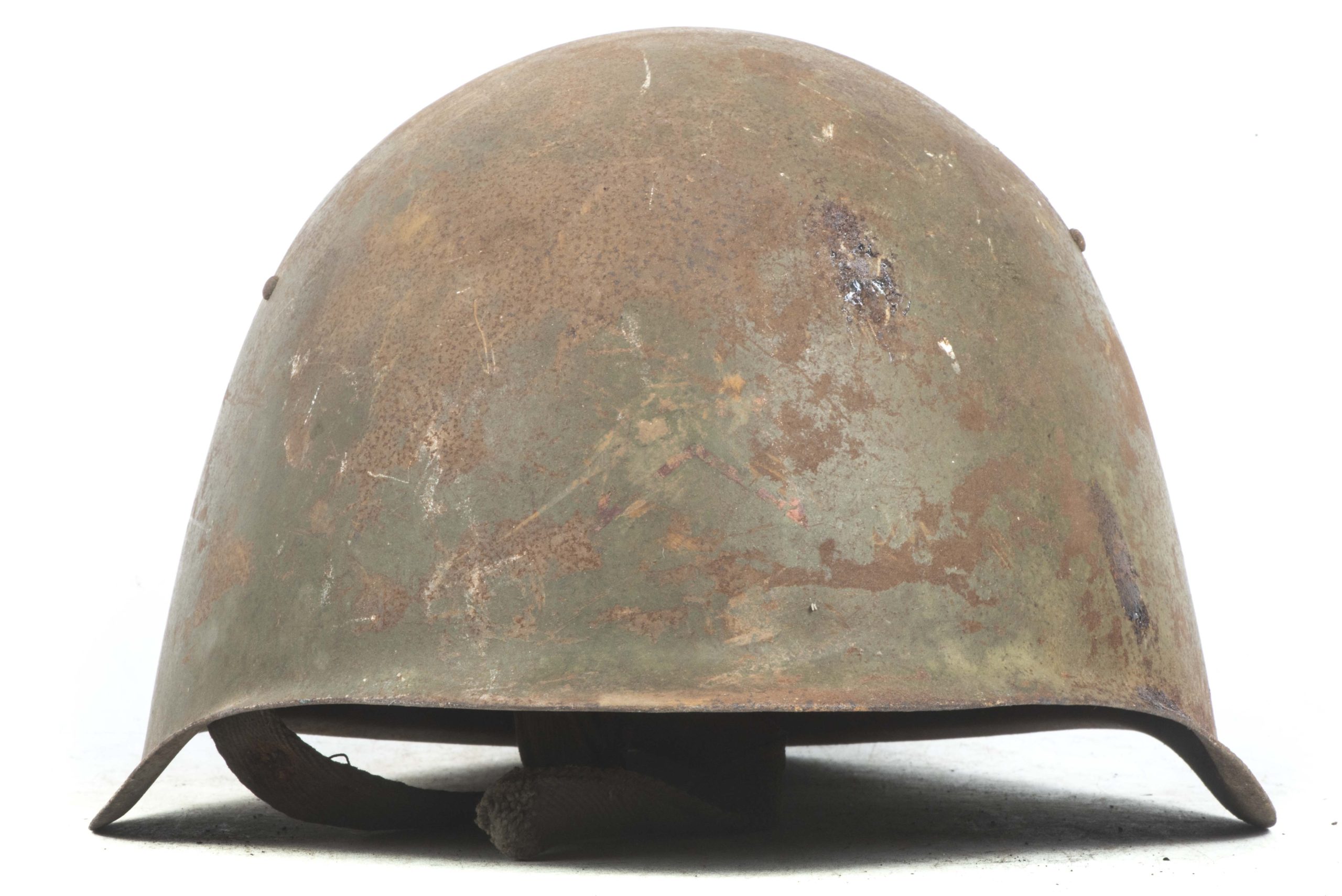 Rare Russian SSH-39 helmet in untouched condition. Complete with the stenciled red star on the front. The helmet retains its original liner and chinstrap. Hard to find example!