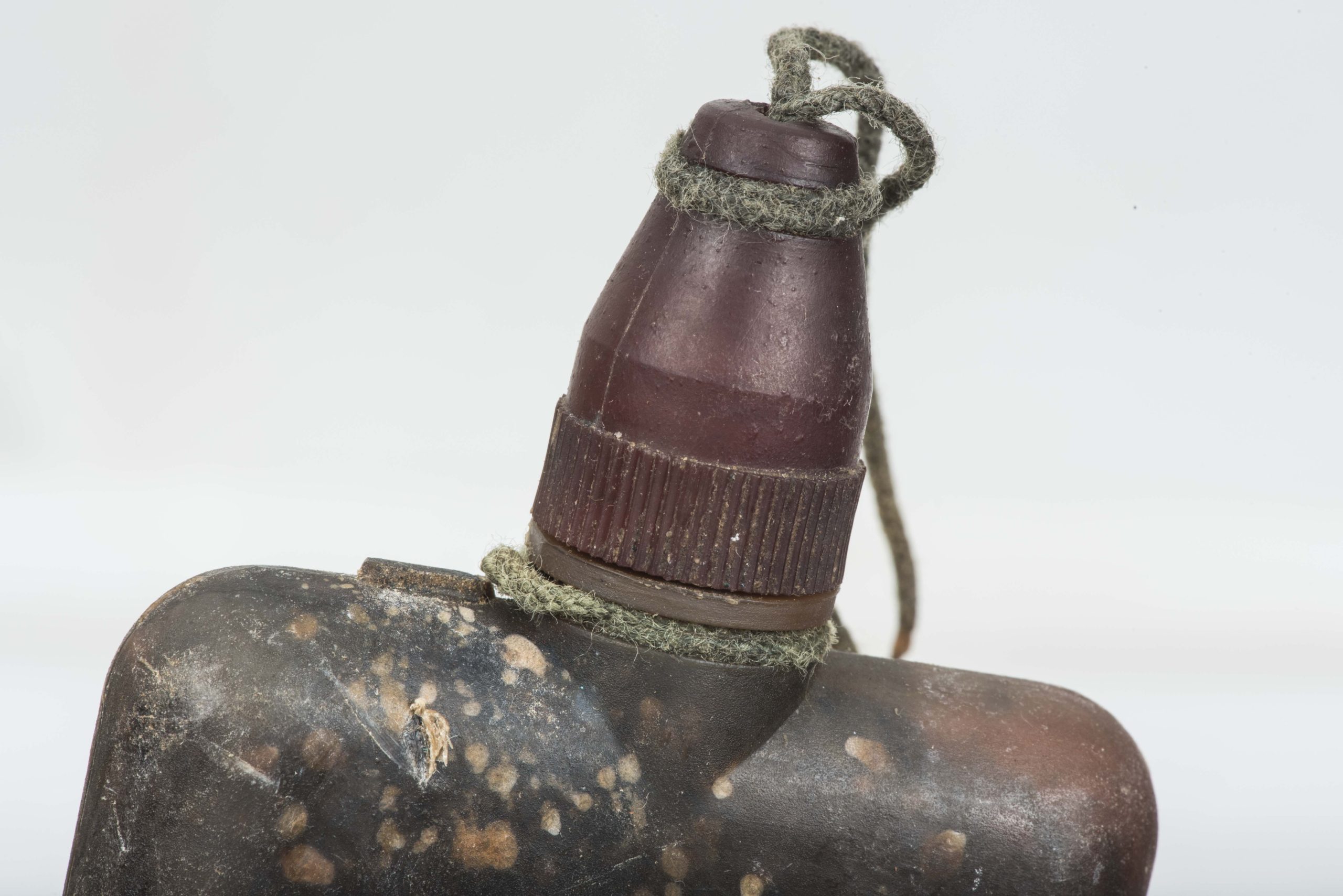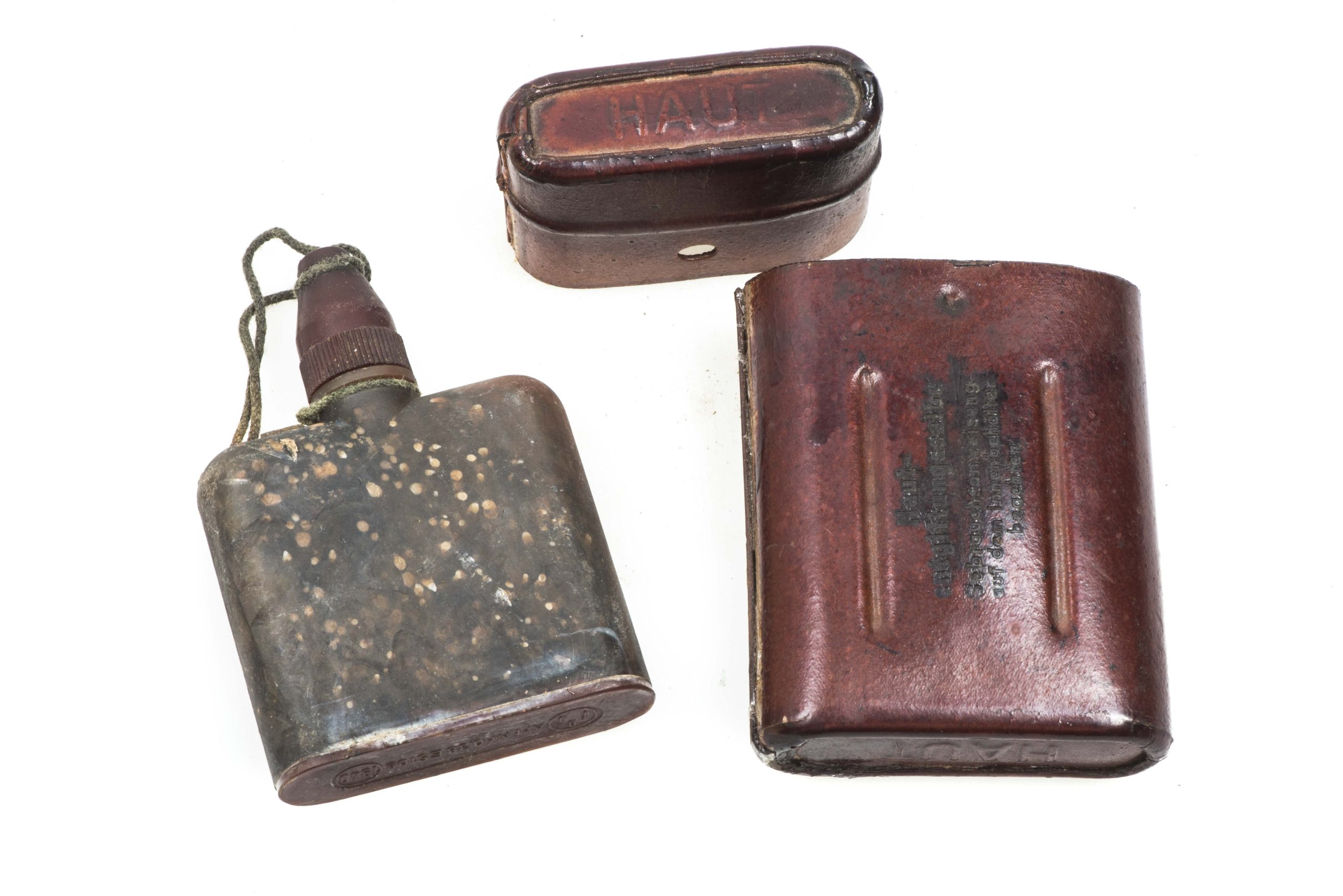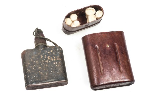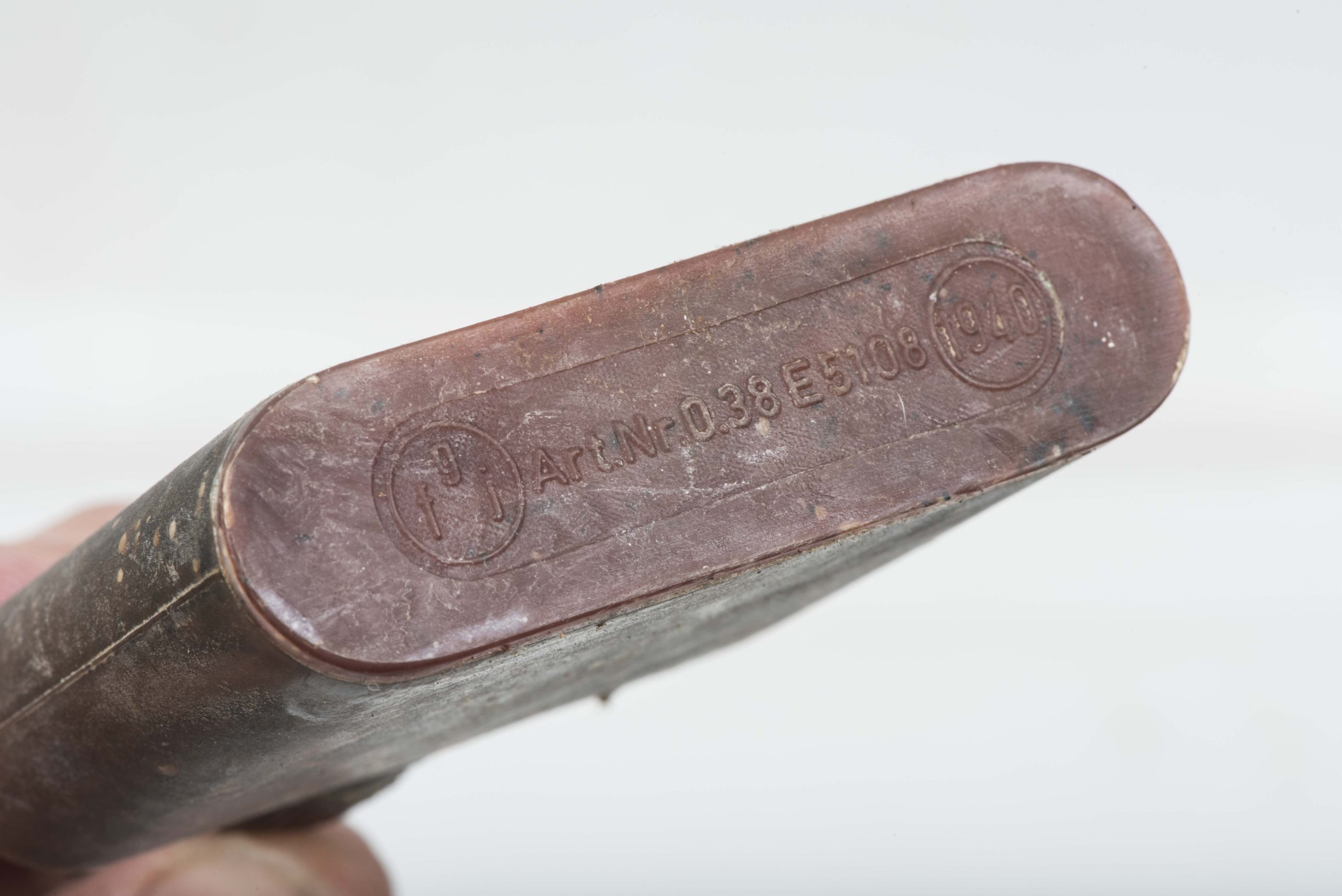 A rare Waffen u. Hautentgiftungsmittel box with contents. Rare to encounter with the red pressed paper box and swabs inside. The flask inside is a Waffenentgiftungsmittel canister in nice speckled bakelite.