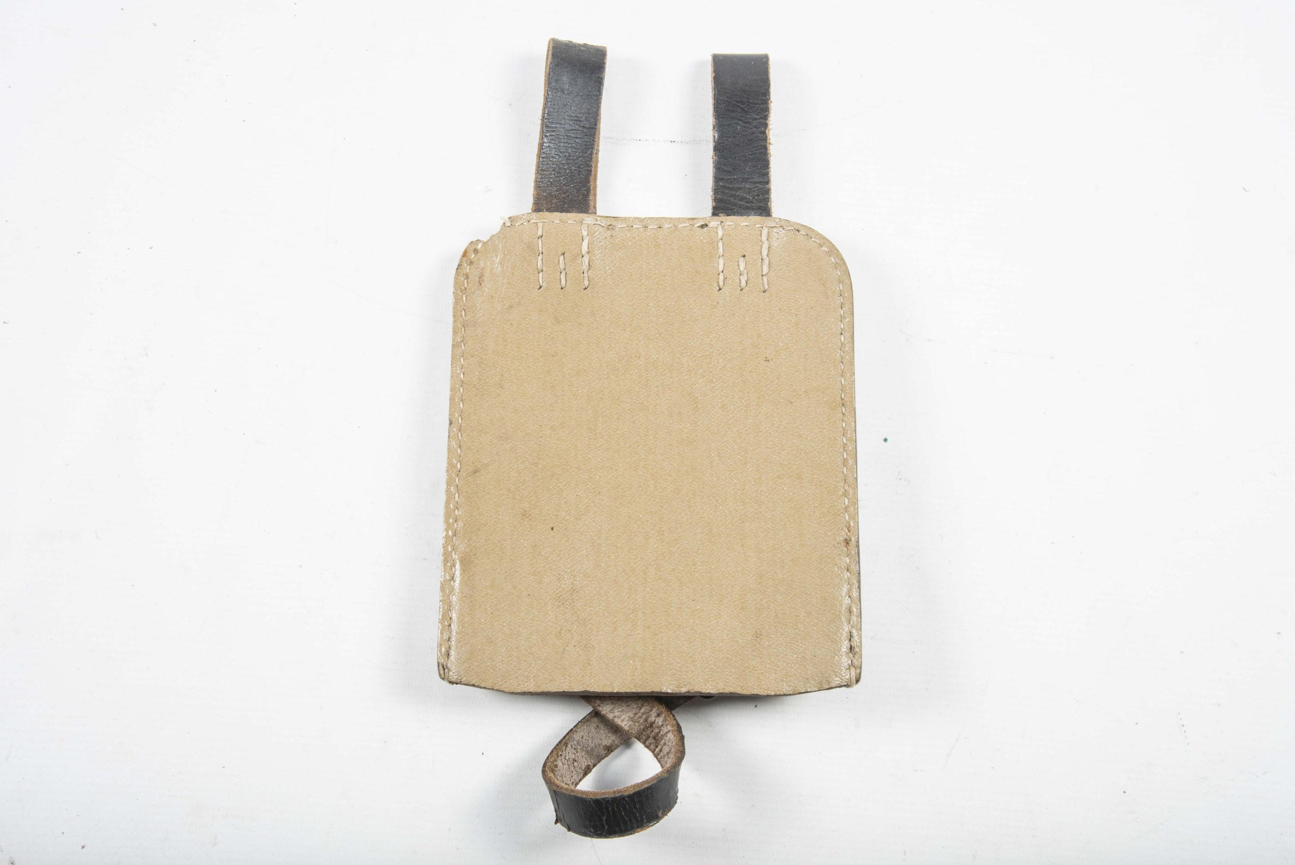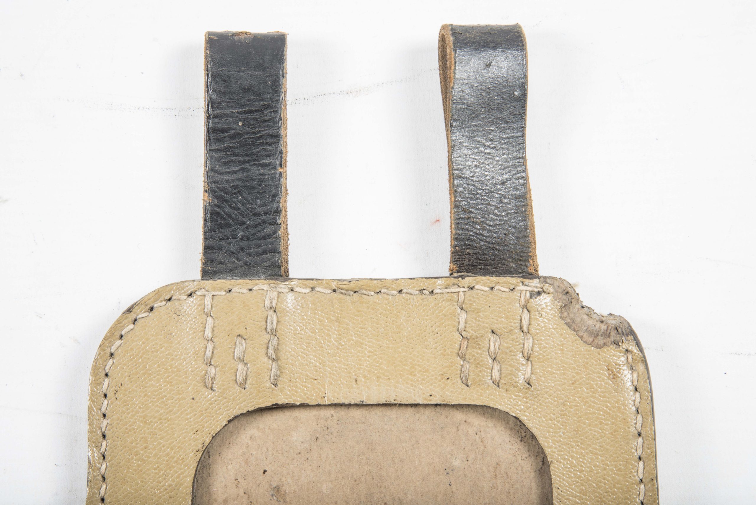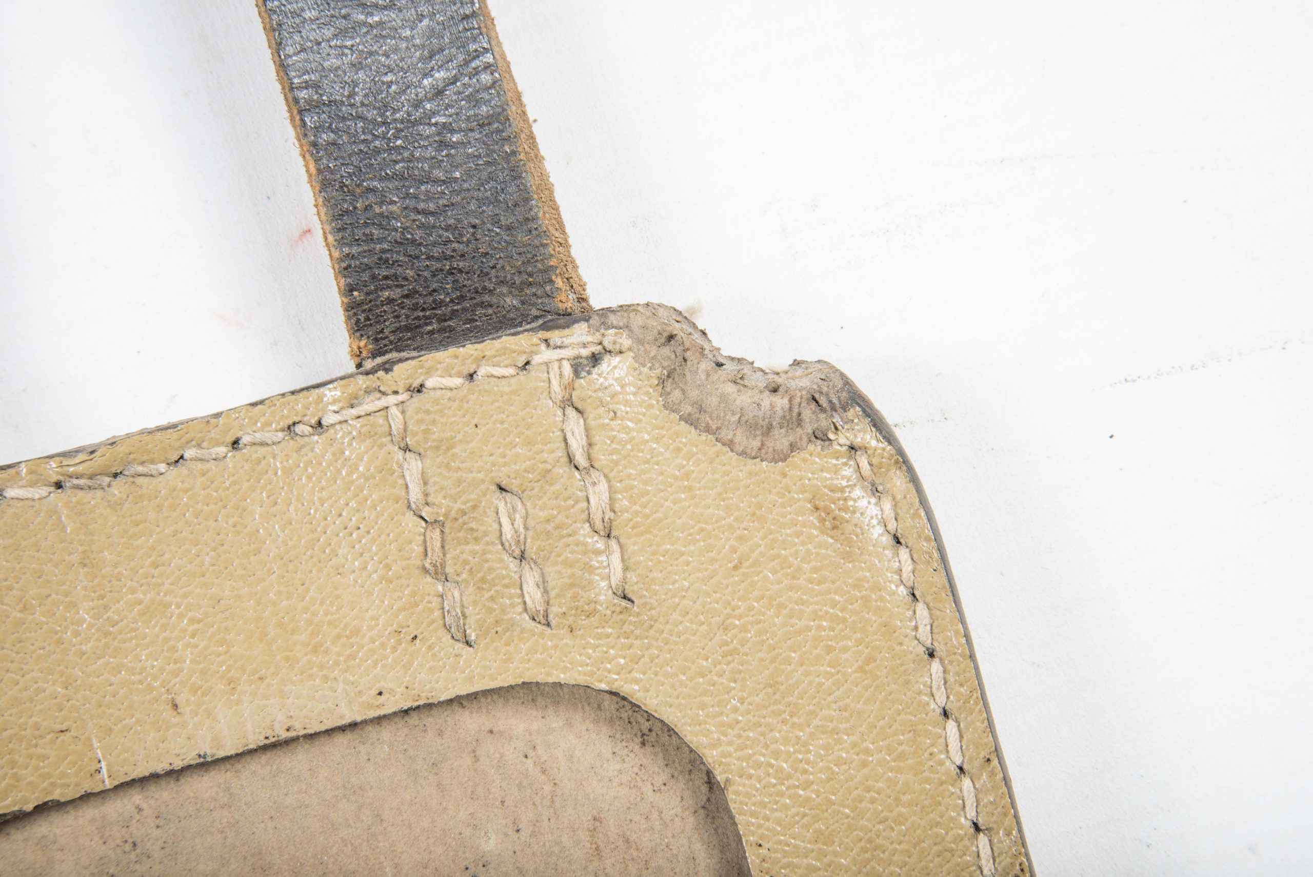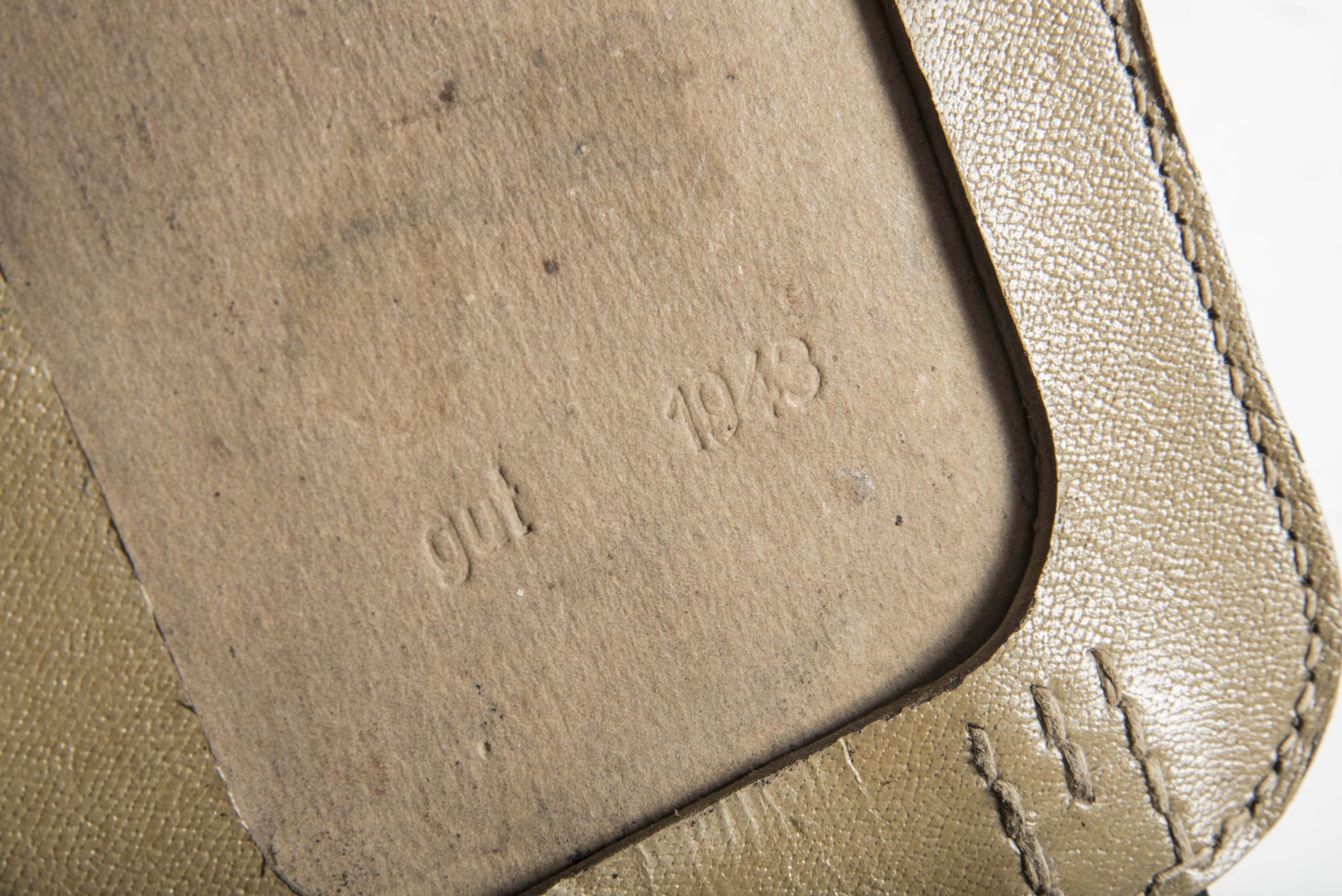 Straight black rubberised E-tool carrier marked gut 1943 indicating production by Walter Schuermann u. Co., Lederwarenfabrik, Bielefeld in 1943. There is a small damage on the upper right corner; otherwise it is in unissued condition. Beautiful and textbook example!