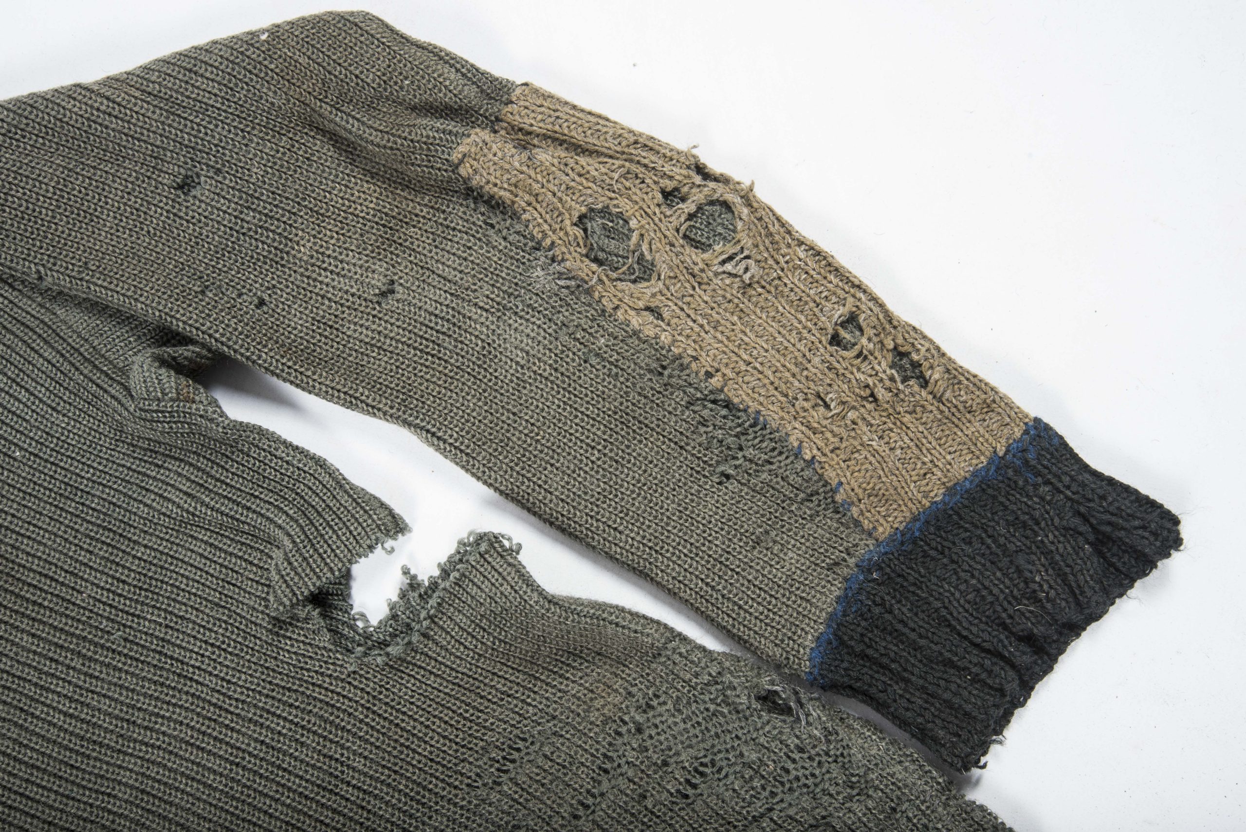 Textbook Heer/Waffen-SS issue turtleneck sweater. These sweaters can be observed on many period images and can be a nice touch to any mannequin. Even when it is damaged and like this one it is still perfect for a mannequin especially being a turtleneck example which will always be visible underneath a tunic, smock, fliegerbluse or wrapper. Hard to find!