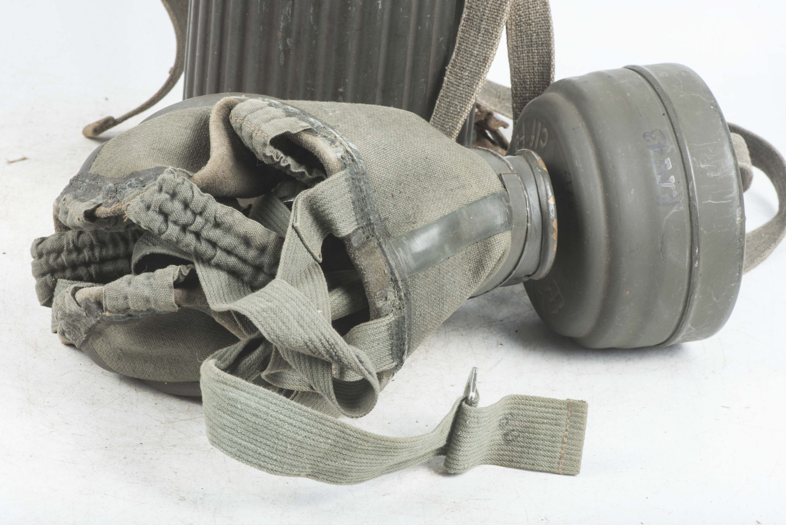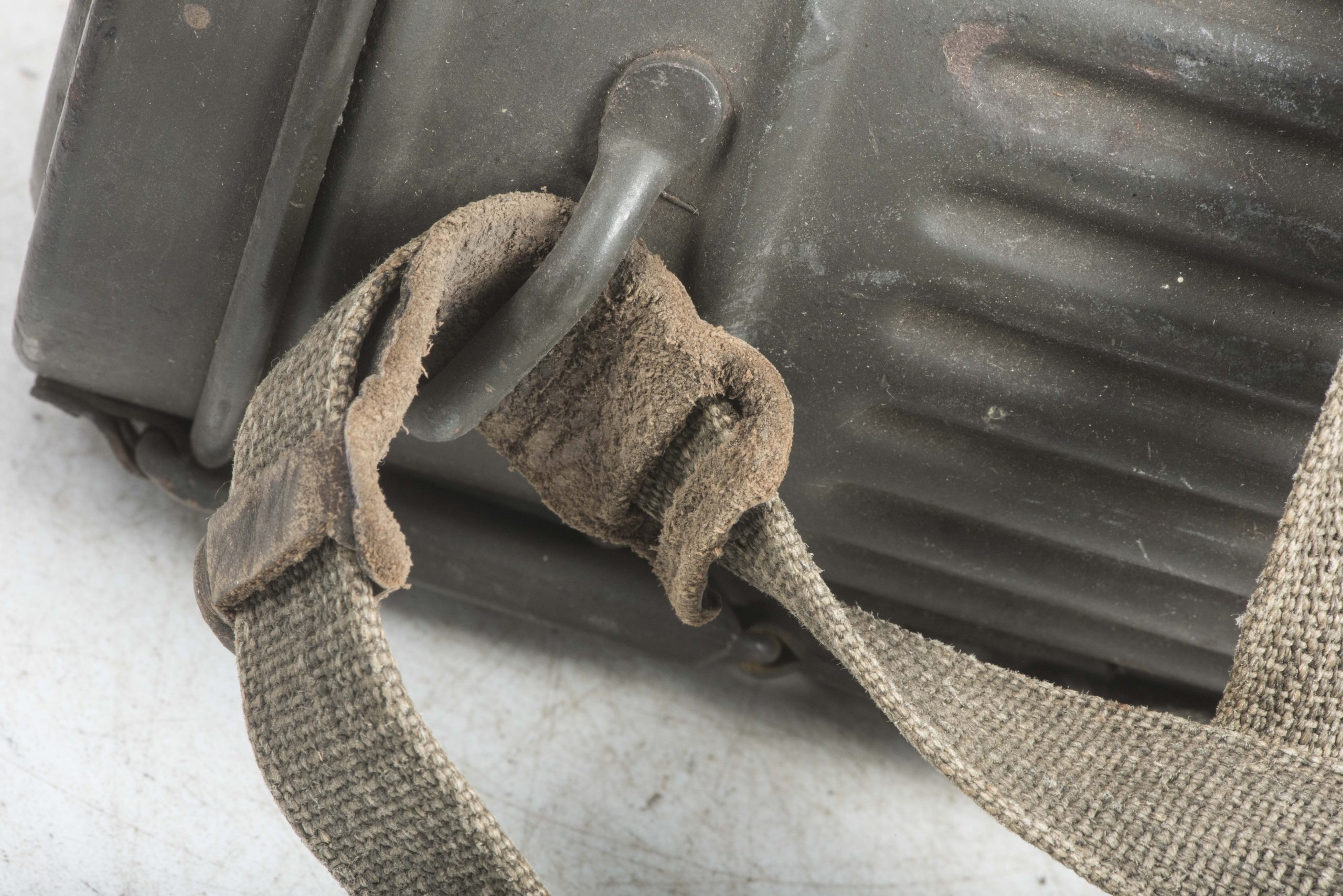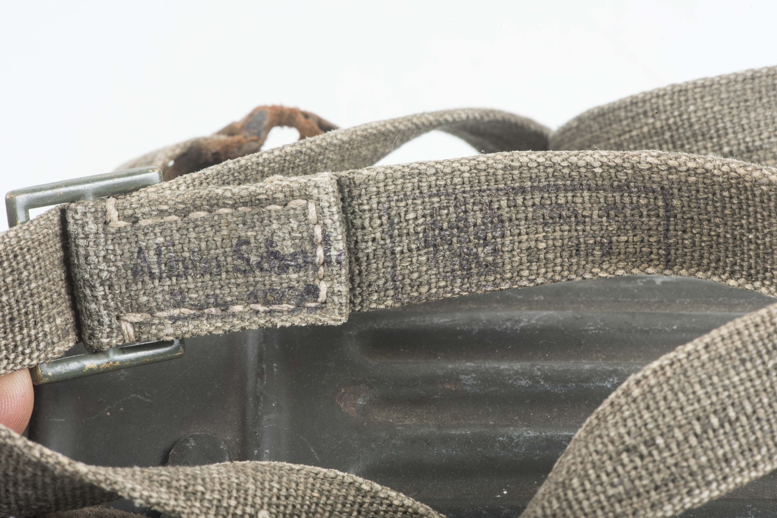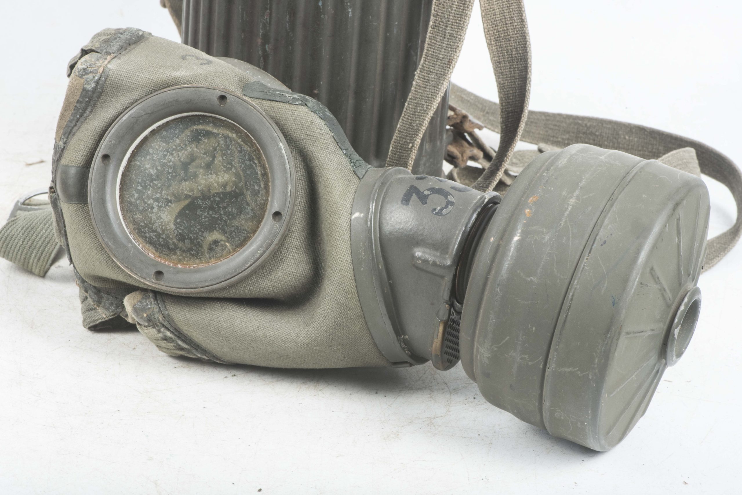 Tall early M38 gasmask set in excellent condition. Nice complete example with straps with leather reinforcements. Hard to find !