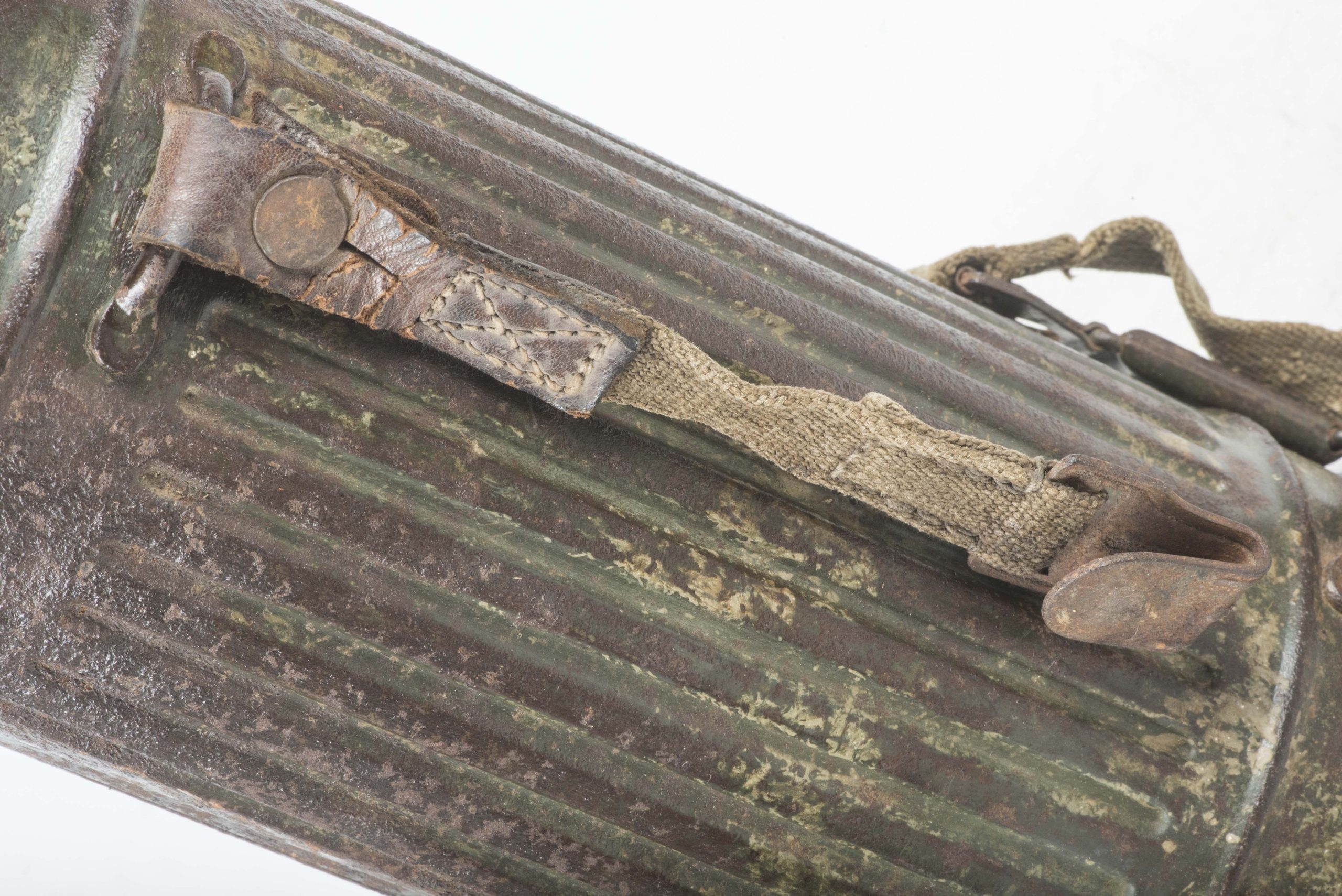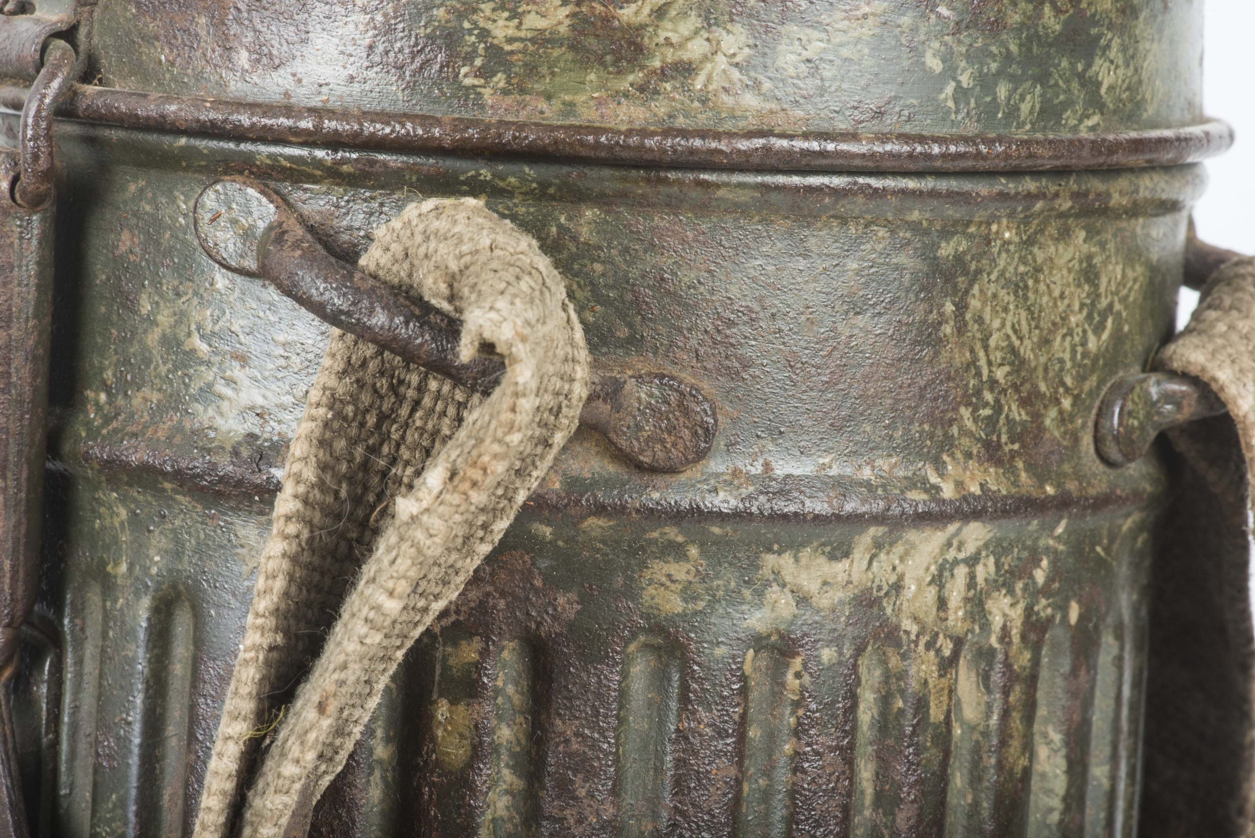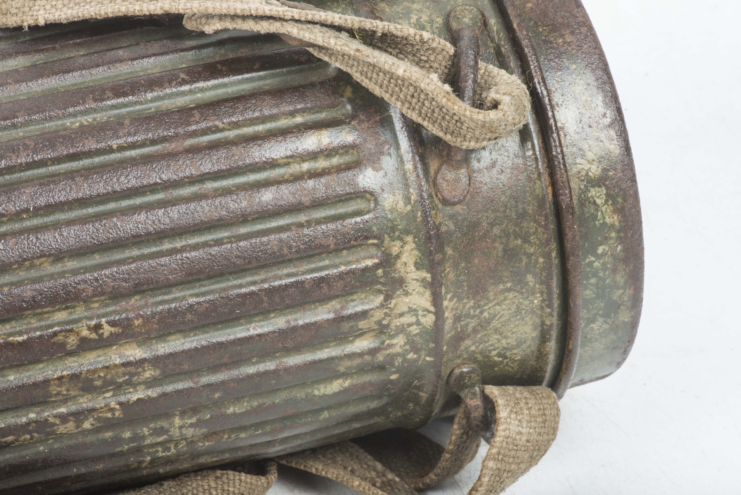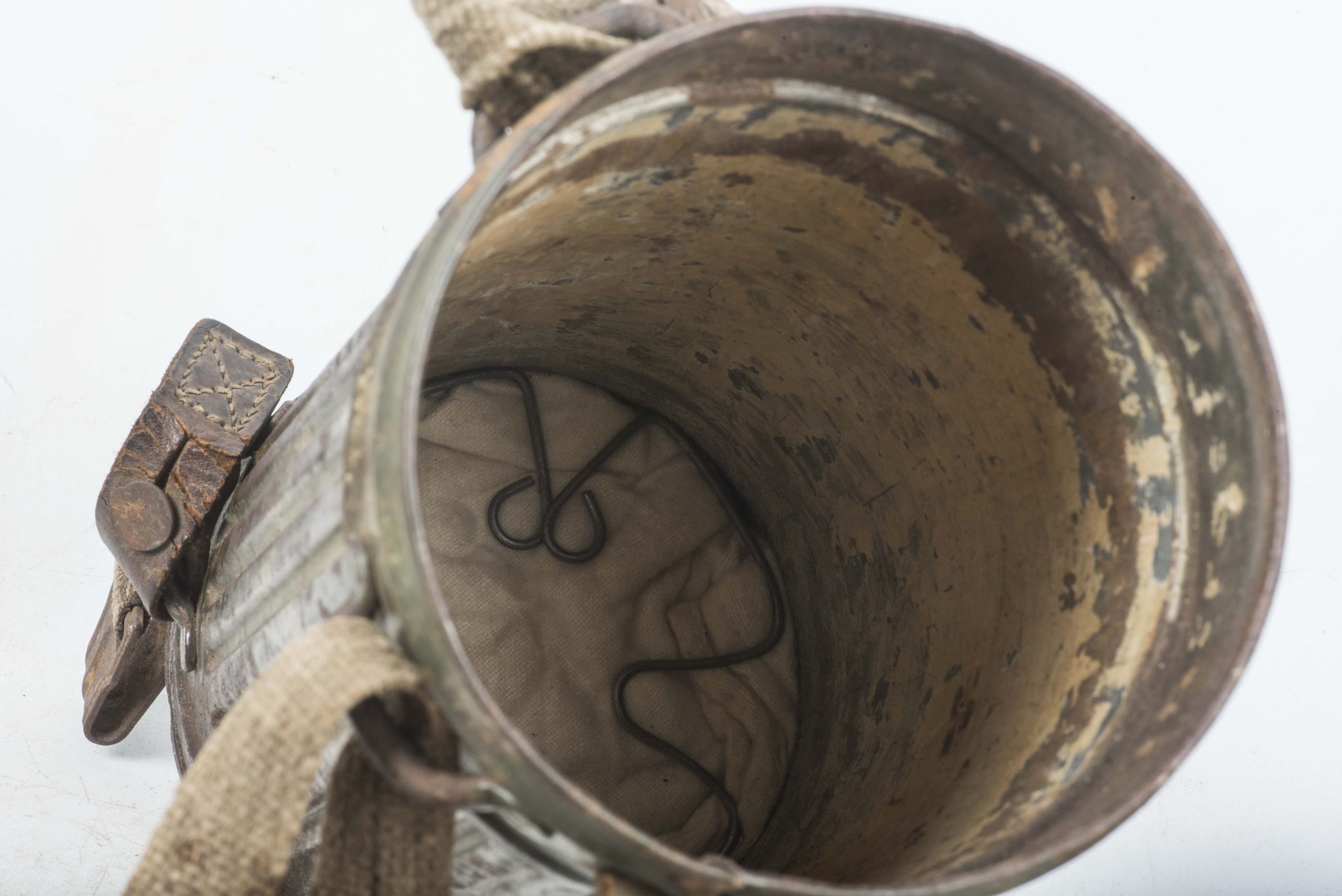 M38 gasmask in tall two tone camouflaged canister named to Obergefreiter Kruspe