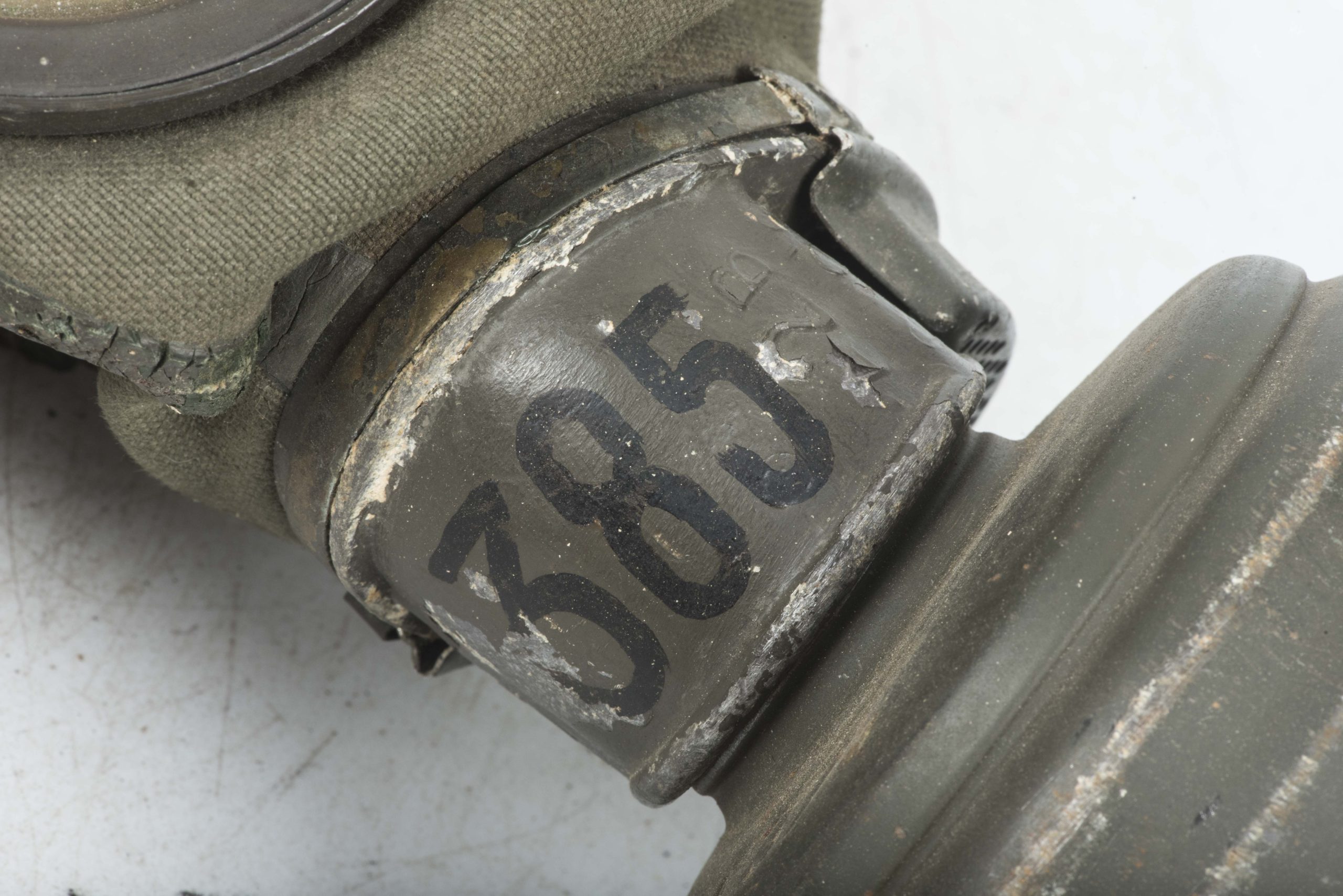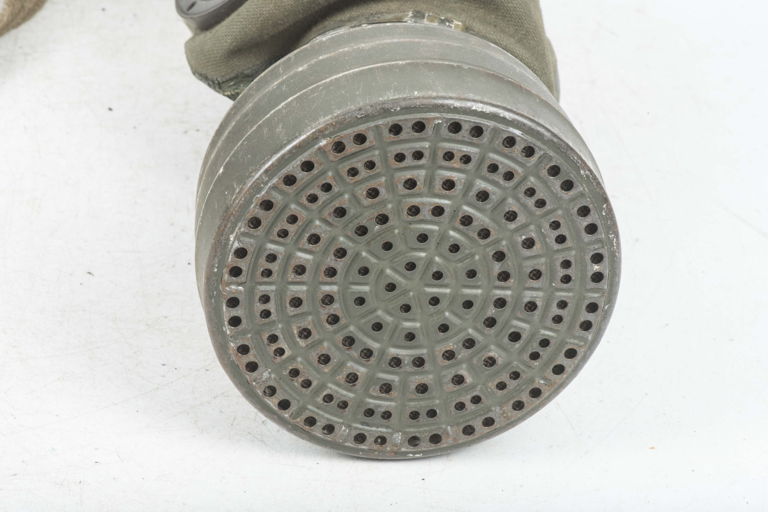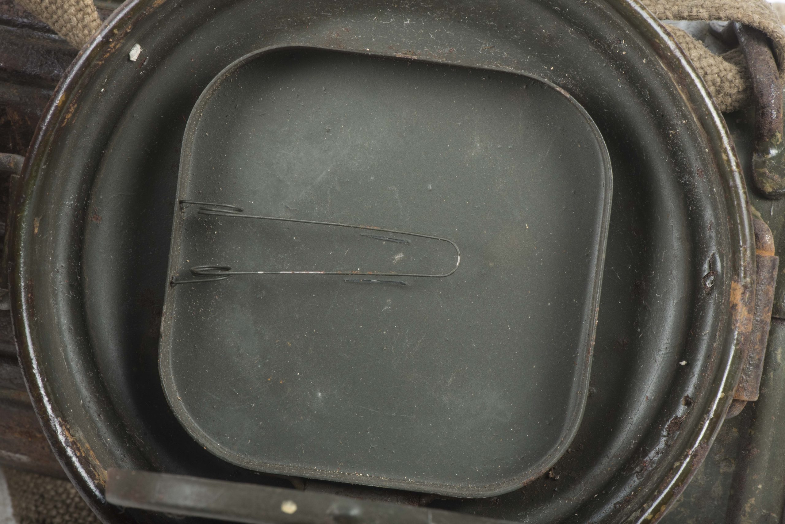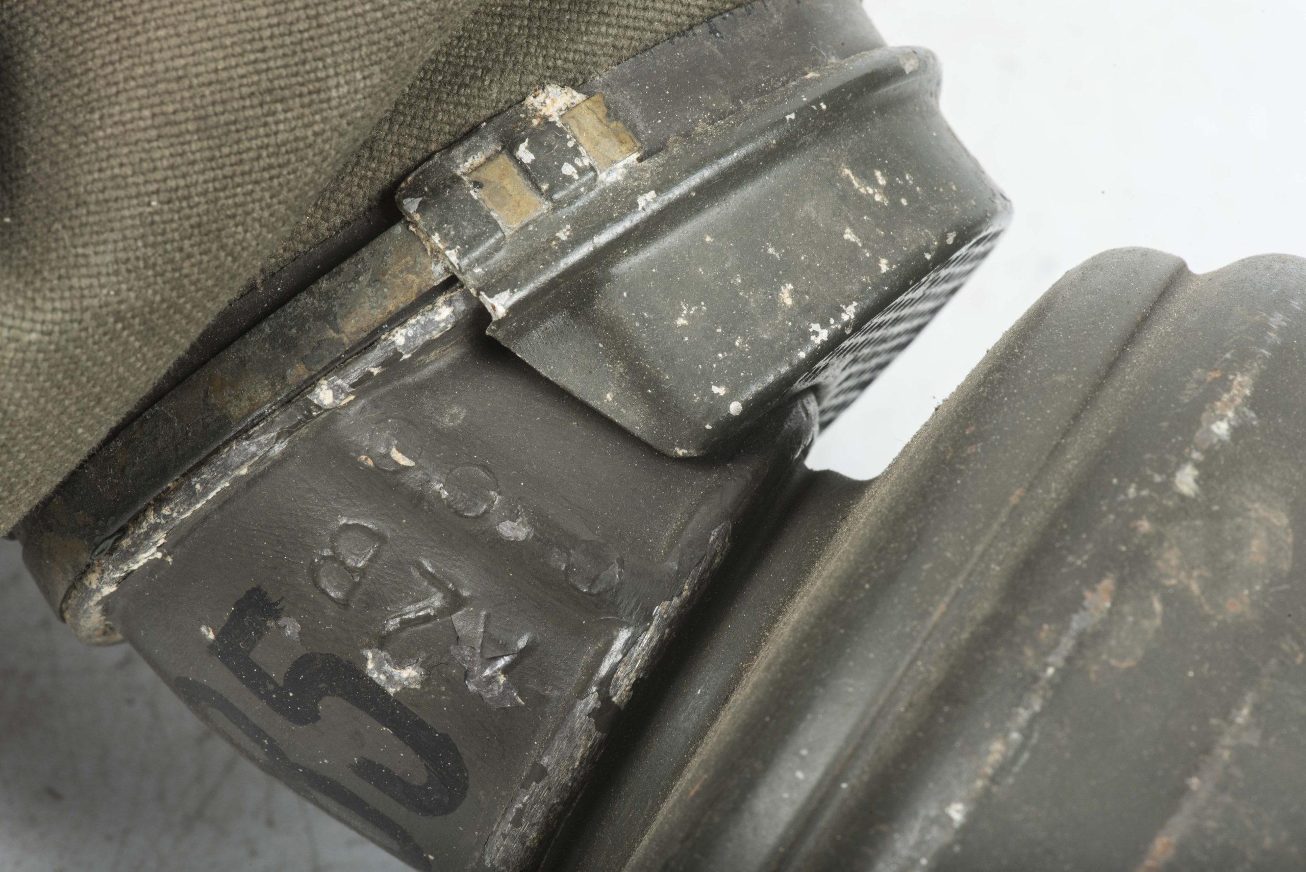 Textbook M38 gasmask in tall camouflaged canister good, untouched condition. The canister features a textbook two tone (green and tan) camouflage paint. The canister is complete with its original straps, Klarscheiben, spring and cleaning cloth. The canister is nicely named to Obergefreiter Kruspe. Very nice set with a camouflaged canister in untouched condition!