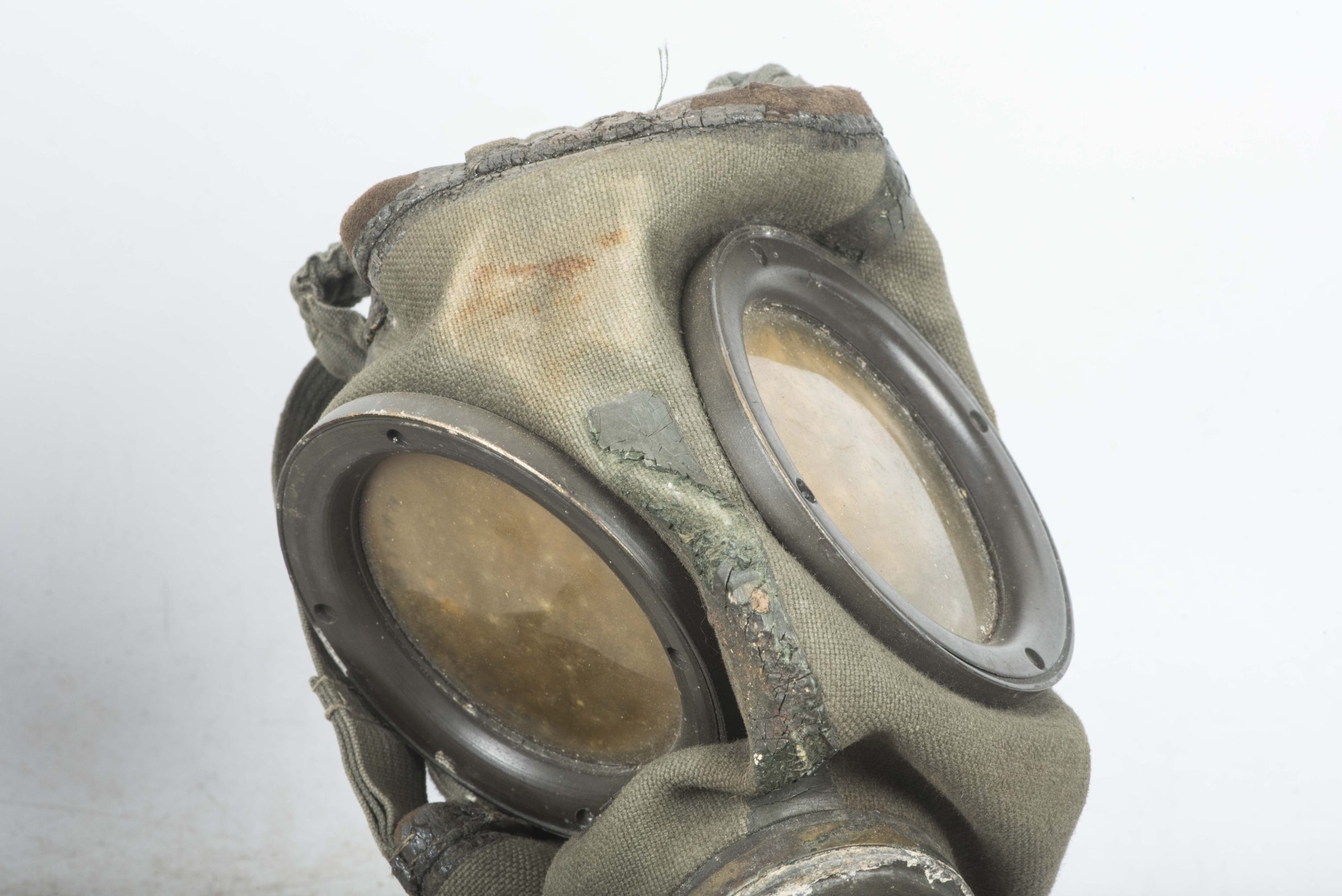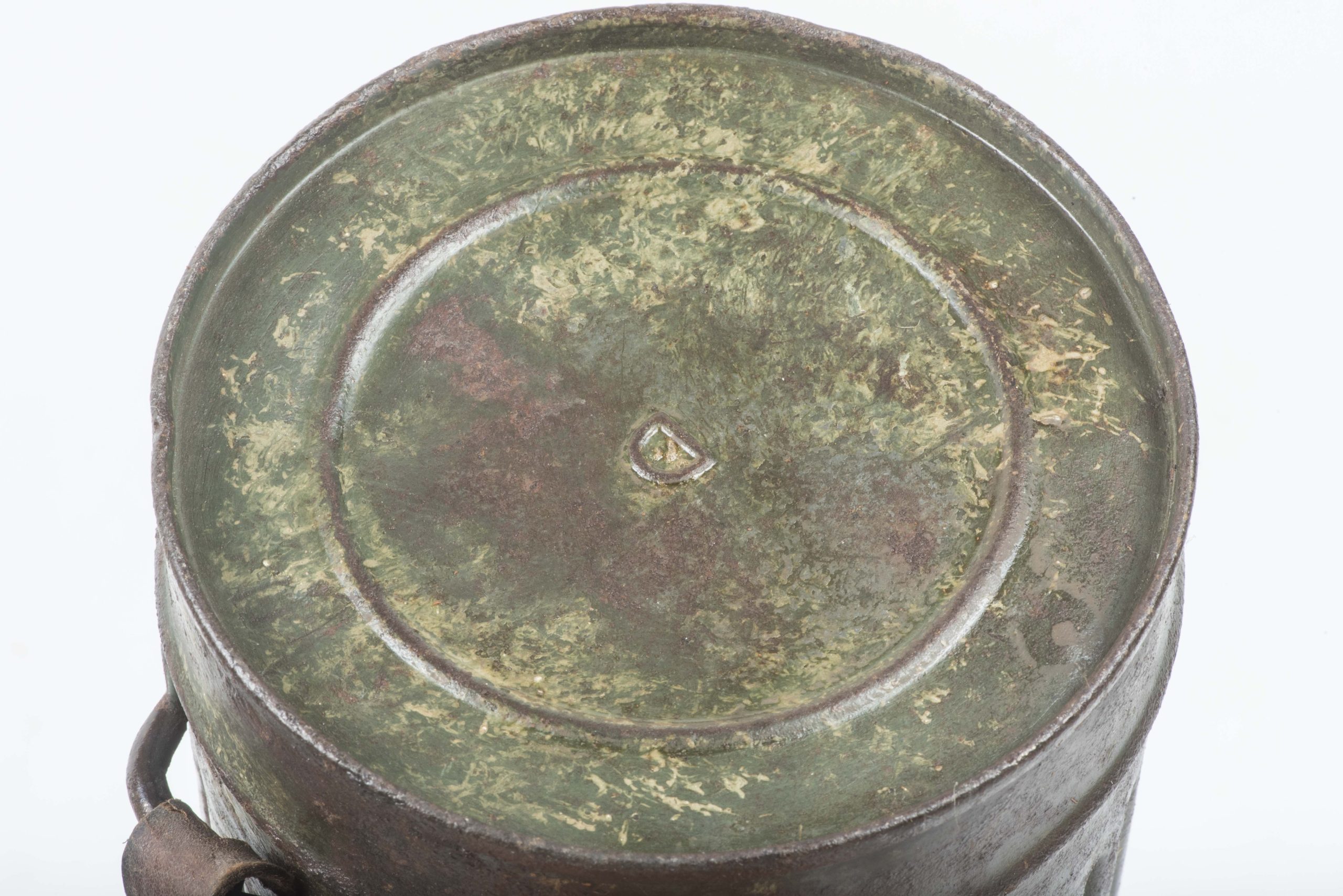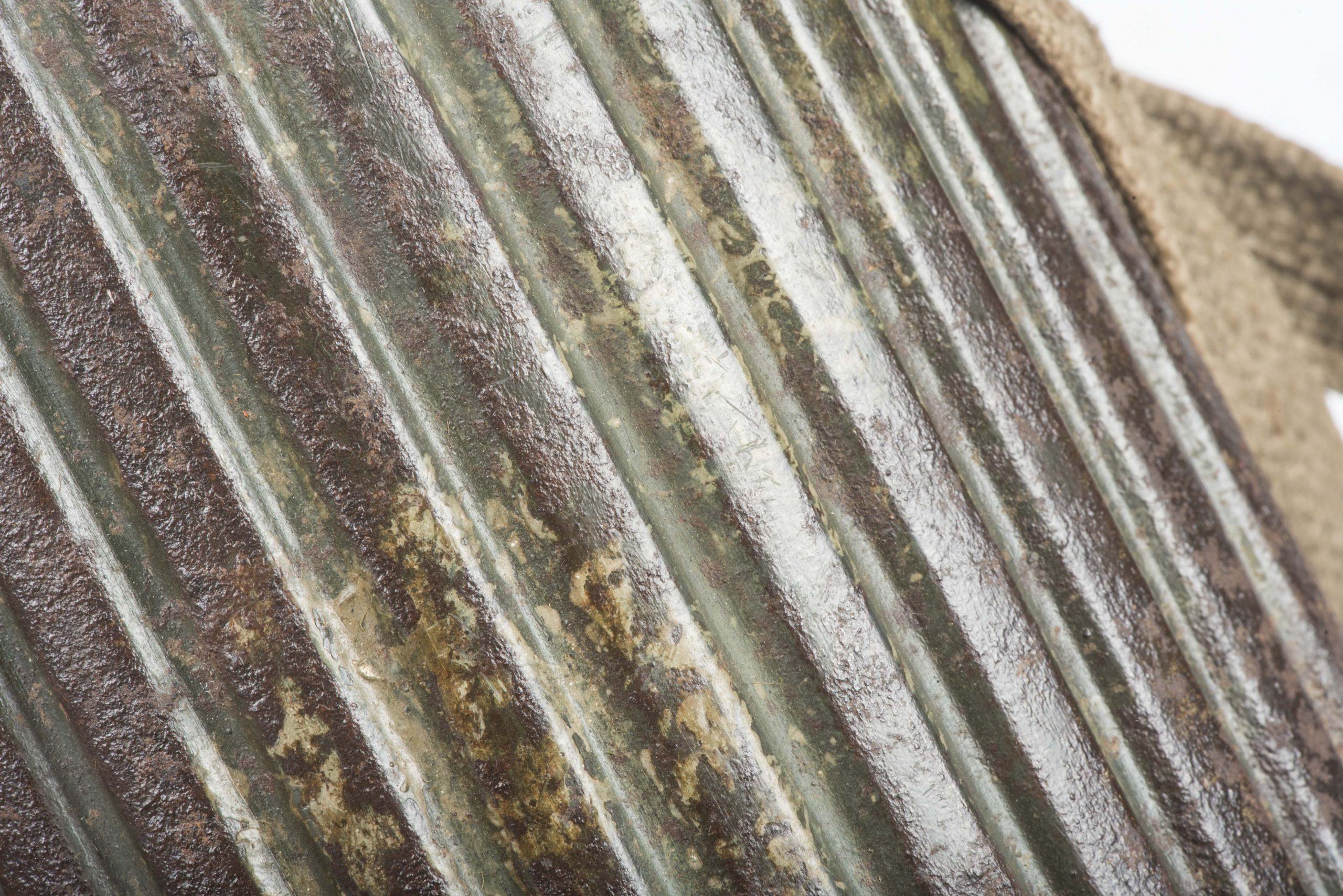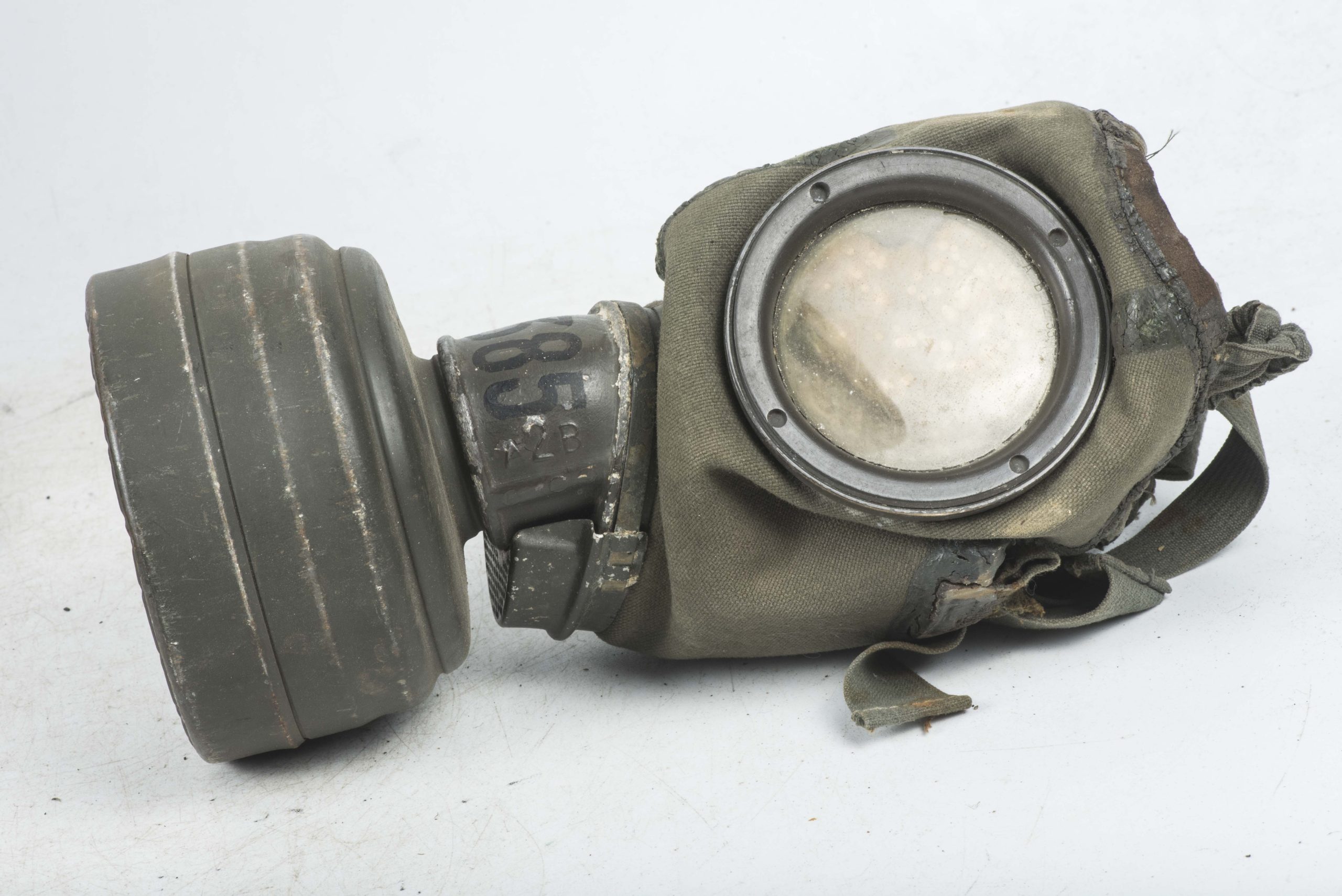 Textbook M38 gasmask in tall camouflaged canister good, untouched condition. The canister features a textbook two tone (green and tan) camouflage paint. The canister is complete with its original straps, Klarscheiben, spring and cleaning cloth. The canister is nicely named to Obergefreiter Kruspe. Very nice set with a camouflaged canister in untouched condition!