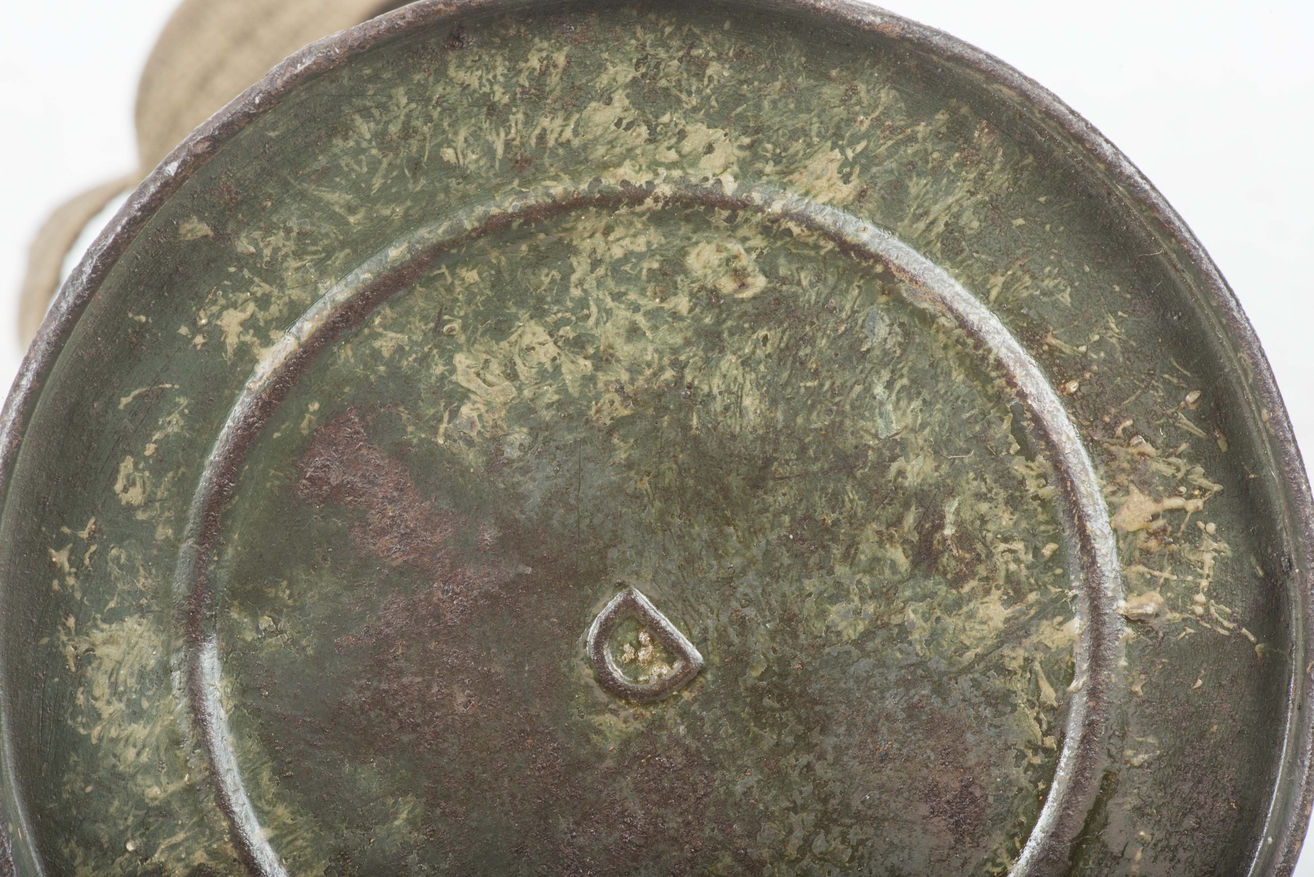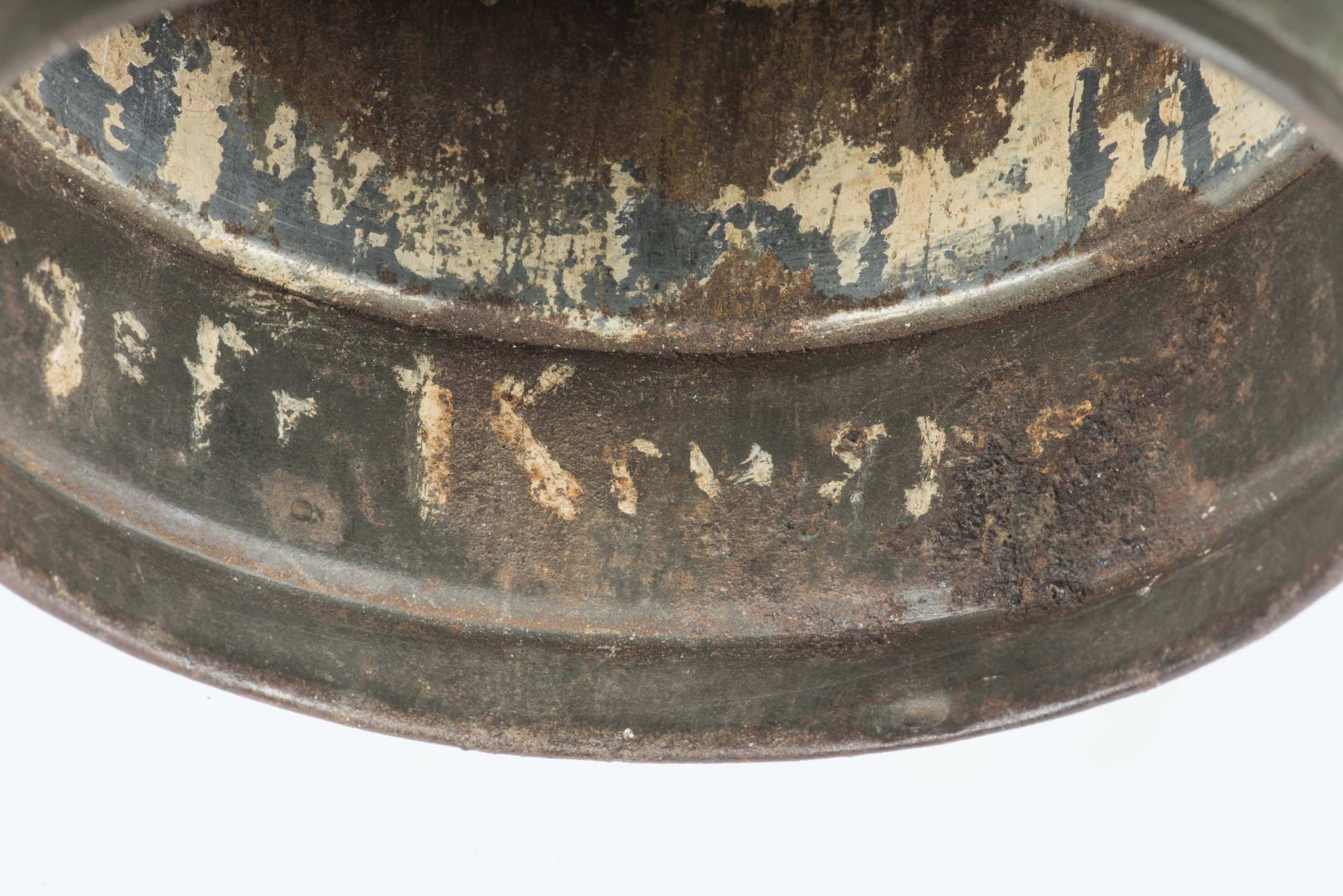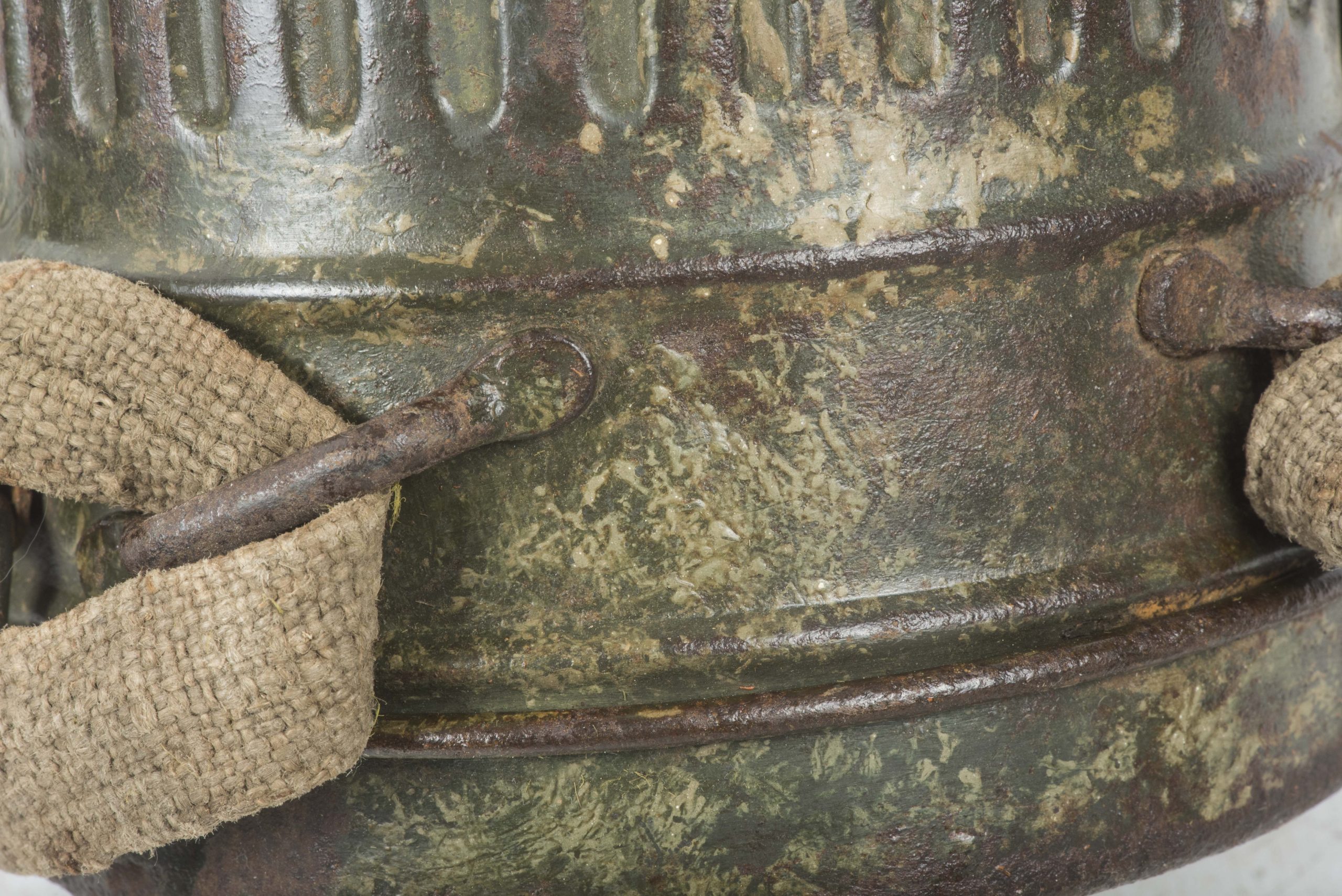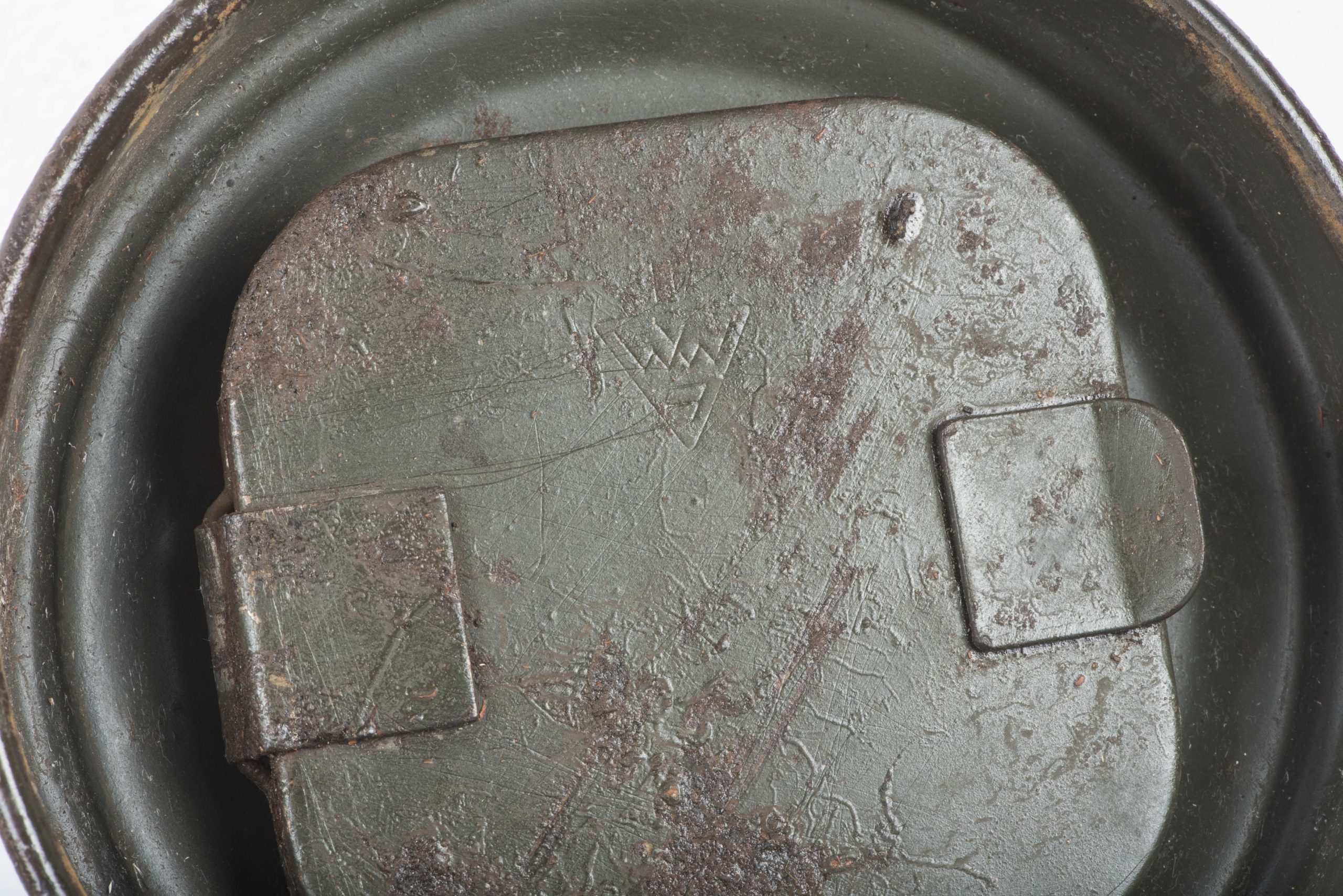 Textbook M38 gasmask in tall camouflaged canister good, untouched condition. The canister features a textbook two tone (green and tan) camouflage paint. The canister is complete with its original straps, Klarscheiben, spring and cleaning cloth. The canister is nicely named to Obergefreiter Kruspe. Very nice set with a camouflaged canister in untouched condition!