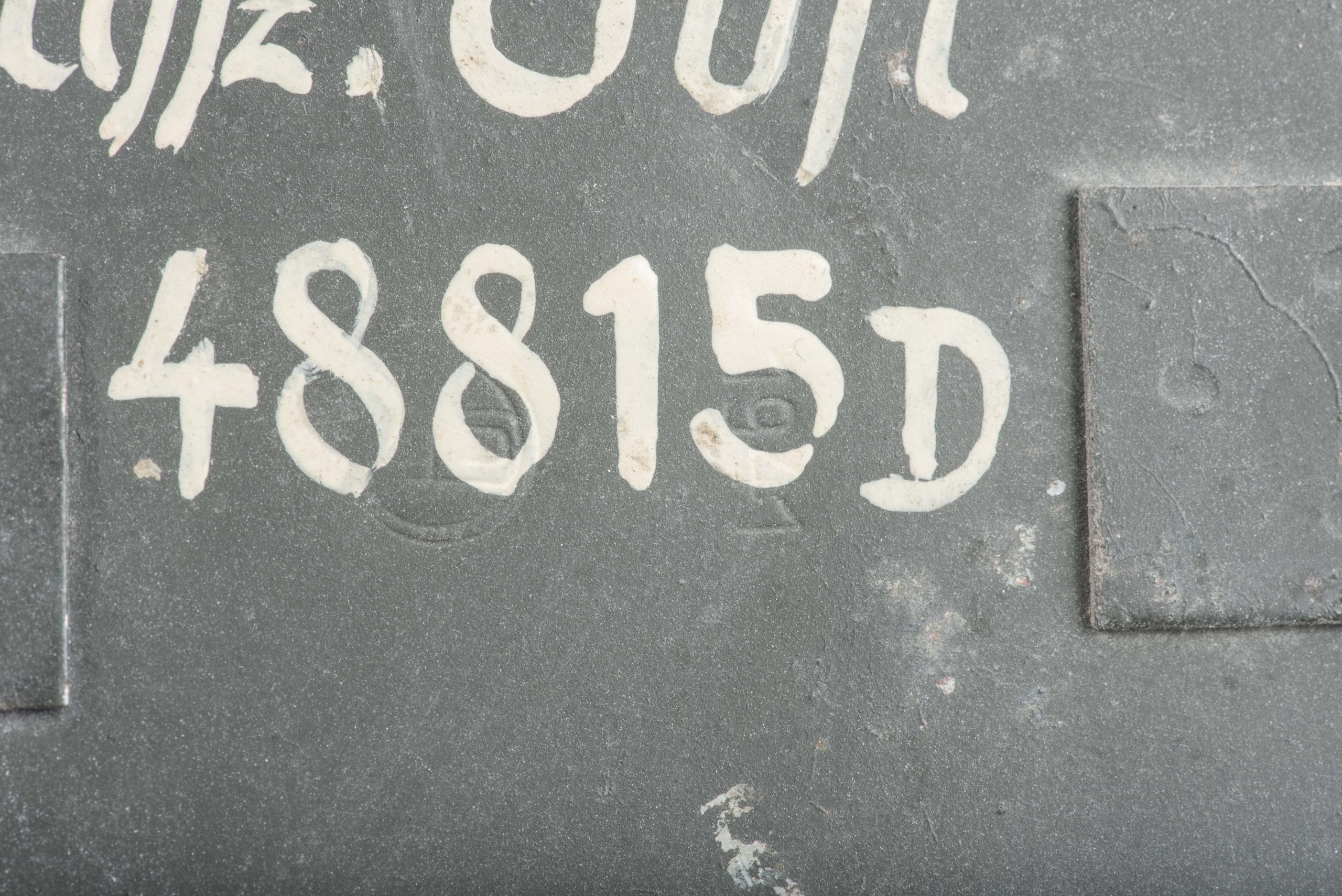 Textbook tall M38 gasmask canister in its original spray painted three-tone ‘Normandy’ camouflage finish. The canister retains up to 80% of its wartime applied camouflage paint. The field post number indicates Festungs-Grenadiers-Regiment 751 which was a part of the 316 Infanterie Division which was destroyed in Normandy. There is name match for a Unteroffizier Karl Jost who was killed in action 18.06.1944 and is buried in the Kriegsgräberstätte Champigny-Saint-André in Normandy. This is most probably the same man. The canister was originally found in Normandy and is in good condition. Hard to find example!