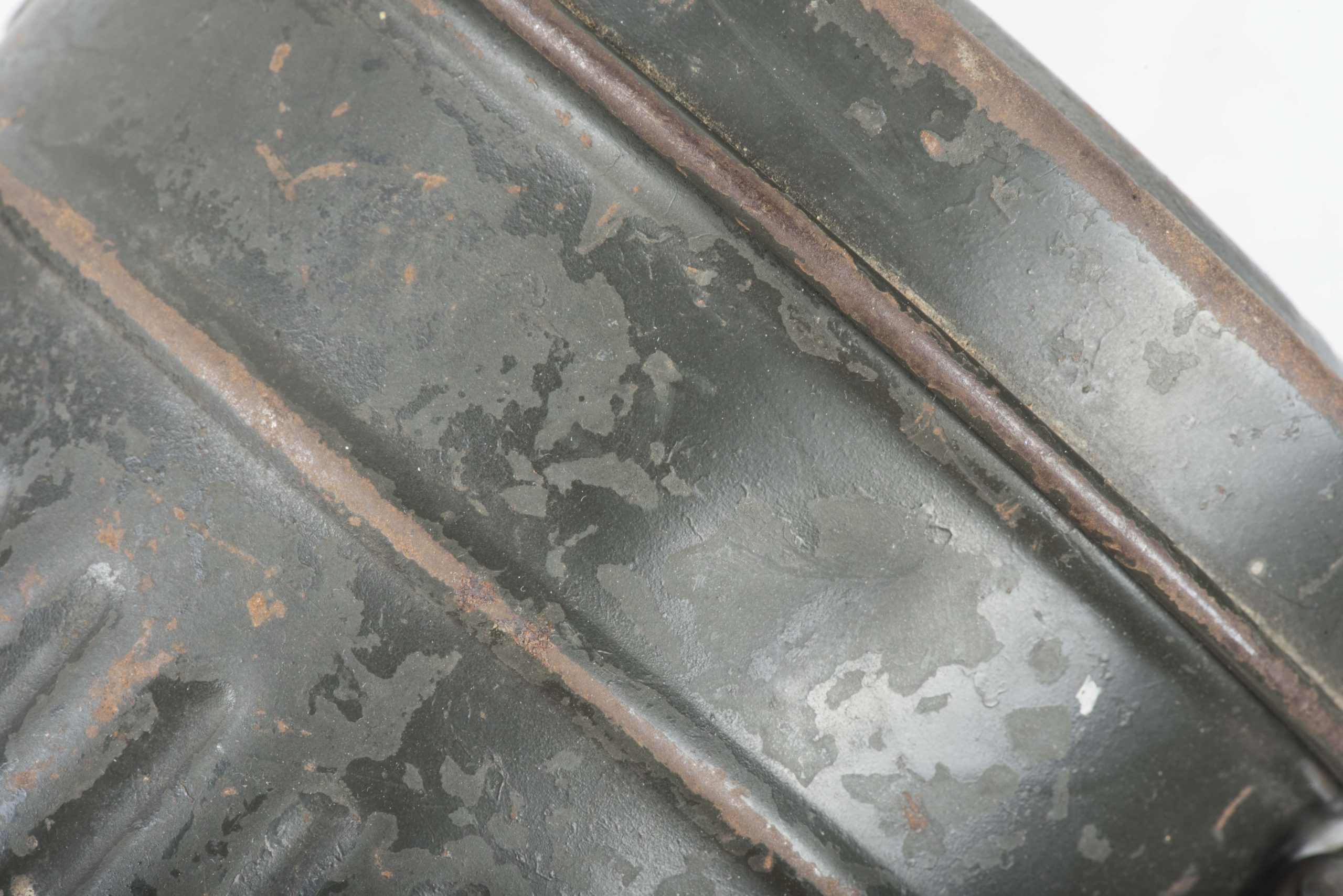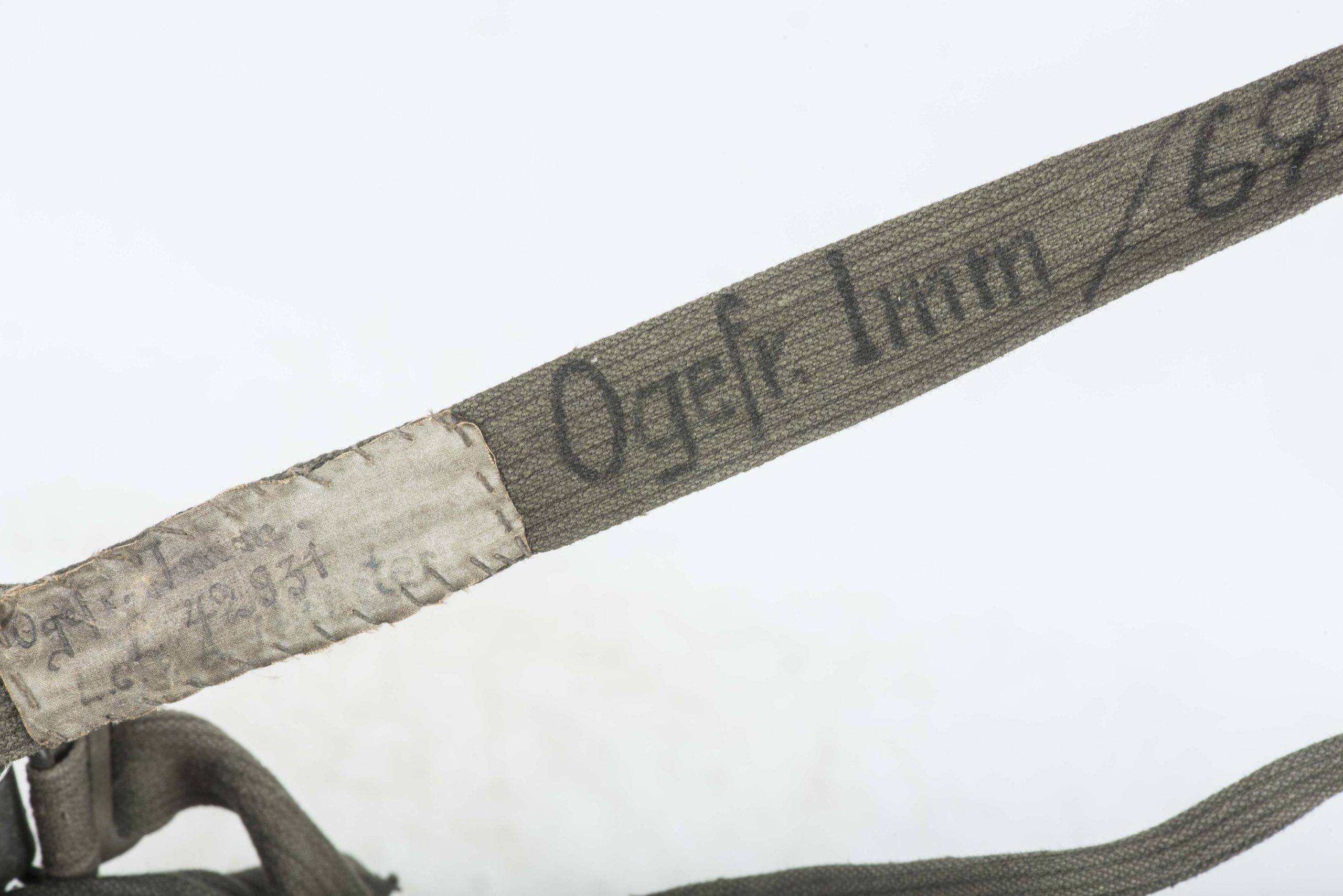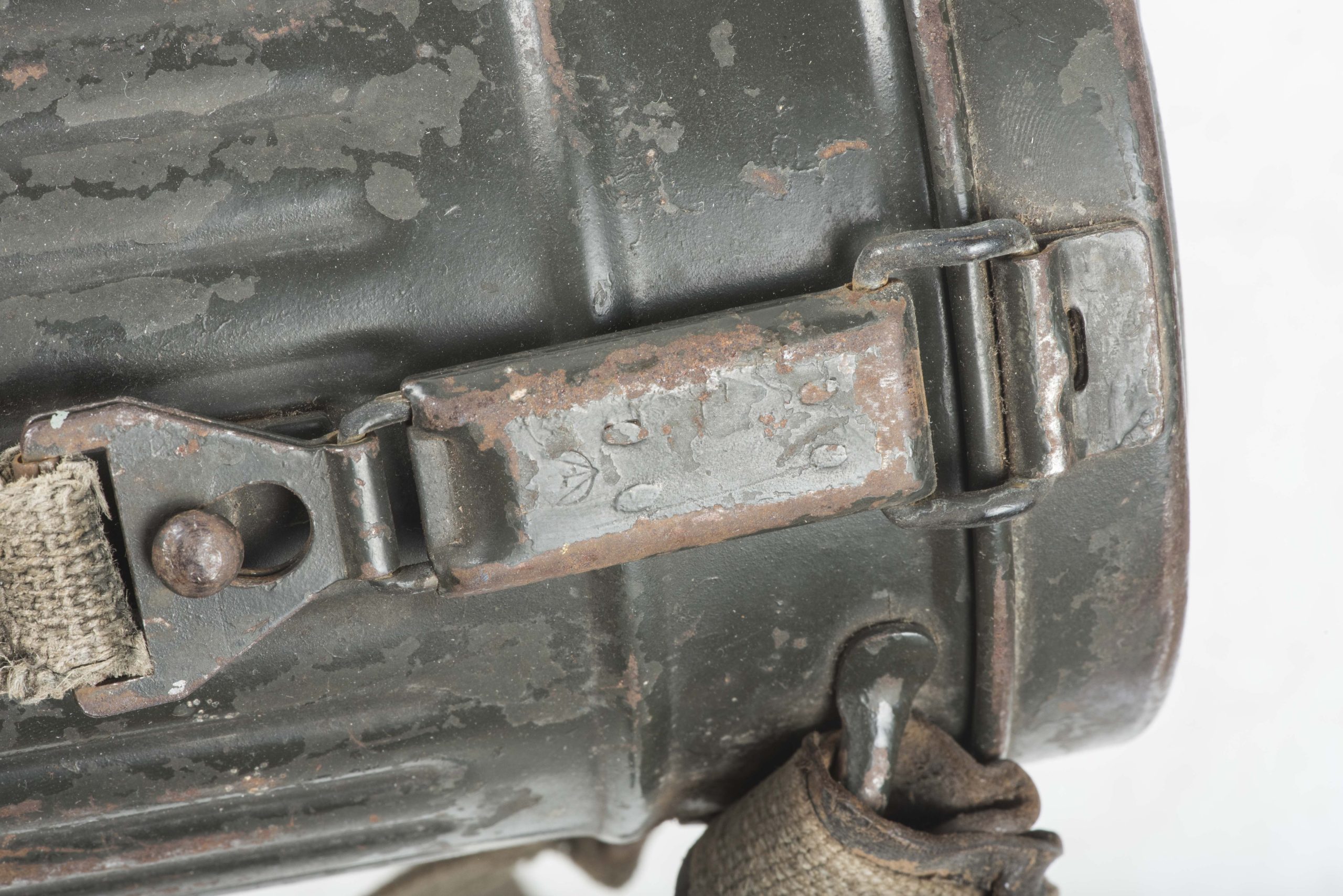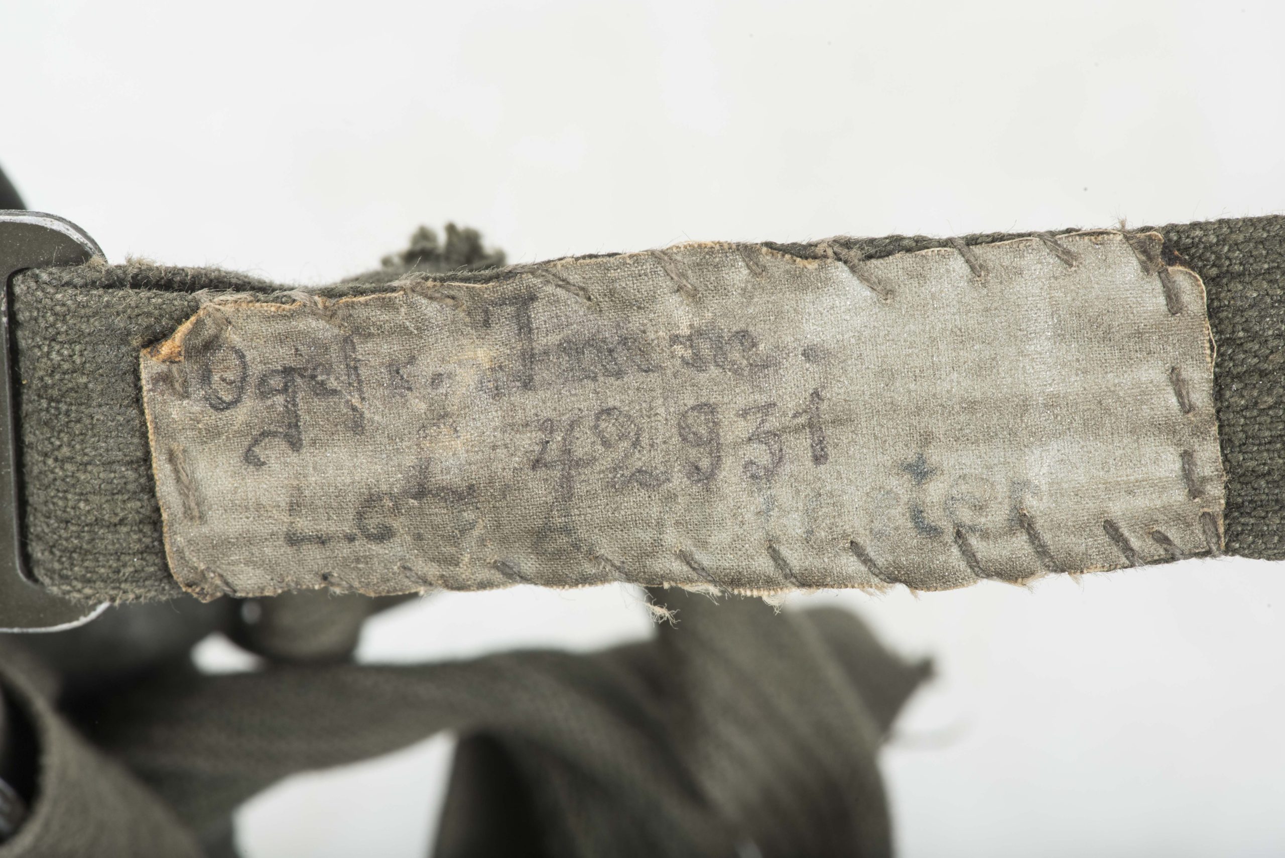 Textbook M38 gasmask in tall canister in very good condition. The canister features a typical rough field repaint. The mask does not have the filter with it. The gasmask itself is a nice green rubber variant. The straps of the gasmask itself feature a label and writing which indicates this set belonged to Obergefreiter Imm, Feldpostnummer 42931. Very nice named set!