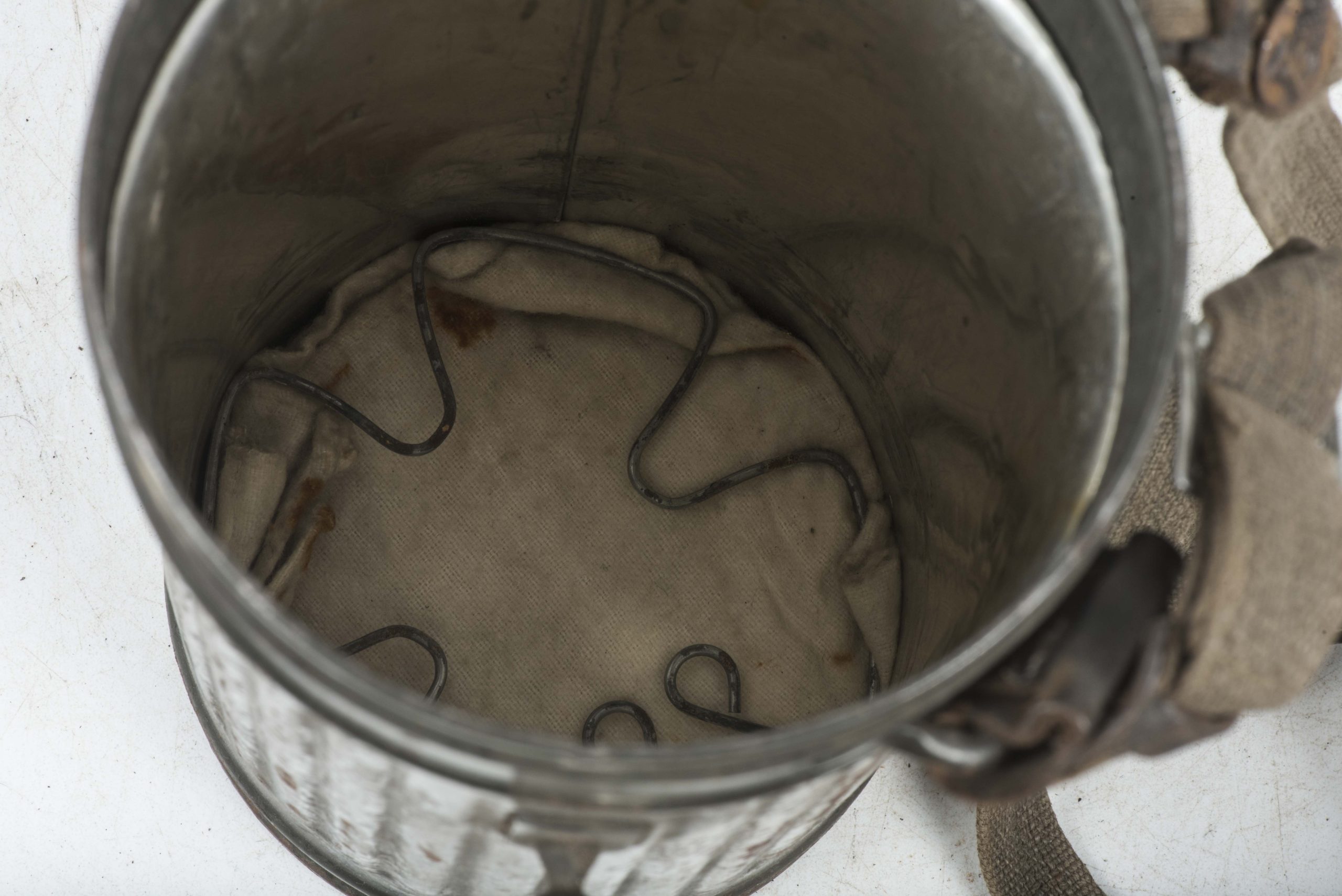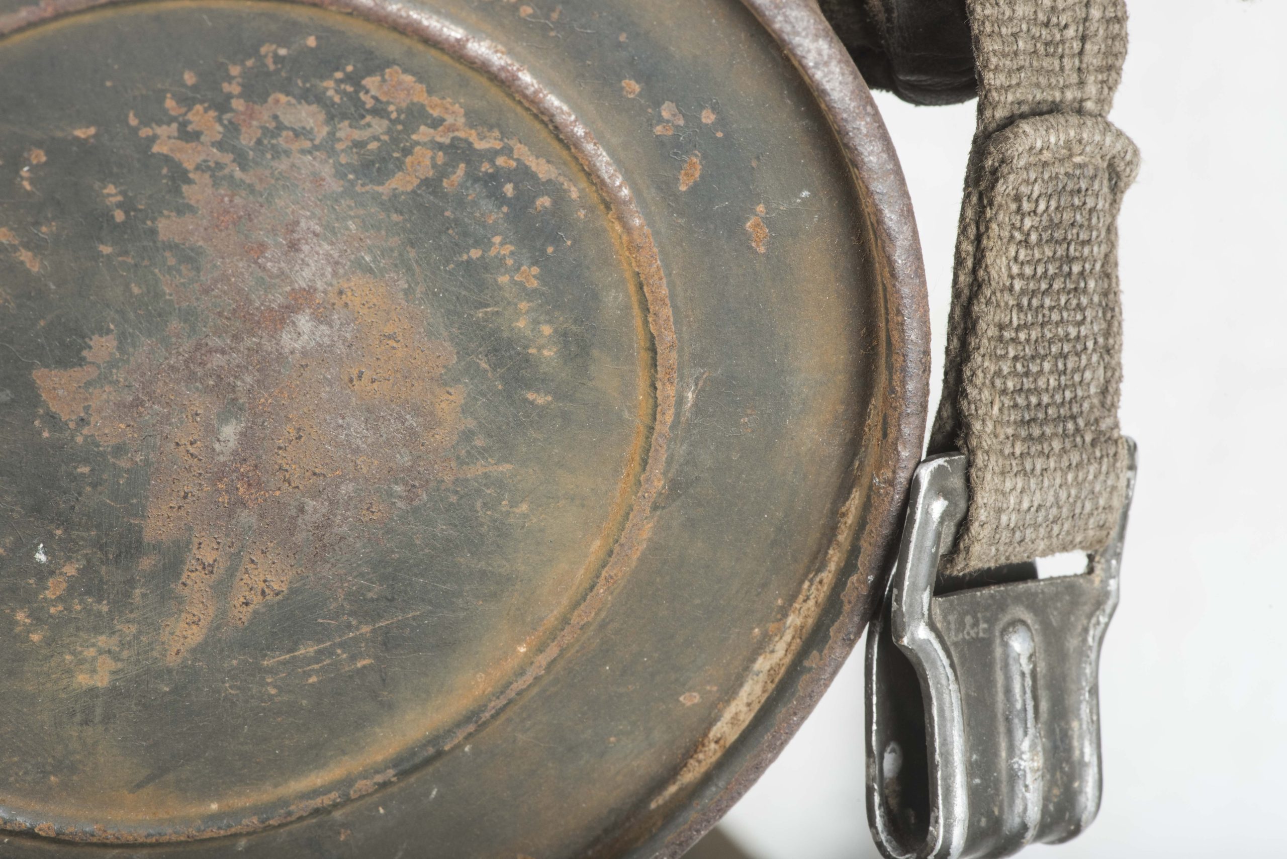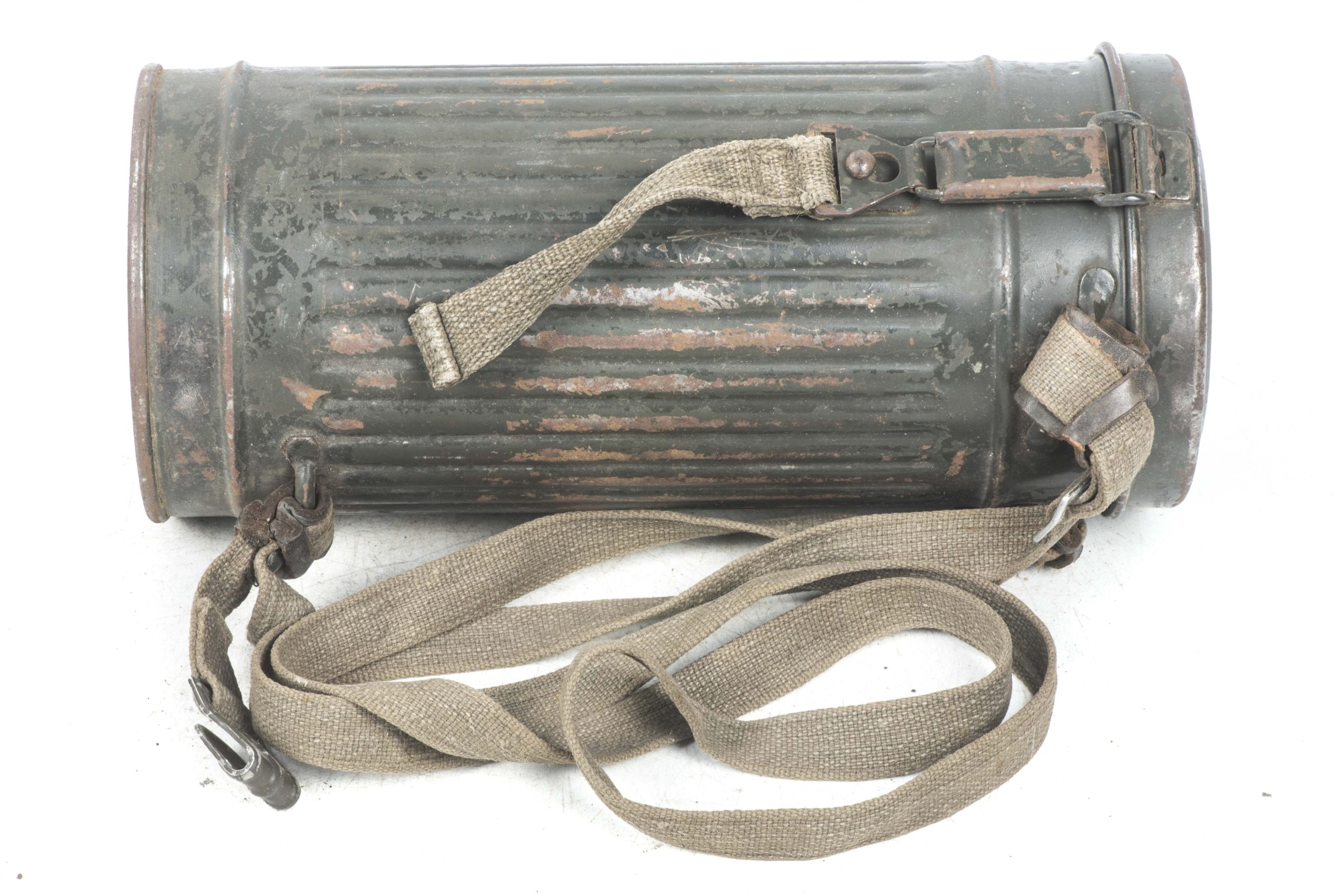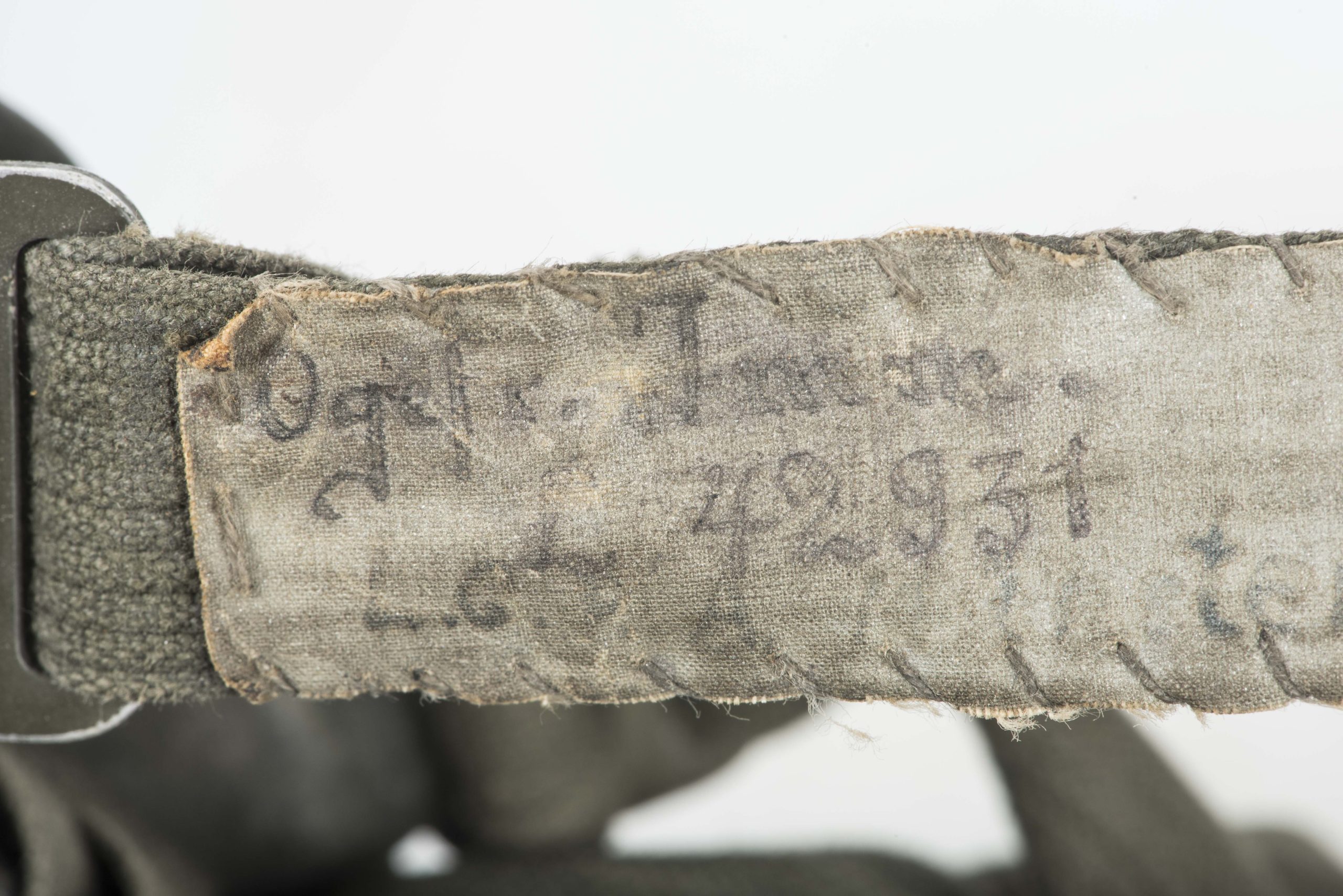 Textbook M38 gasmask in tall canister in very good condition. The canister features a typical rough field repaint. The mask does not have the filter with it. The gasmask itself is a nice green rubber variant. The straps of the gasmask itself feature a label and writing which indicates this set belonged to Obergefreiter Imm, Feldpostnummer 42931. Very nice named set!